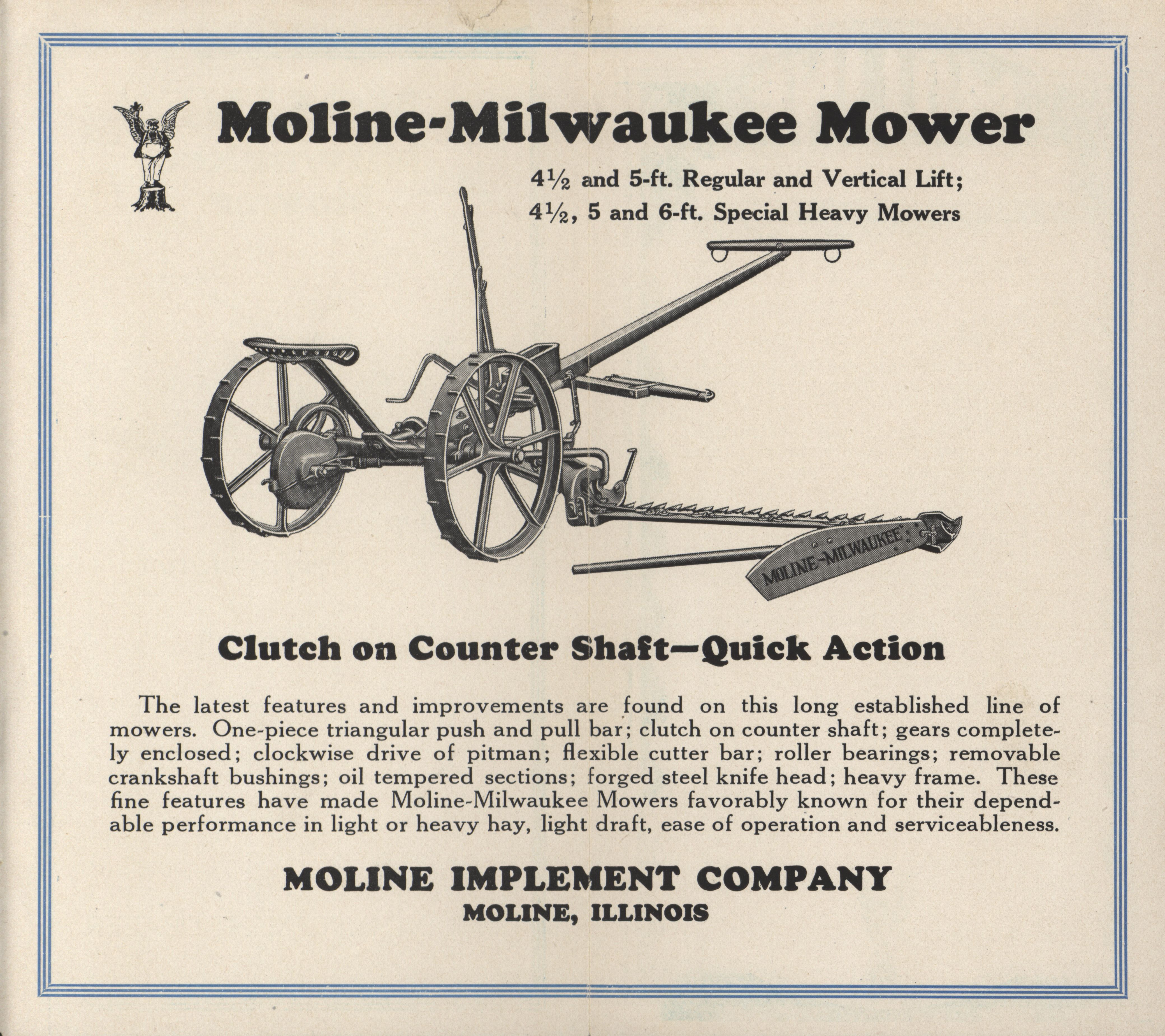 - "Moline Implement Company Milwaukee Mower advertisement", Agricultural Machinery Literature Collection, Iowa State University Library Digital Collections