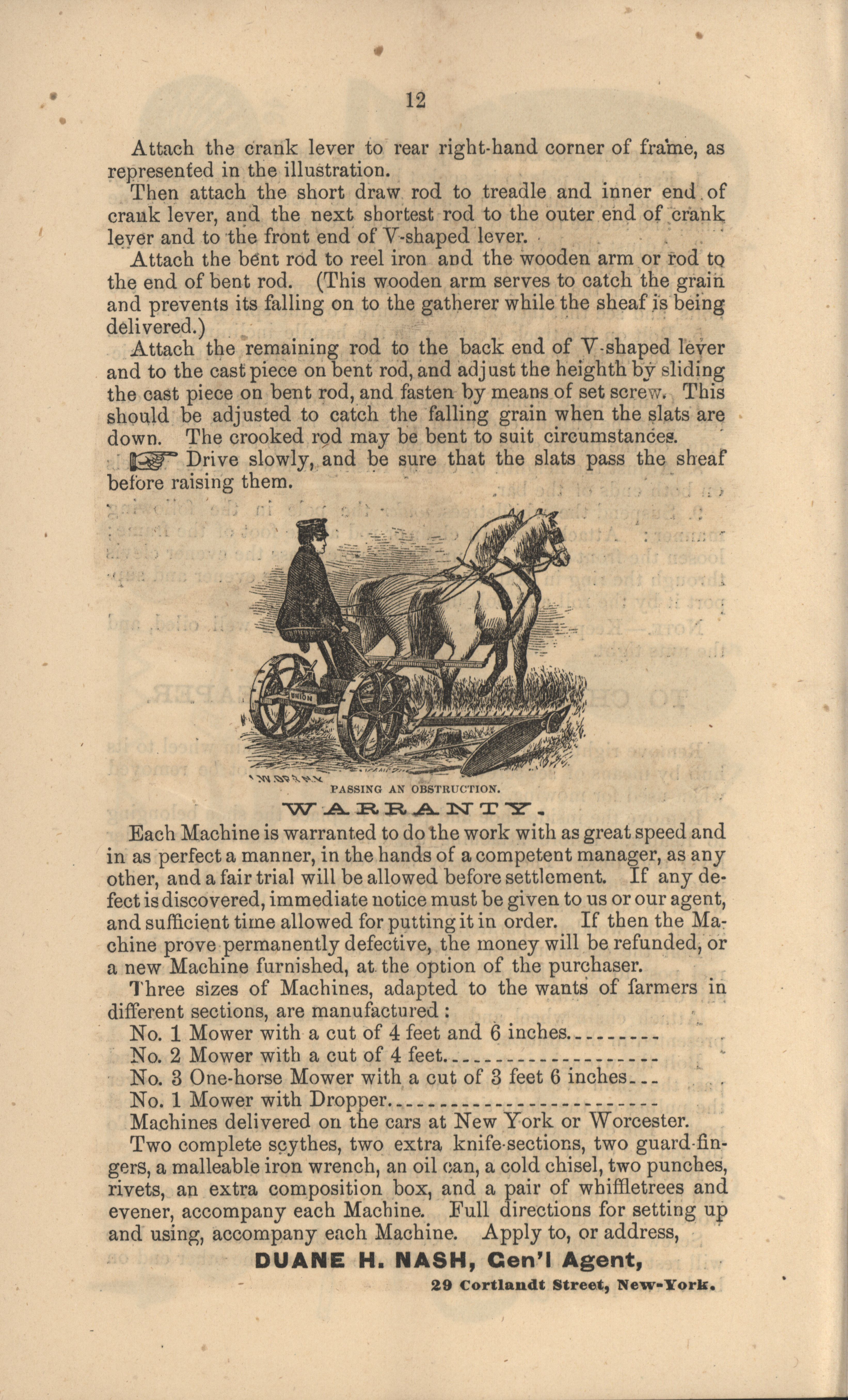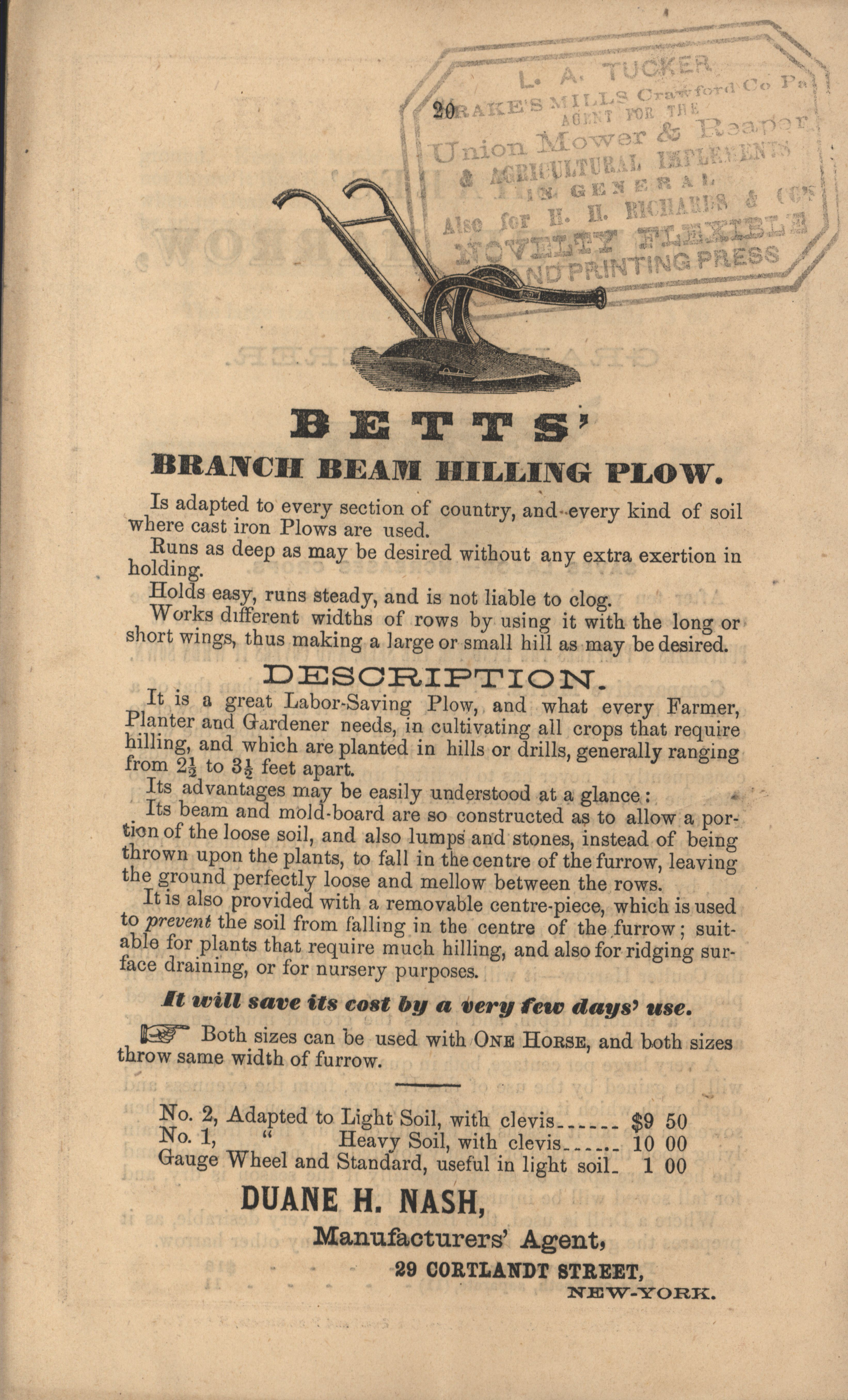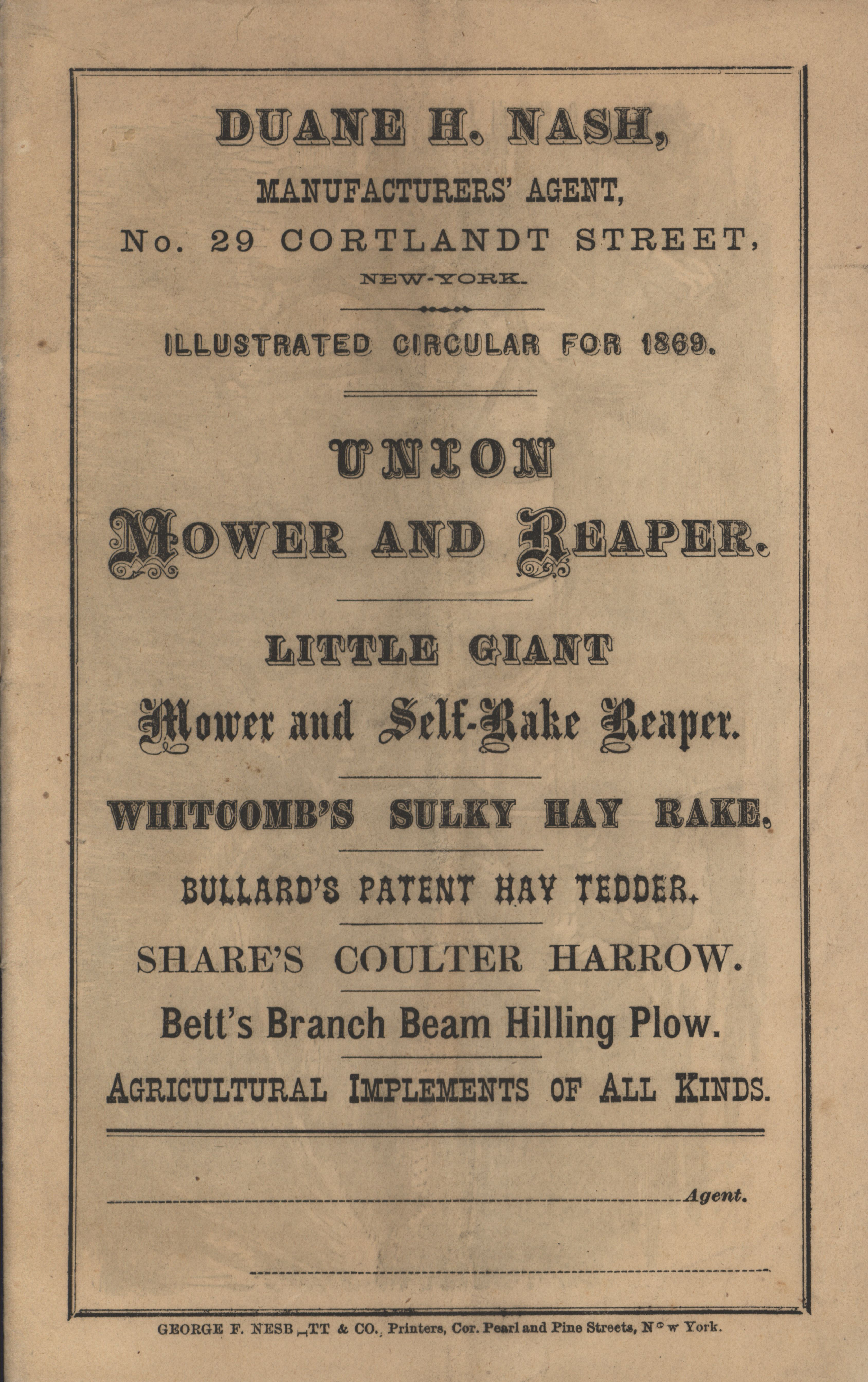 - Illustrated catalog describing the agricultural implements offered by Duane H. Nash in 1869.