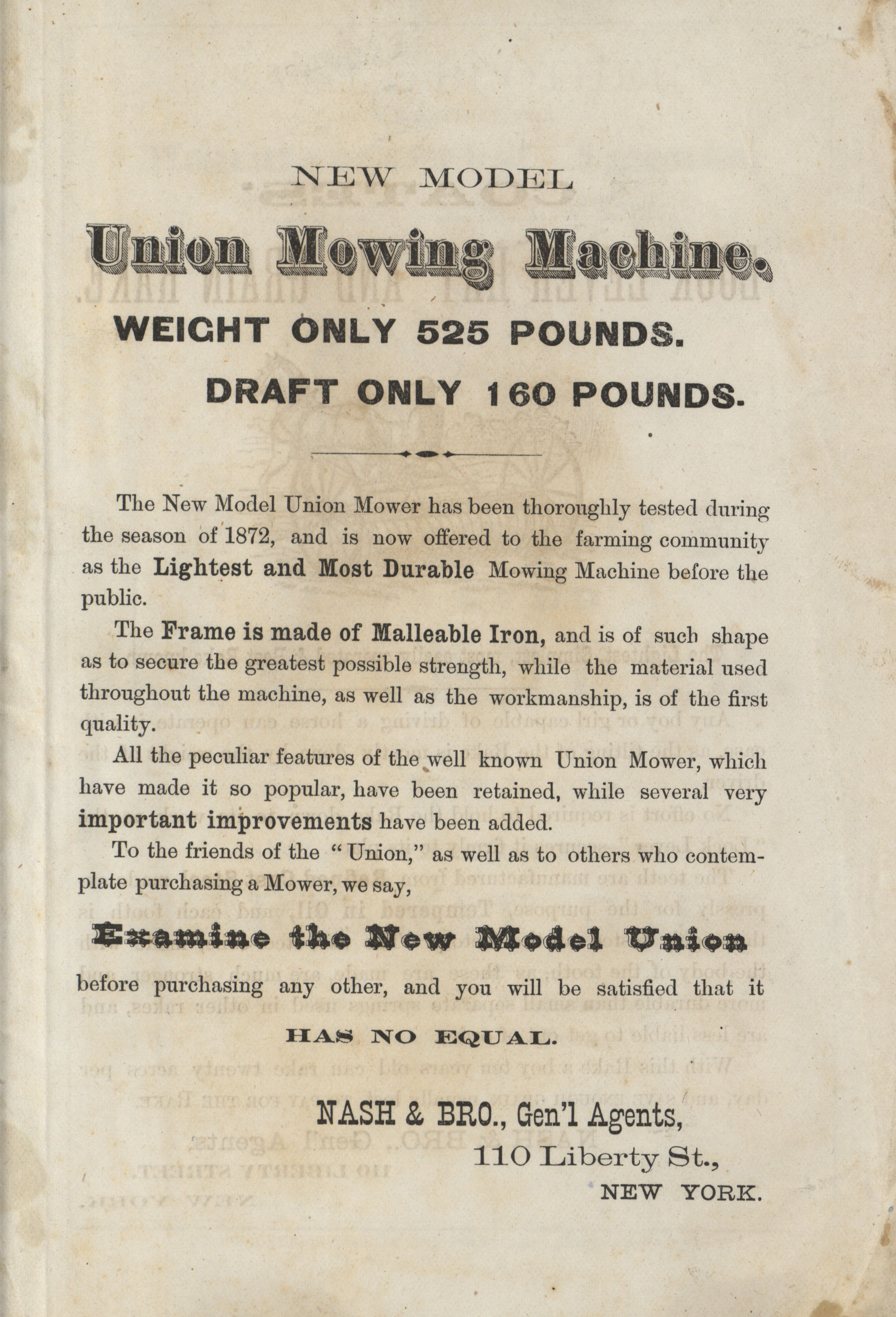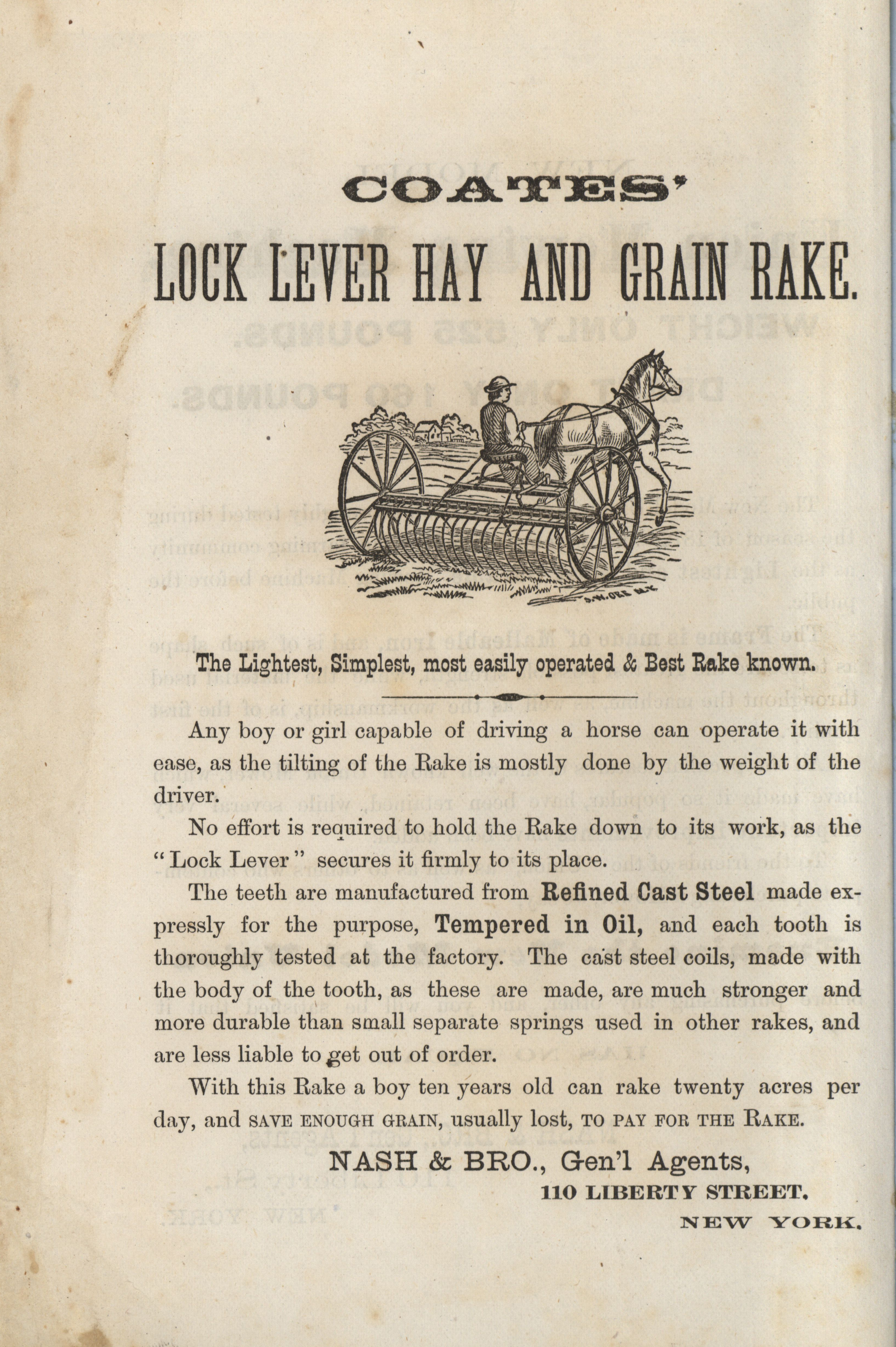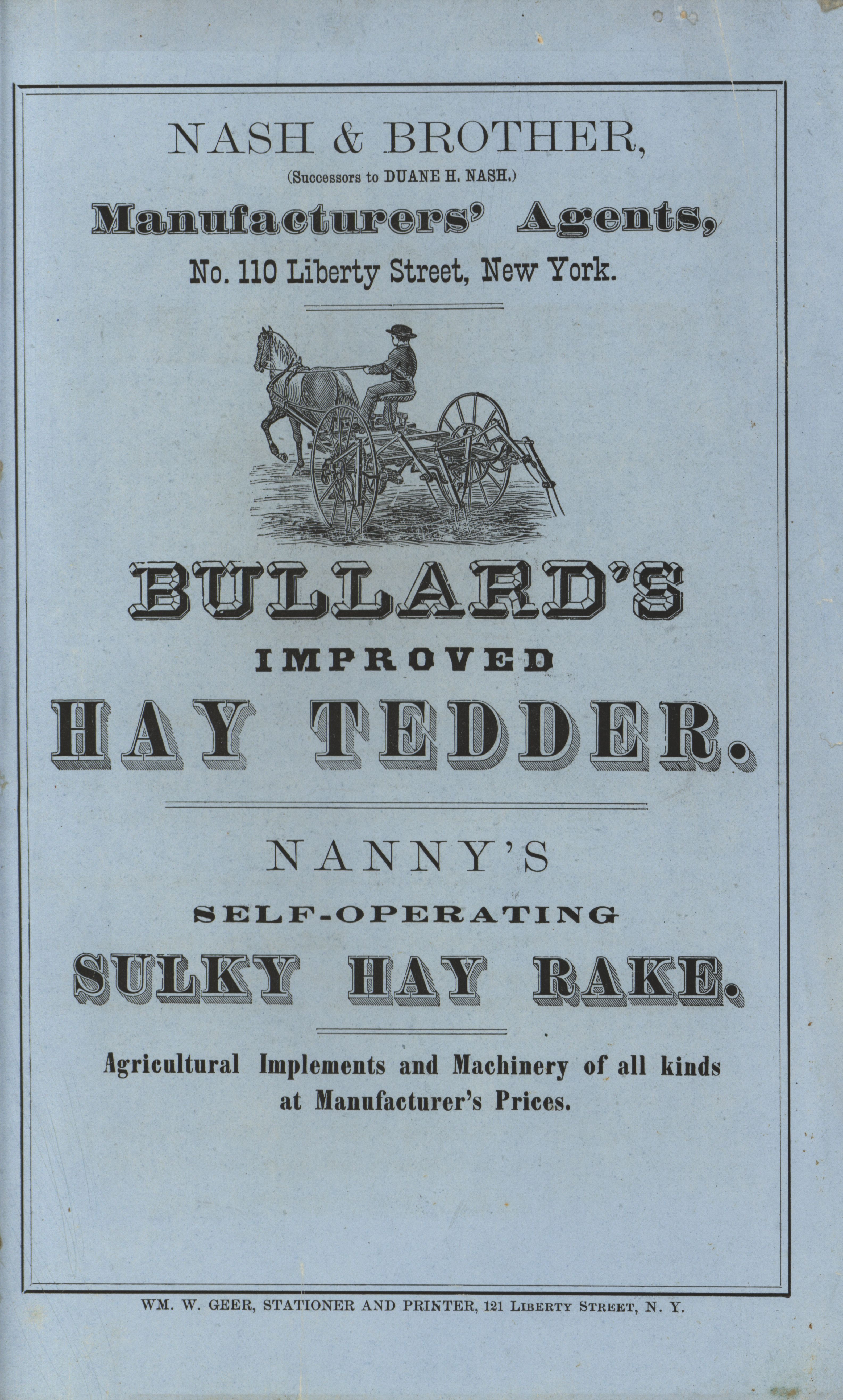 - Illustrated catalog describing the agricultural products offered by Nash and Brother Agricultural Implements and Machinery in 1871.