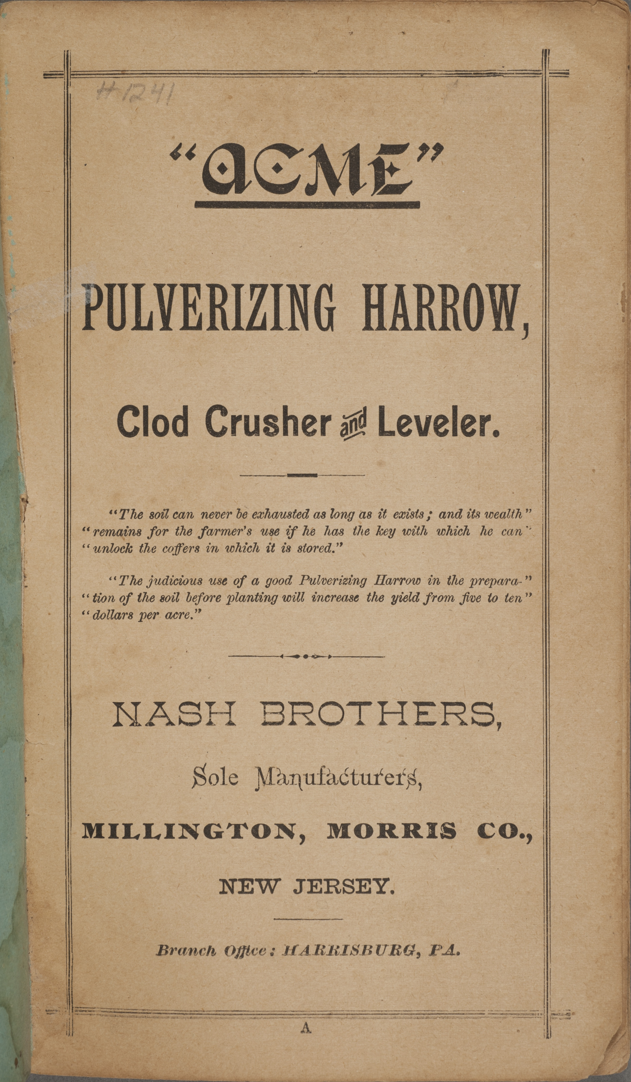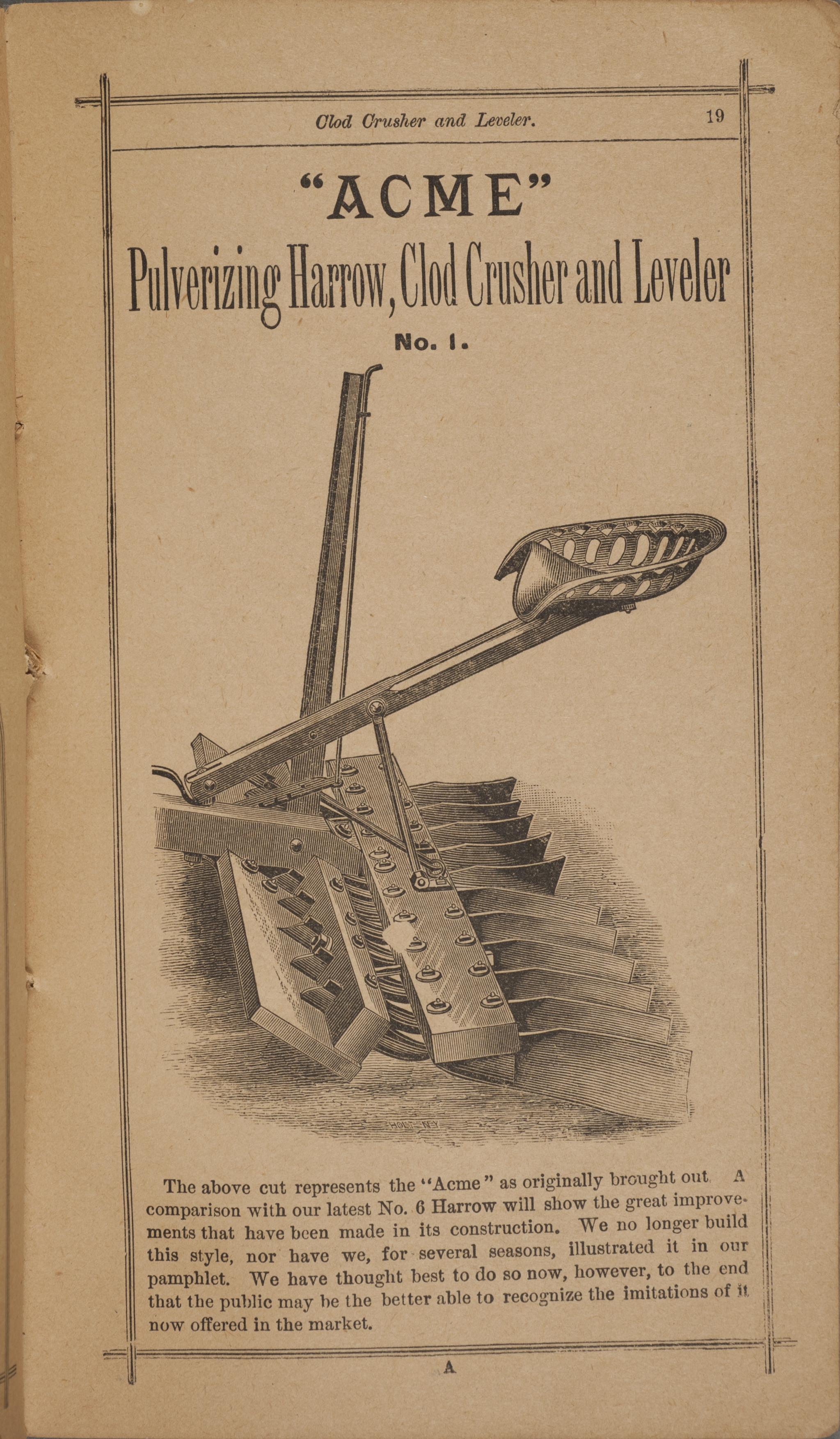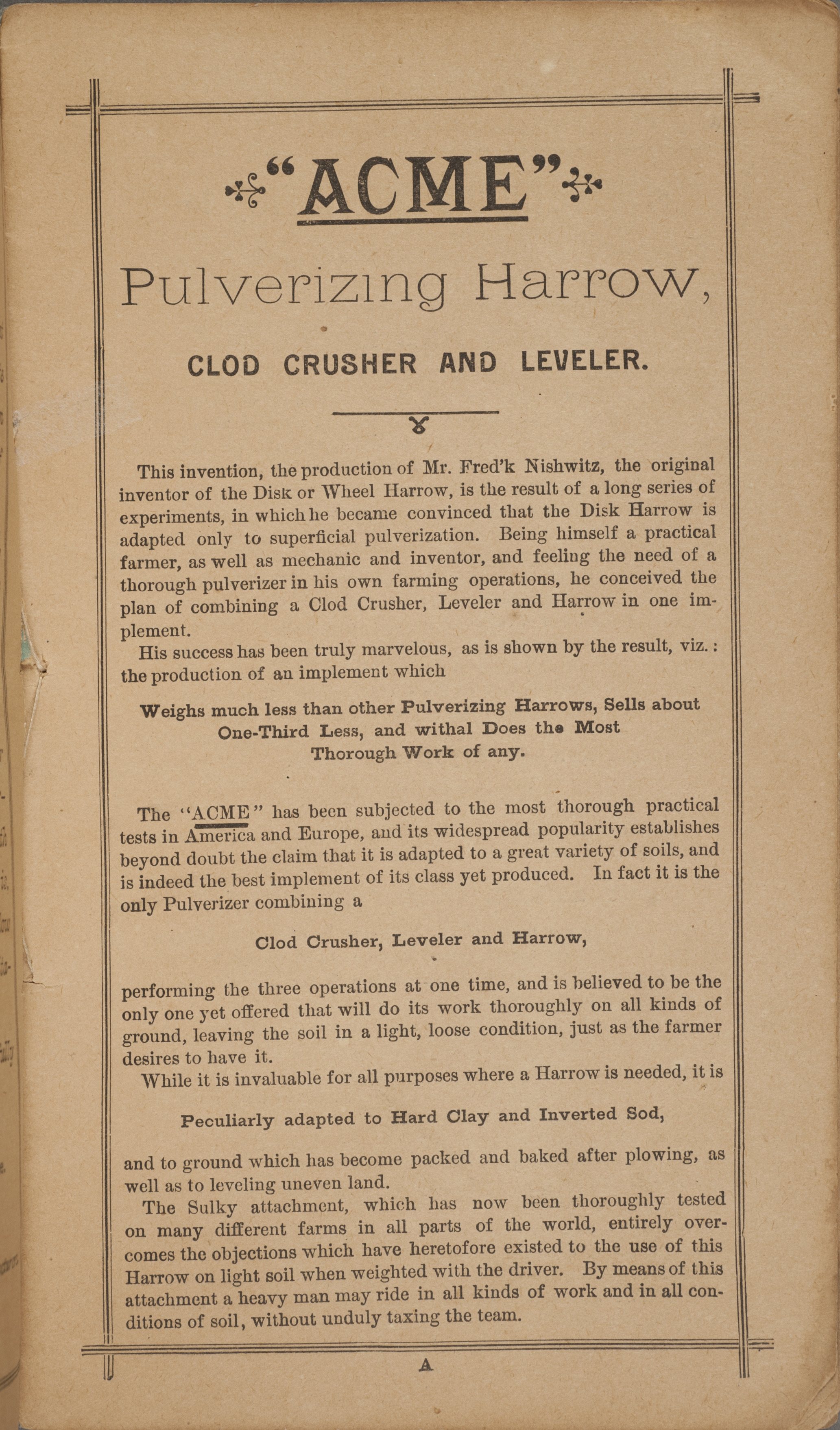 - Illustrated catalog describing the acme agricultural implements offered by Nash and Brother Manufactory.