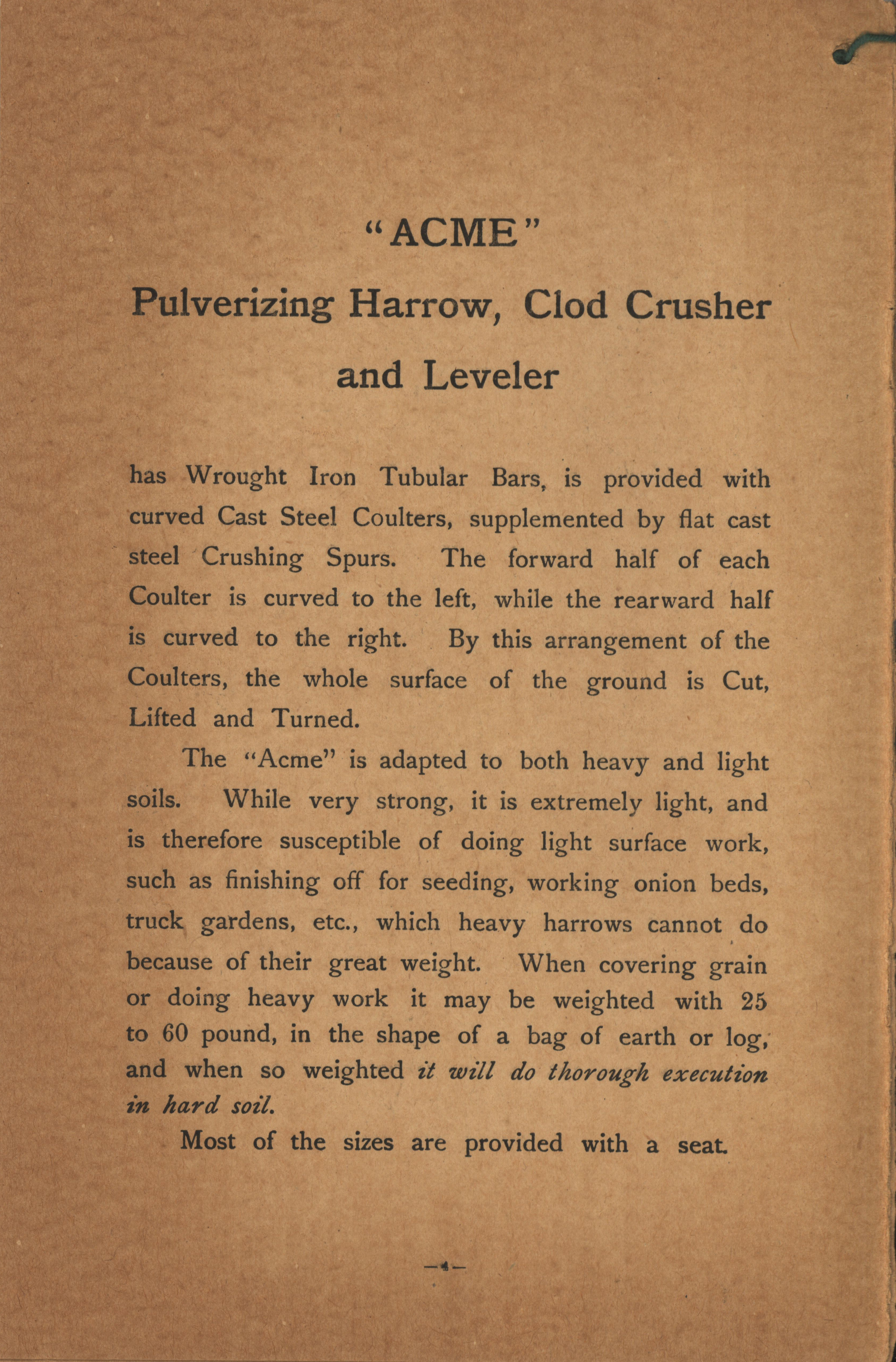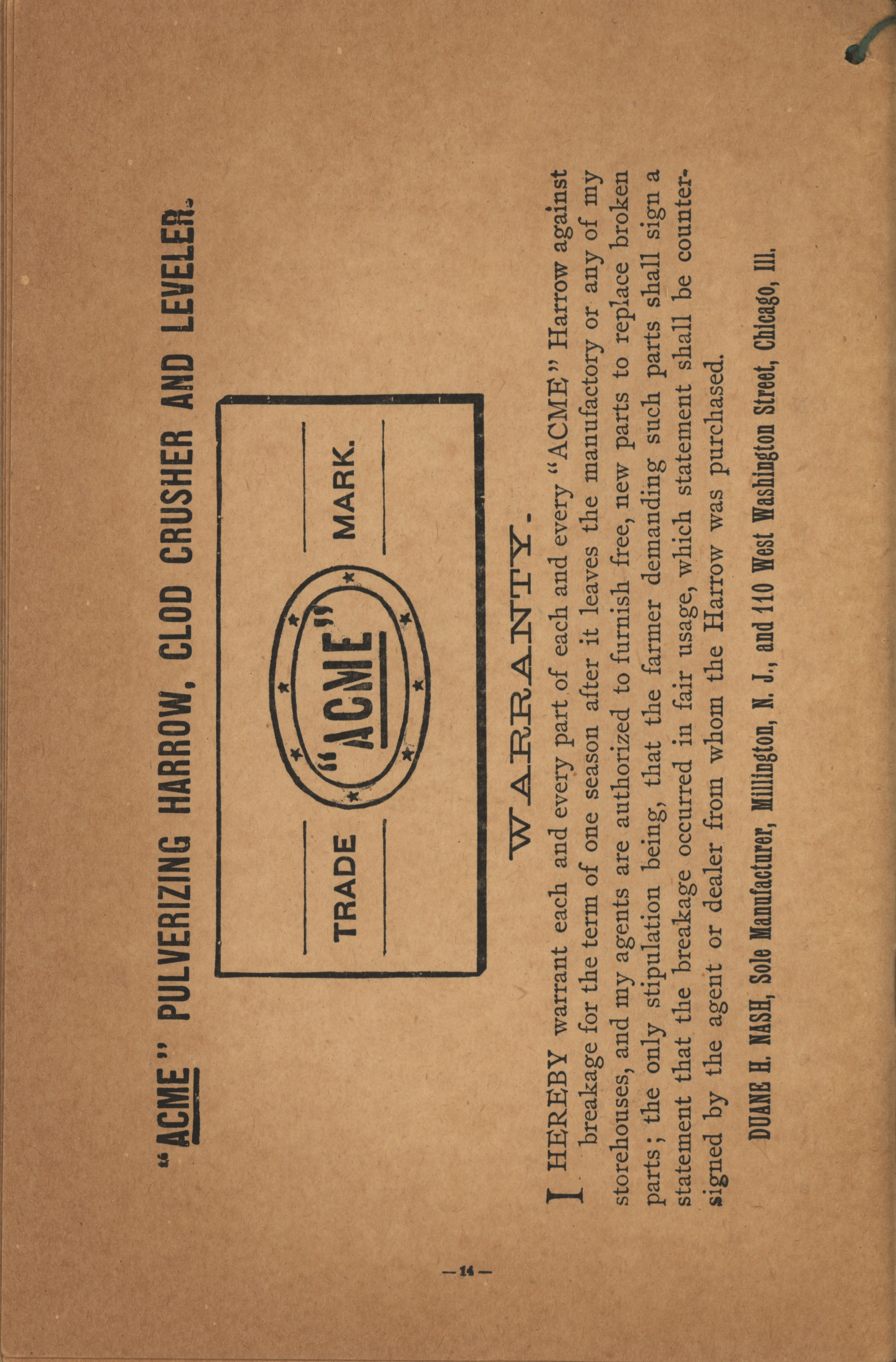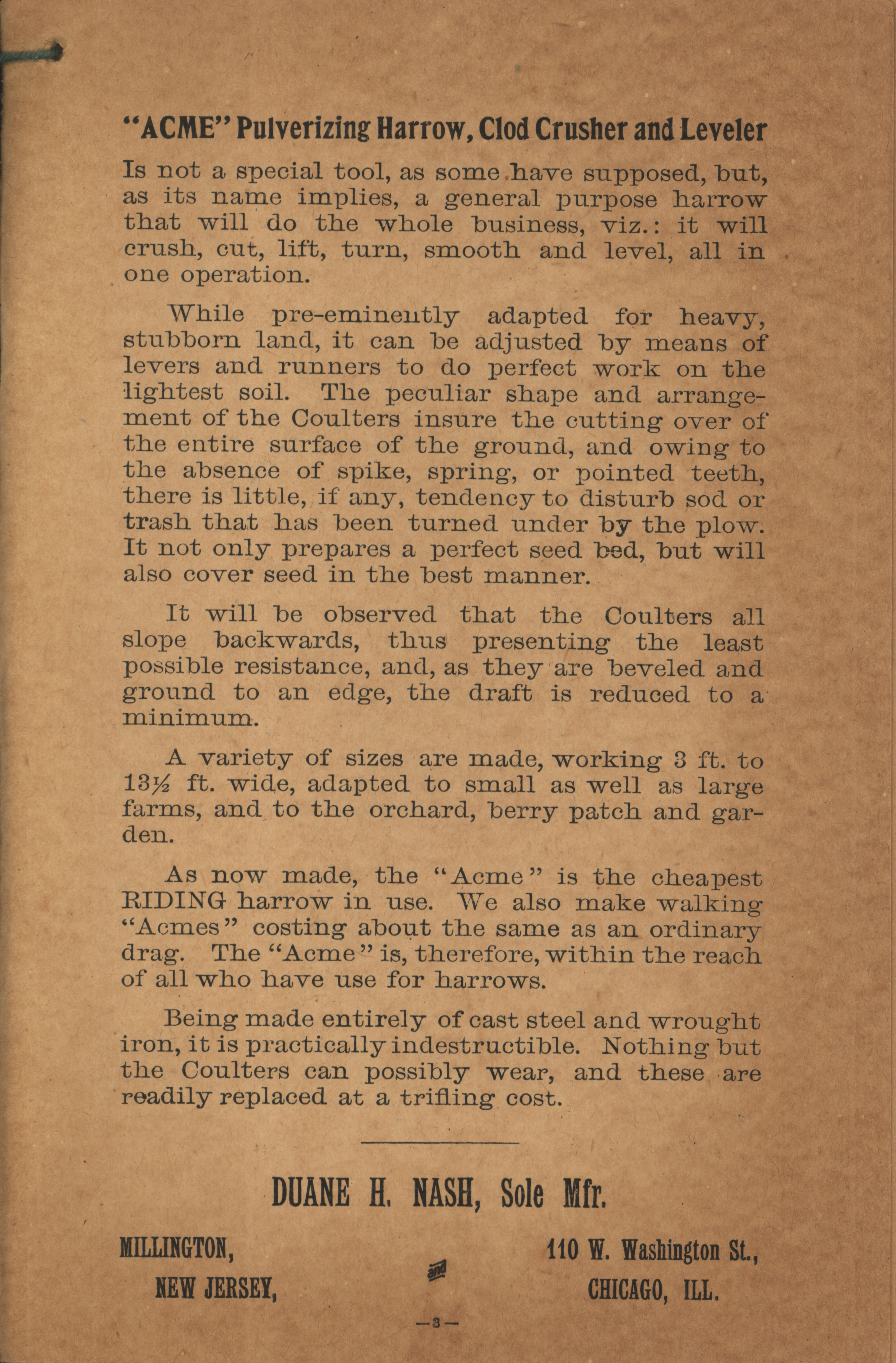 - Illustrated catalog describing the Acme agricultural implements offered by Duane H. Nash.