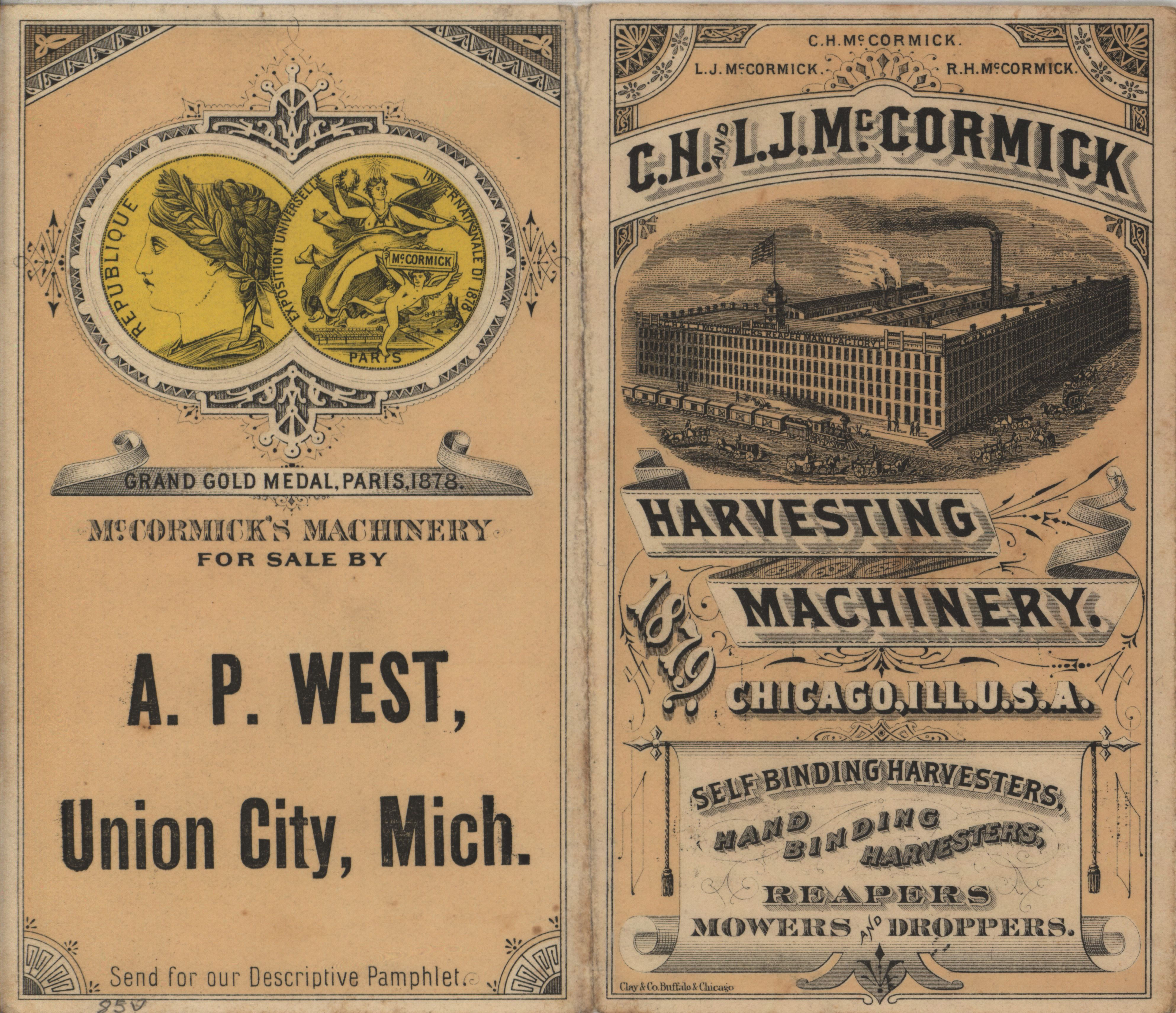 - "C. H. and L. J. McCormick harvesting machinery advertisement", Agricultural Machinery Literature Collection, Iowa State University Library Digital Collections