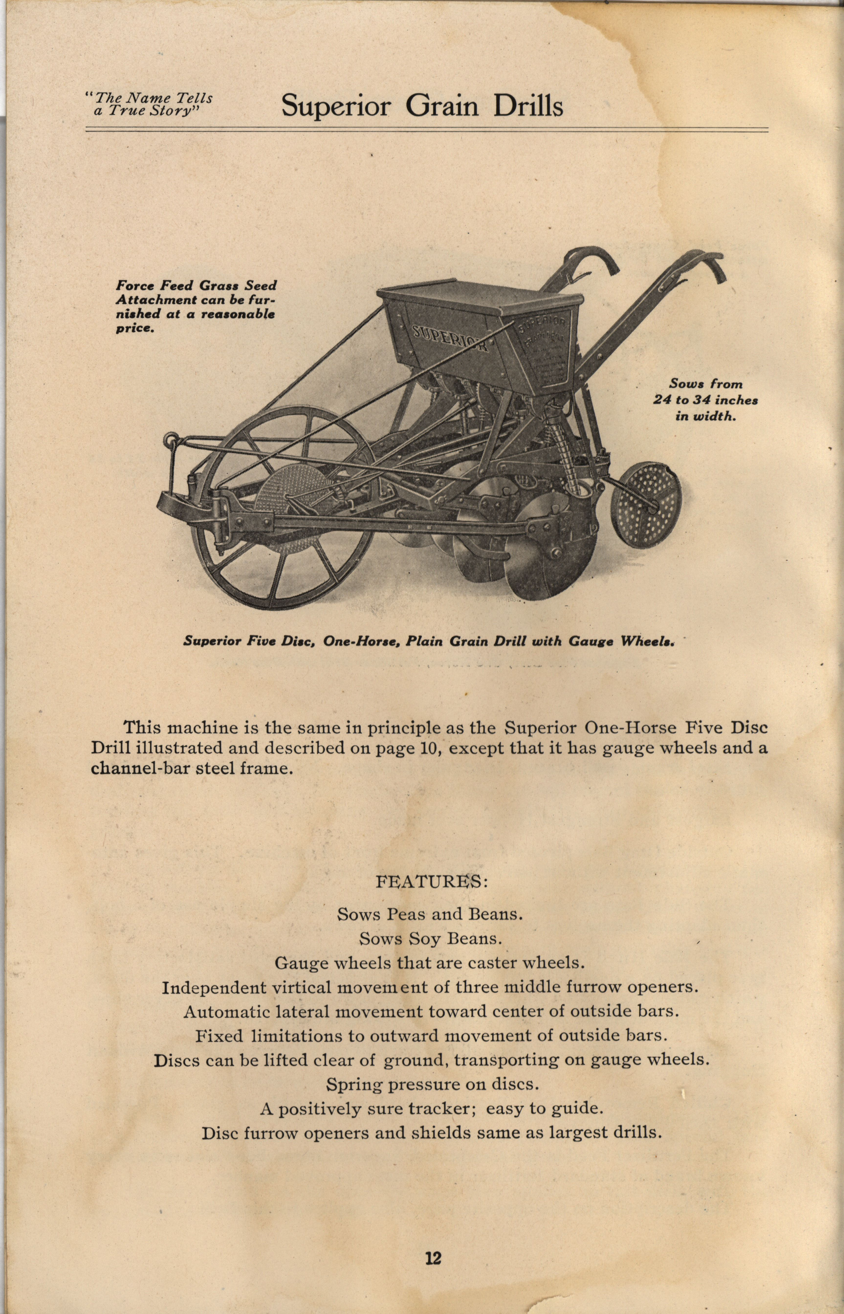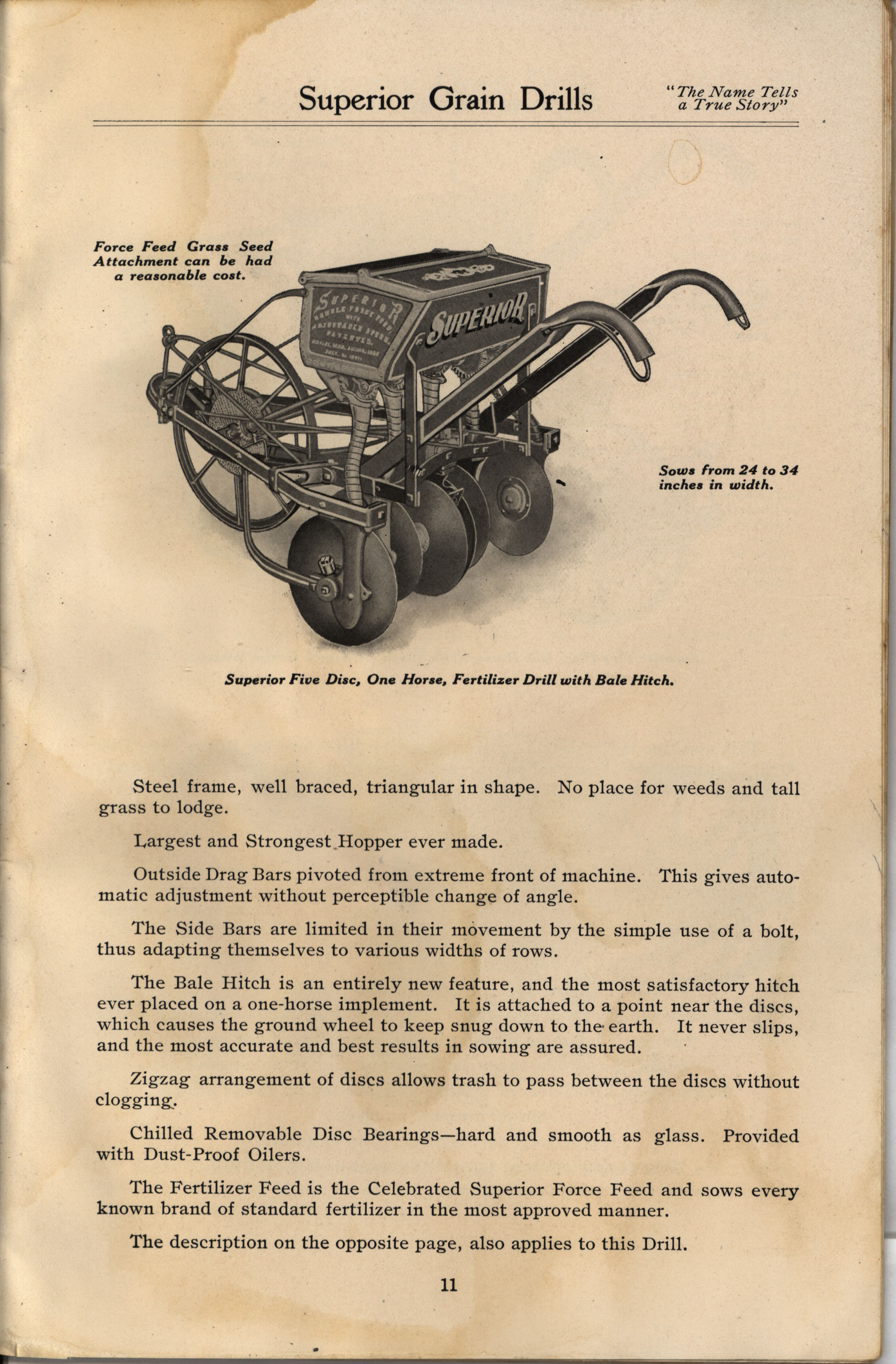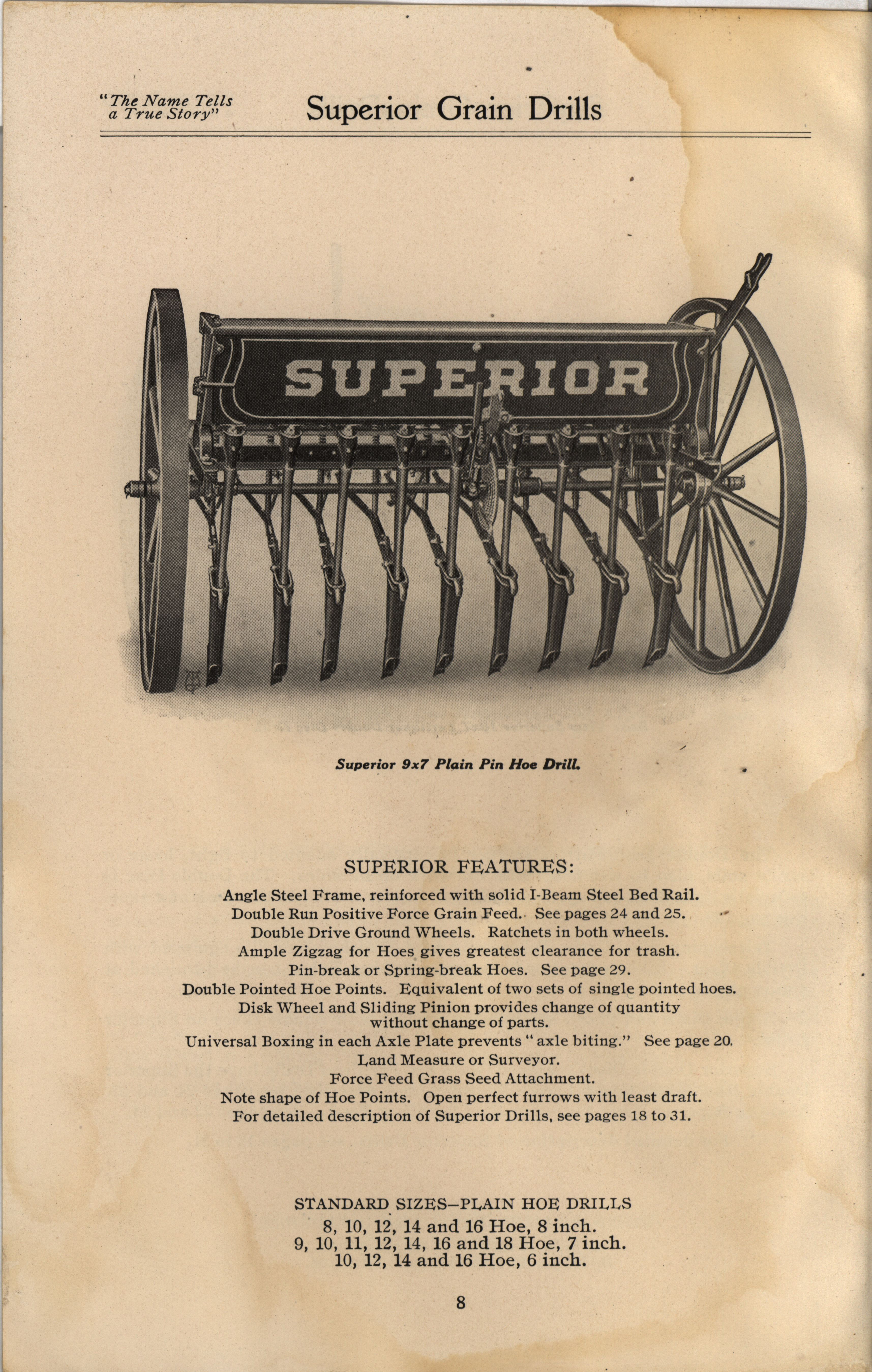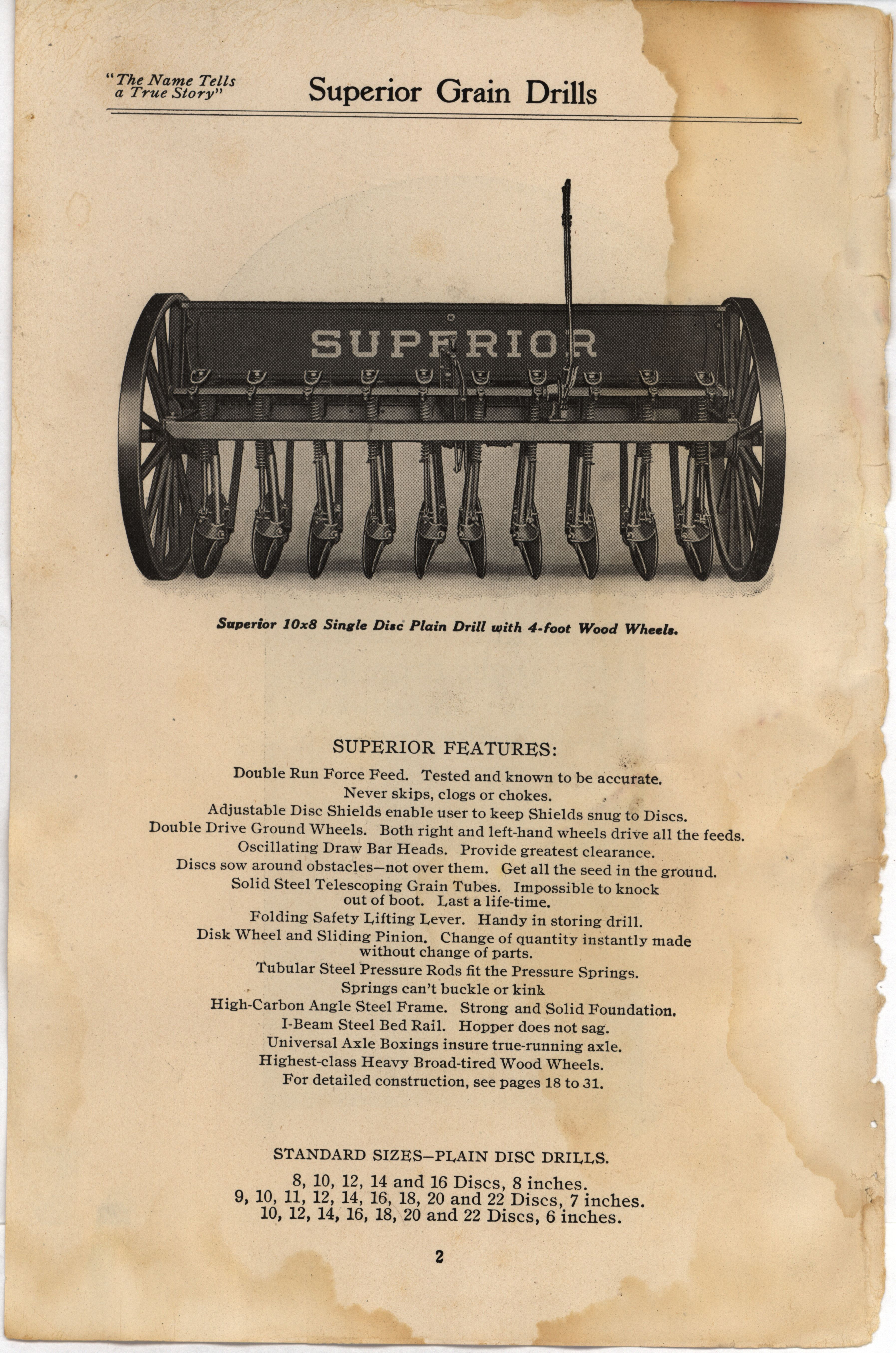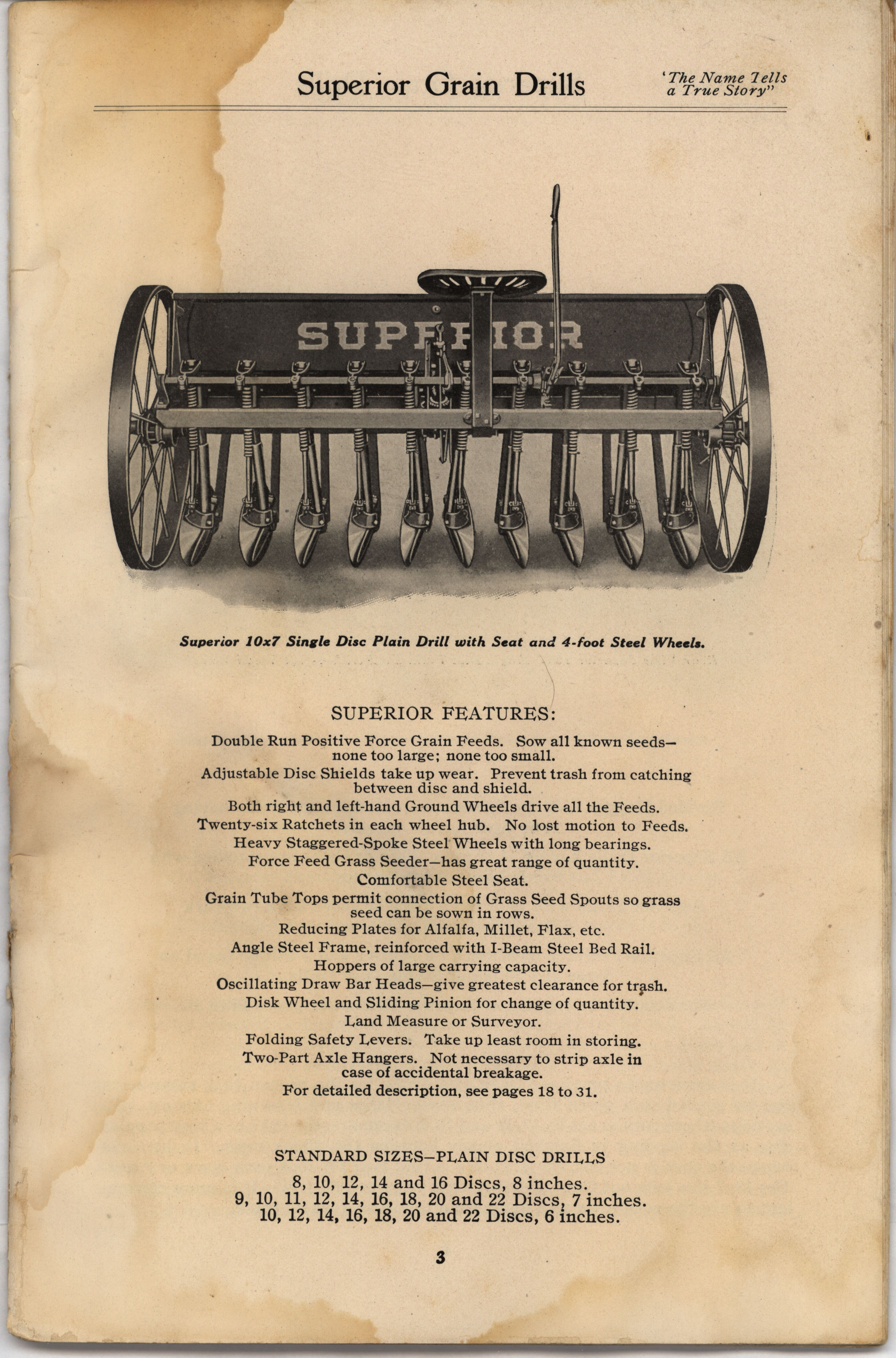 - Catalog from 1910 by the American Seeding Machine Company describing the products offered in their Super Grain Drill line including illustrations.