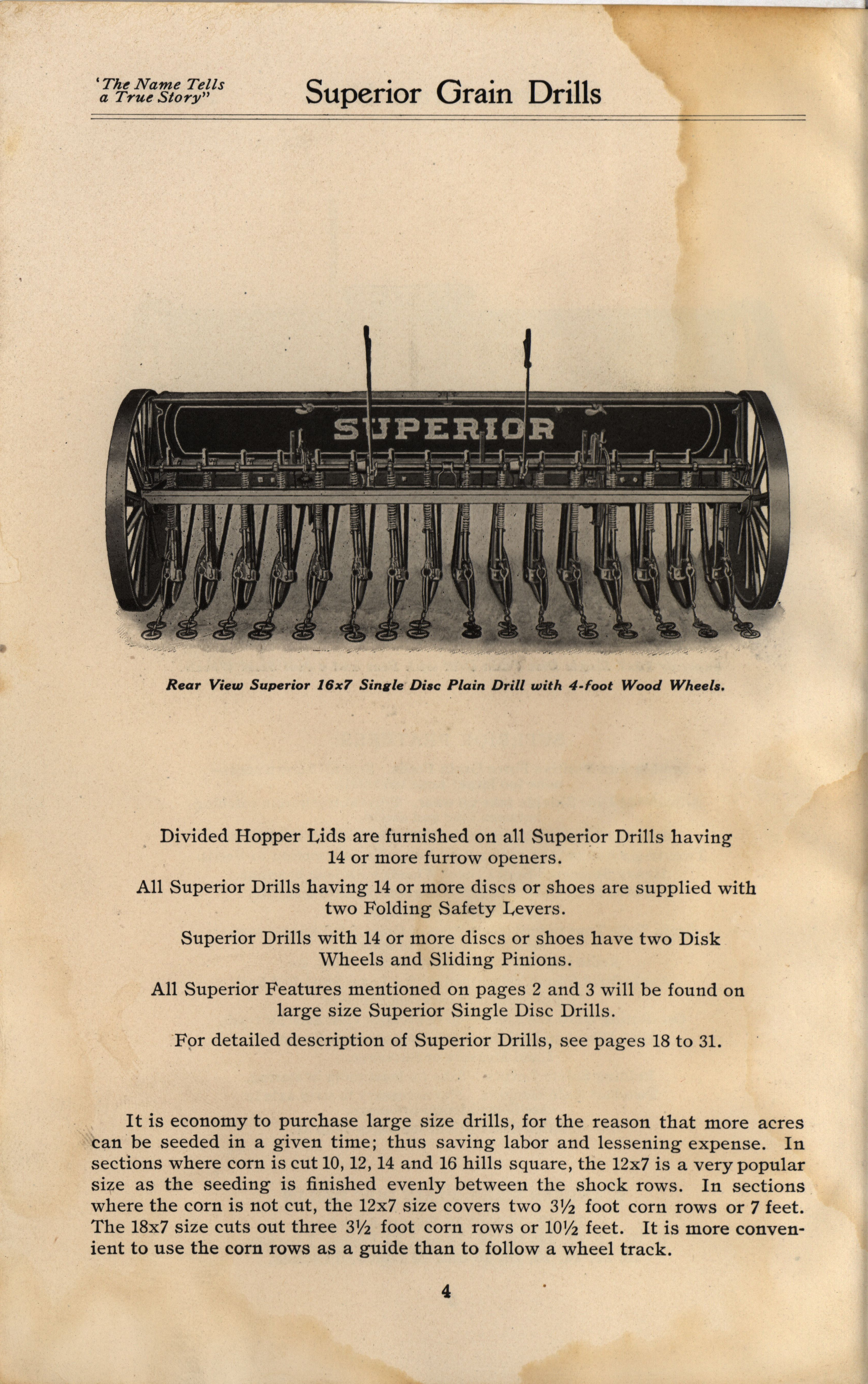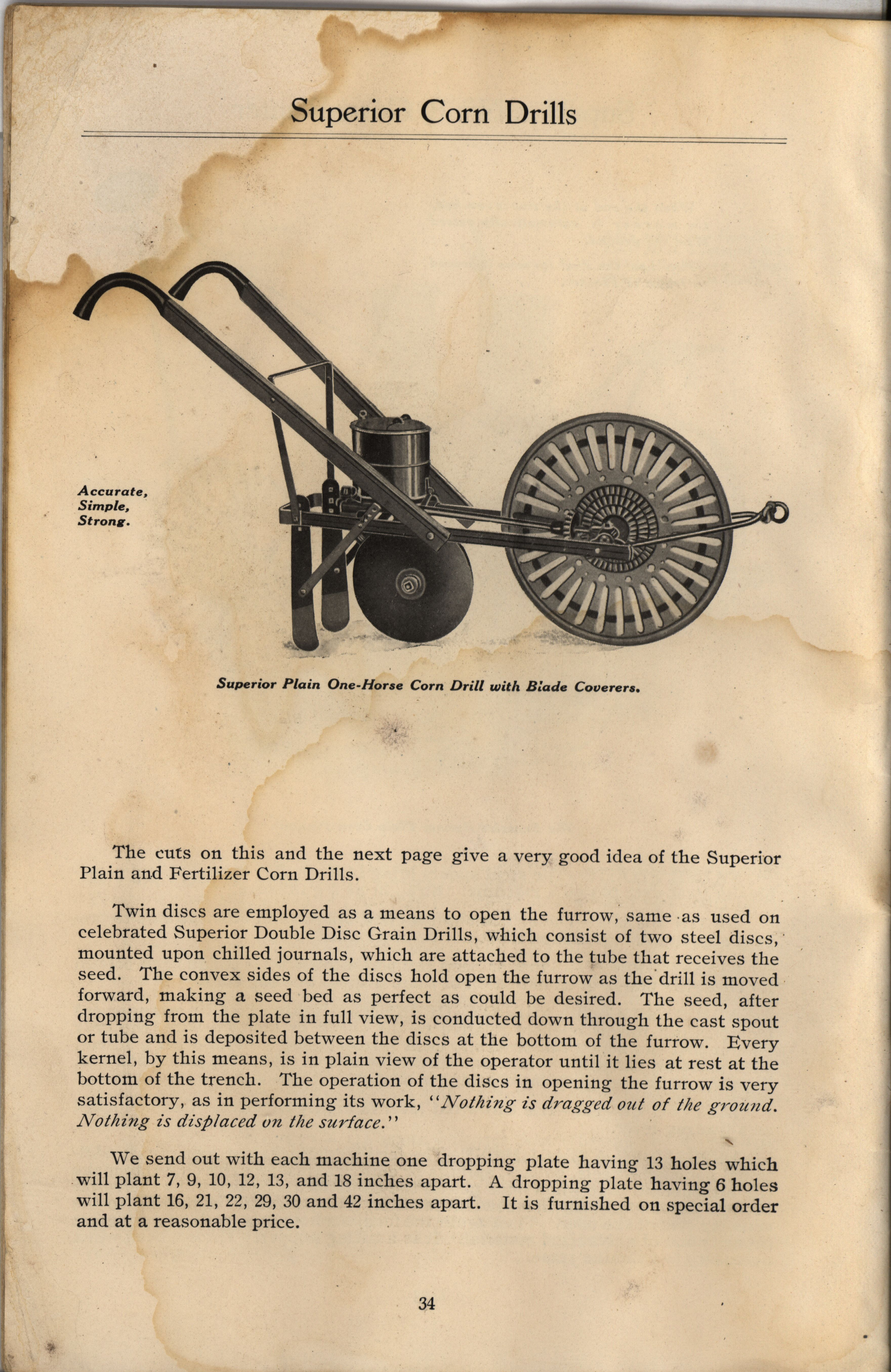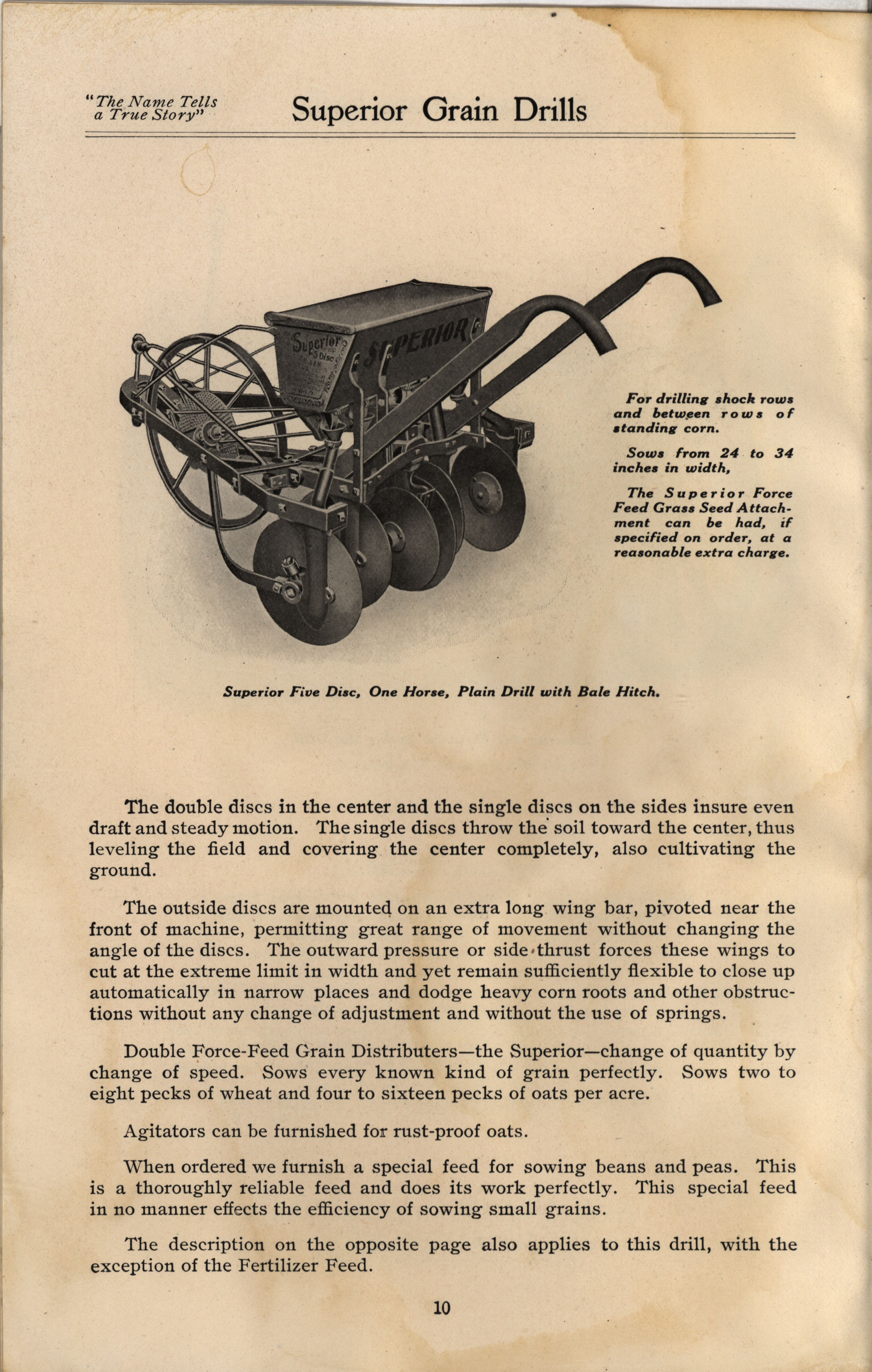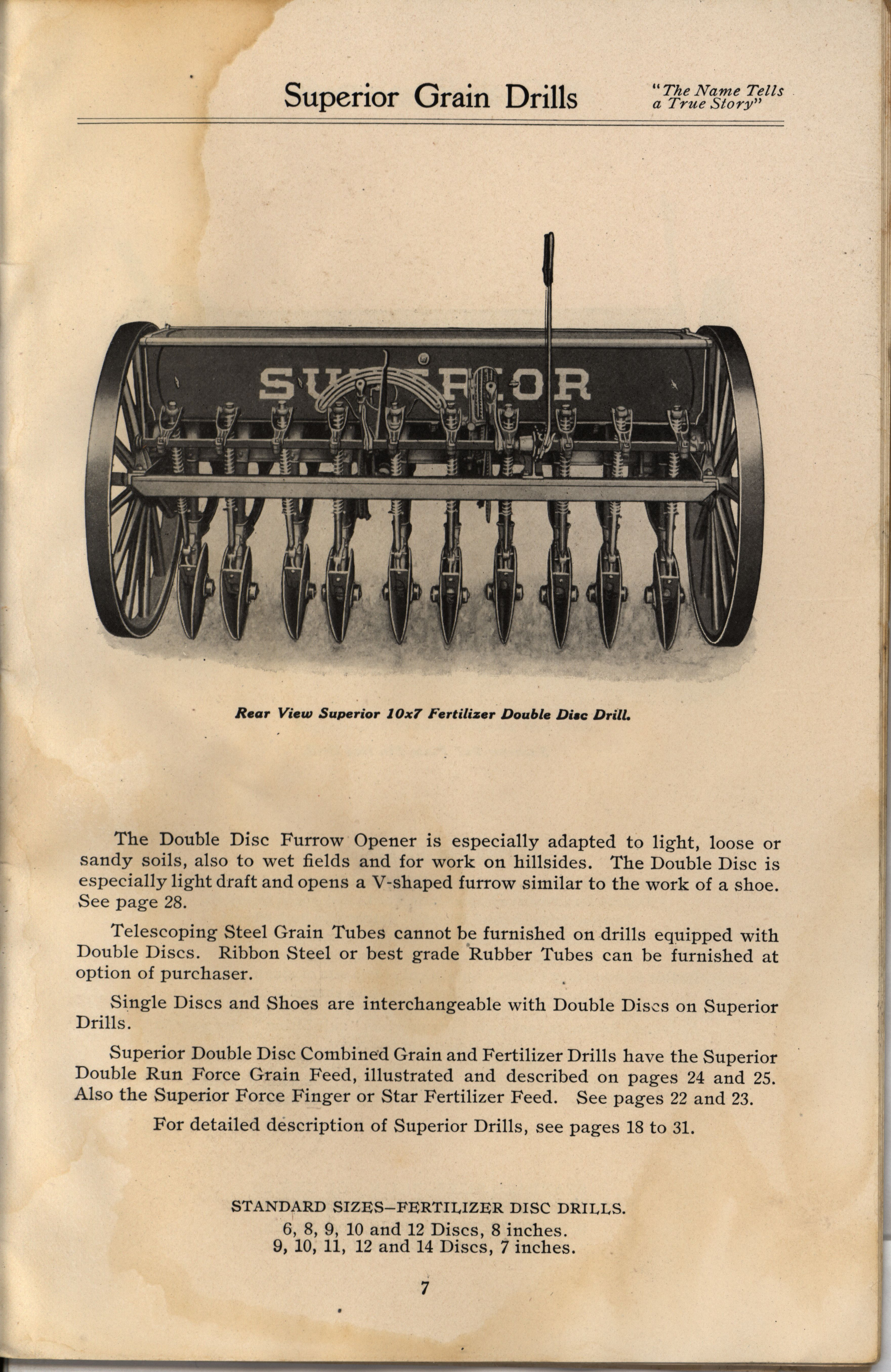- Catalog from 1910 by the American Seeding Machine Company describing the products offered in their Super Grain Drill line including illustrations.