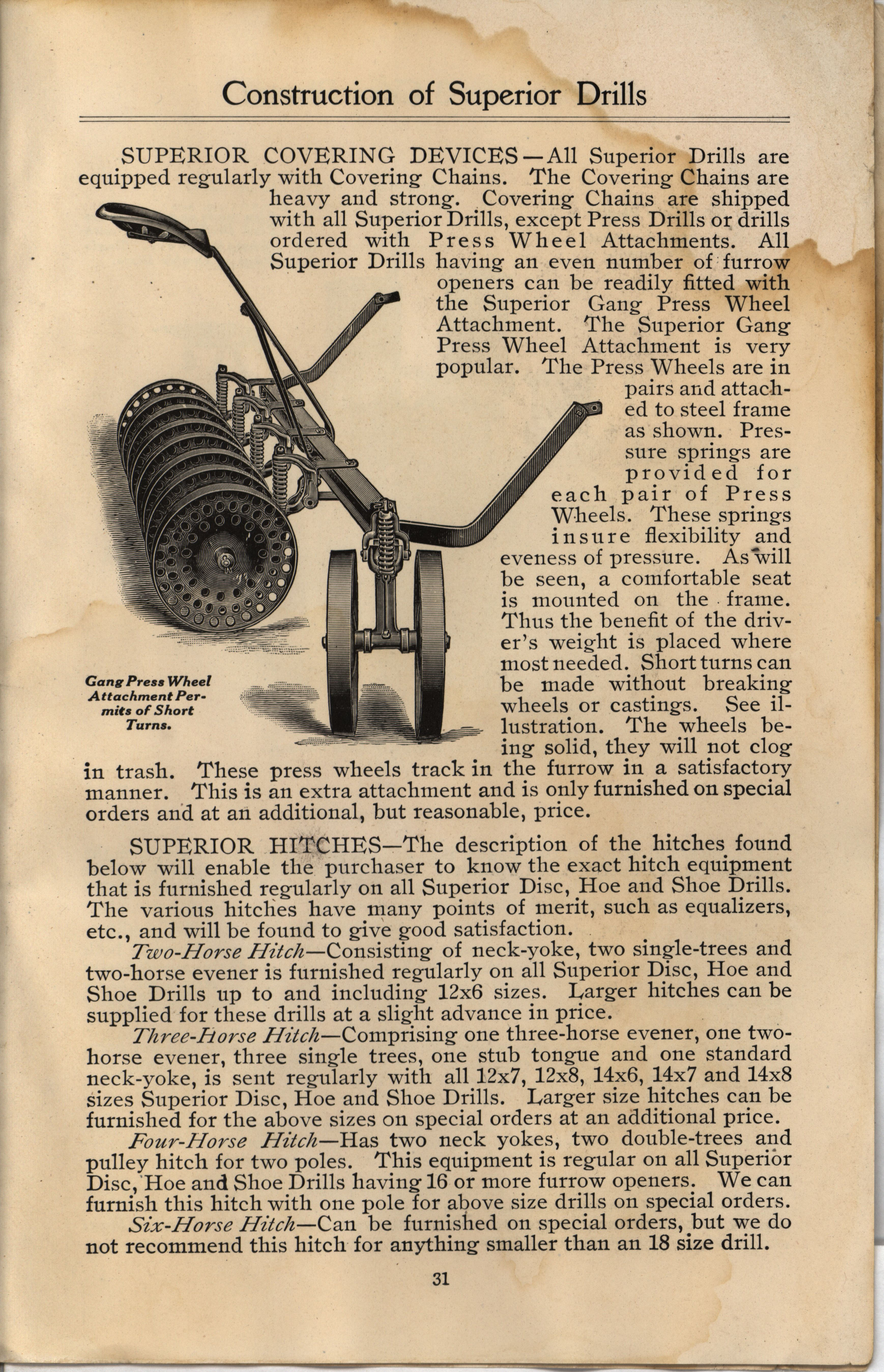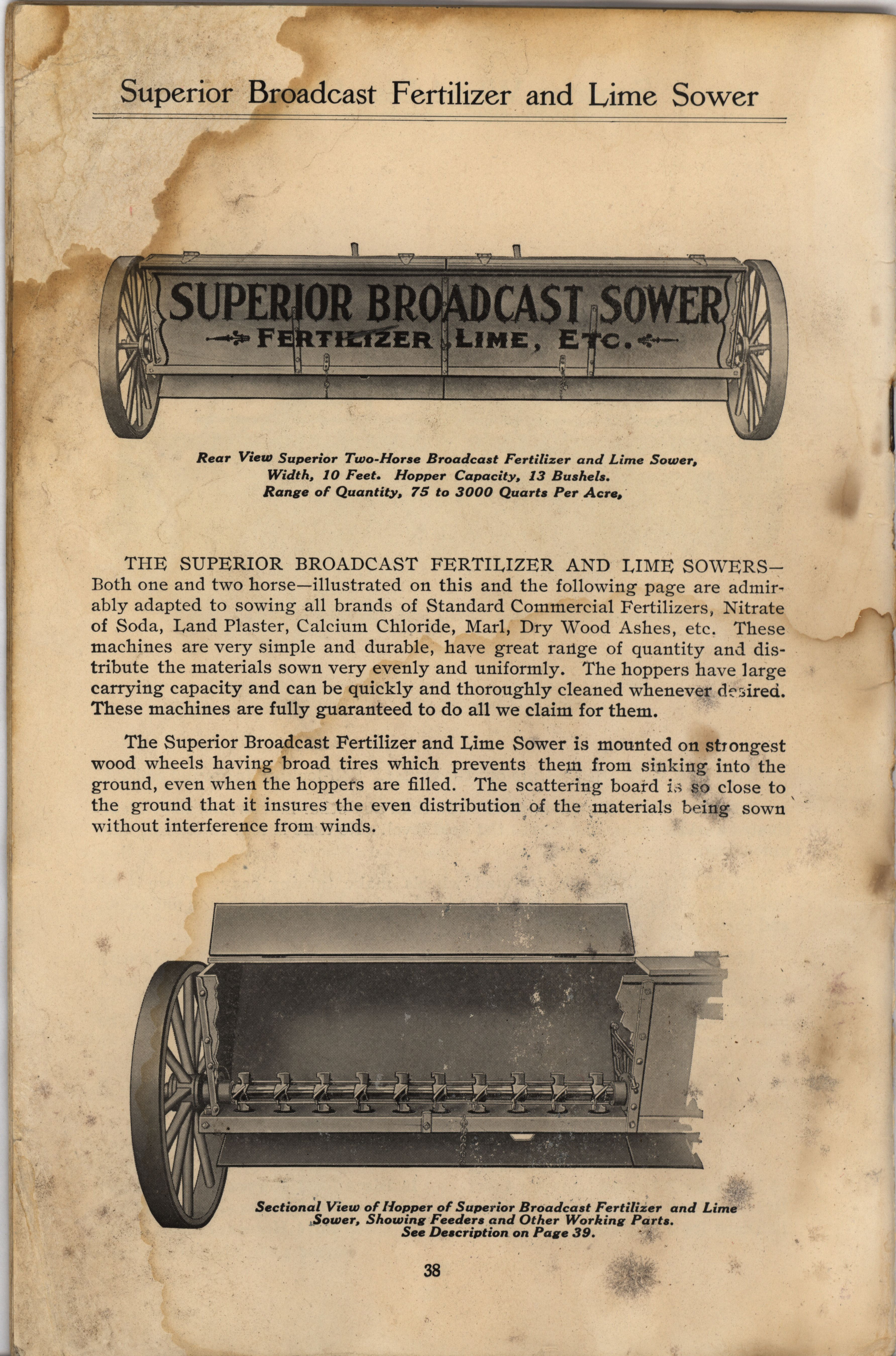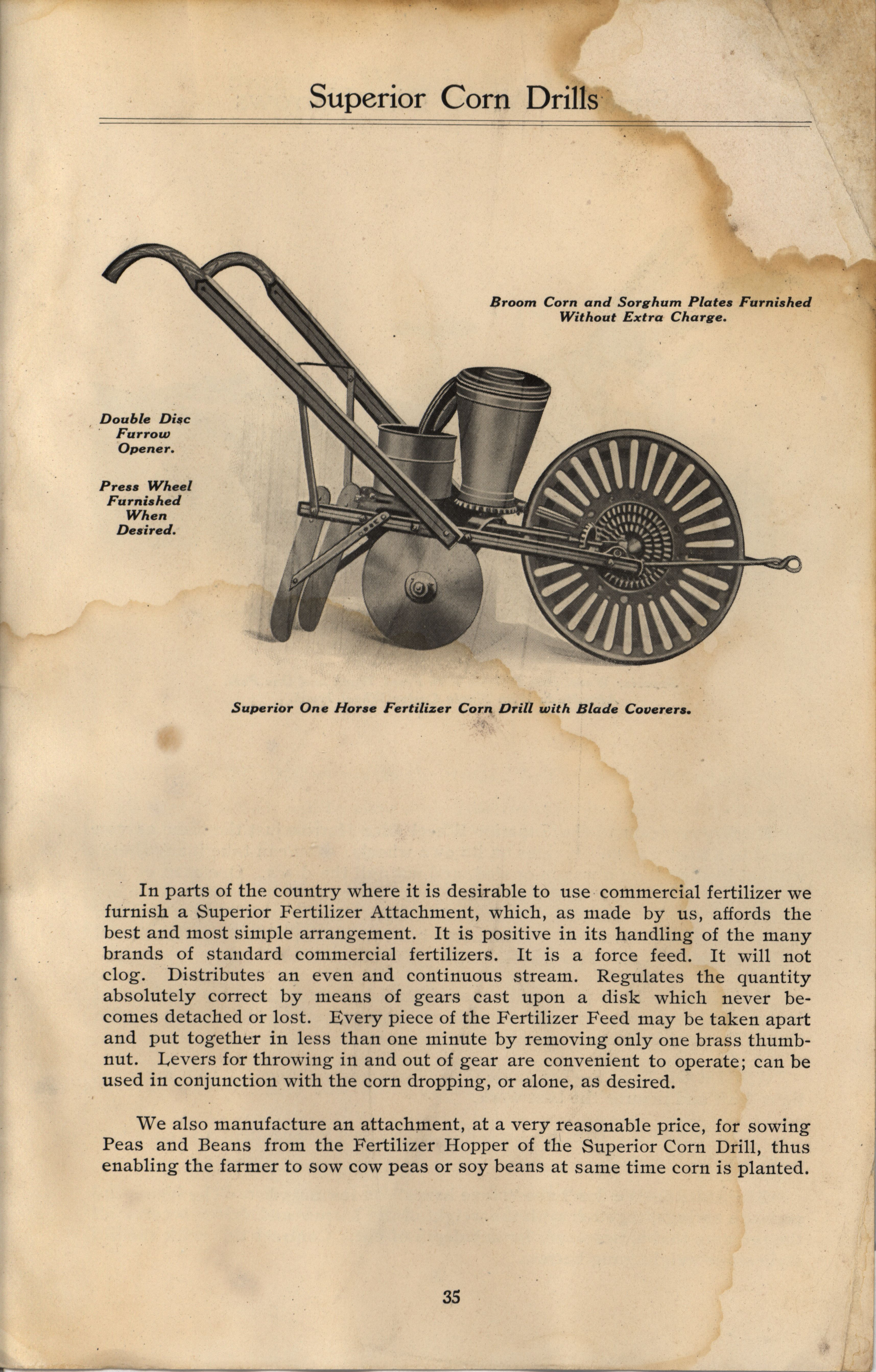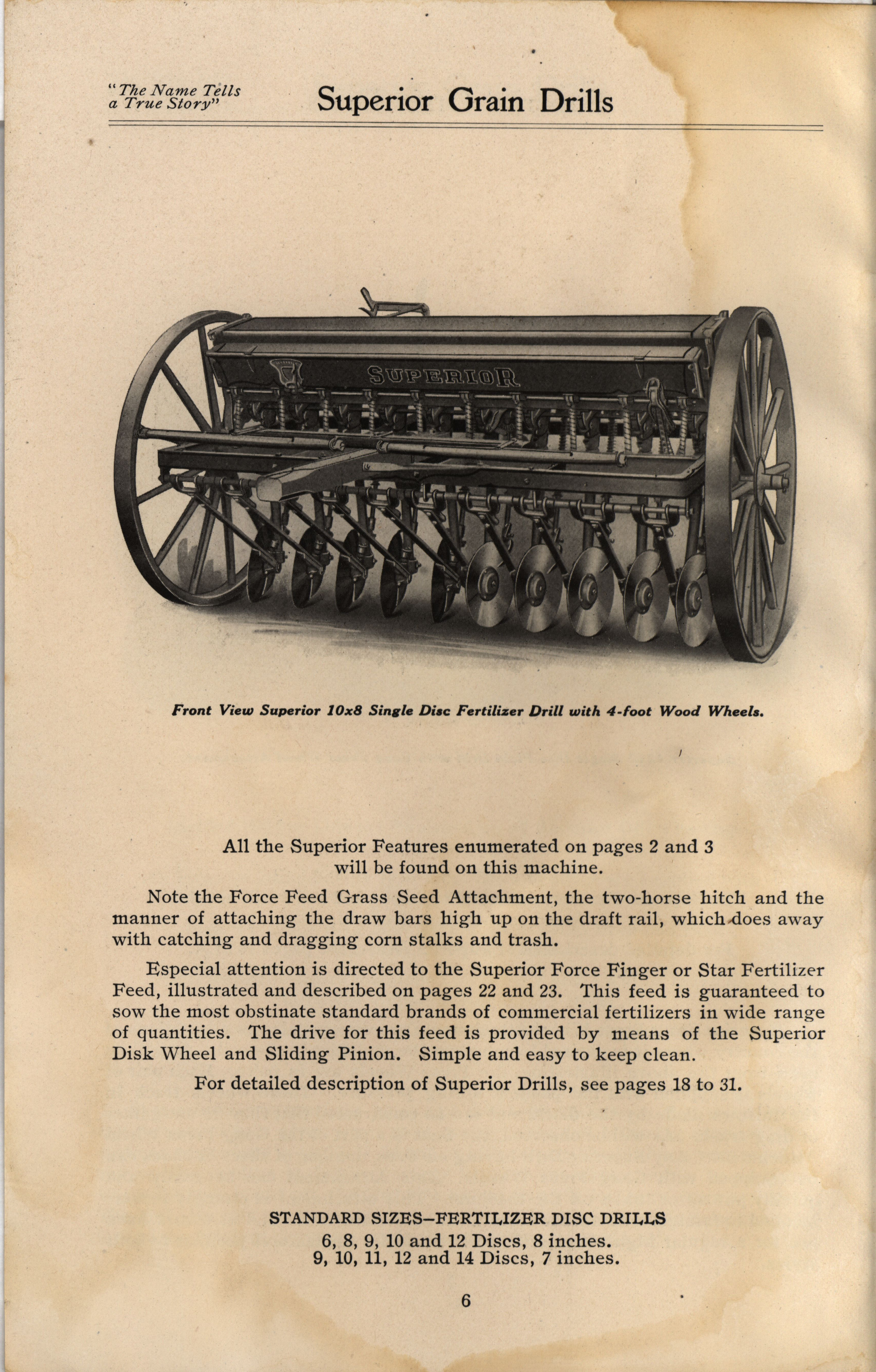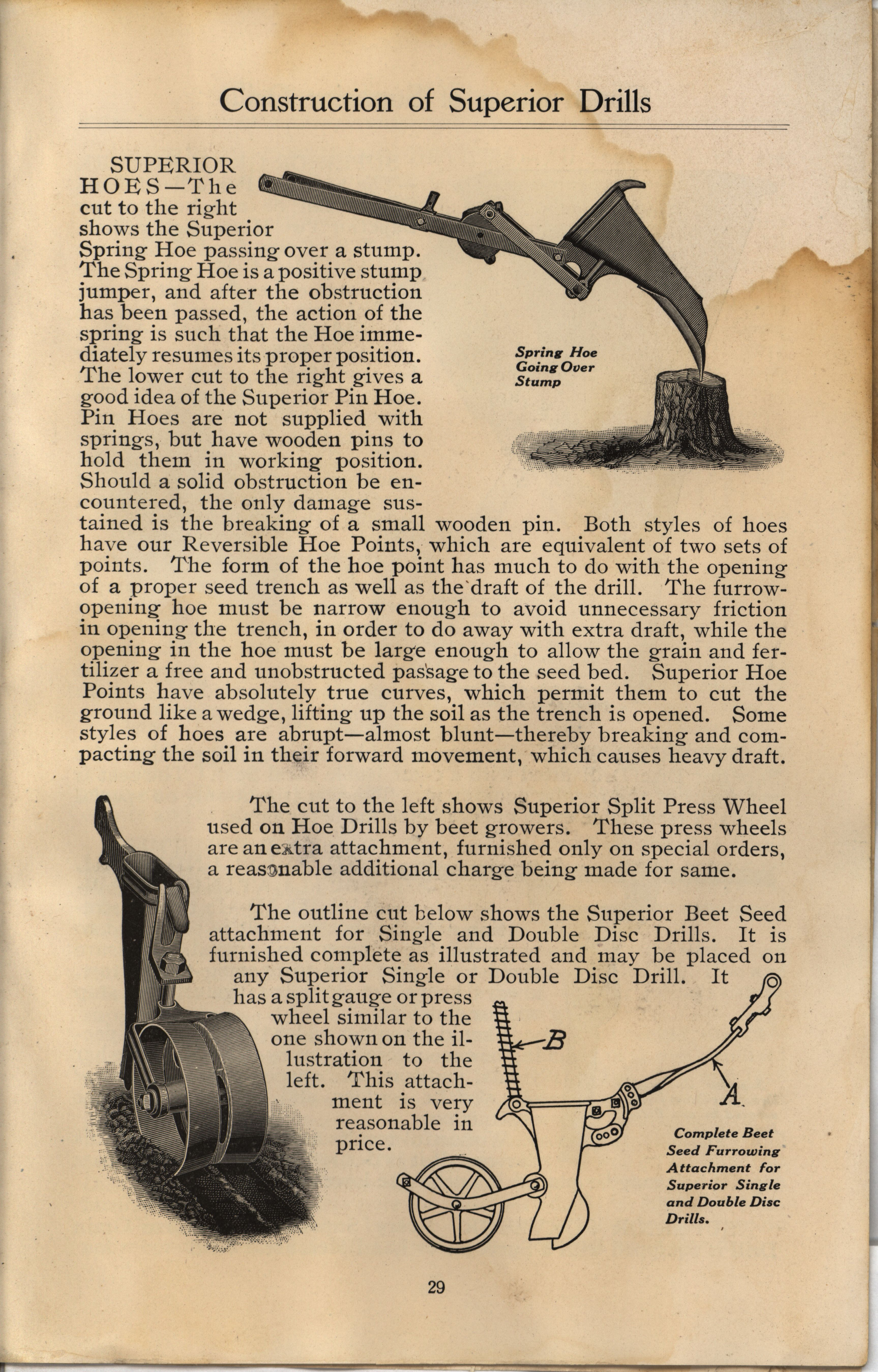 - Catalog from 1910 by the American Seeding Machine Company describing the products offered in their Super Grain Drill line including illustrations.