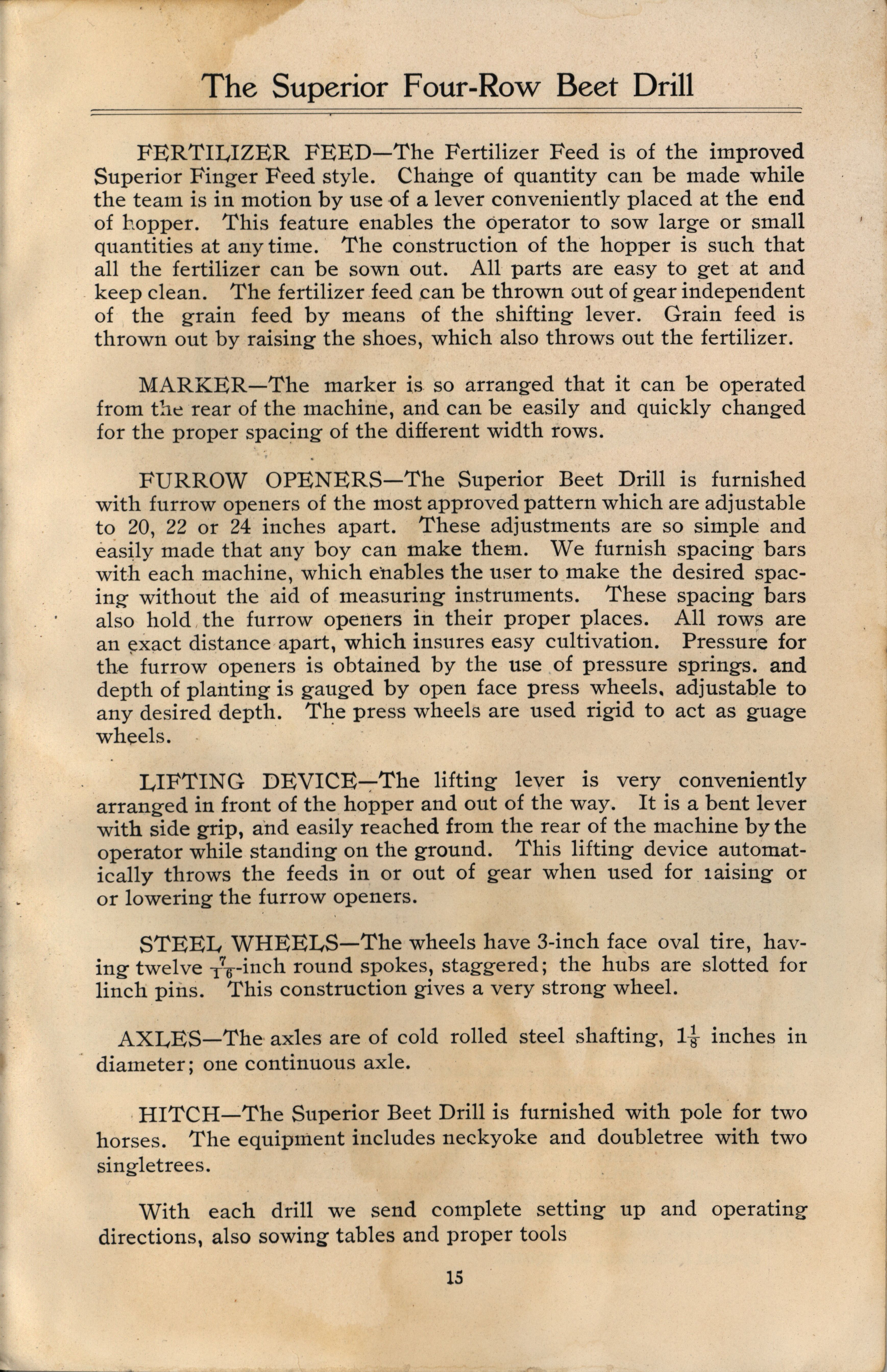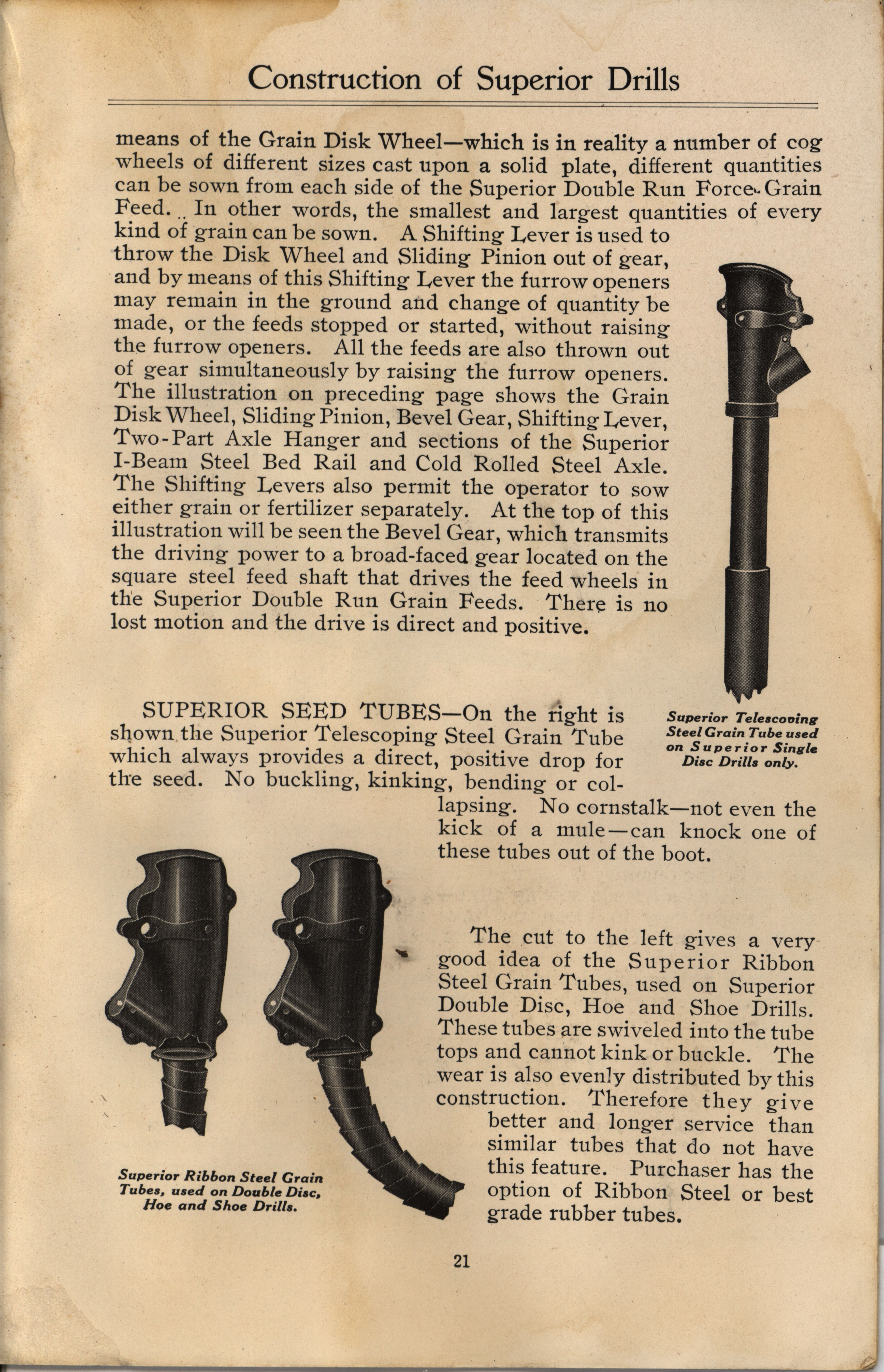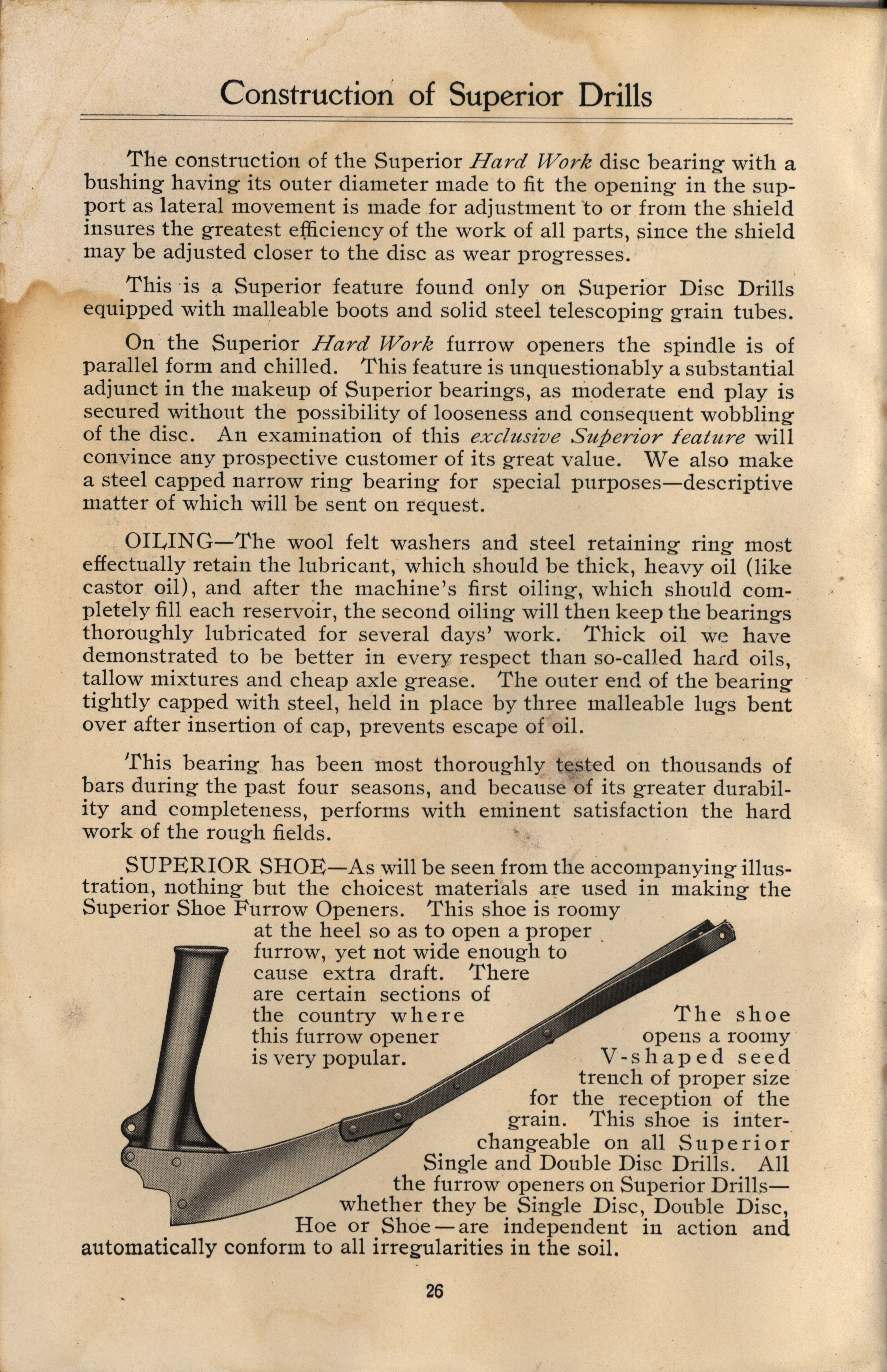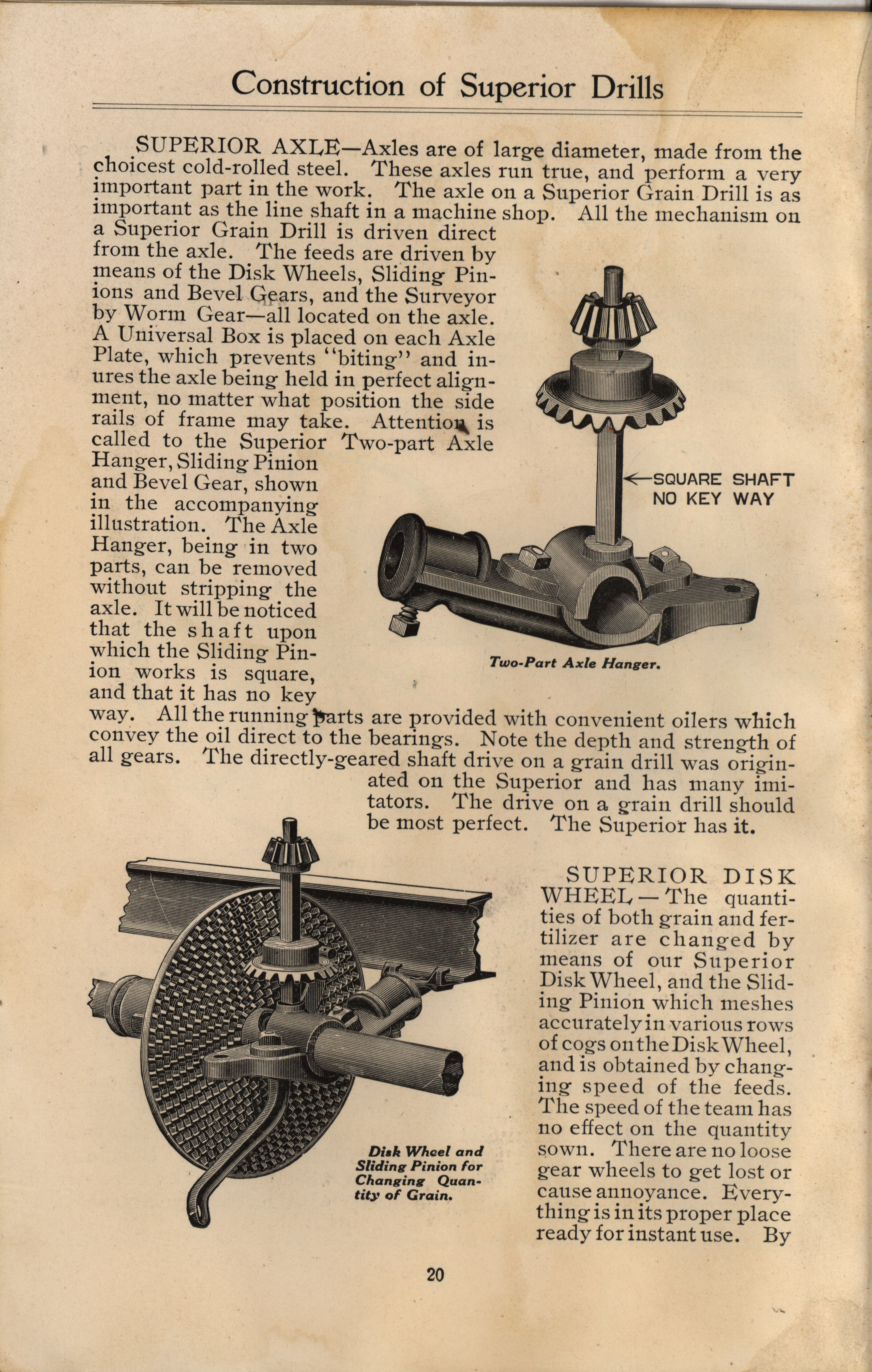 - Catalog from 1910 by the American Seeding Machine Company describing the products offered in their Super Grain Drill line including illustrations.