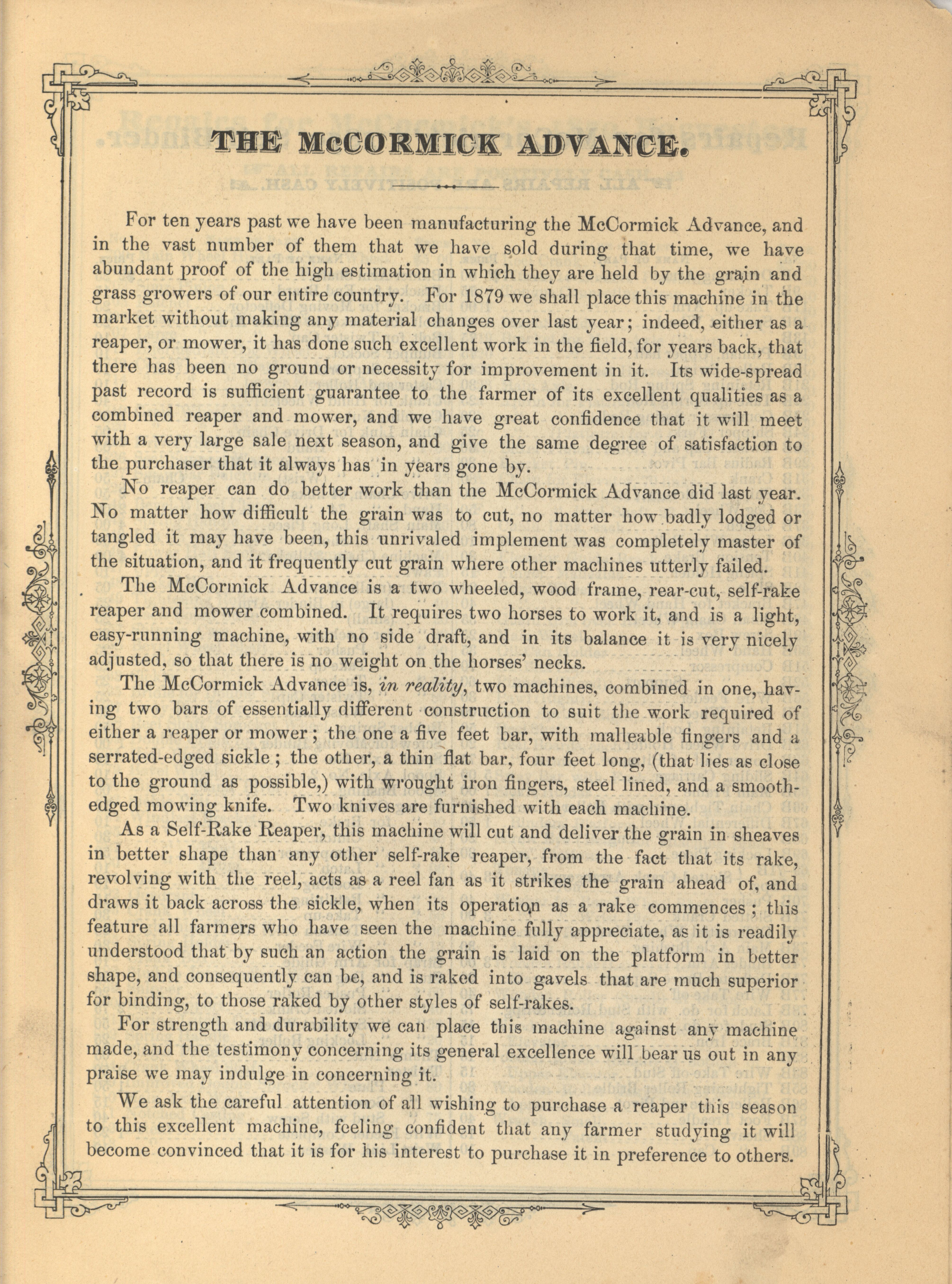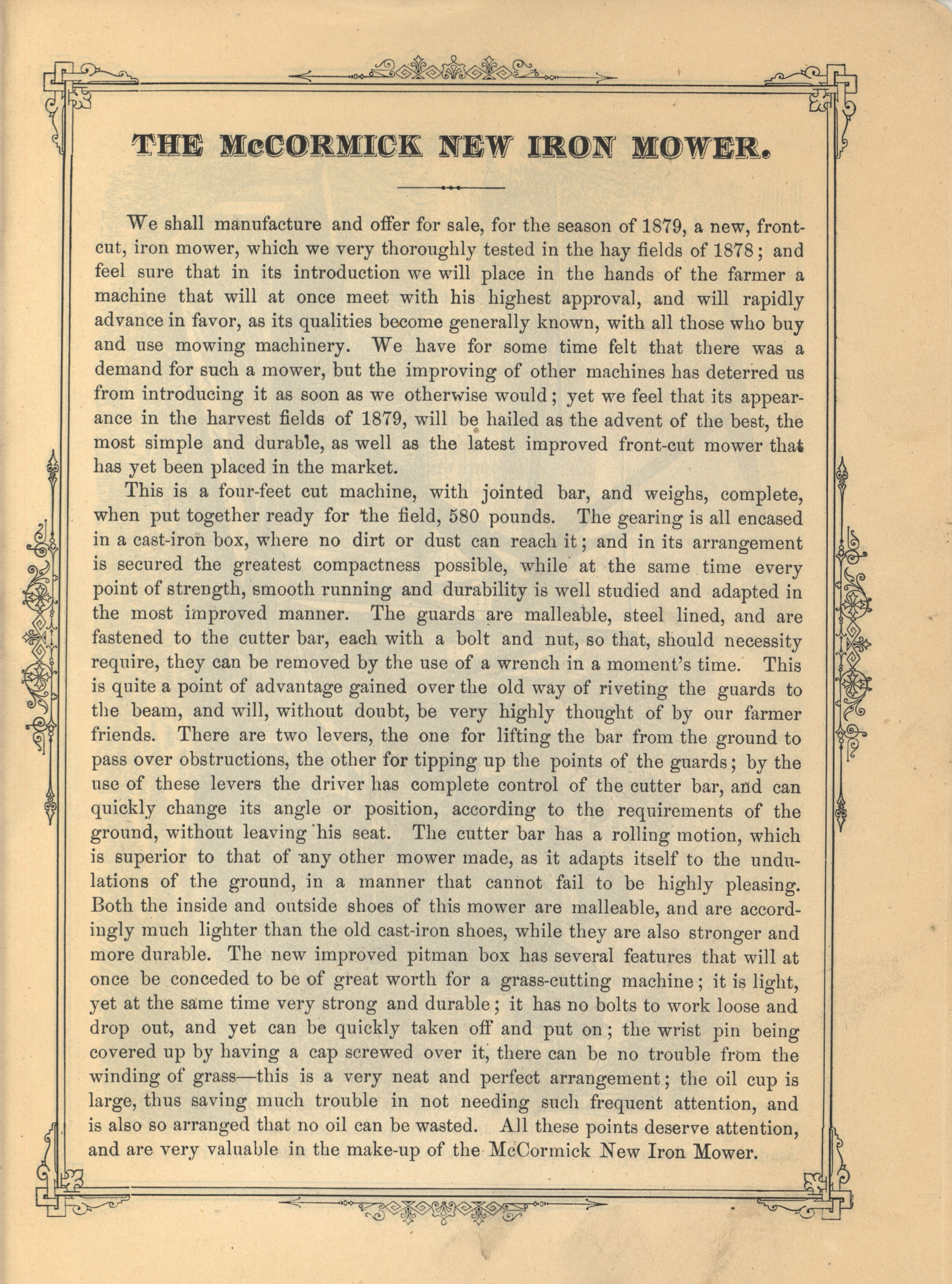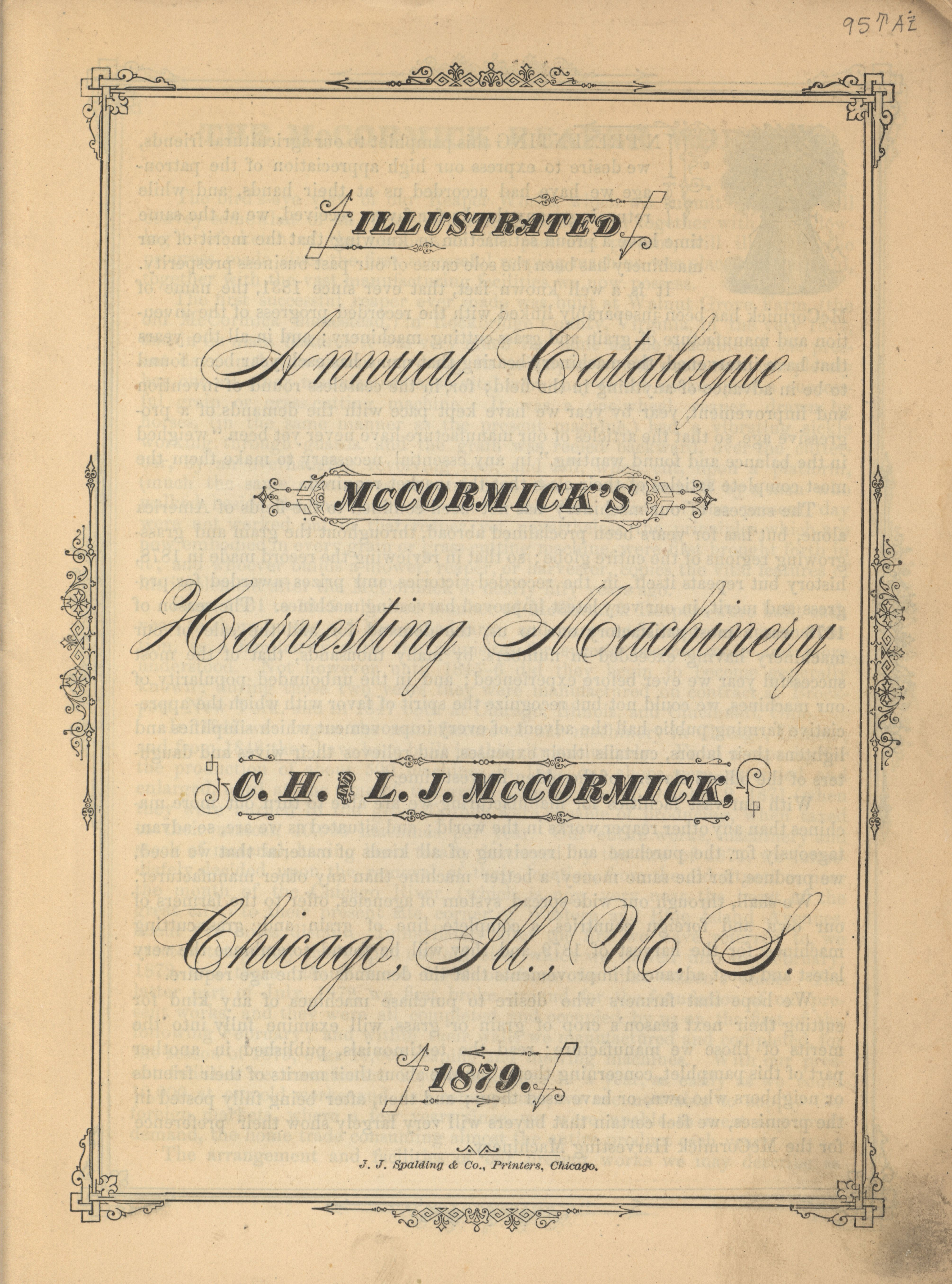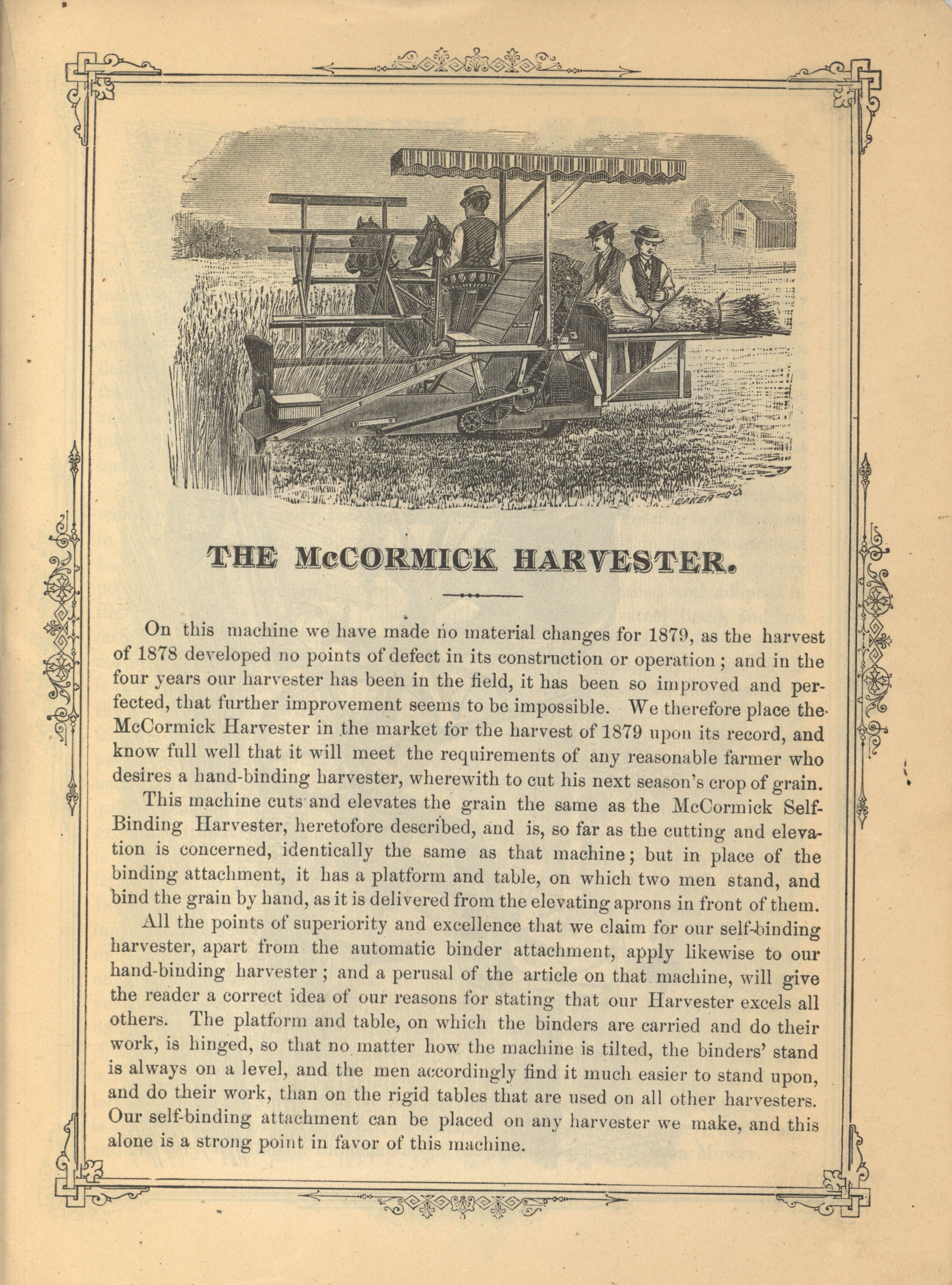 - Illustrated catalog describing the agricultural implements offered by C. H. and L. J. McCormick Harvesting Machinery in 1879.
