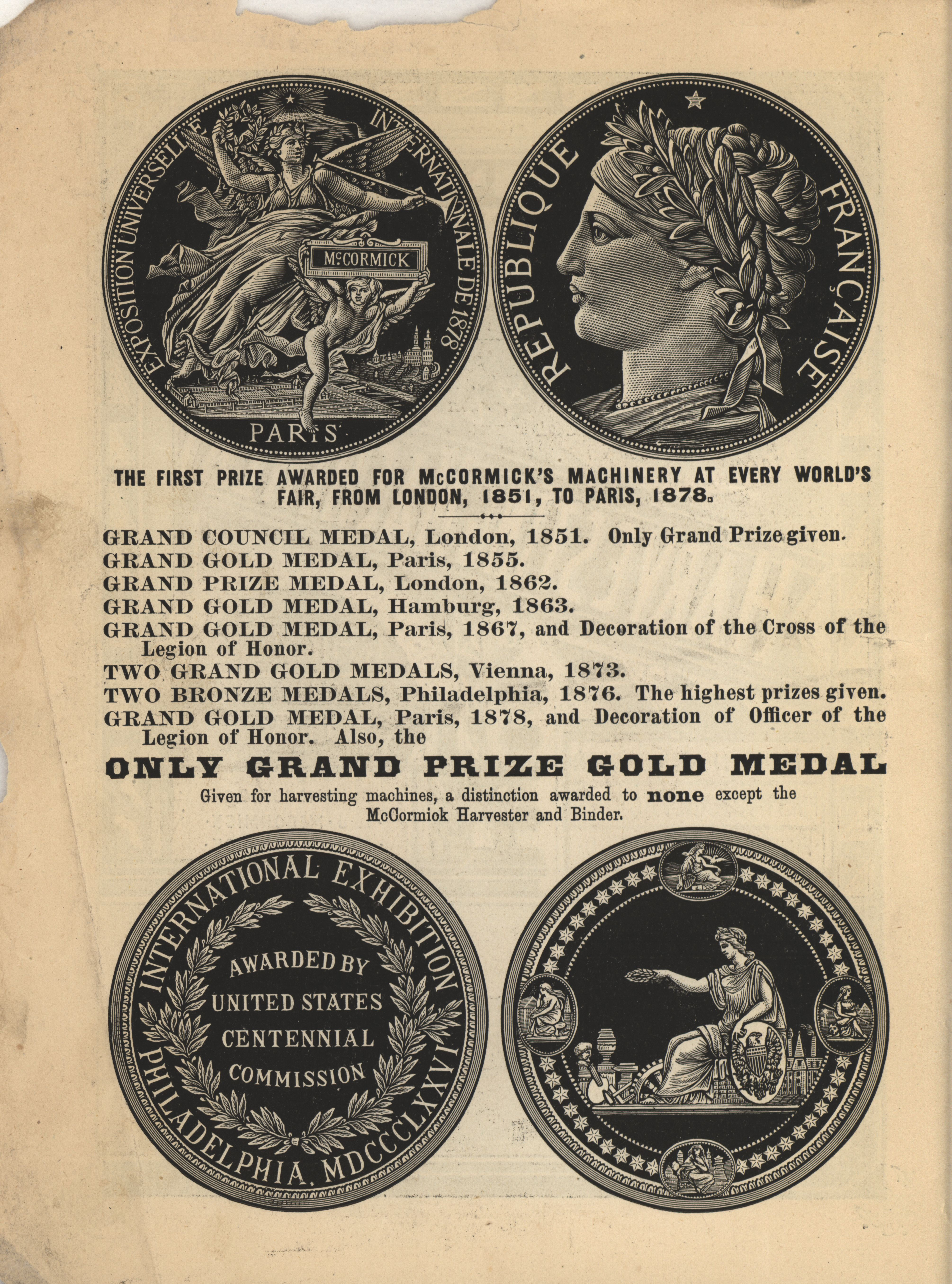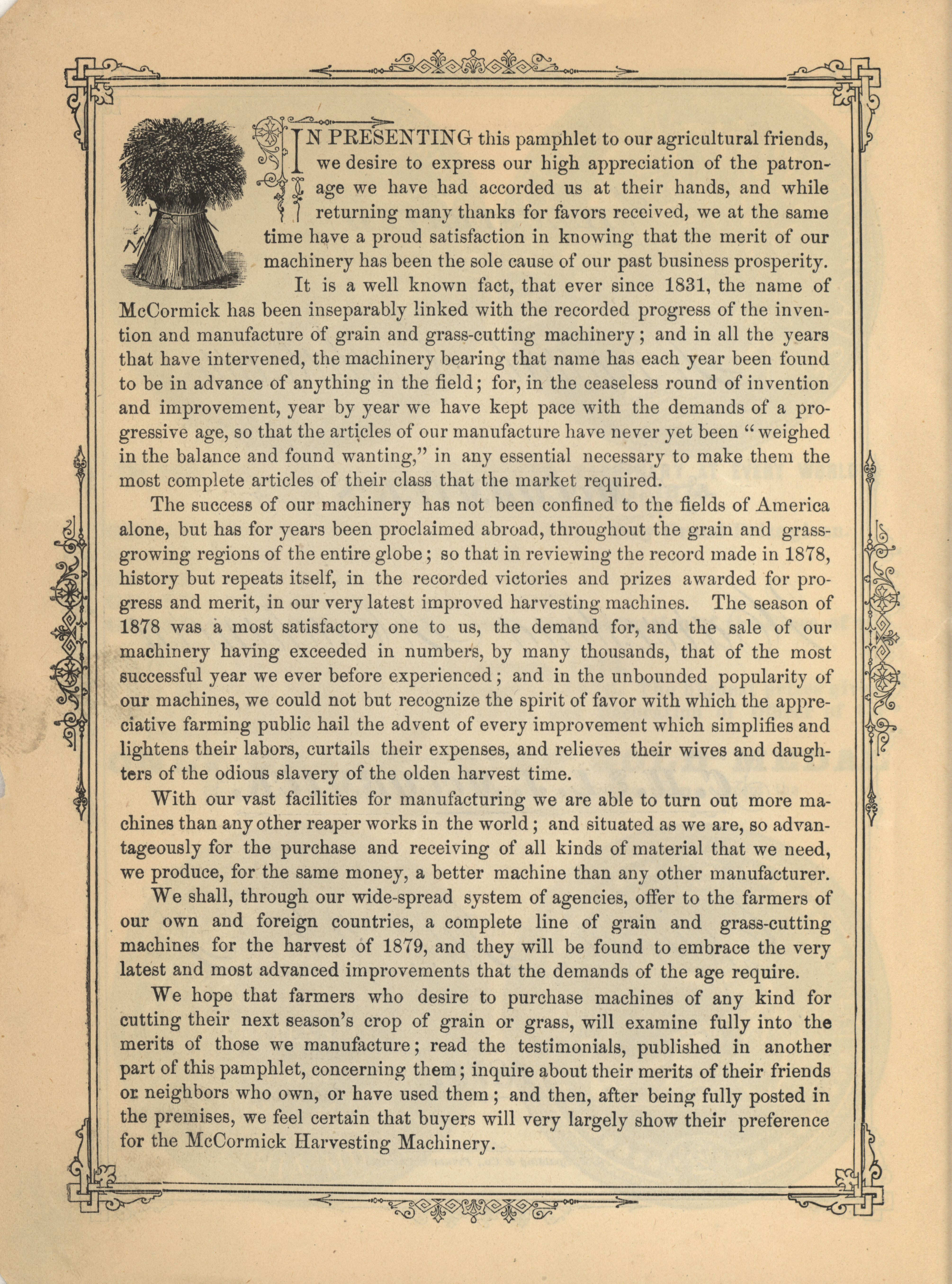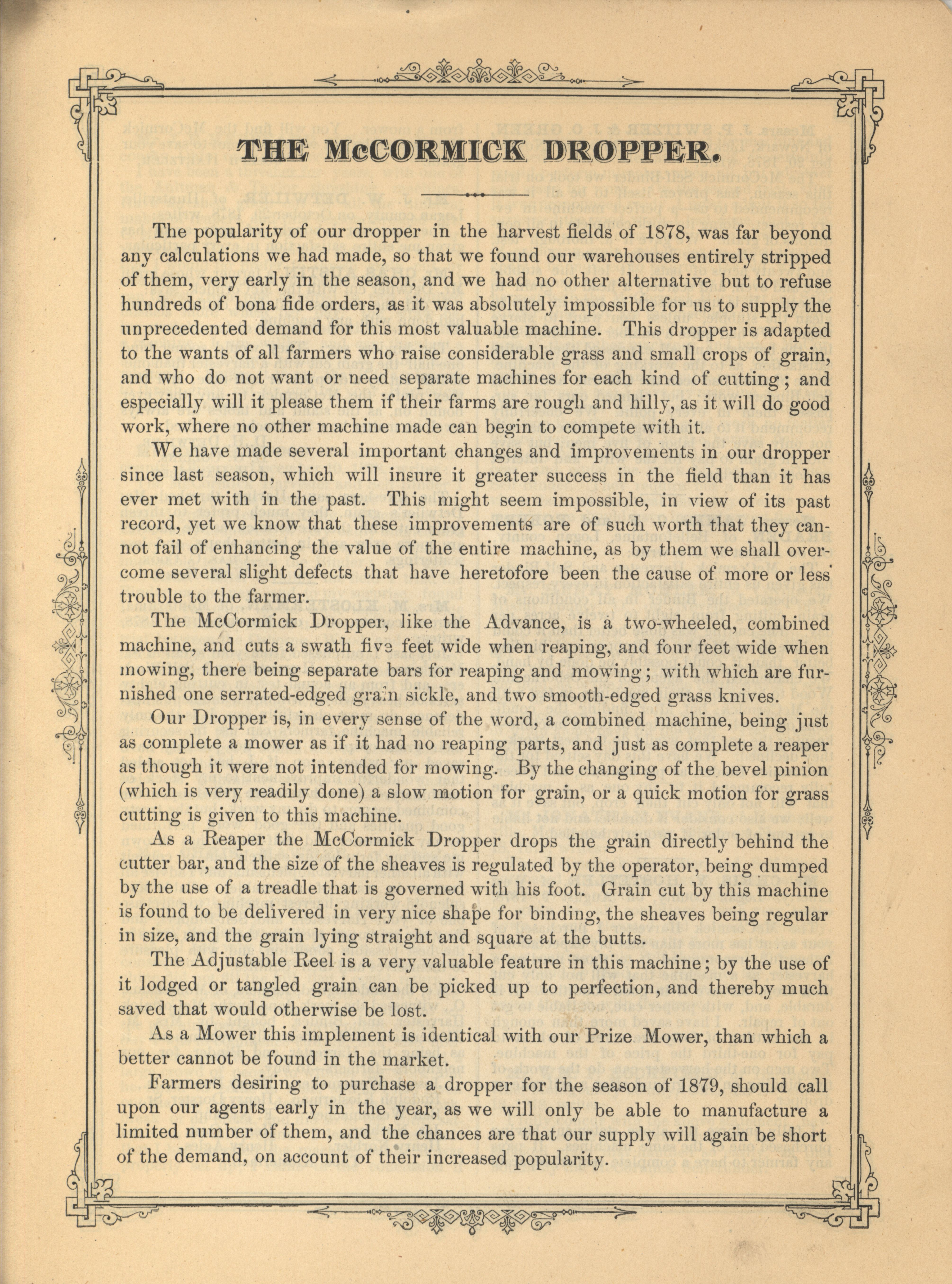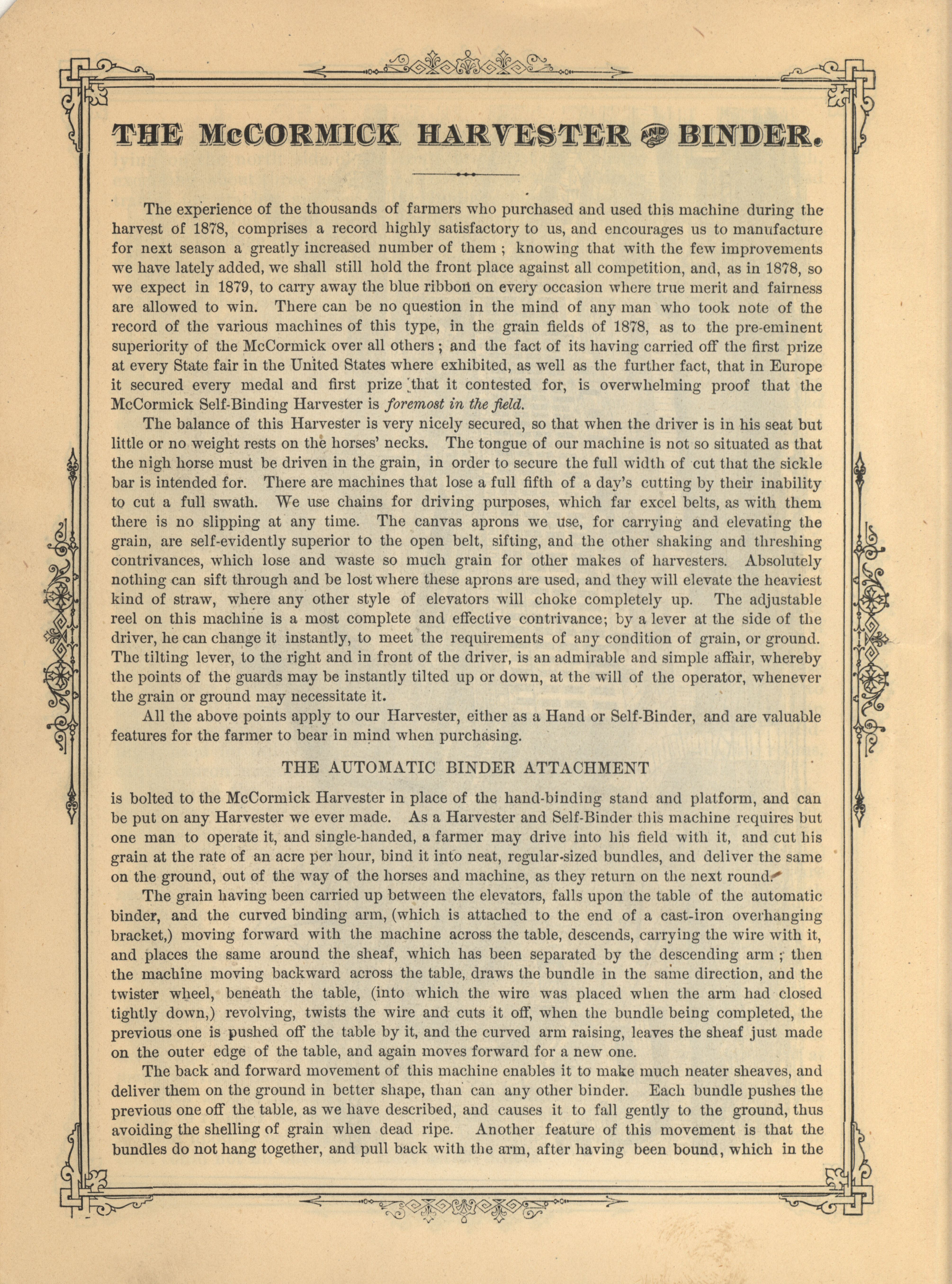 - Illustrated catalog describing the agricultural implements offered by C. H. and L. J. McCormick Harvesting Machinery in 1879.