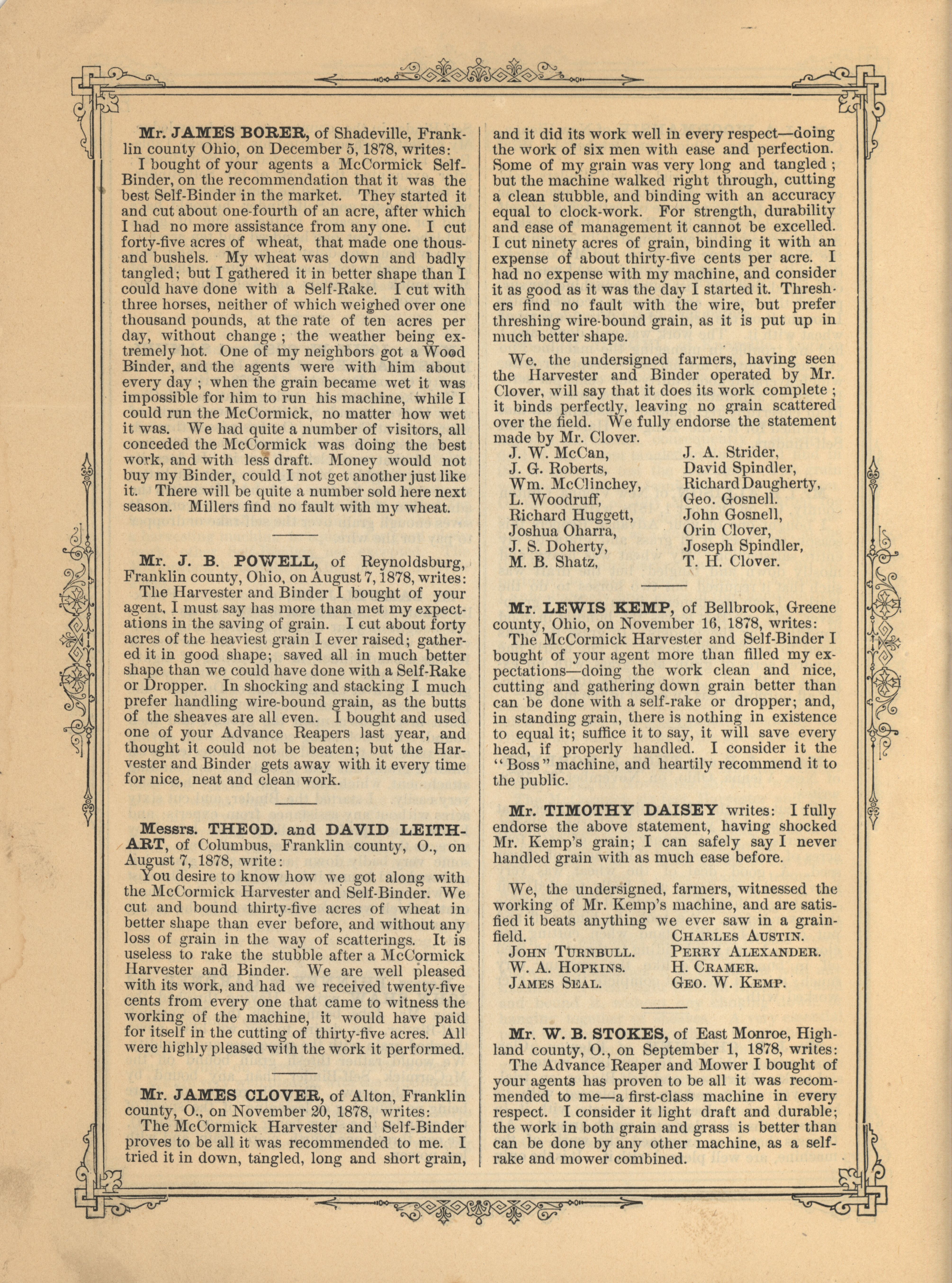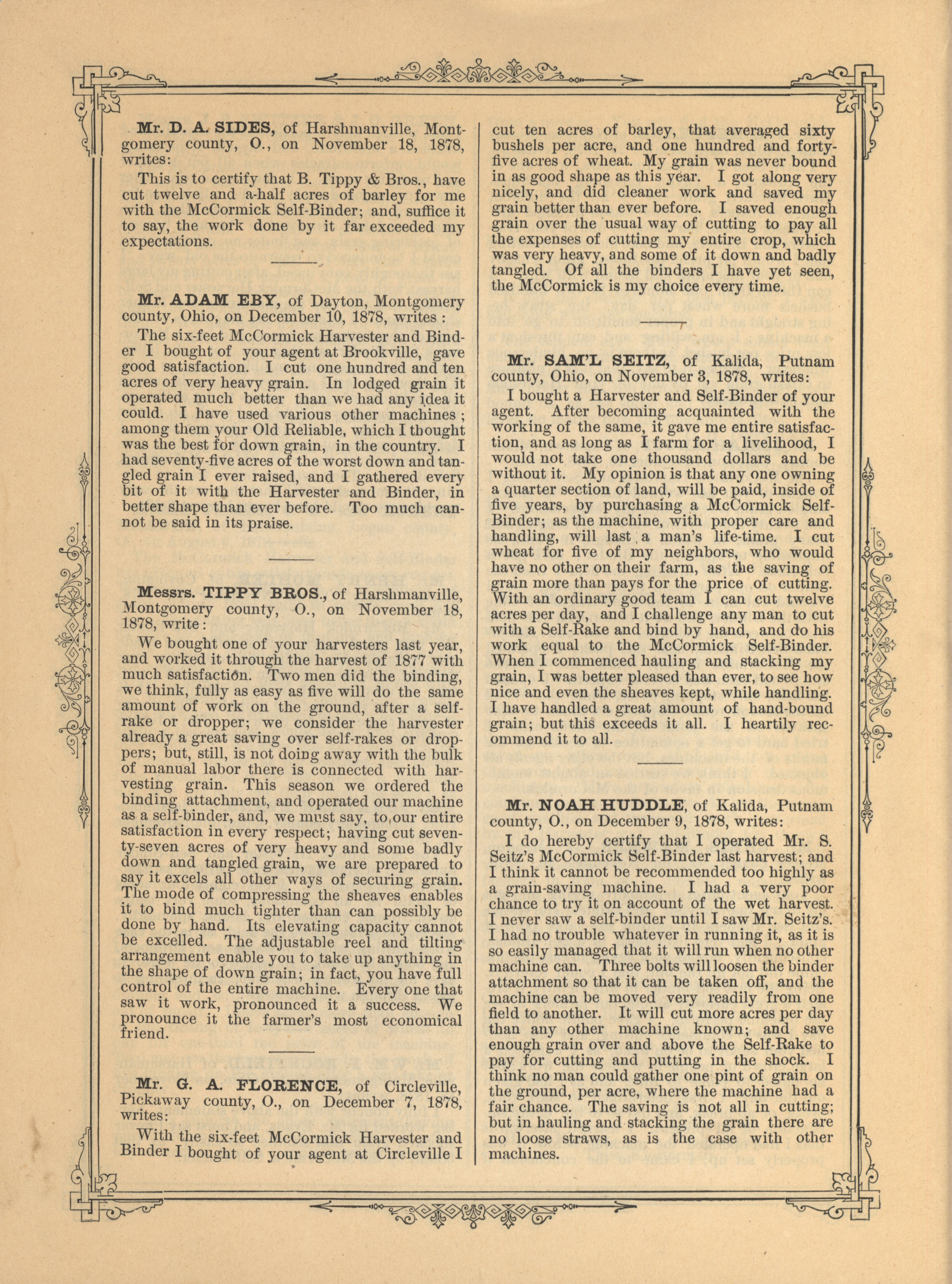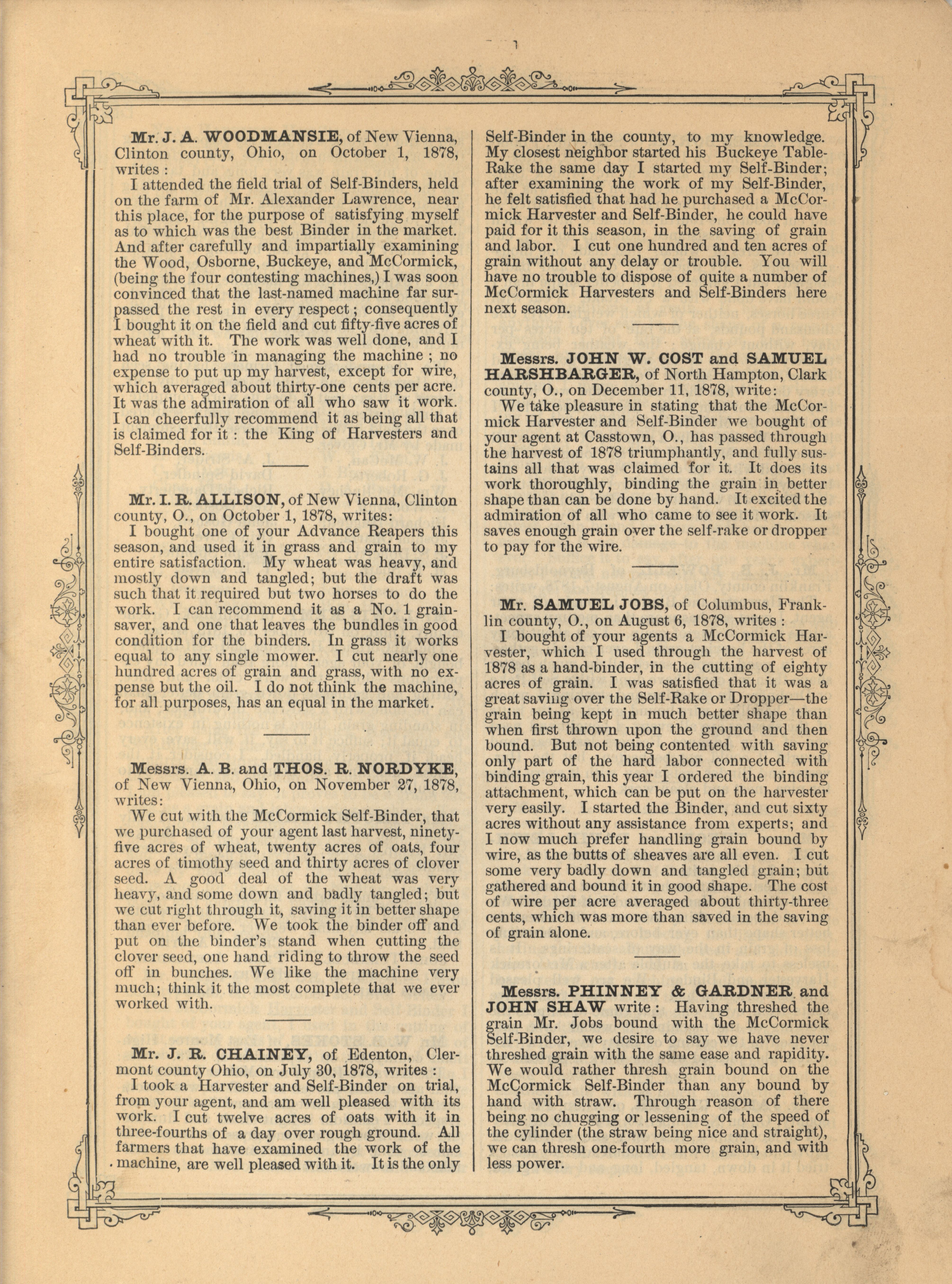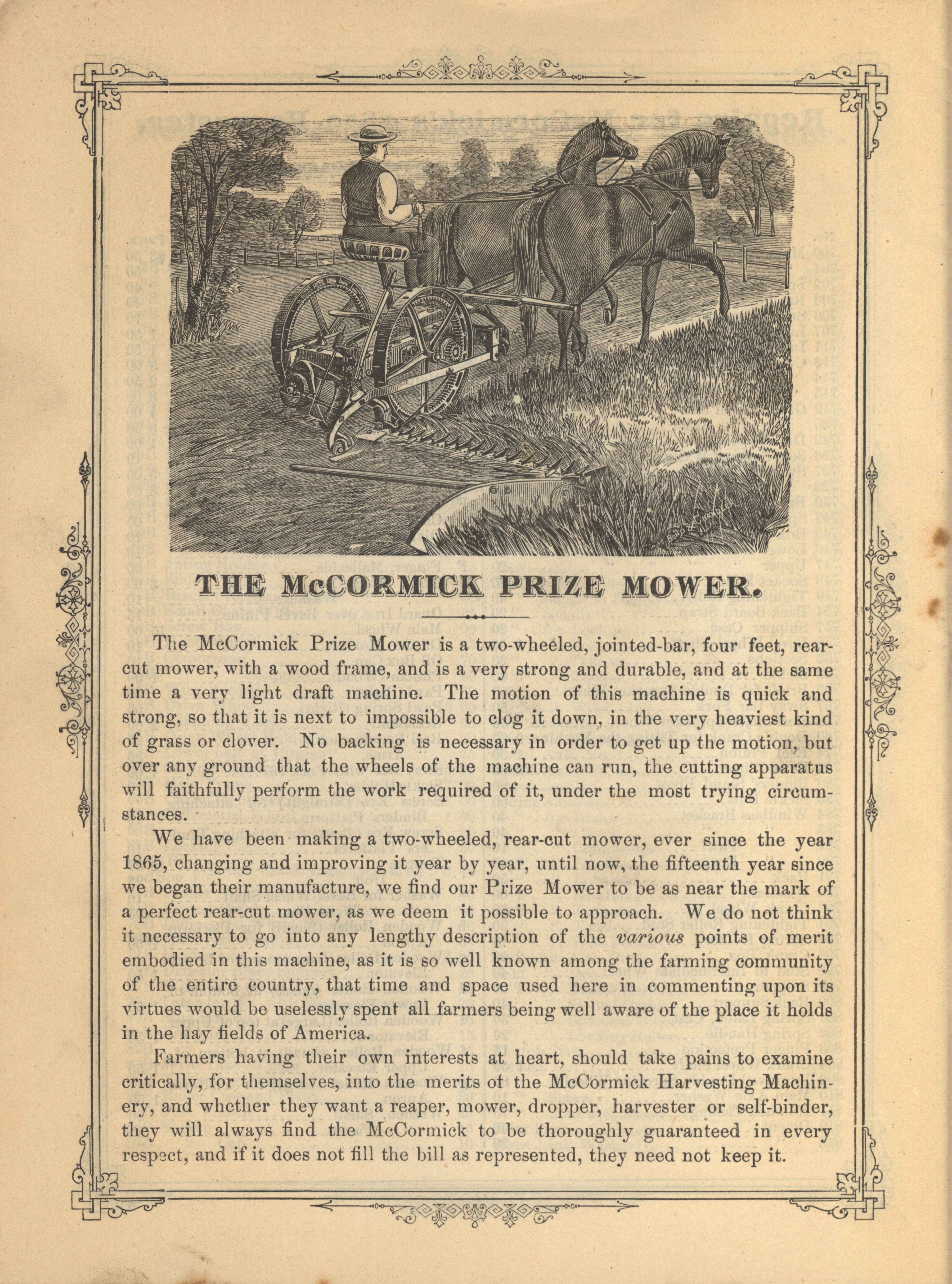 - "C. H. and L. J. McCormick harvesting machinery catalog", Agricultural Machinery Literature Collection, Iowa State University Library Digital Collections