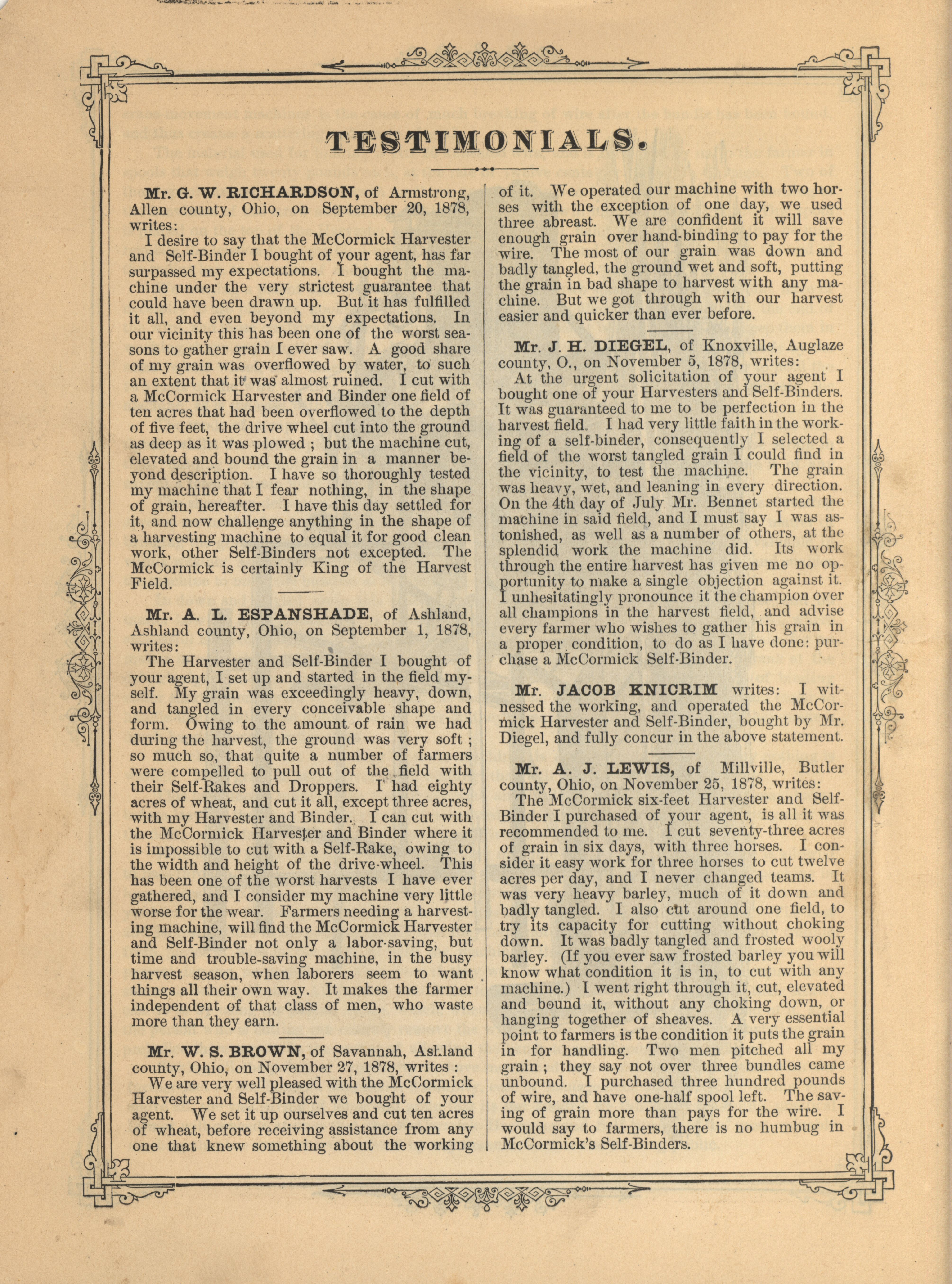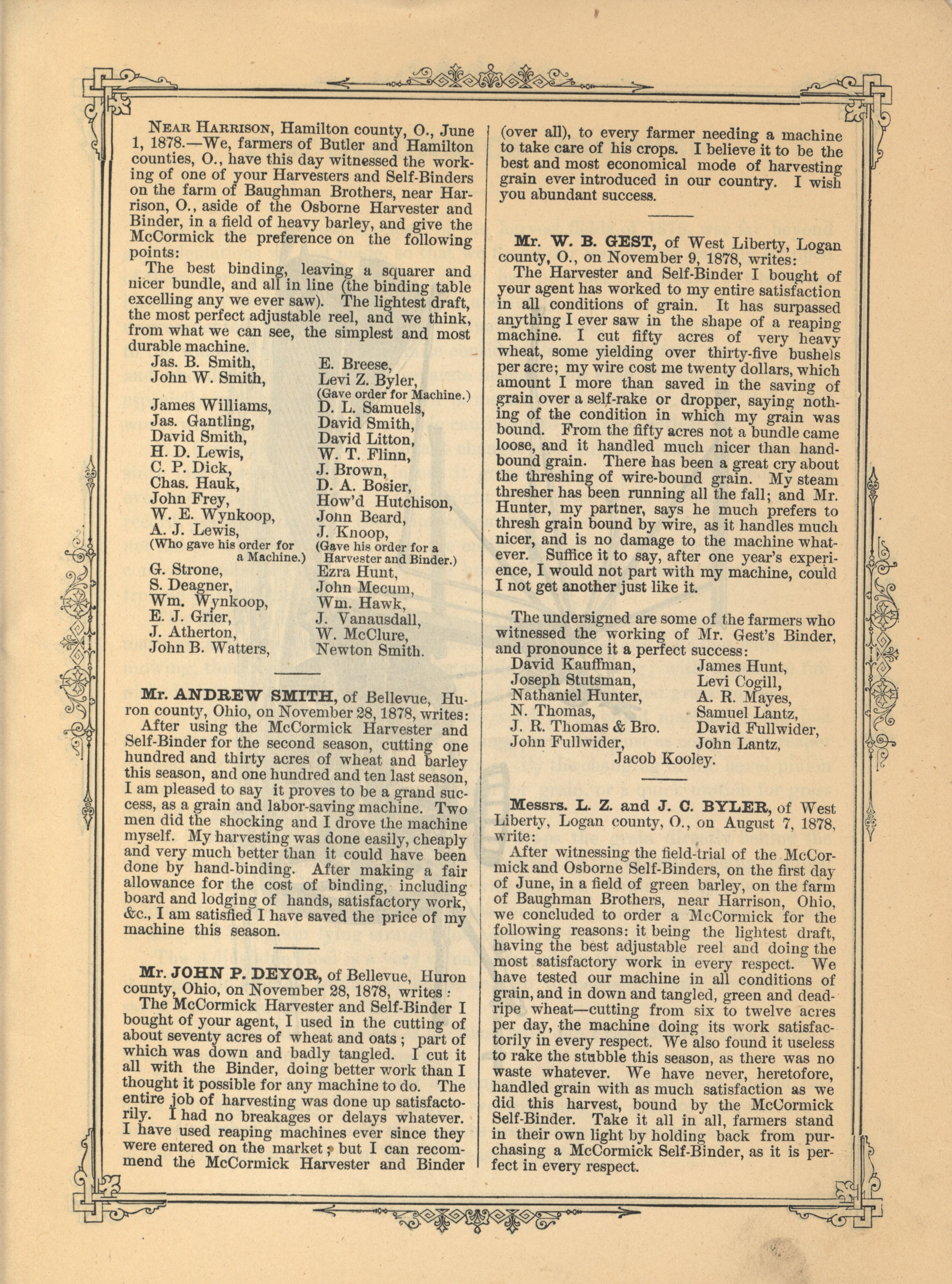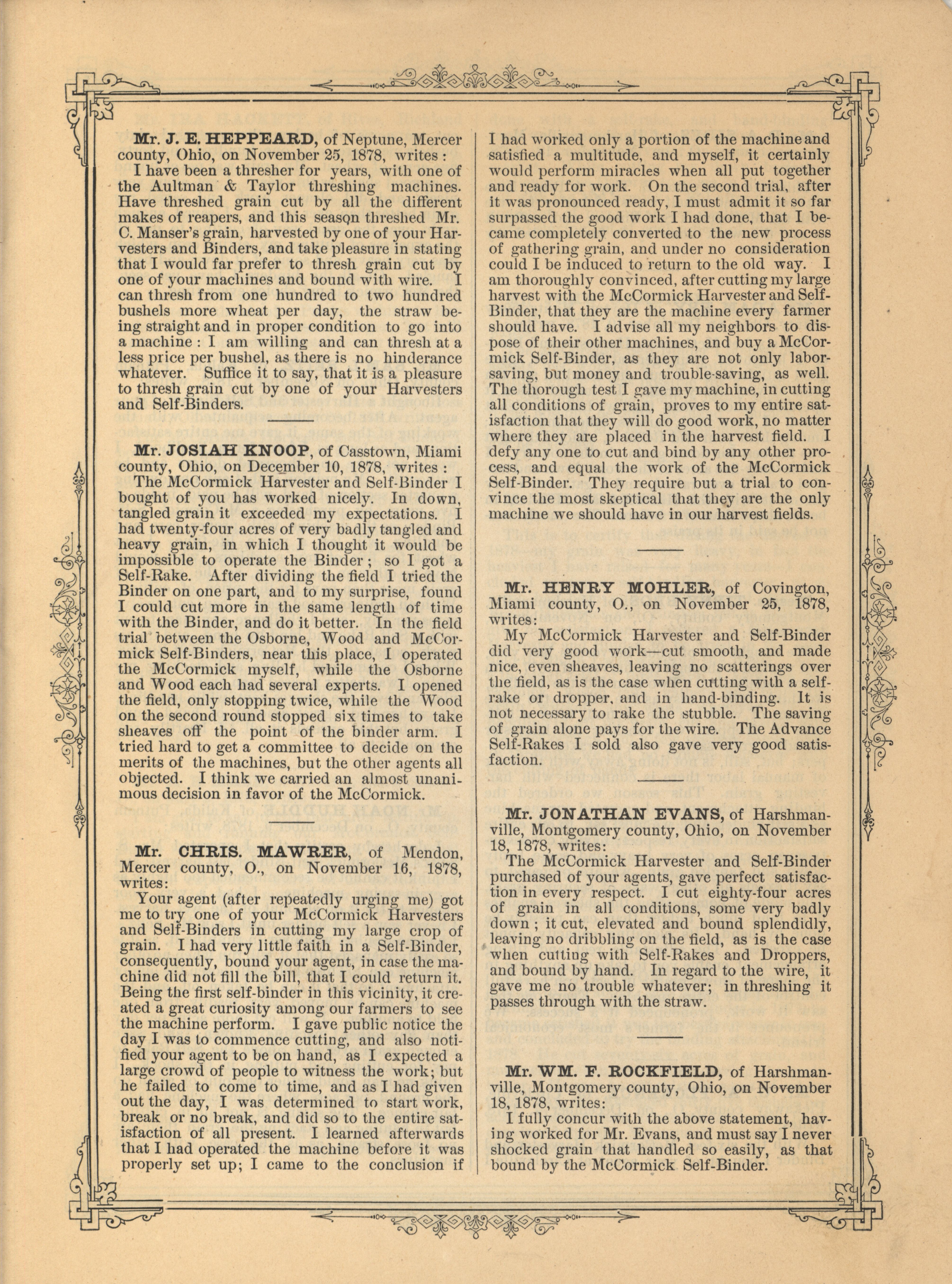 - "C. H. and L. J. McCormick harvesting machinery catalog", Agricultural Machinery Literature Collection, Iowa State University Library Digital Collections