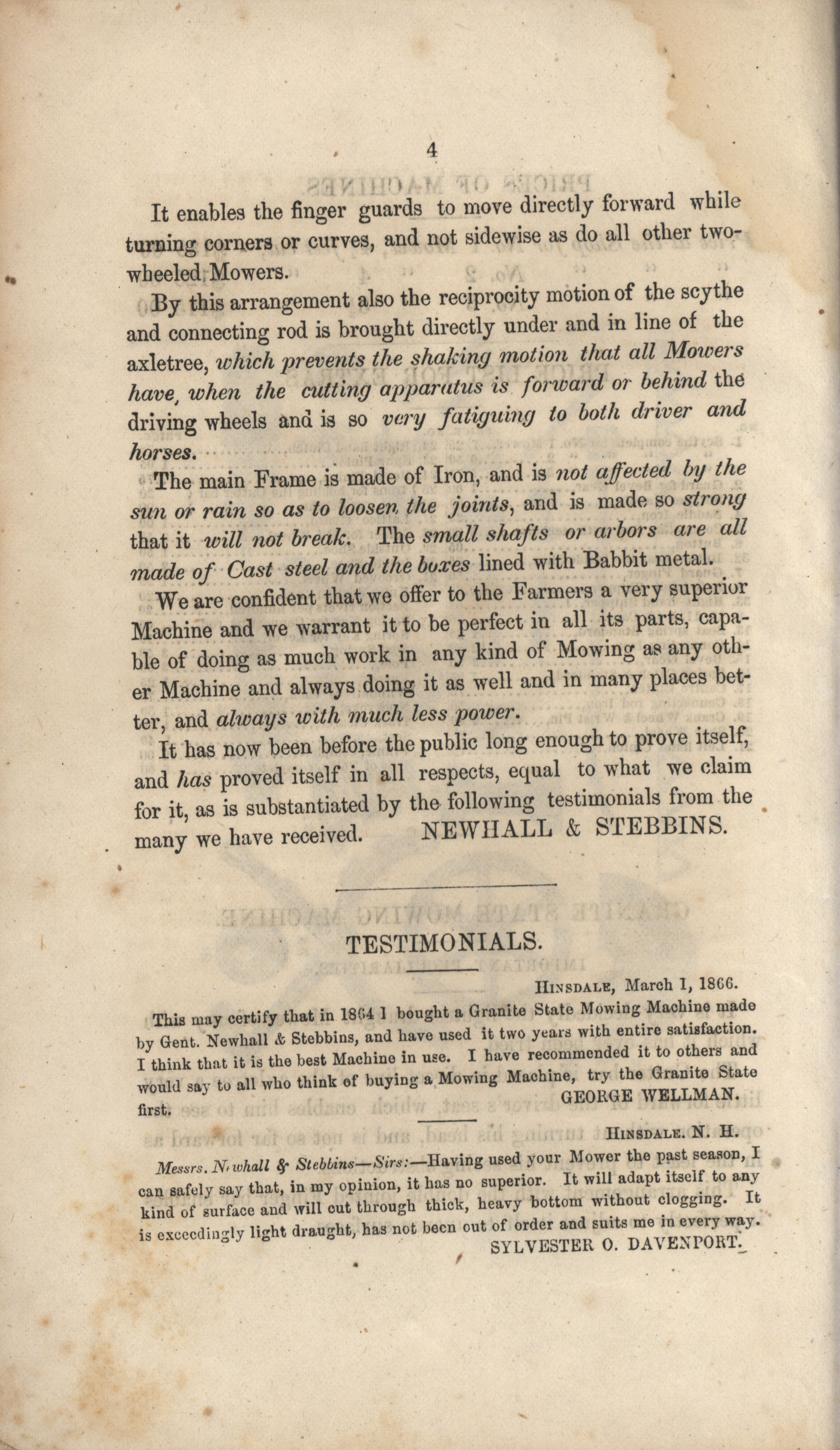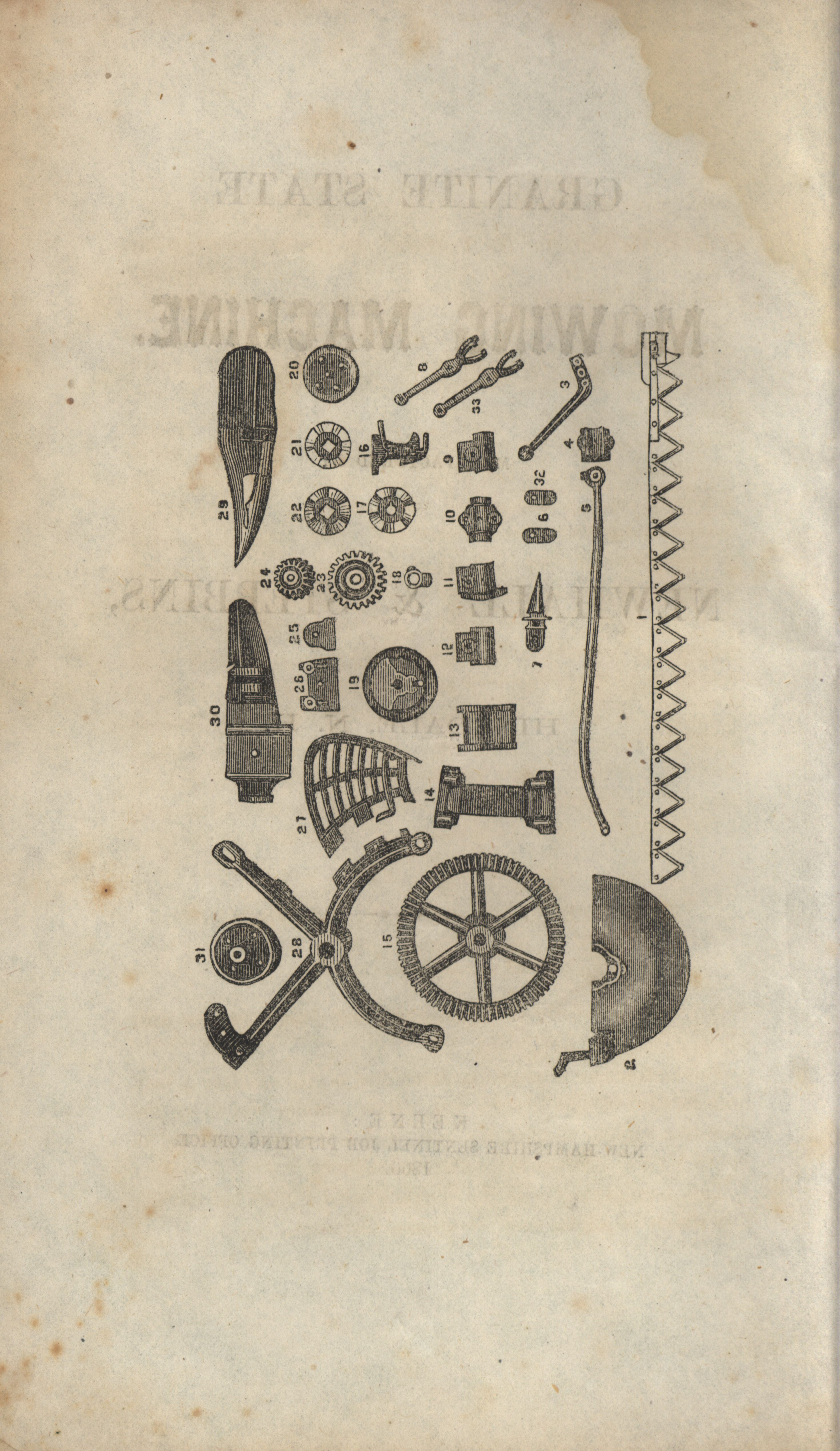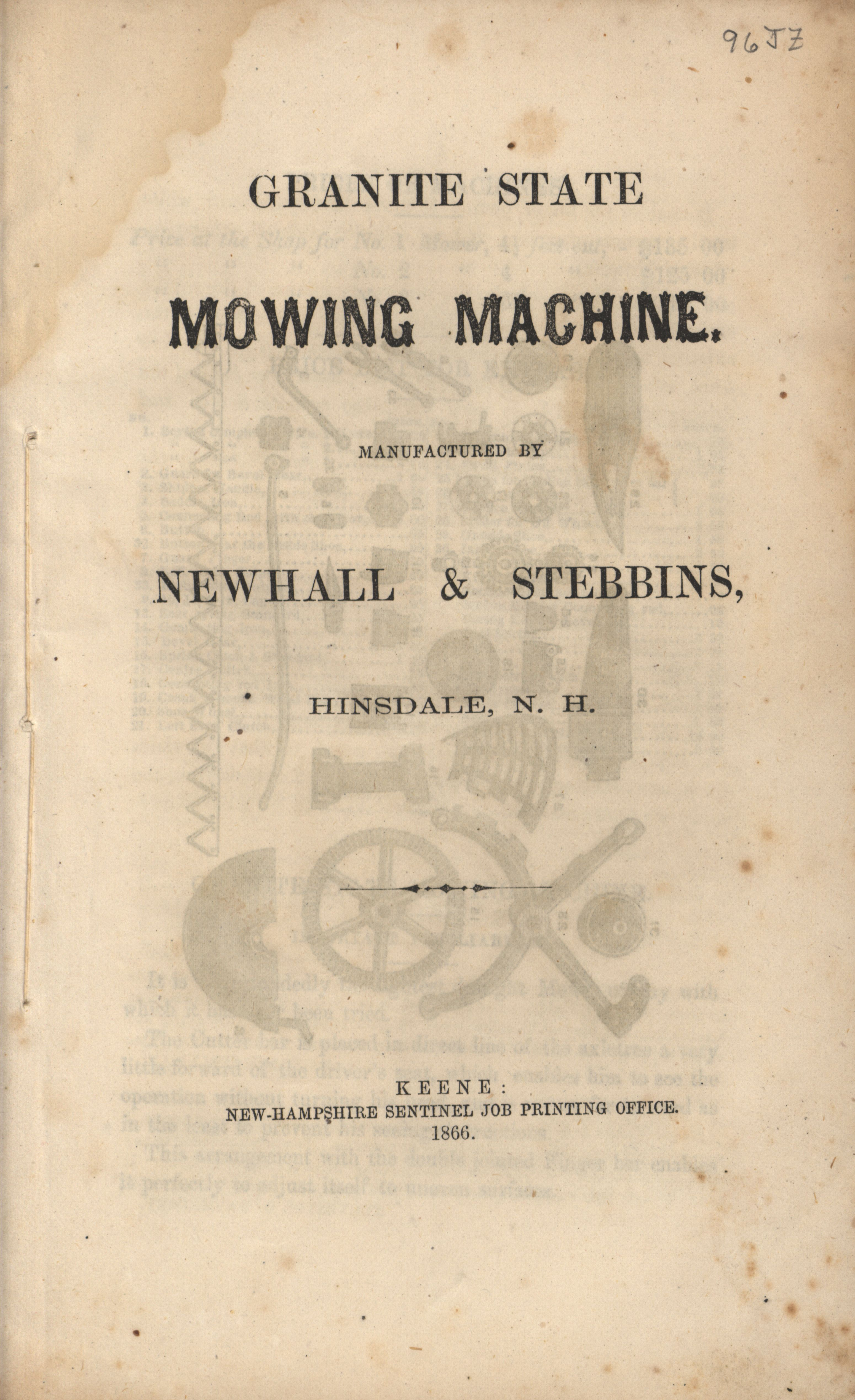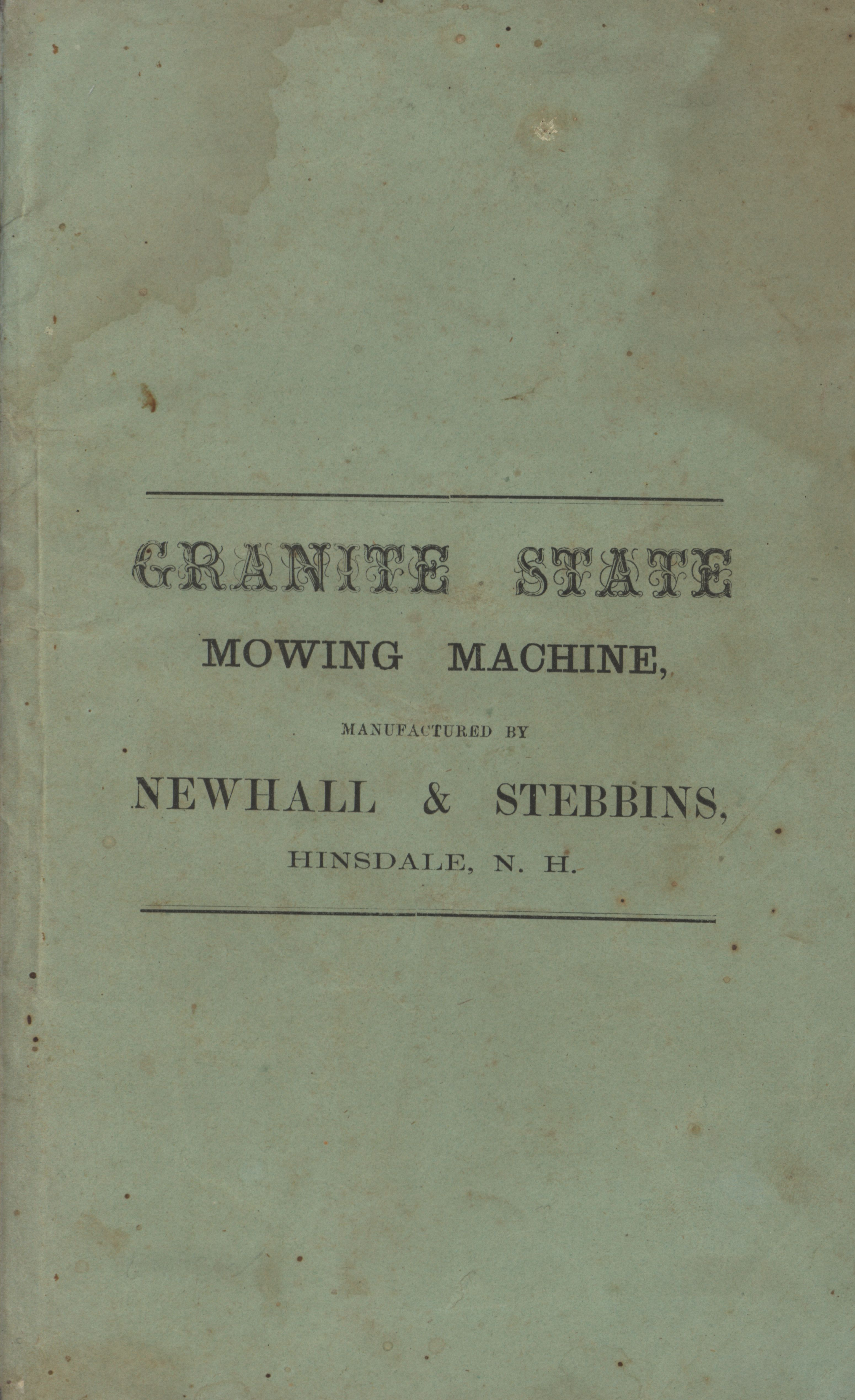 - Illustrated catalog describing the granite state mowing machine offered by Newhall and Stebbins in 1866.