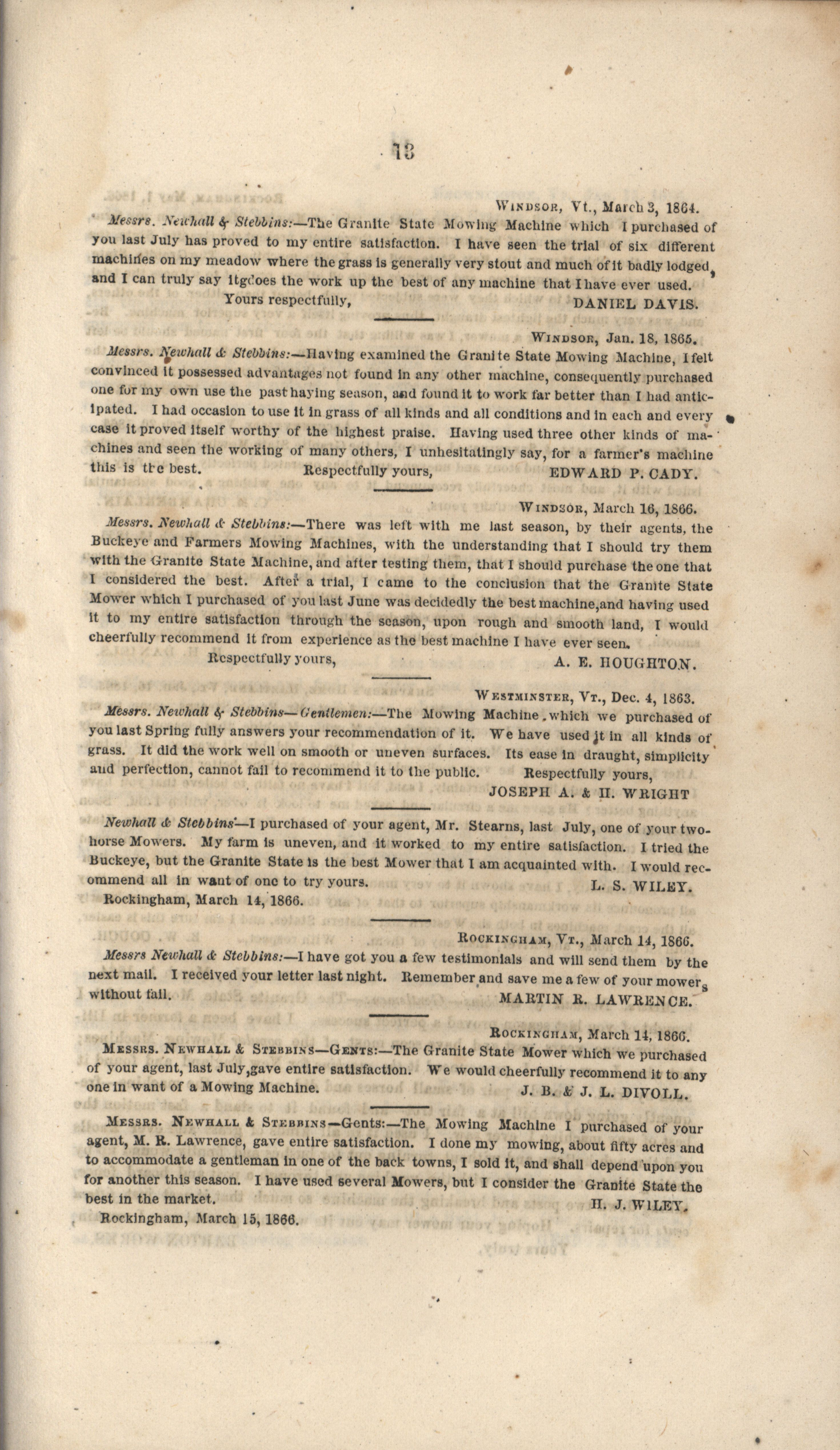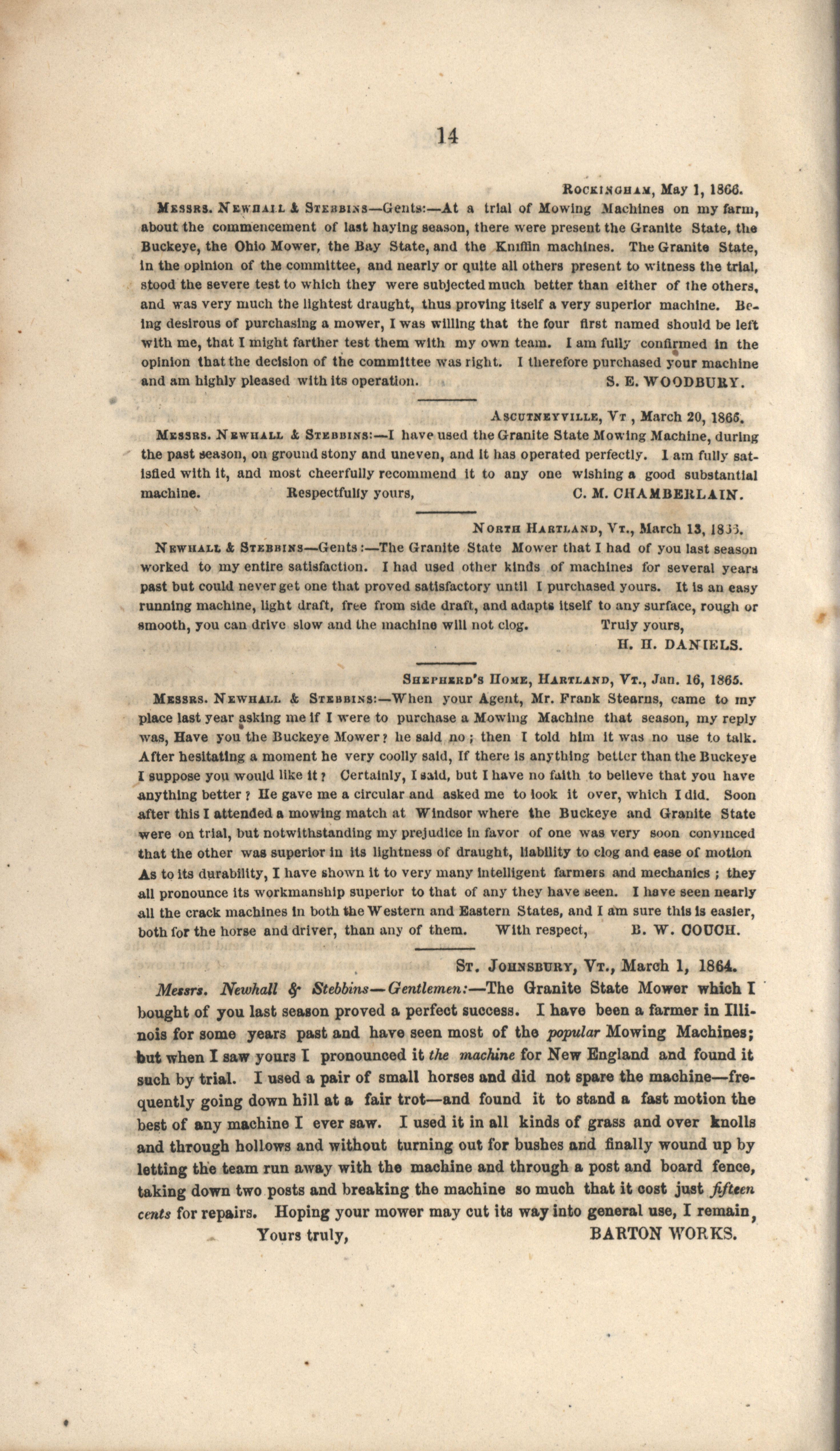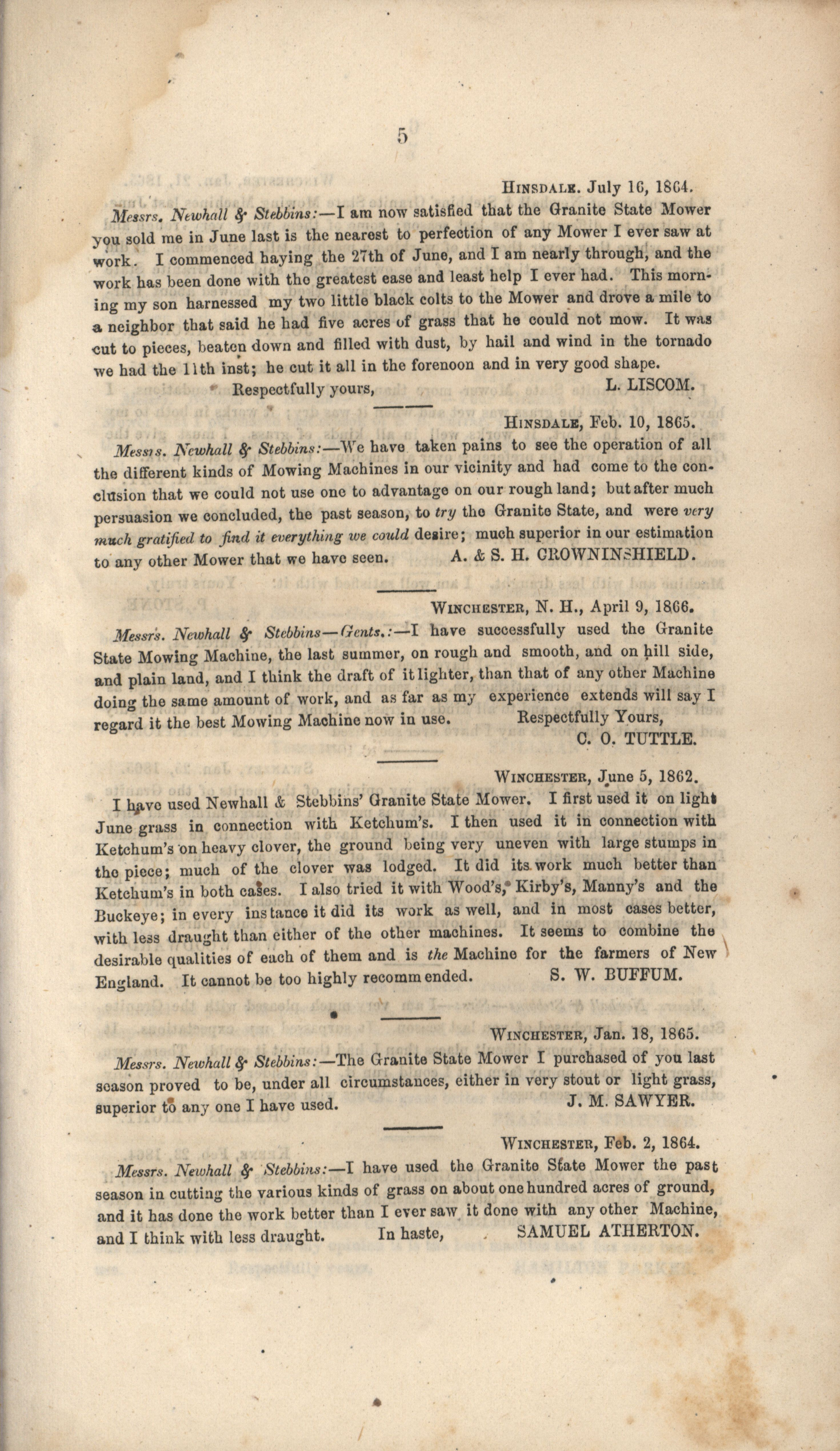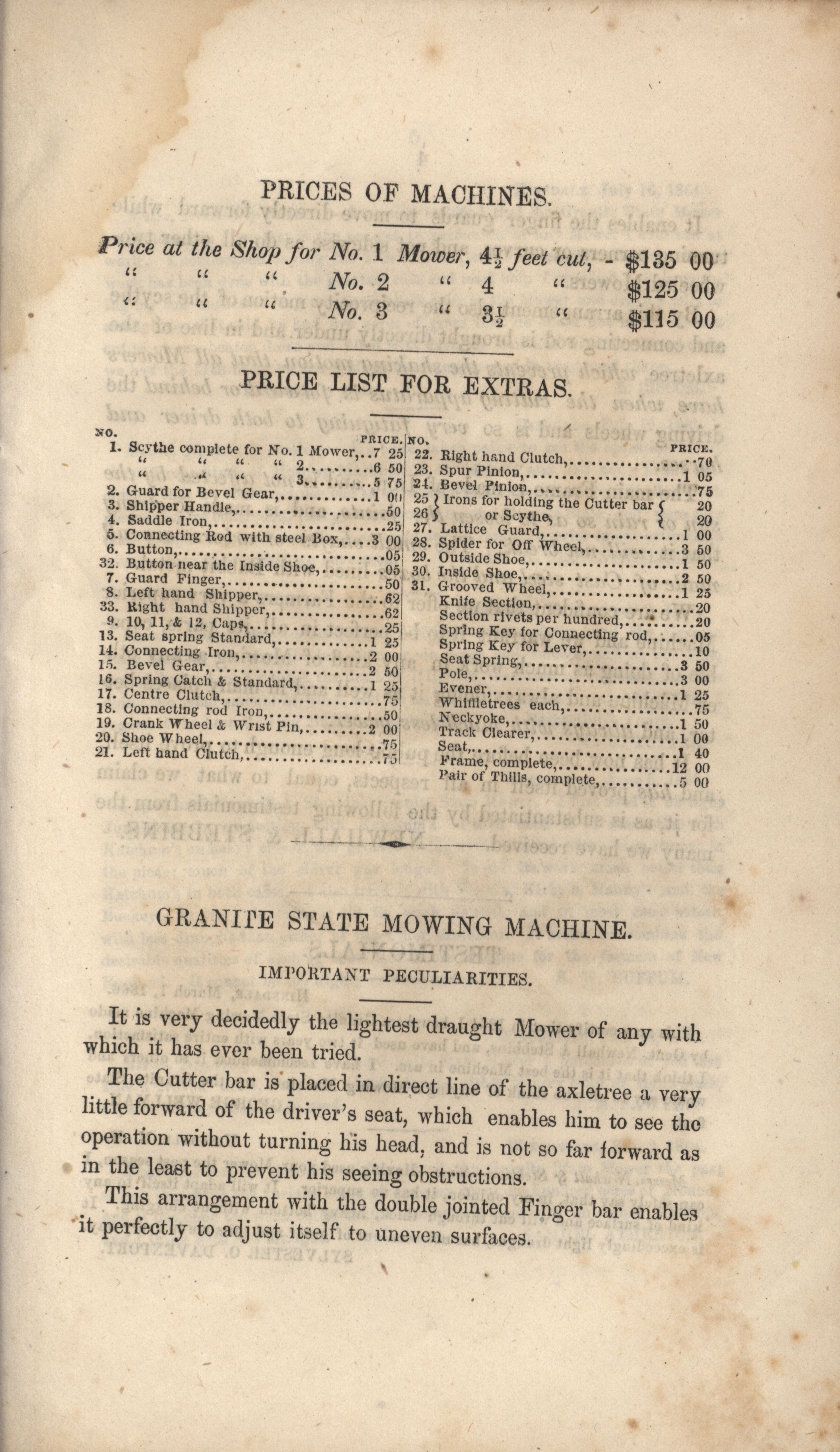 - Illustrated catalog describing the granite state mowing machine offered by Newhall and Stebbins in 1866.