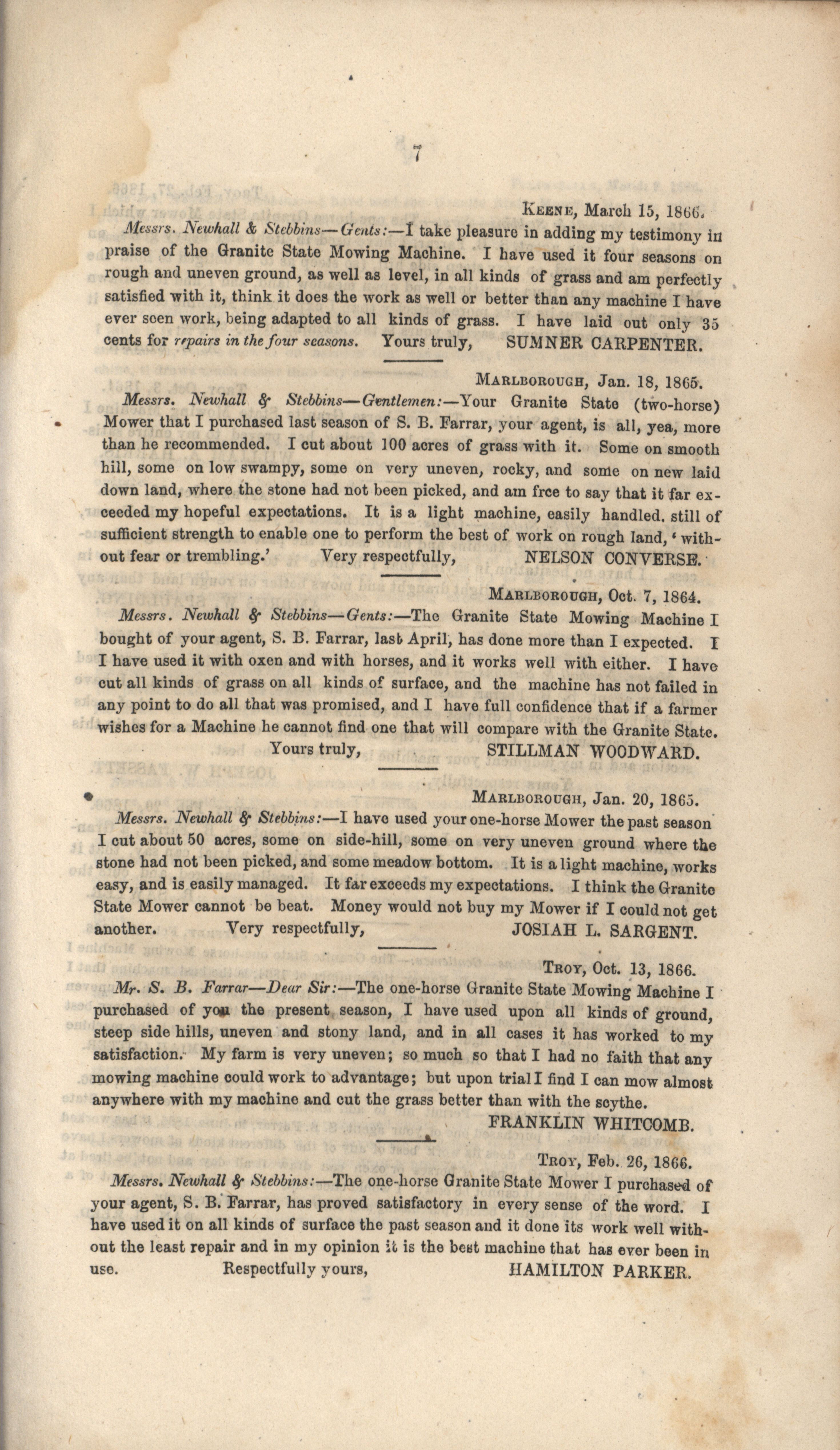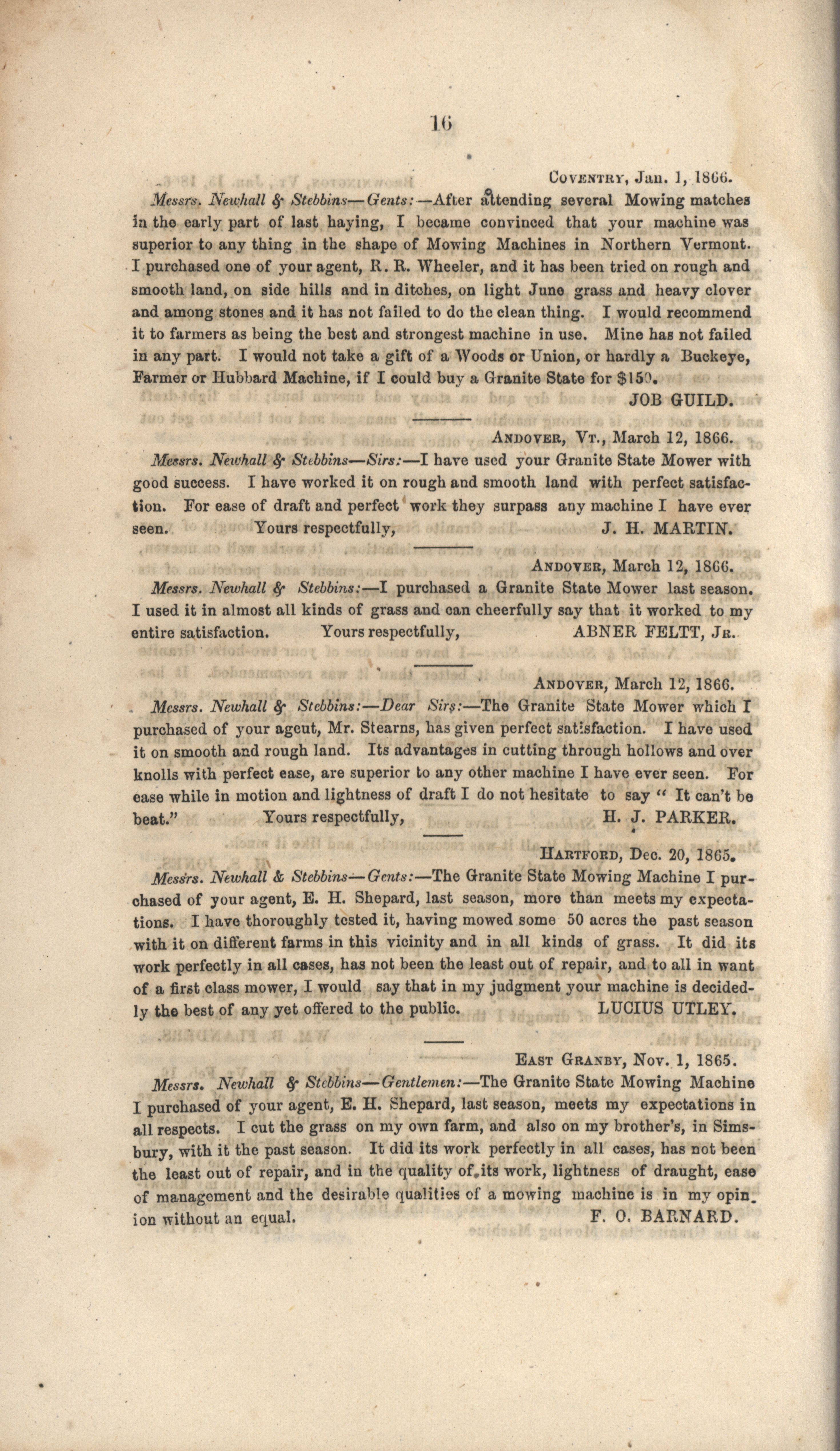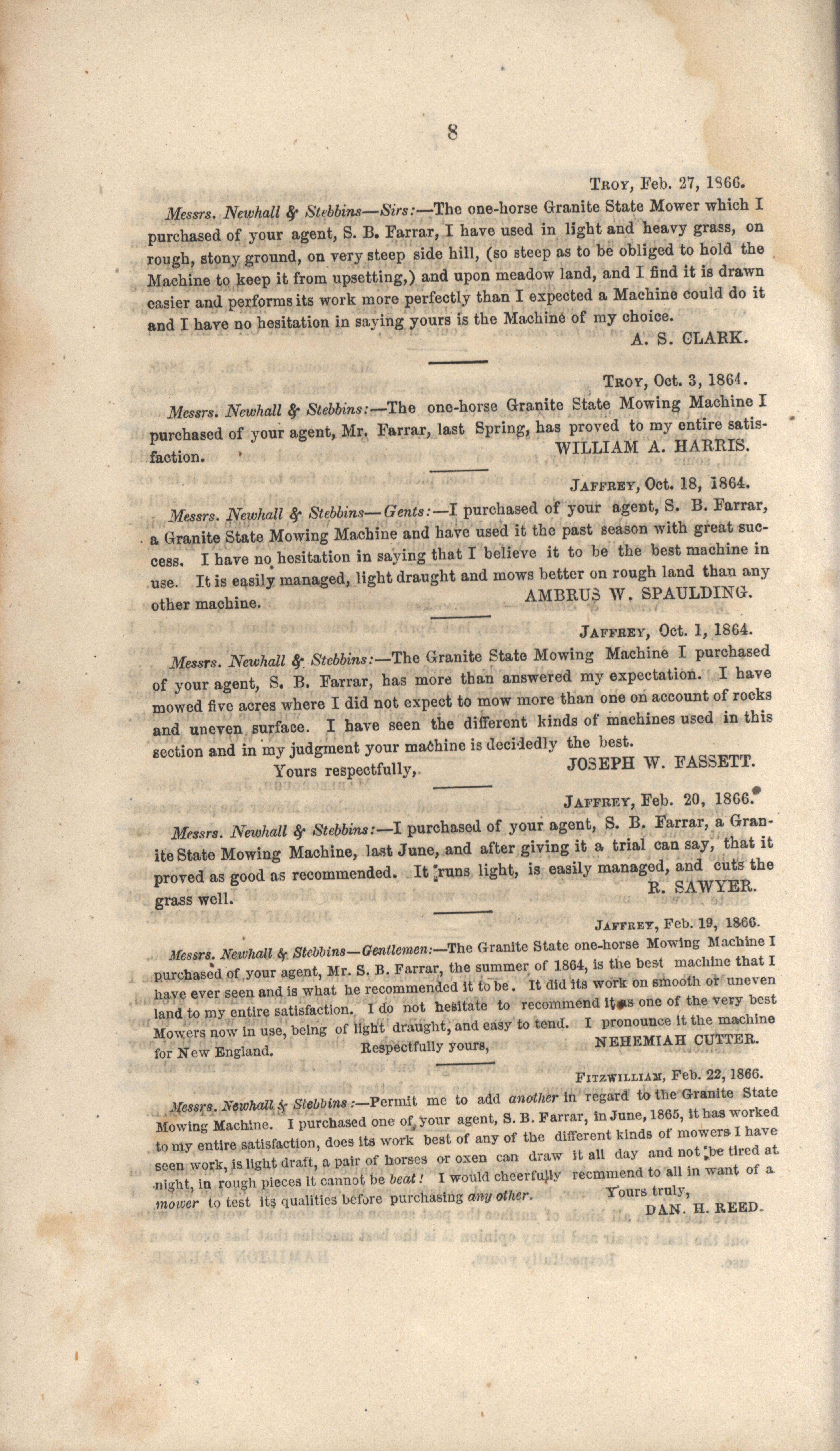 - "Newhall and Stebbins Granite State Mowing Machine catalog", Agricultural Machinery Literature Collection, Iowa State University Library Digital Collections