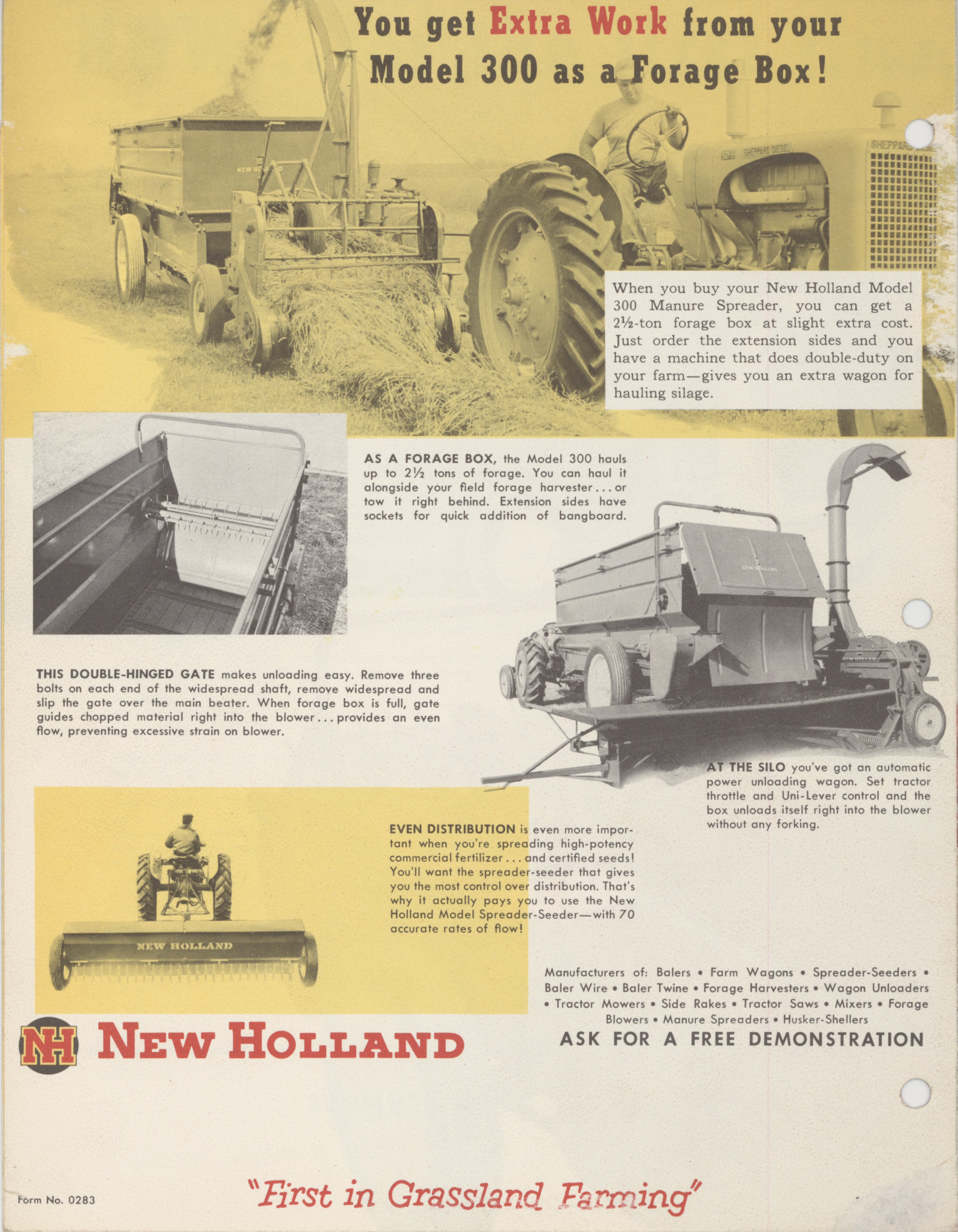 - "New Holland Model 300 I30 Bushel Spreader advertisement", Agricultural Machinery Literature Collection, Iowa State University Library Digital Collections
