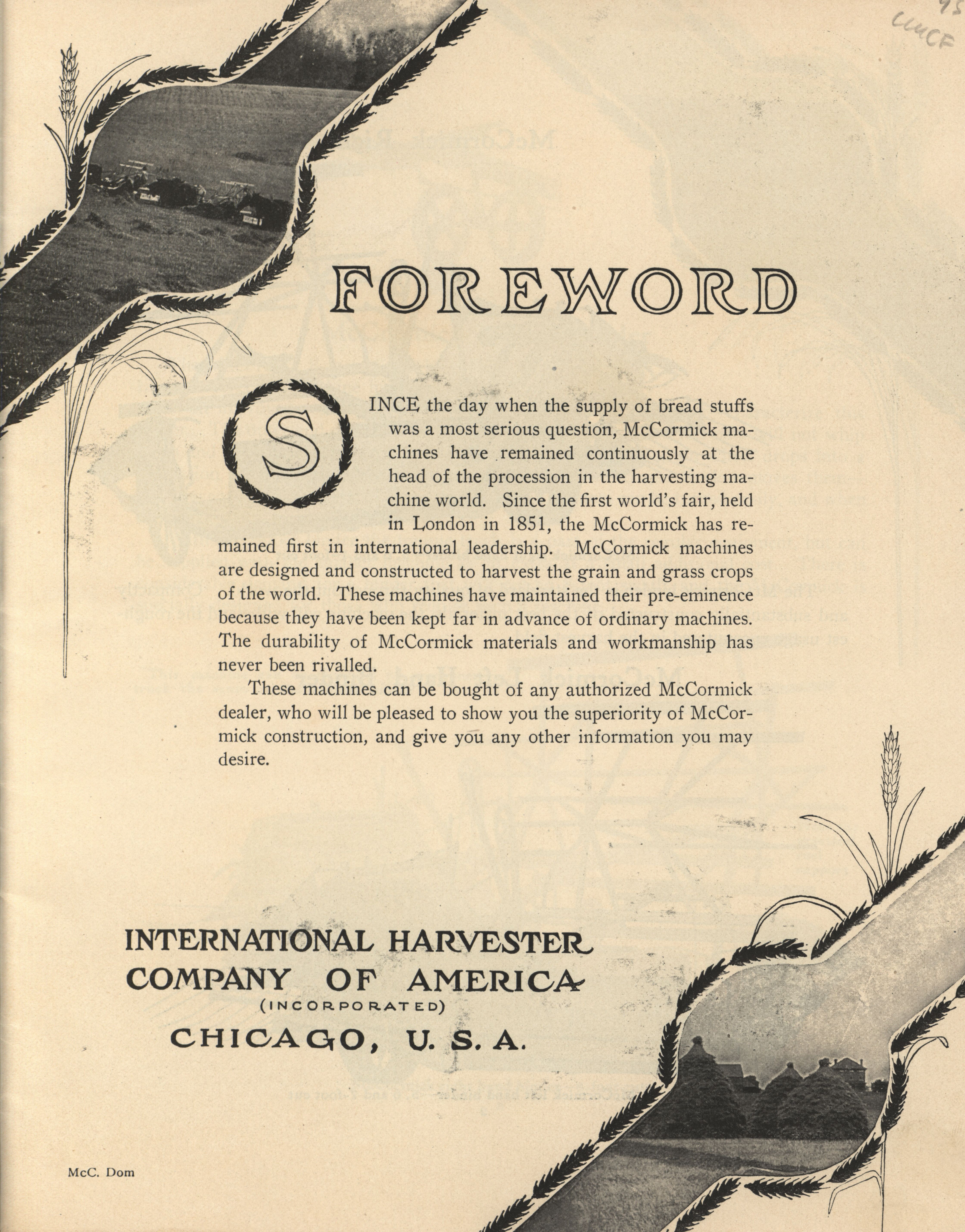- Illustrated catalog describing the McCormick agricultural implements offered by International Harvester Company of America.