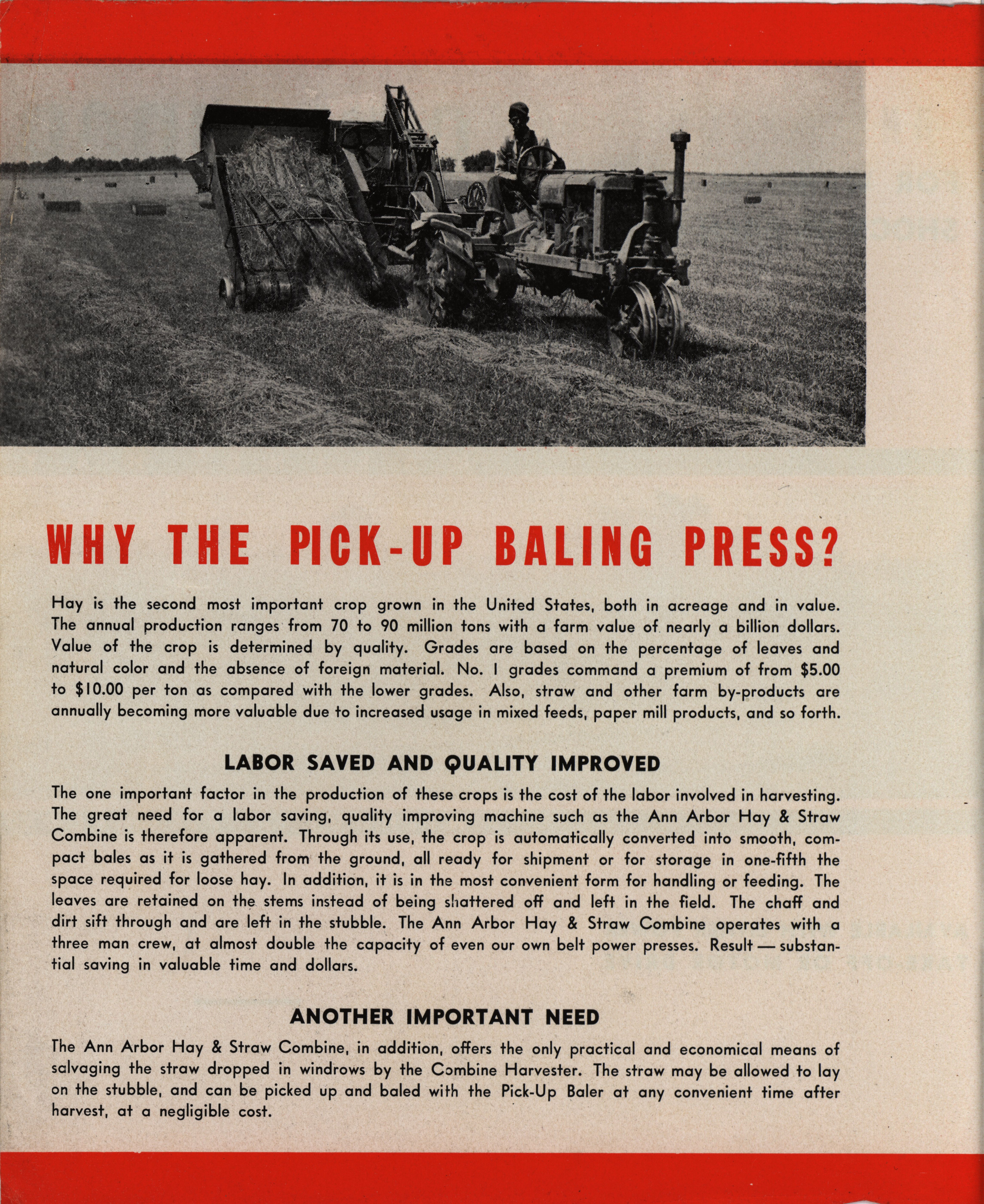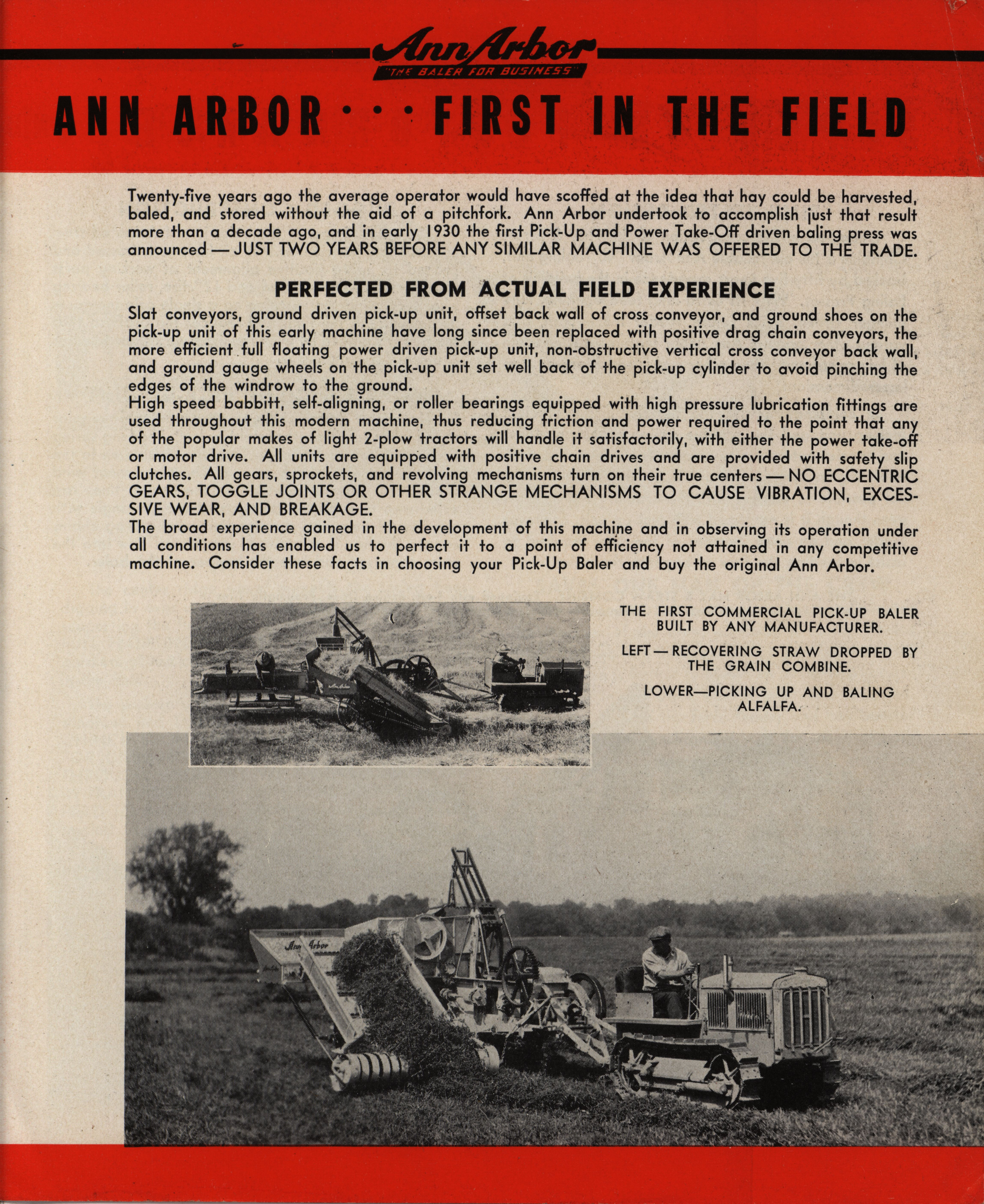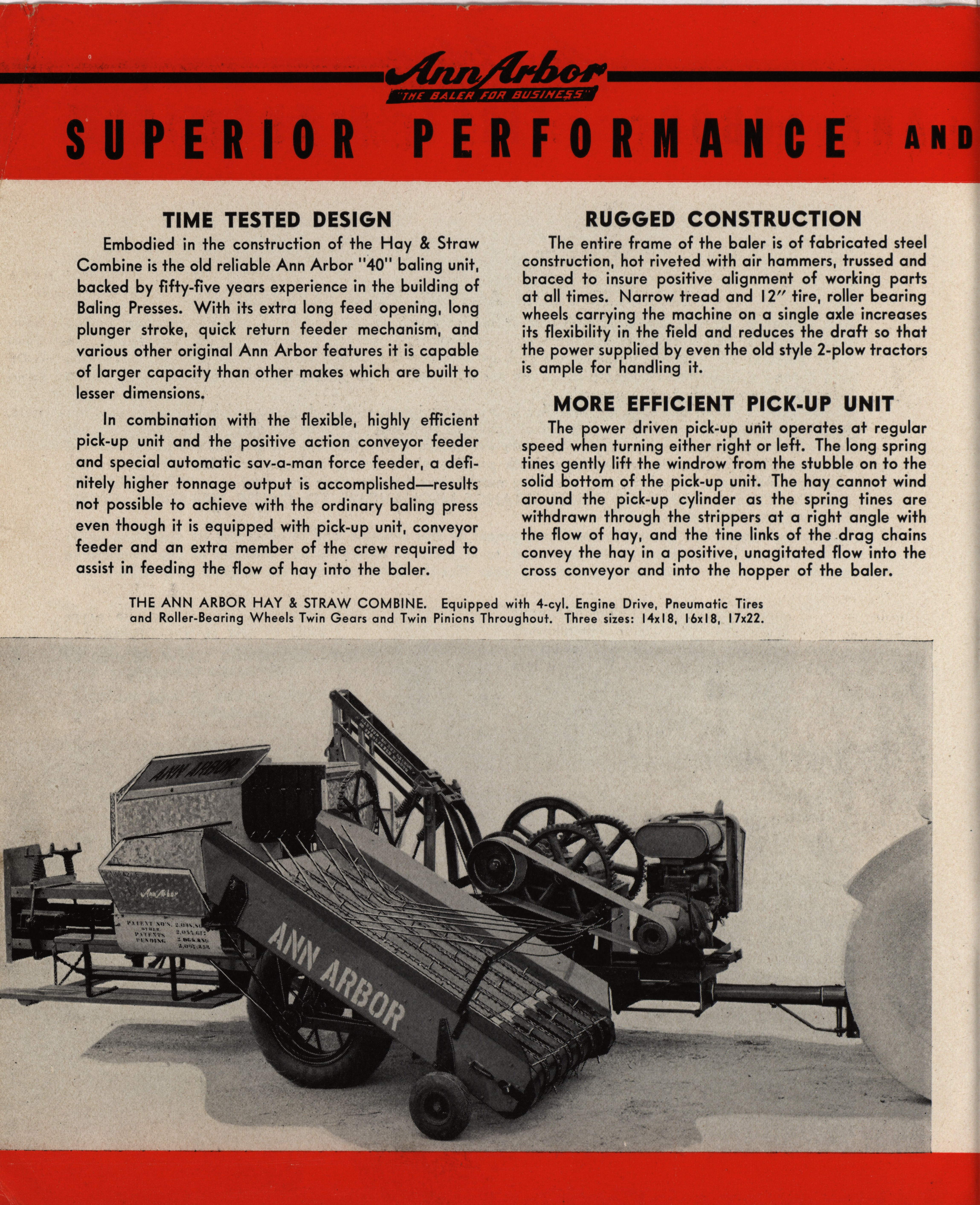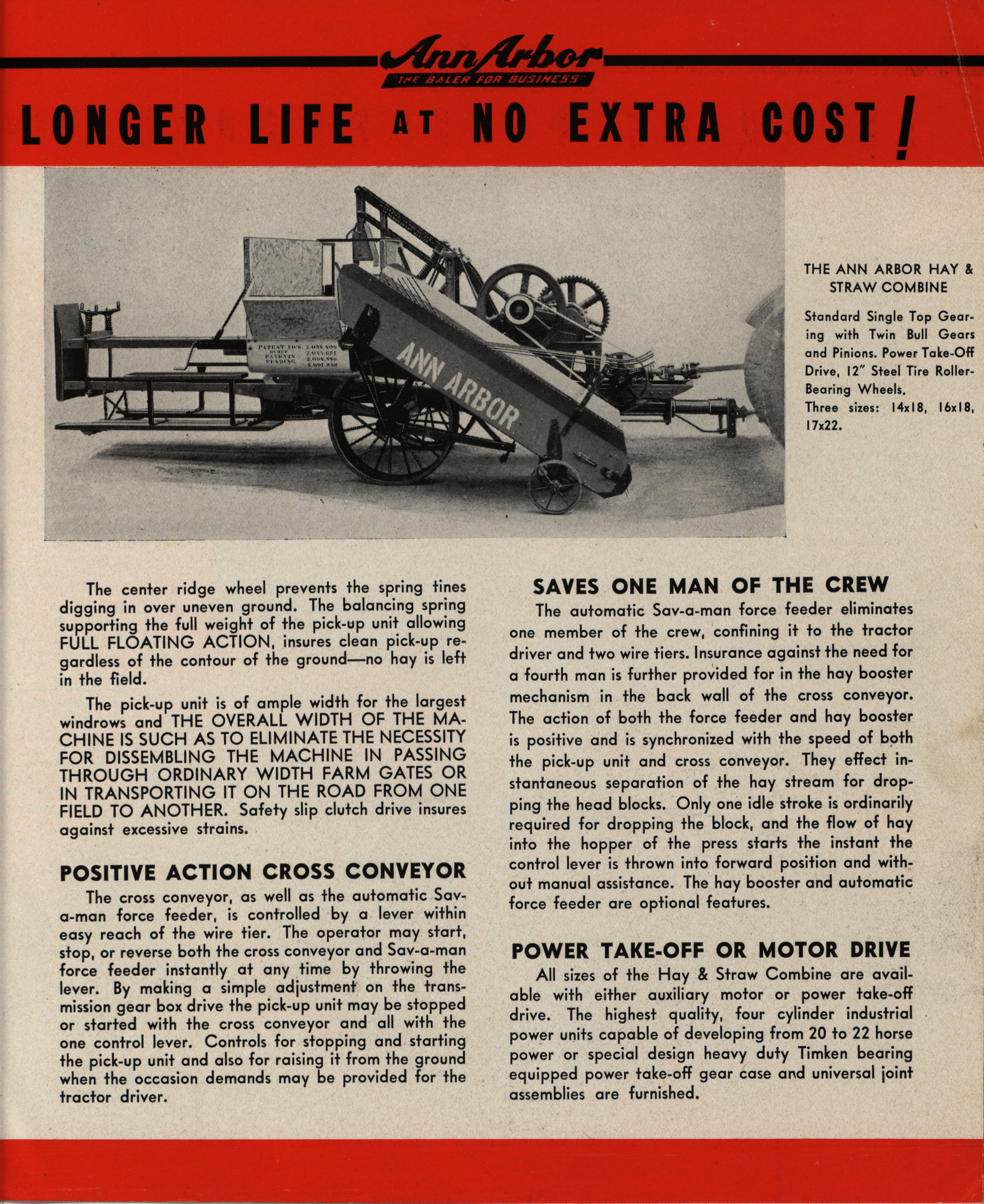 - Catalog by the Ann Arbor Machine Company describing their hay and straw combine product line including illustrations.