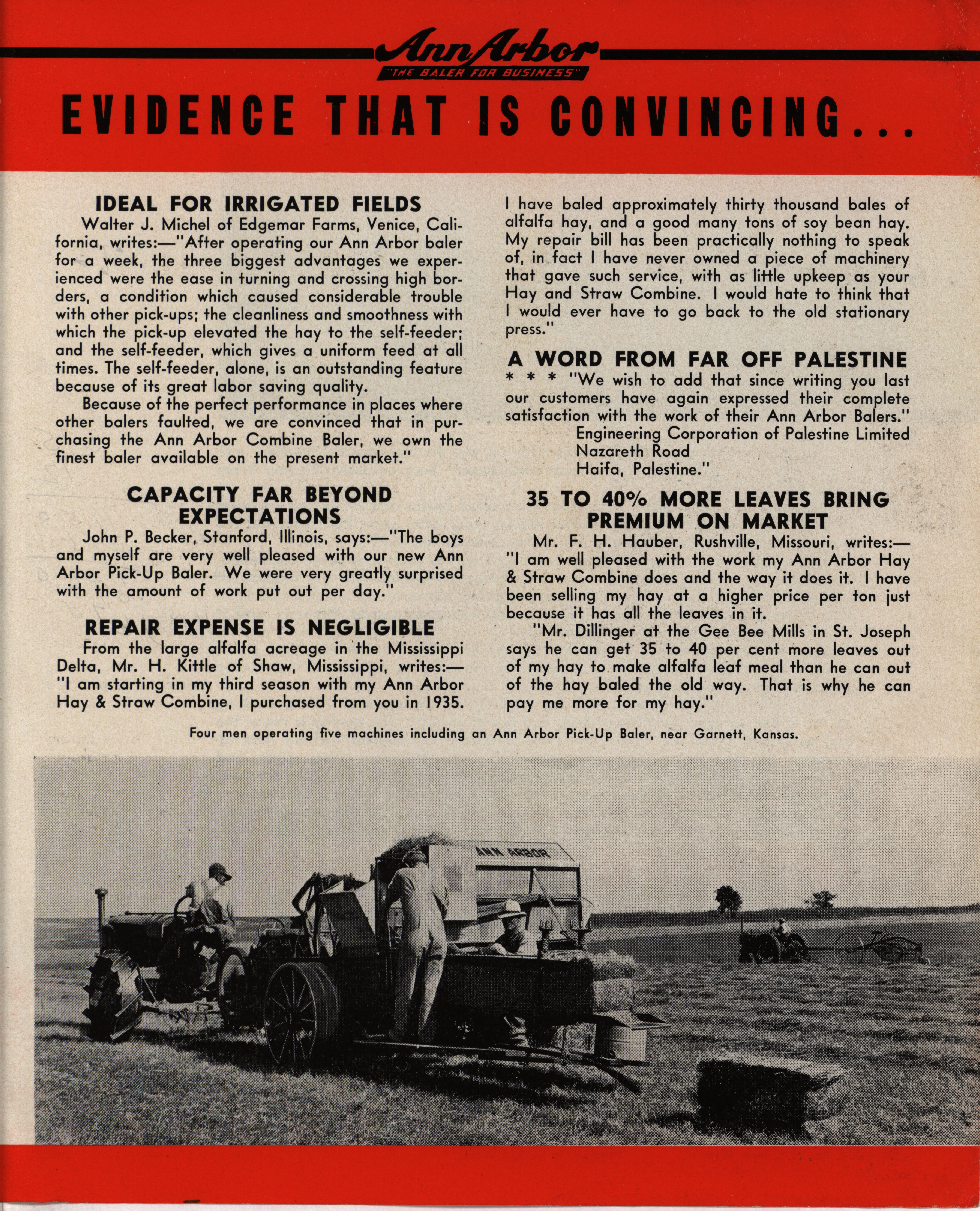 - "Ann Arbor Machine Company hay and straw combine catalog", Agricultural Machinery Literature Collection, Iowa State University Library Digital Collections