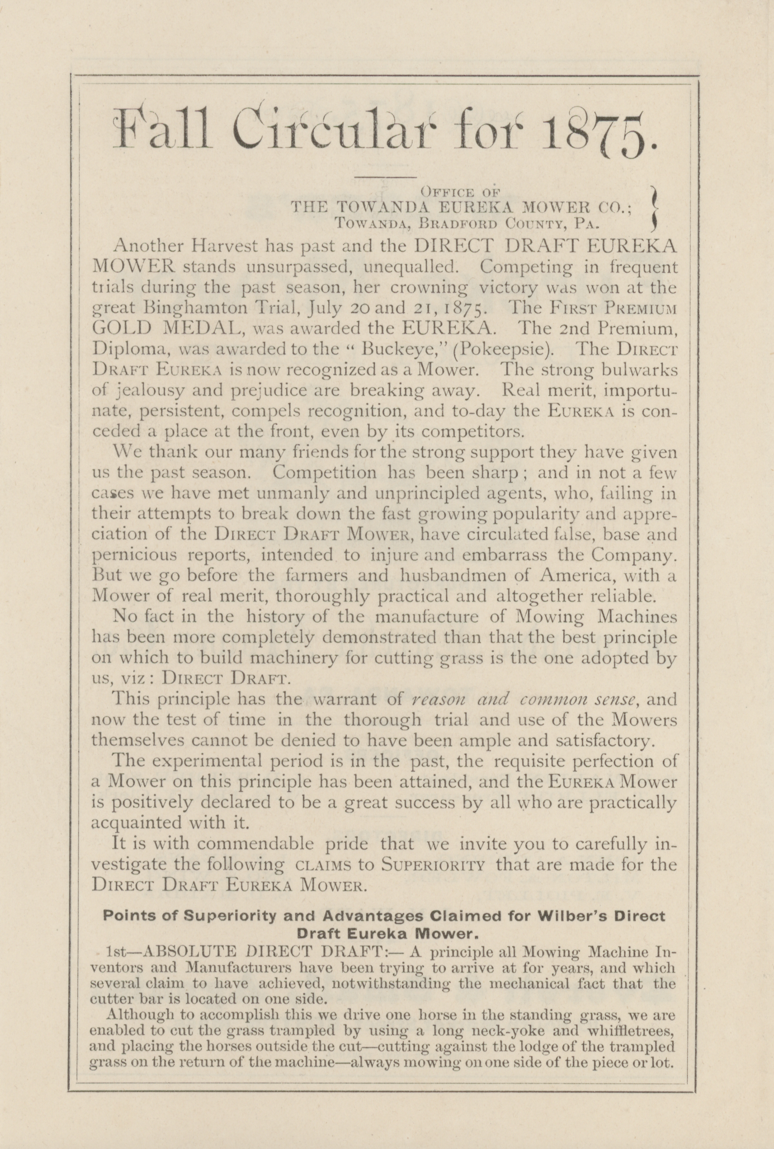 - Illustrated catalog describing the agricultural implements offered by Towanda Eureka Mower Company in 1875.