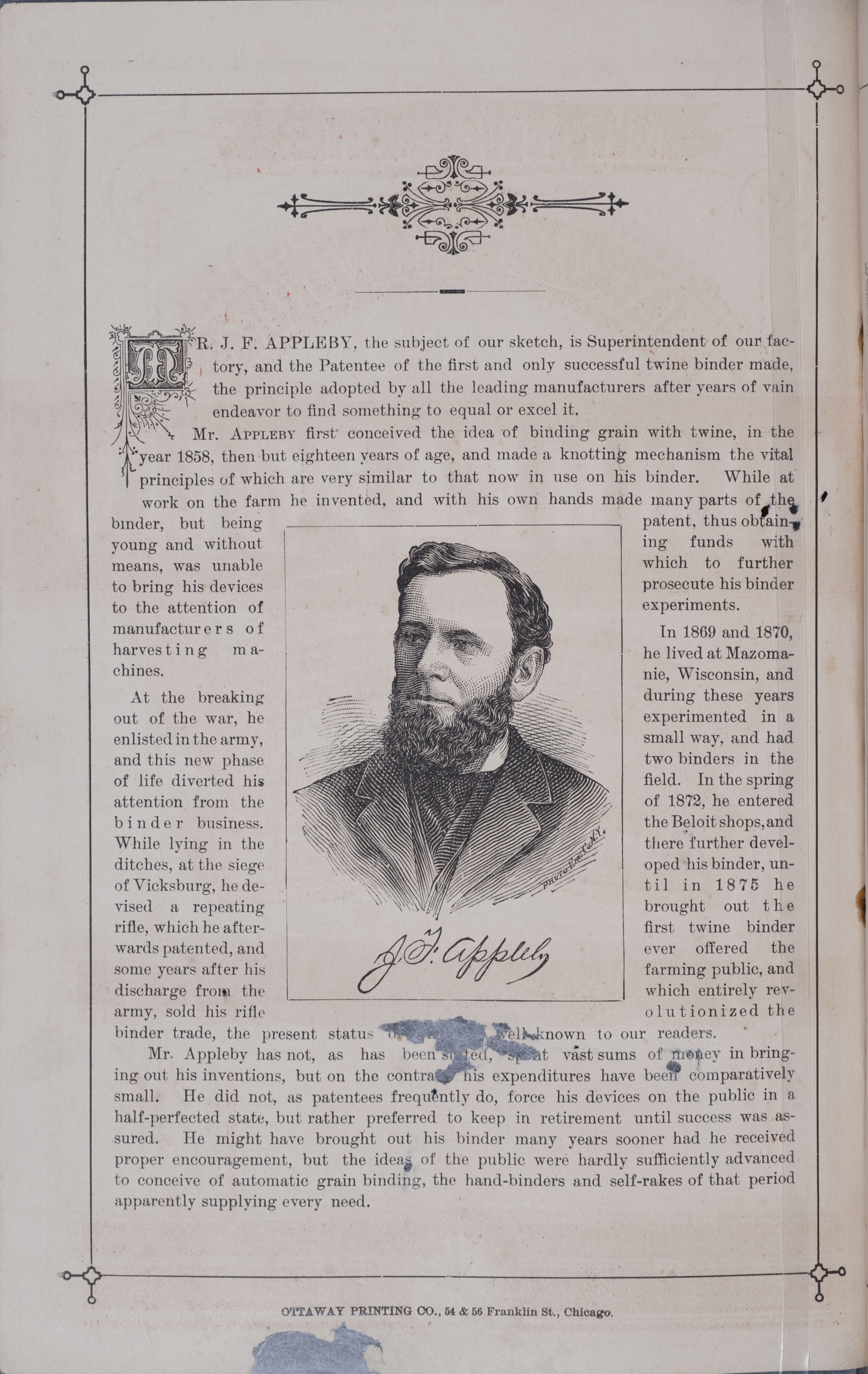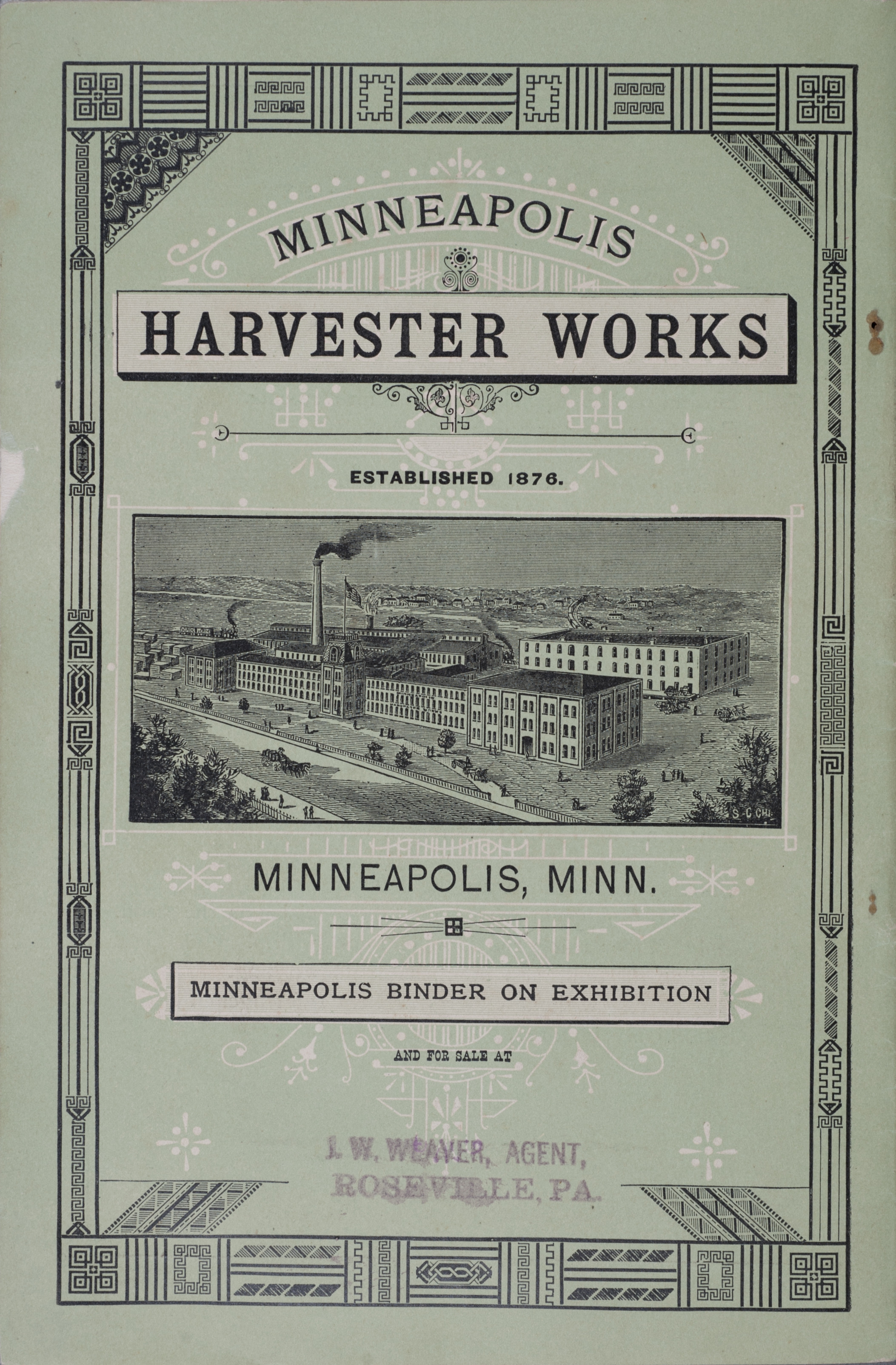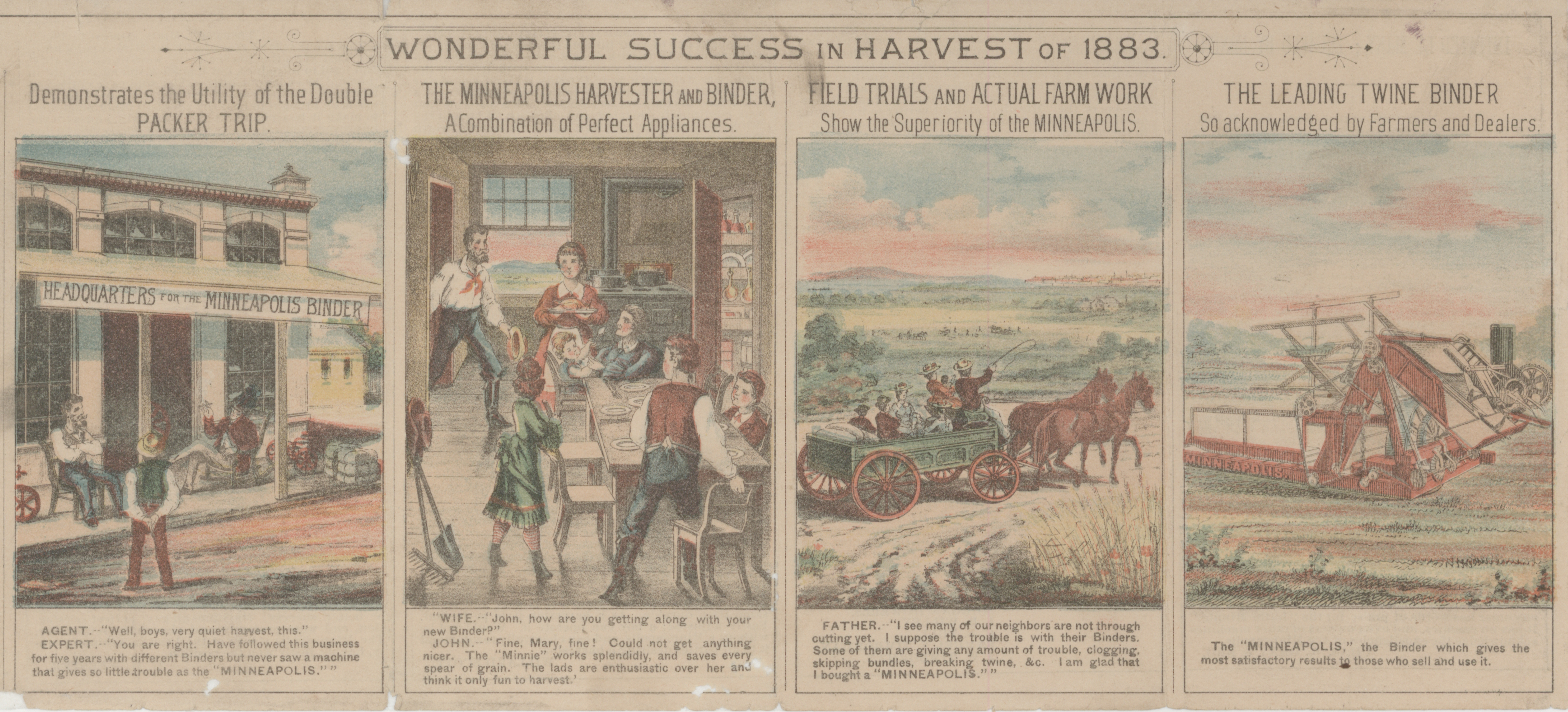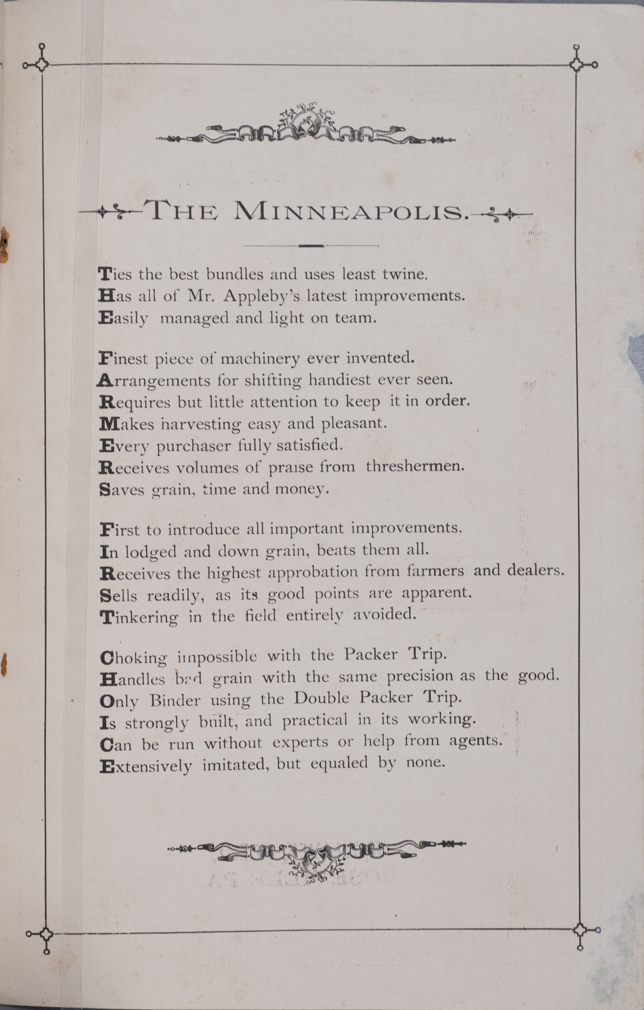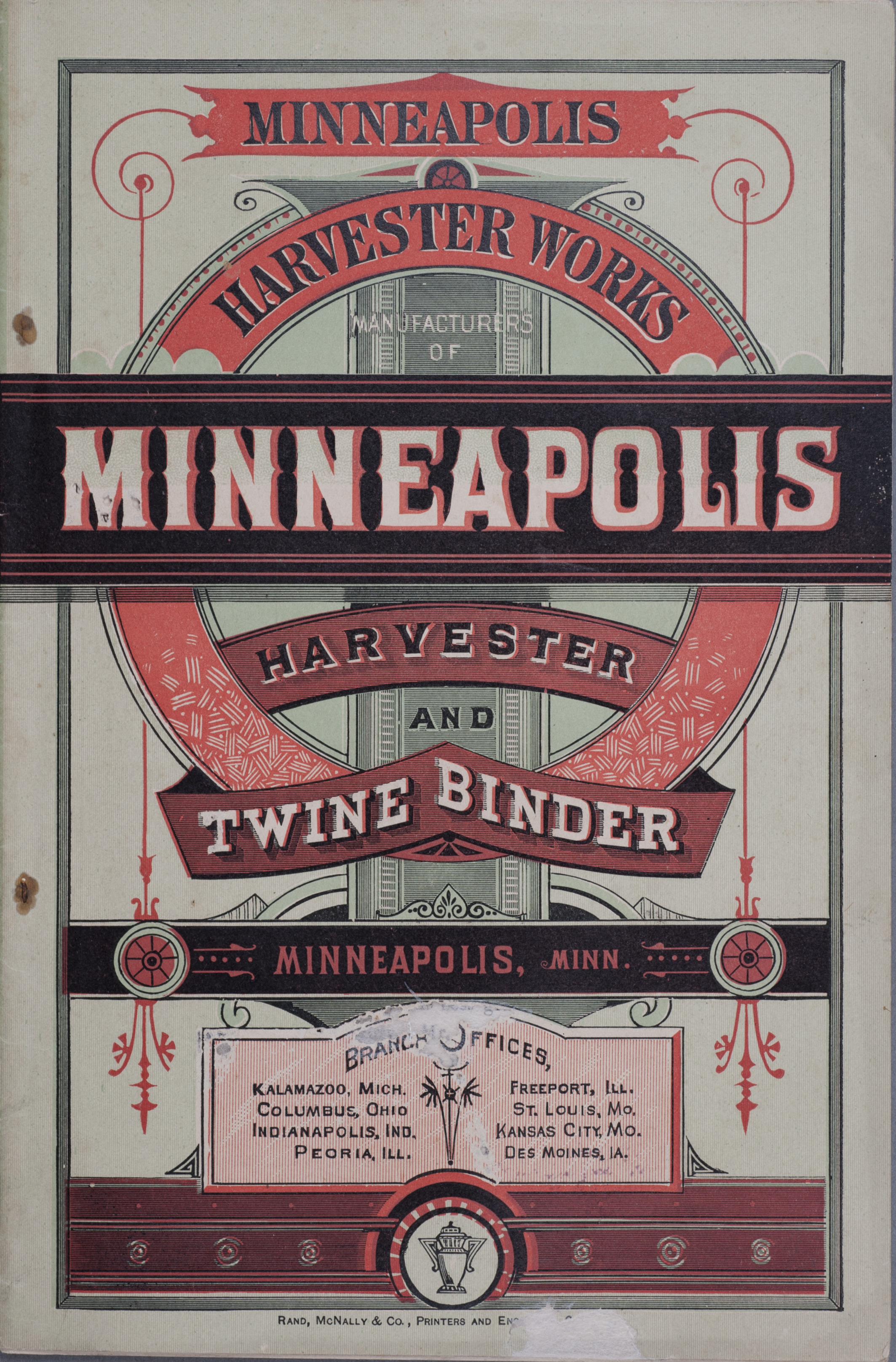 - Illustrated catalog describing the harvester, twine binder and related agricultural implements offered by Minneapolis Harvester Works in 1884.