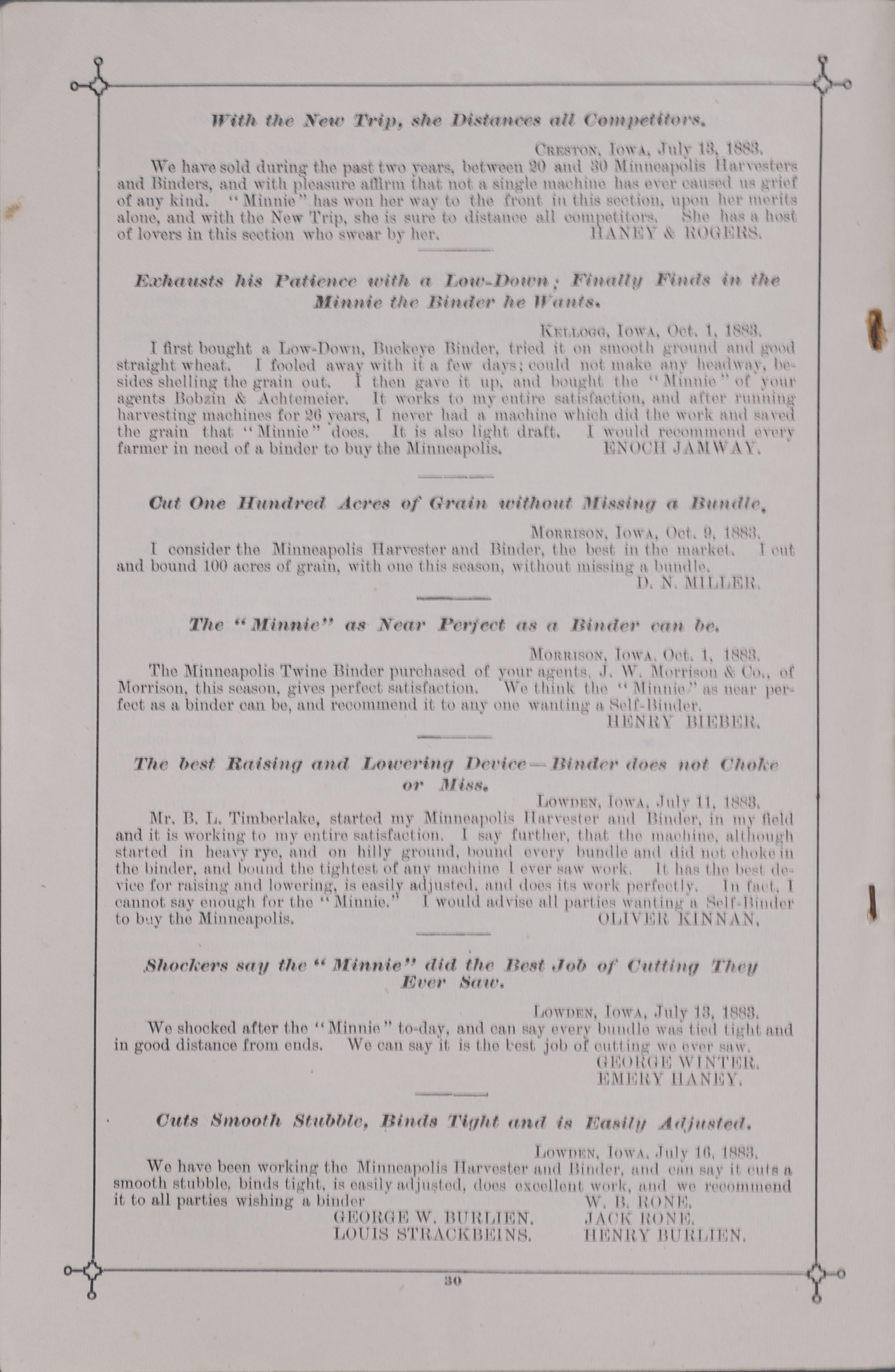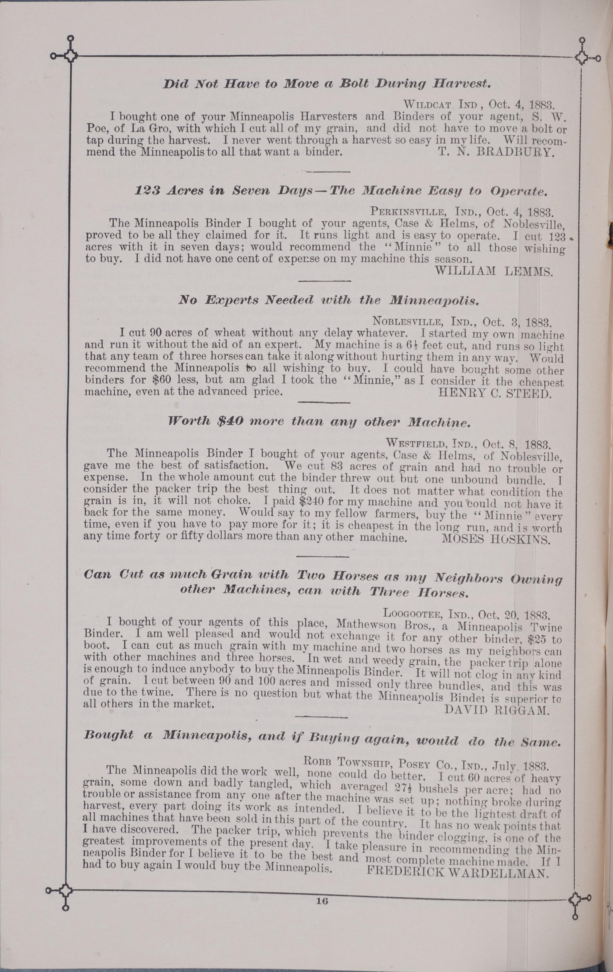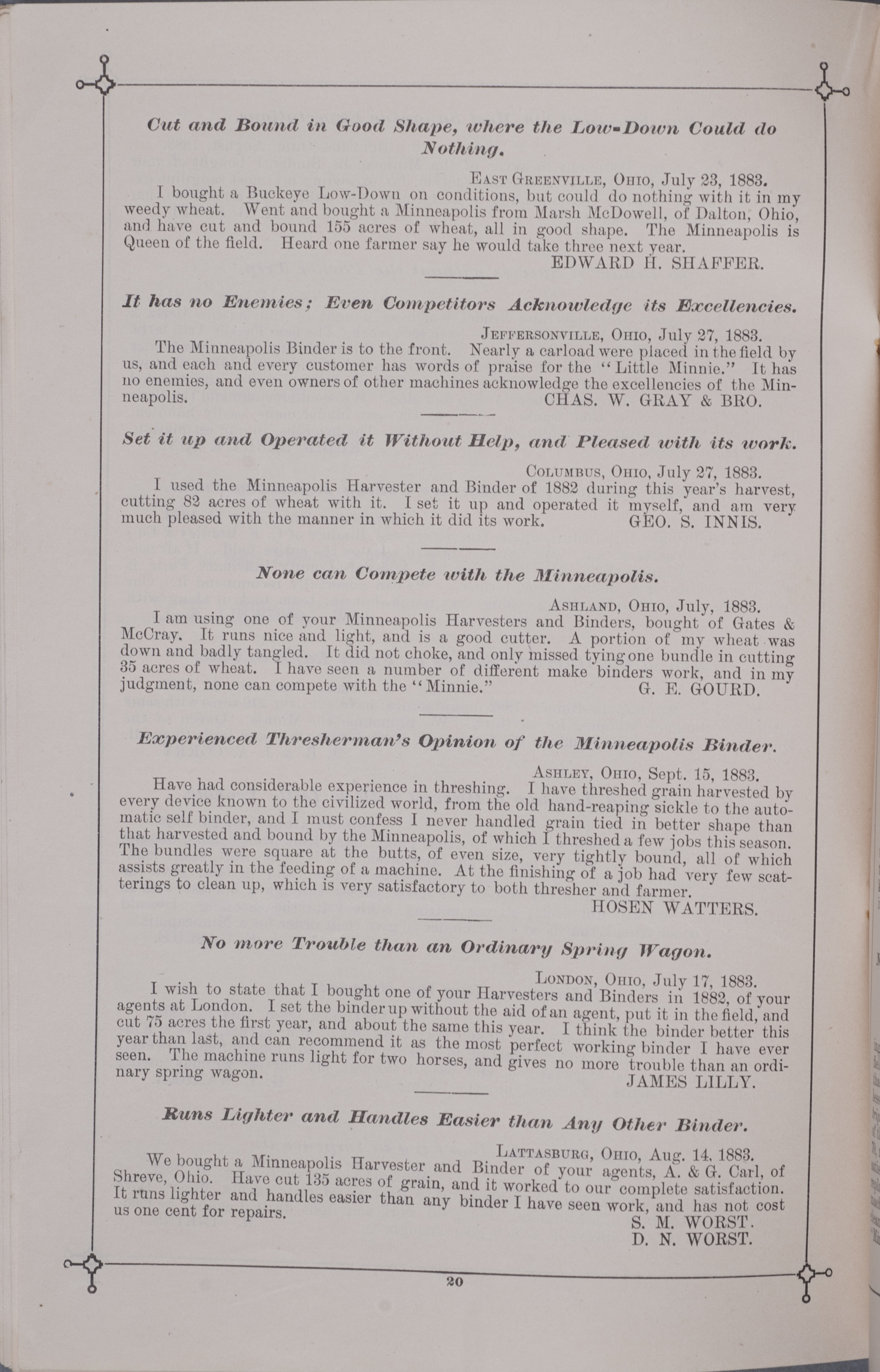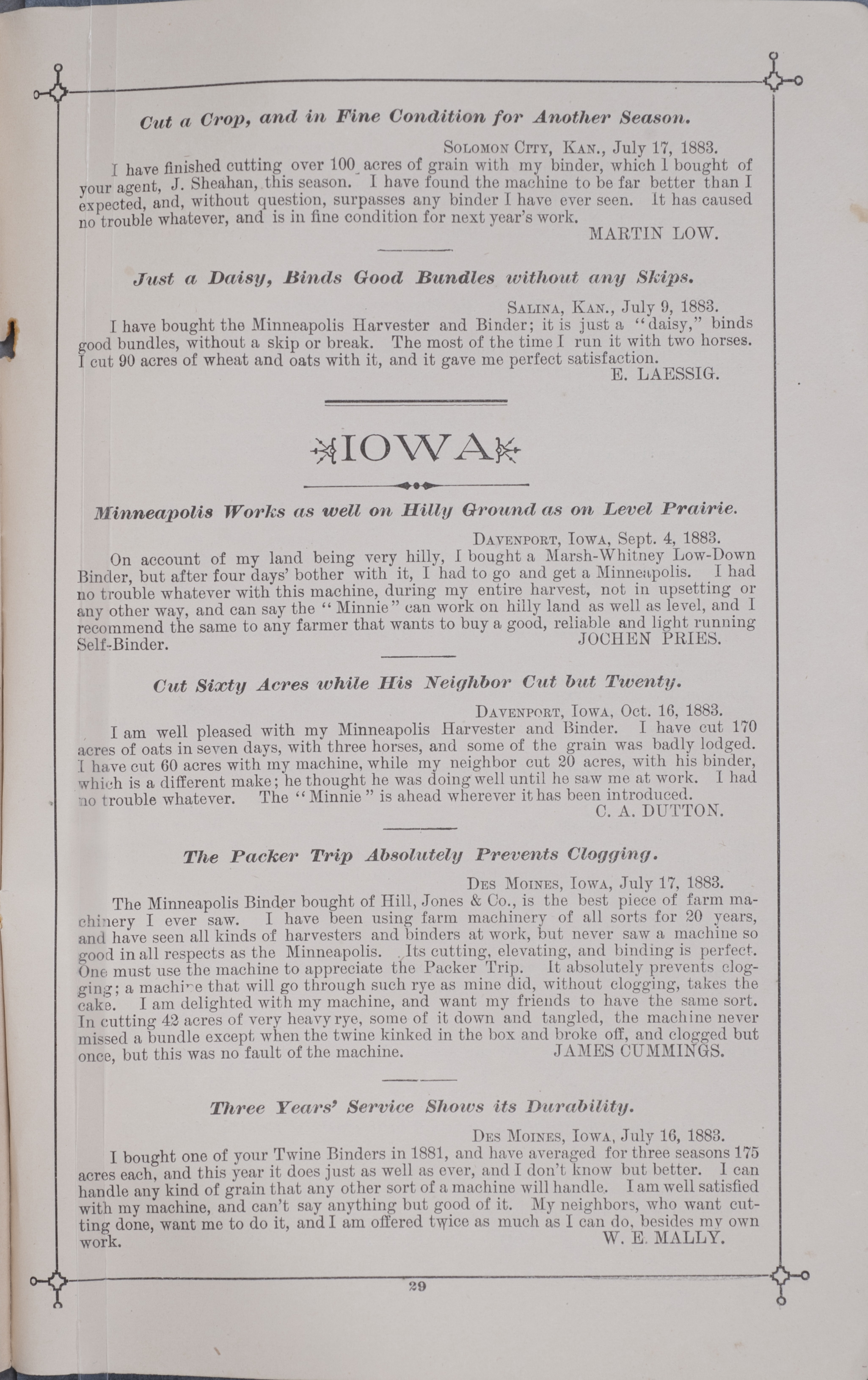 - "Minneapolis Harvester Works 1884 catalog", Agricultural Machinery Literature Collection, Iowa State University Library Digital Collections