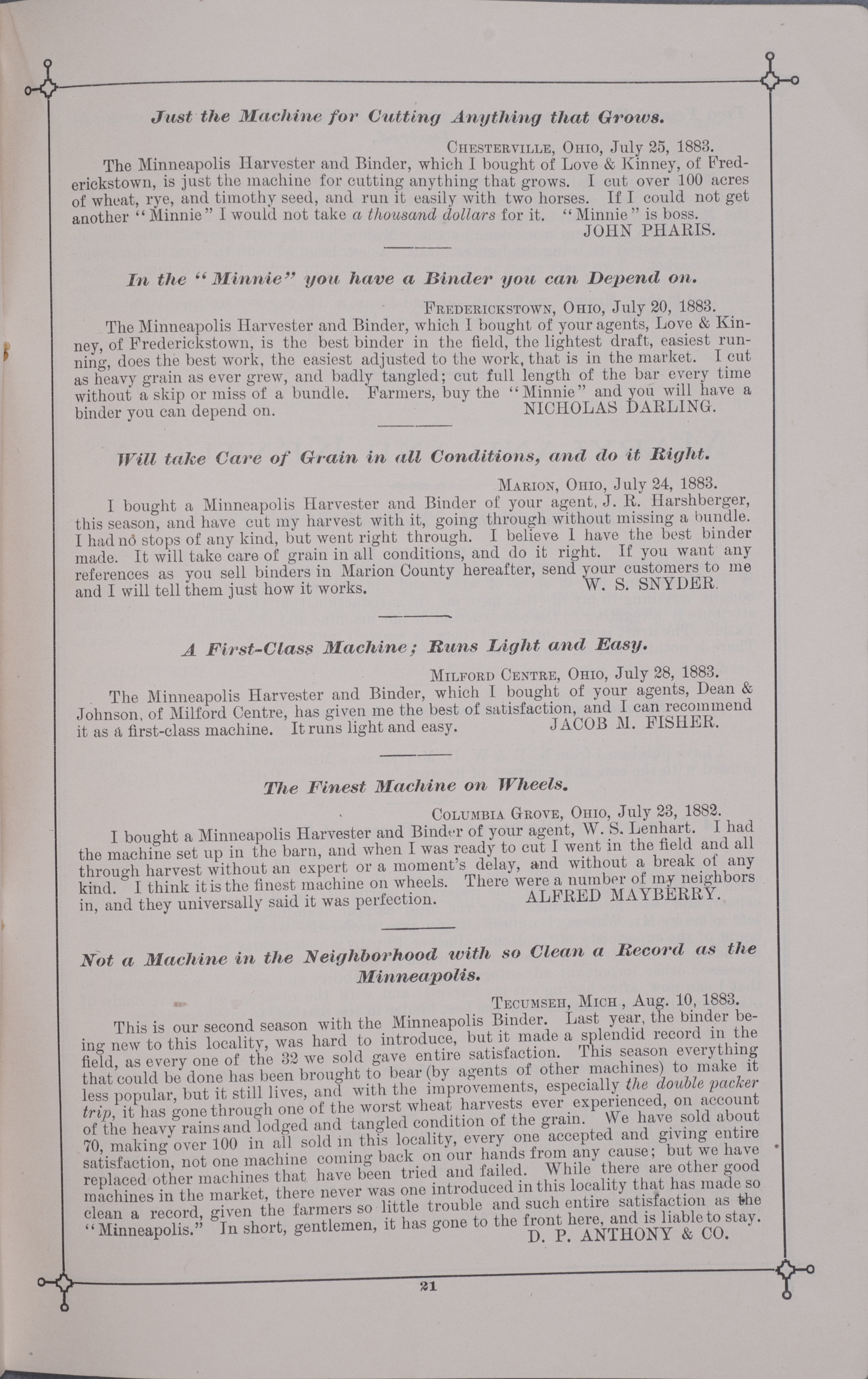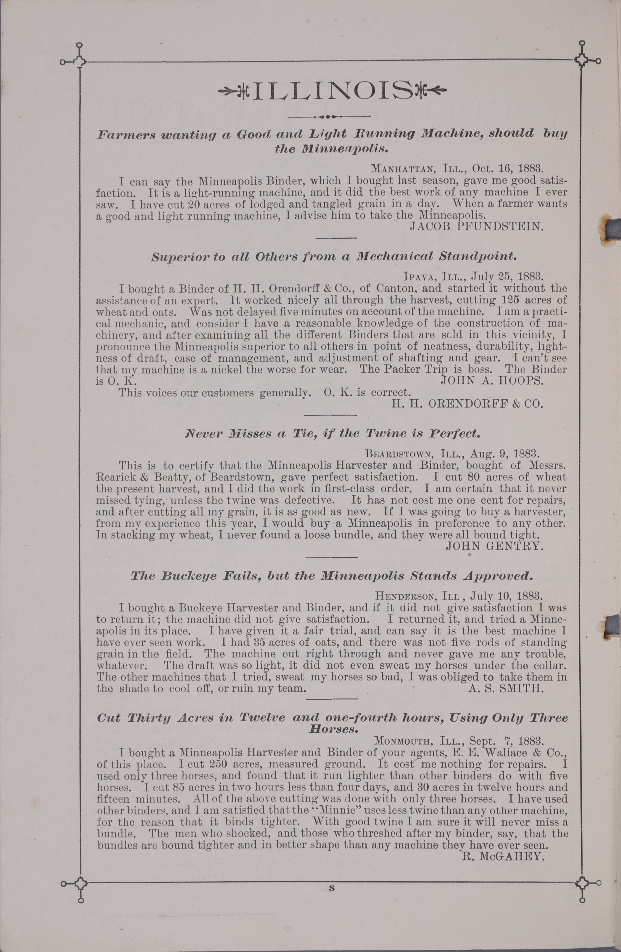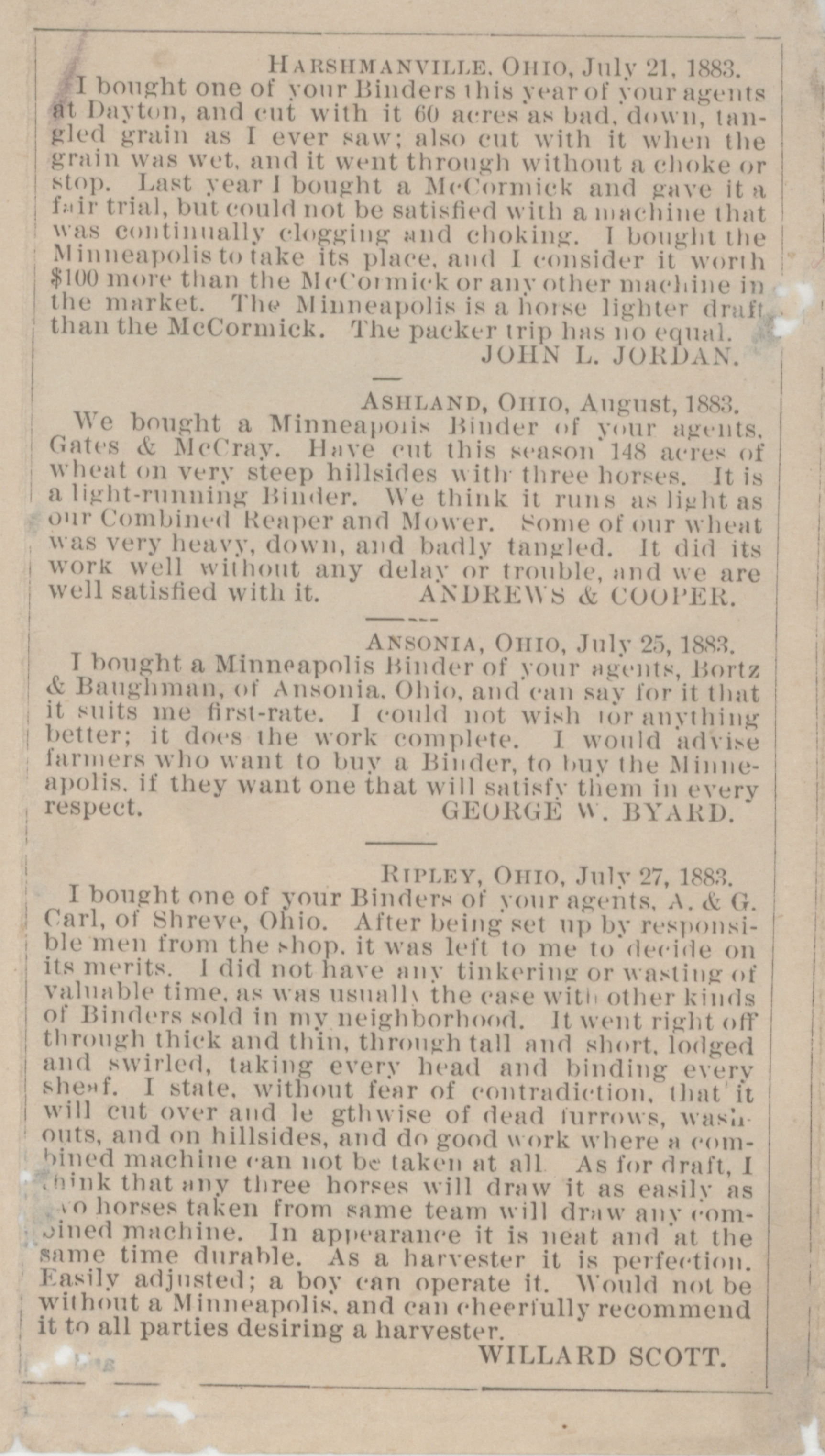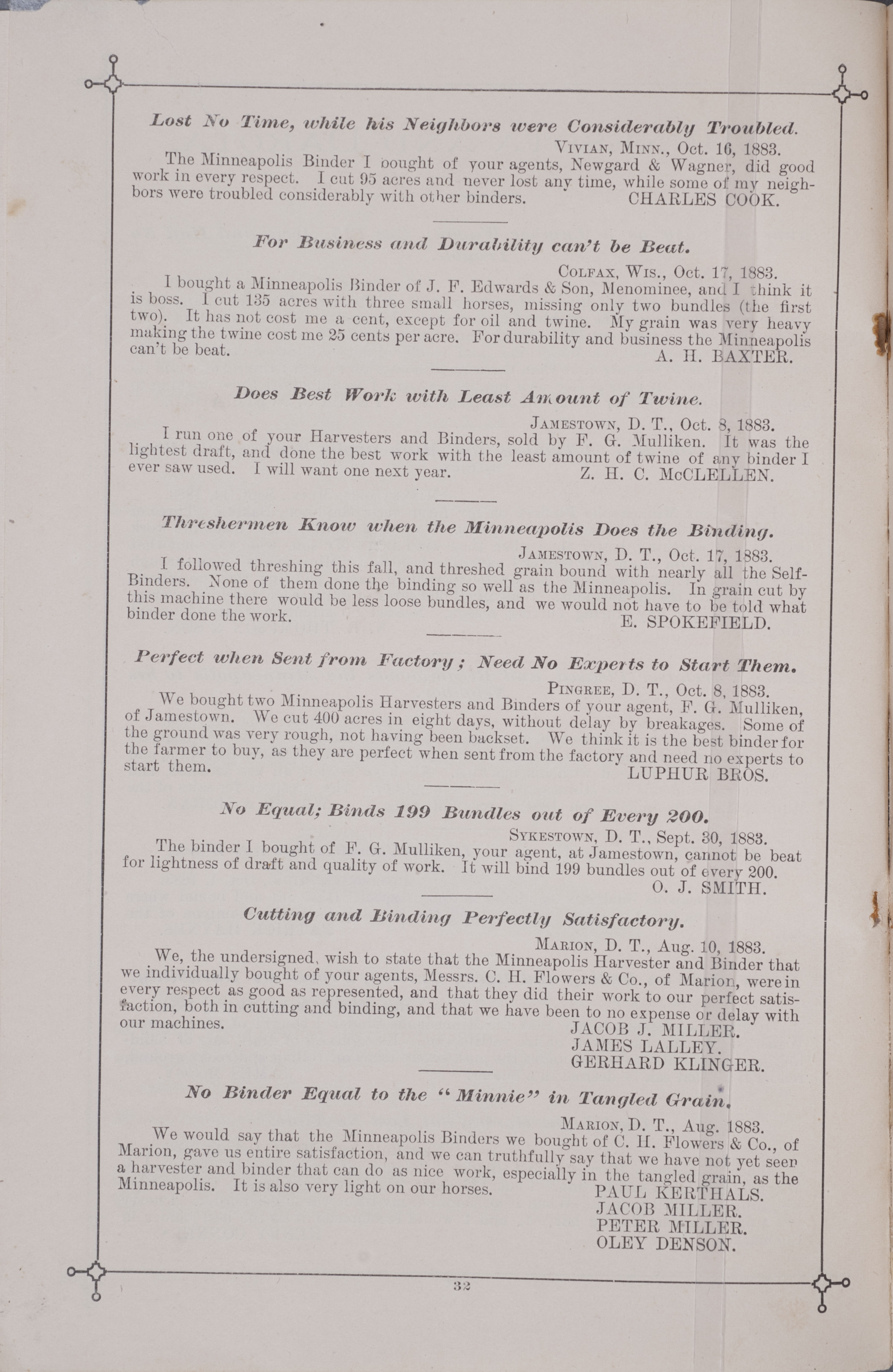 - "Minneapolis Harvester Works 1884 catalog", Agricultural Machinery Literature Collection, Iowa State University Library Digital Collections