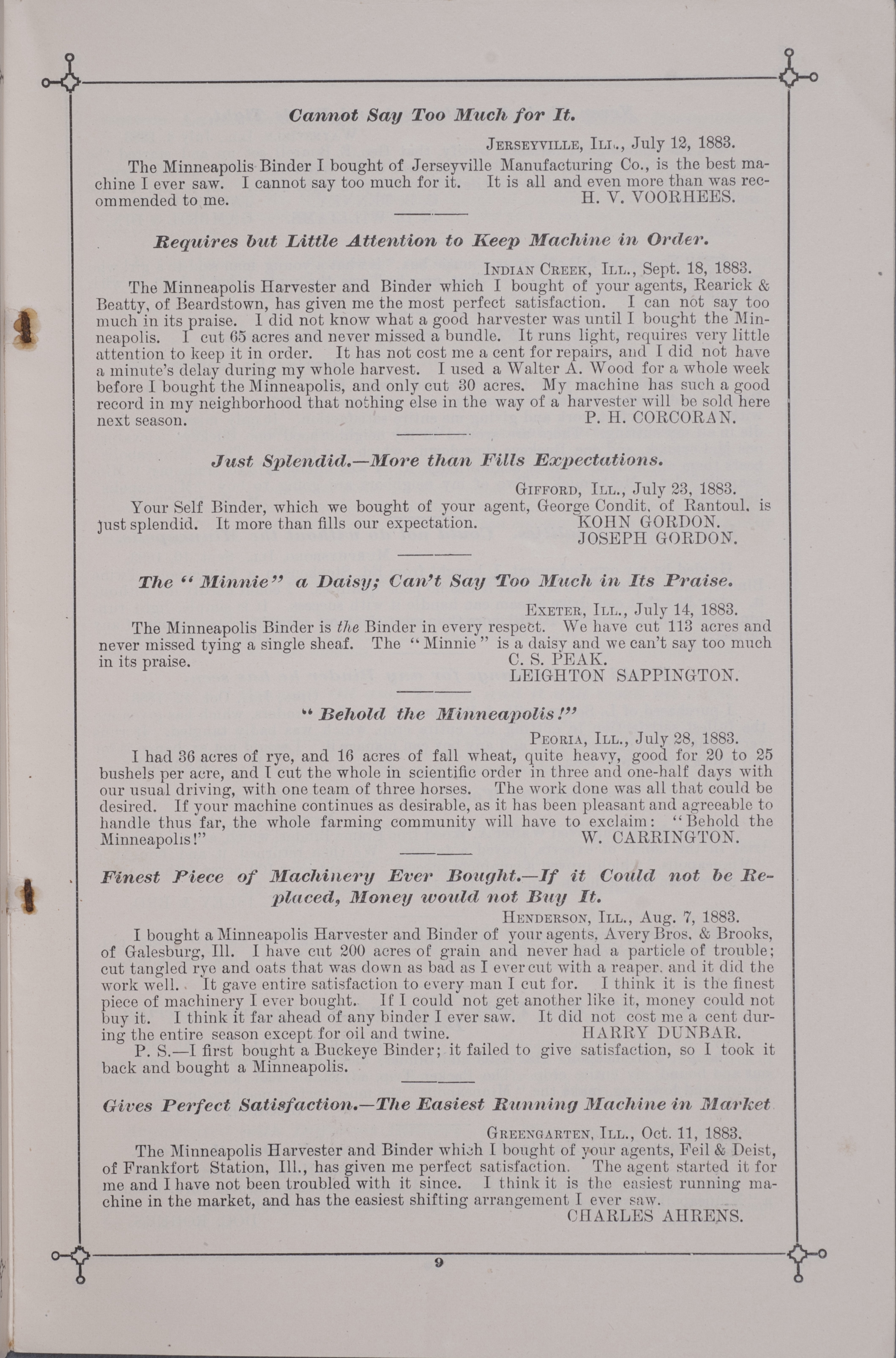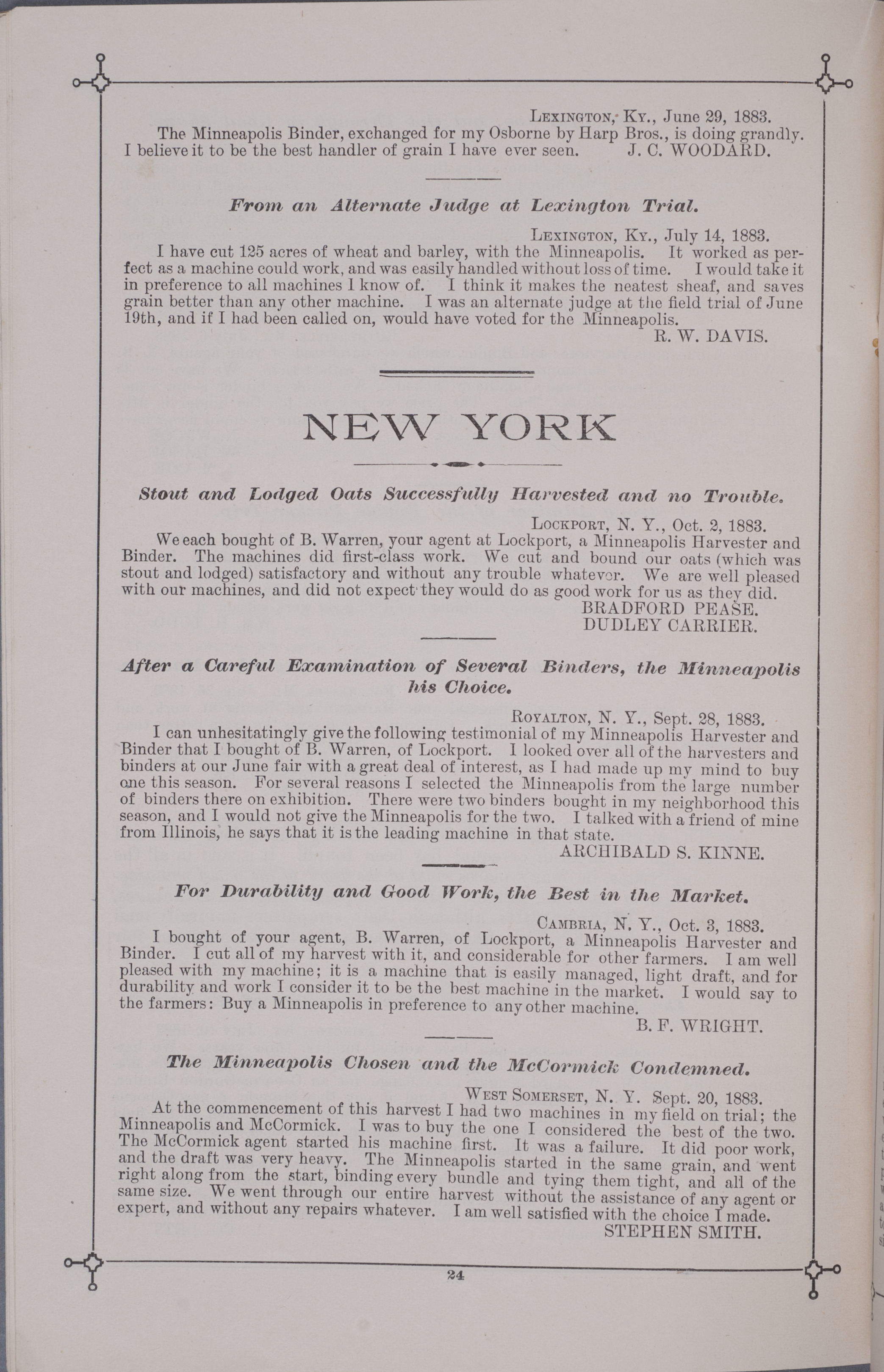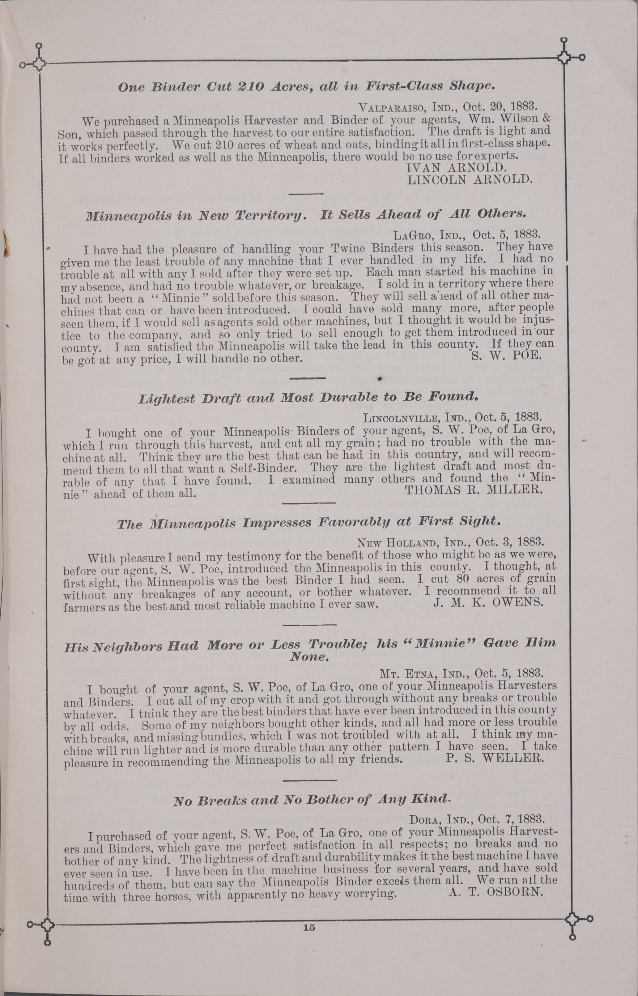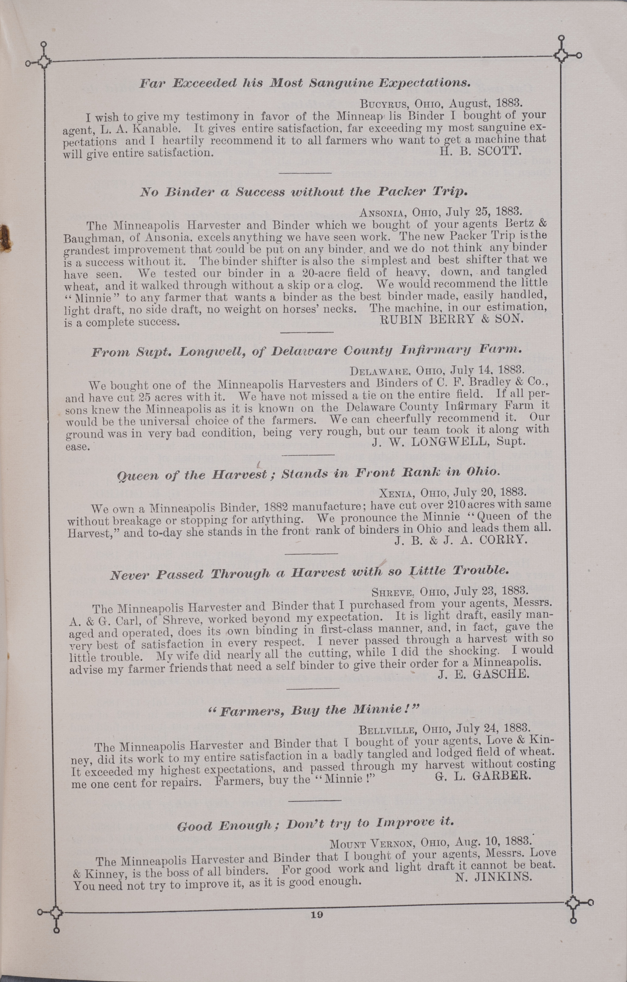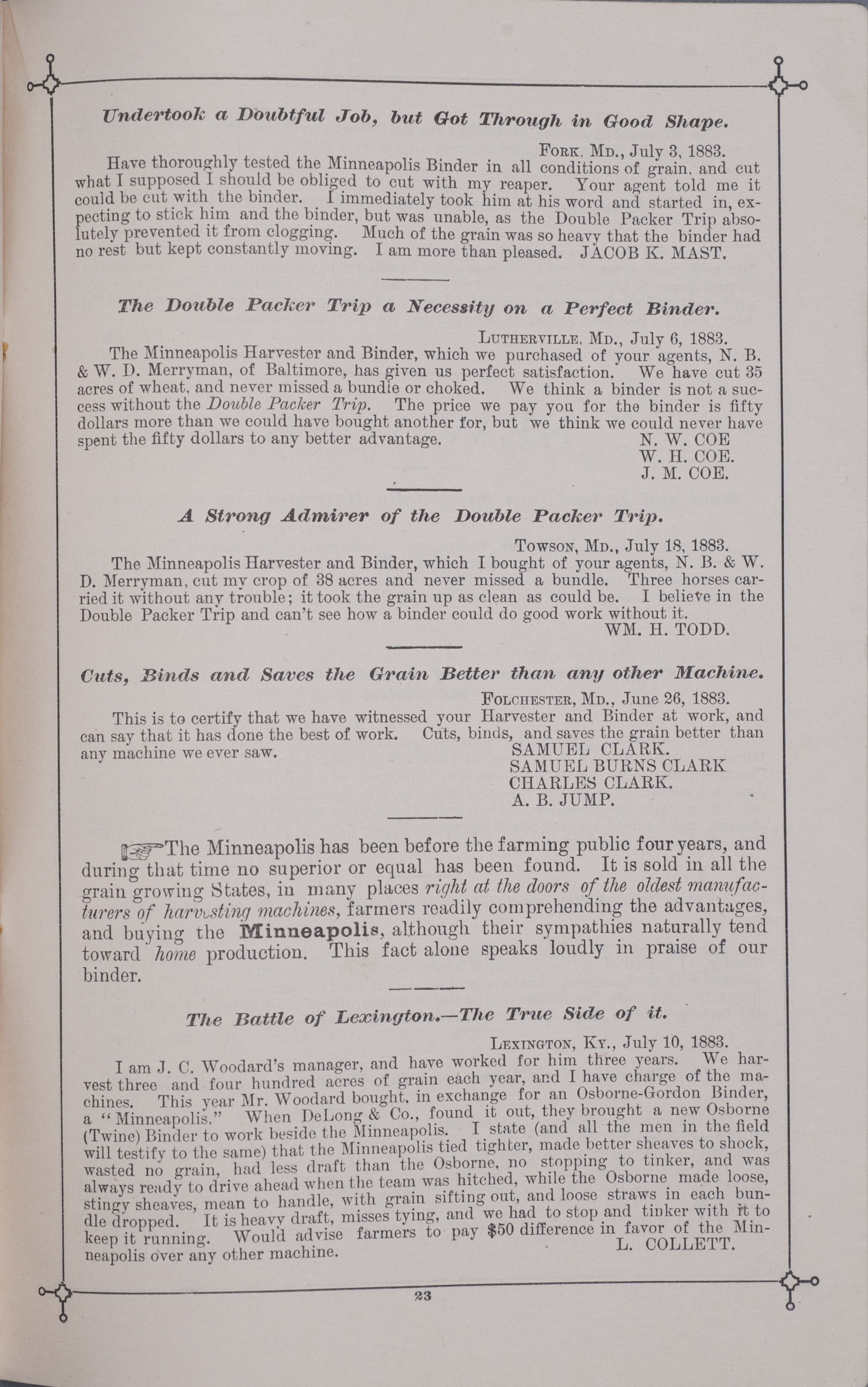 - "Minneapolis Harvester Works 1884 catalog", Agricultural Machinery Literature Collection, Iowa State University Library Digital Collections