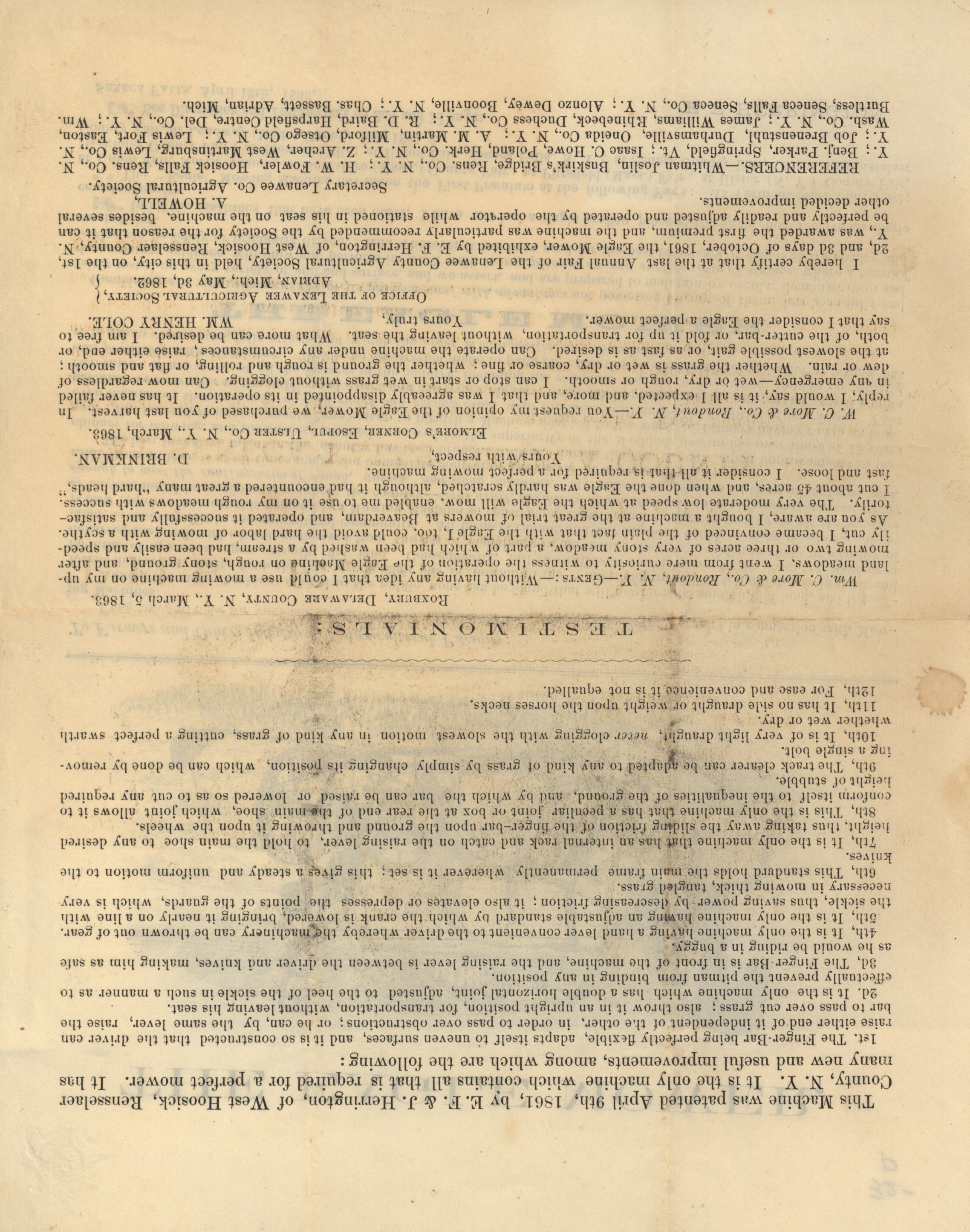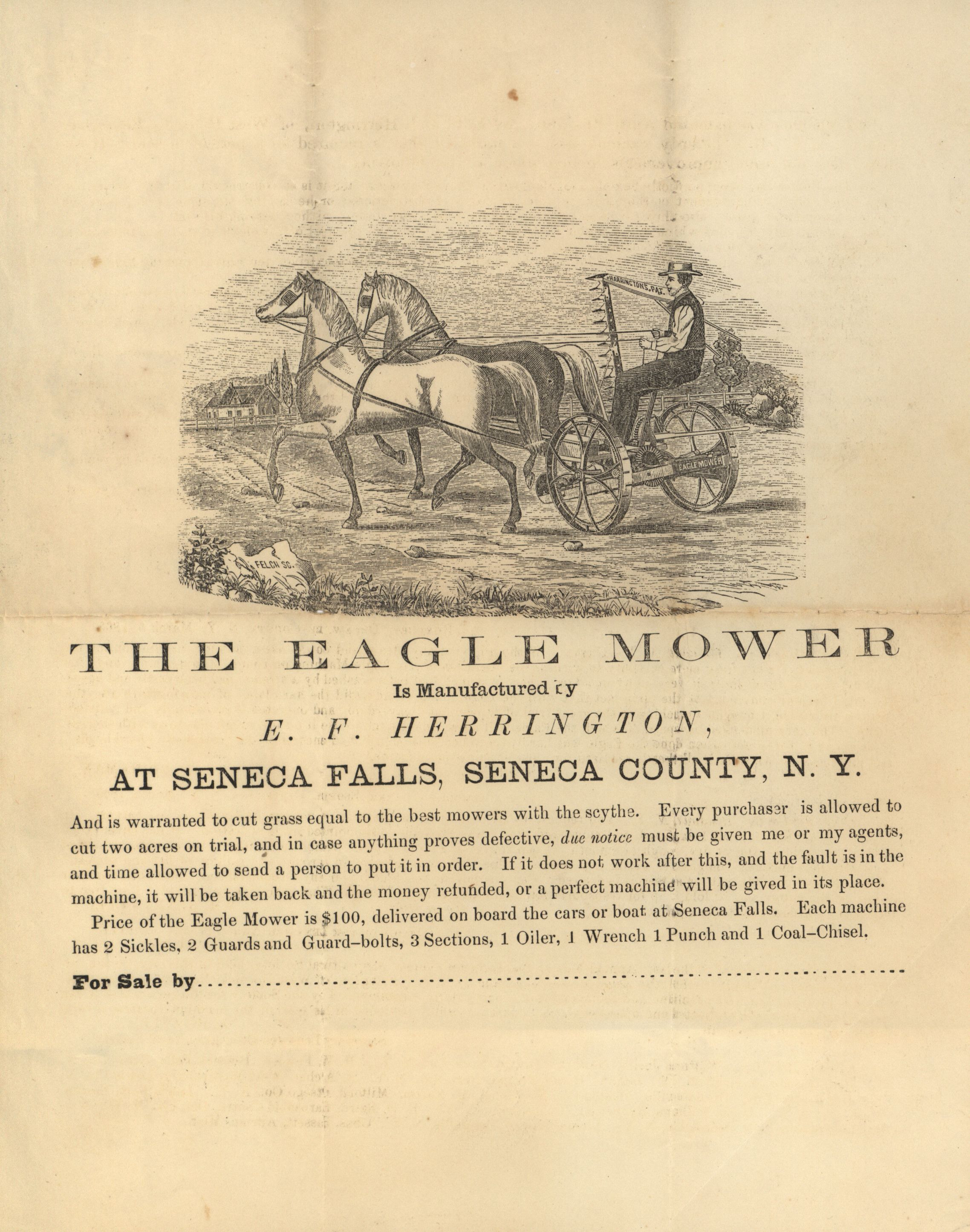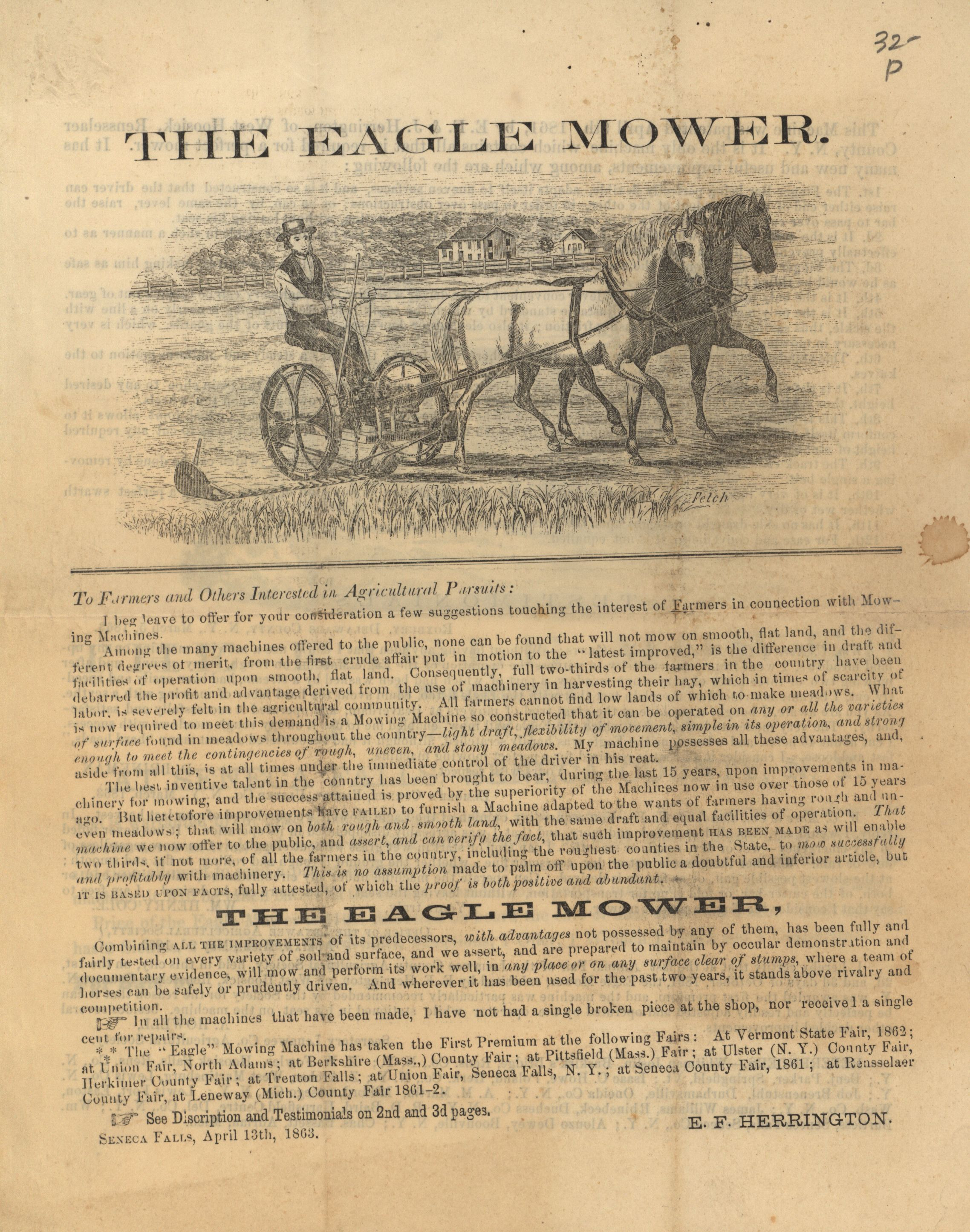 - "E. F. Herrington Eagle Mower 1863 advertisement", Agricultural Machinery Literature Collection, Iowa State University Library Digital Collections