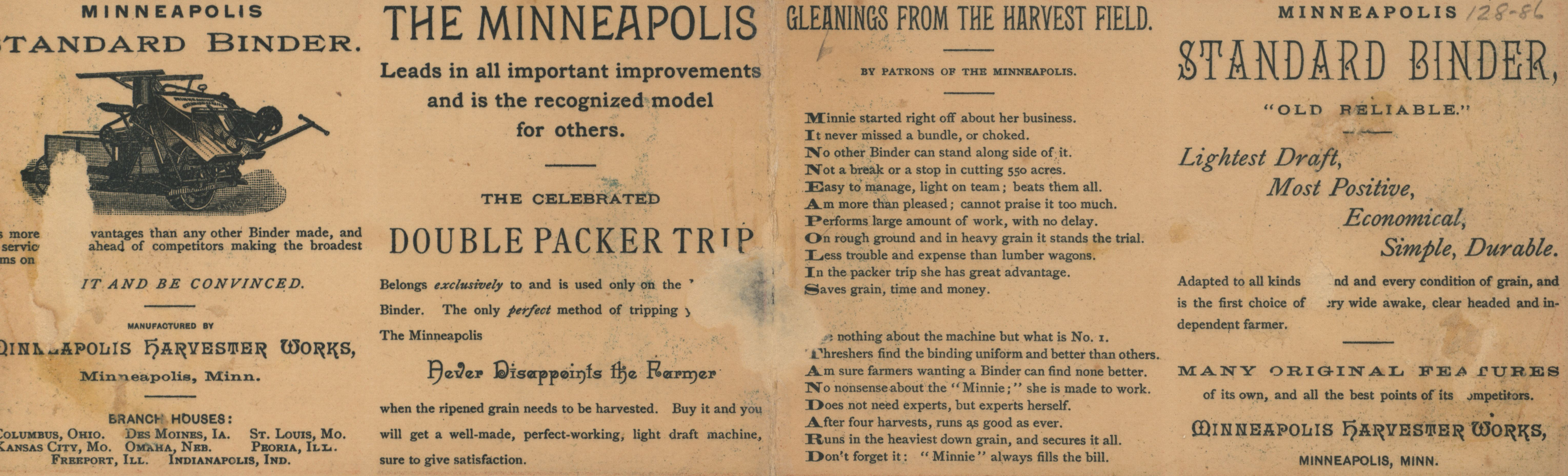 - "Minneapolis Harvester Works advertisement pamphlet", Agricultural Machinery Literature Collection, Iowa State University Library Digital Collections