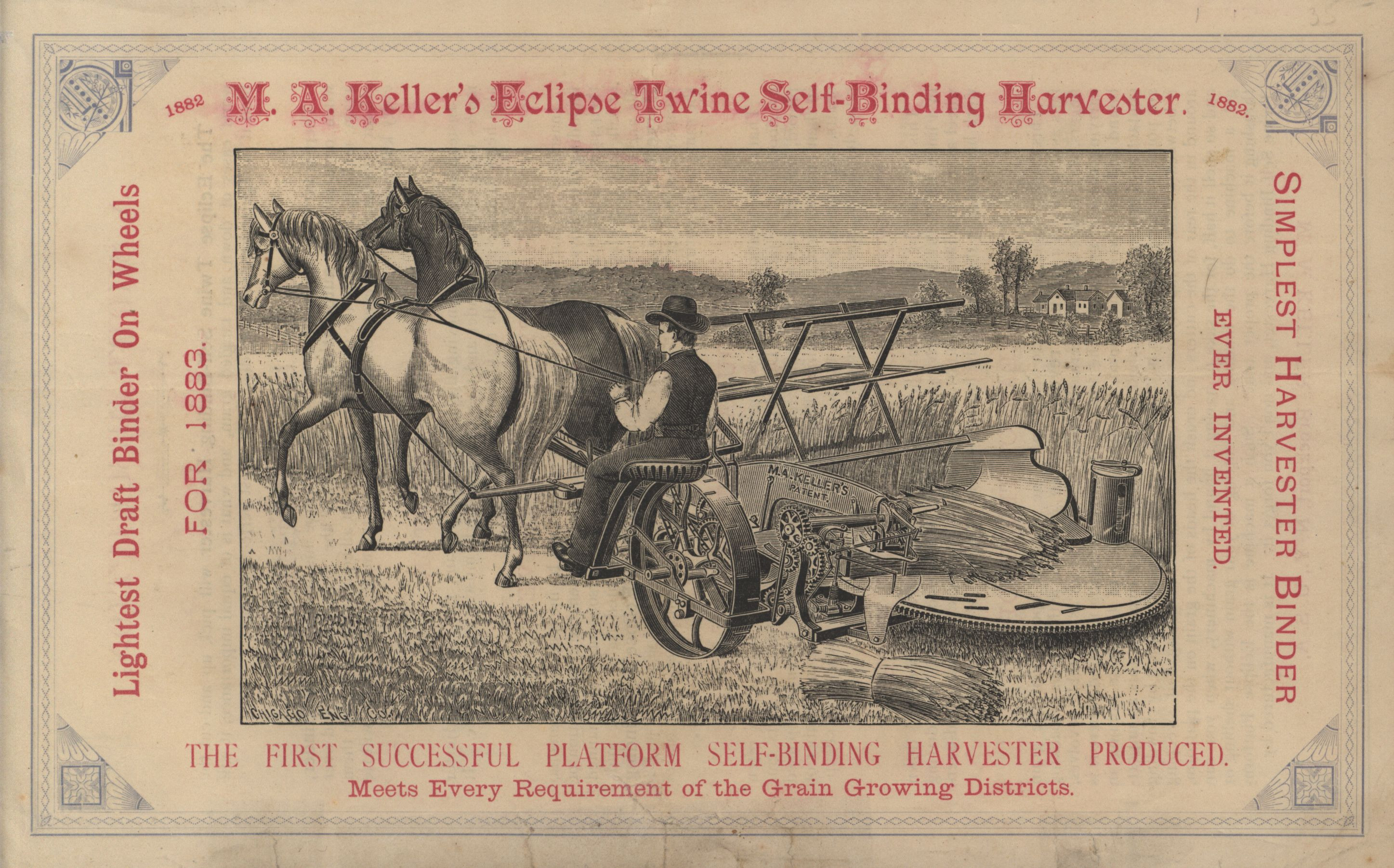 - Illustrated advertisement pamphlet for the automatic binder offered by M. A. Keller in 1882.