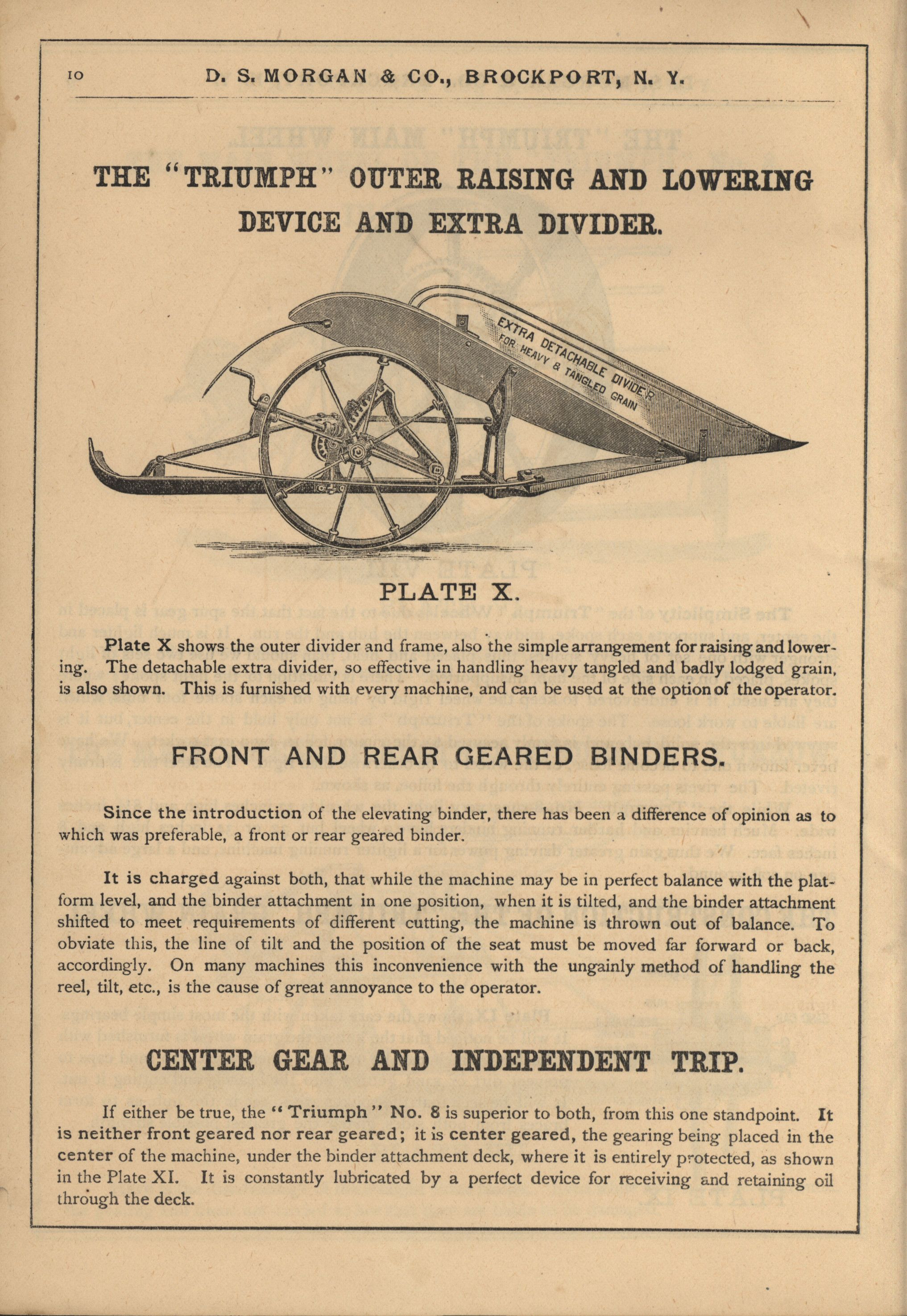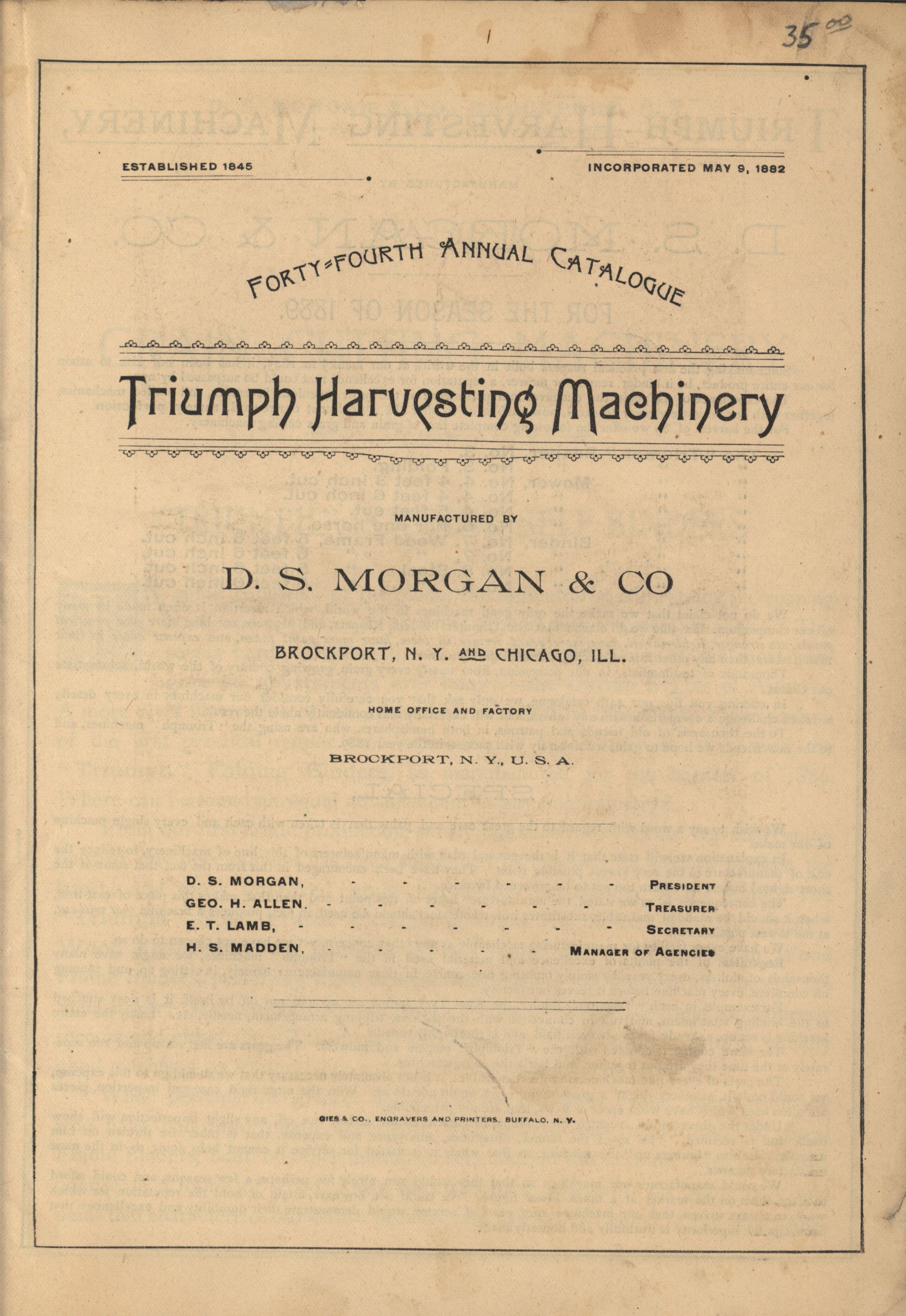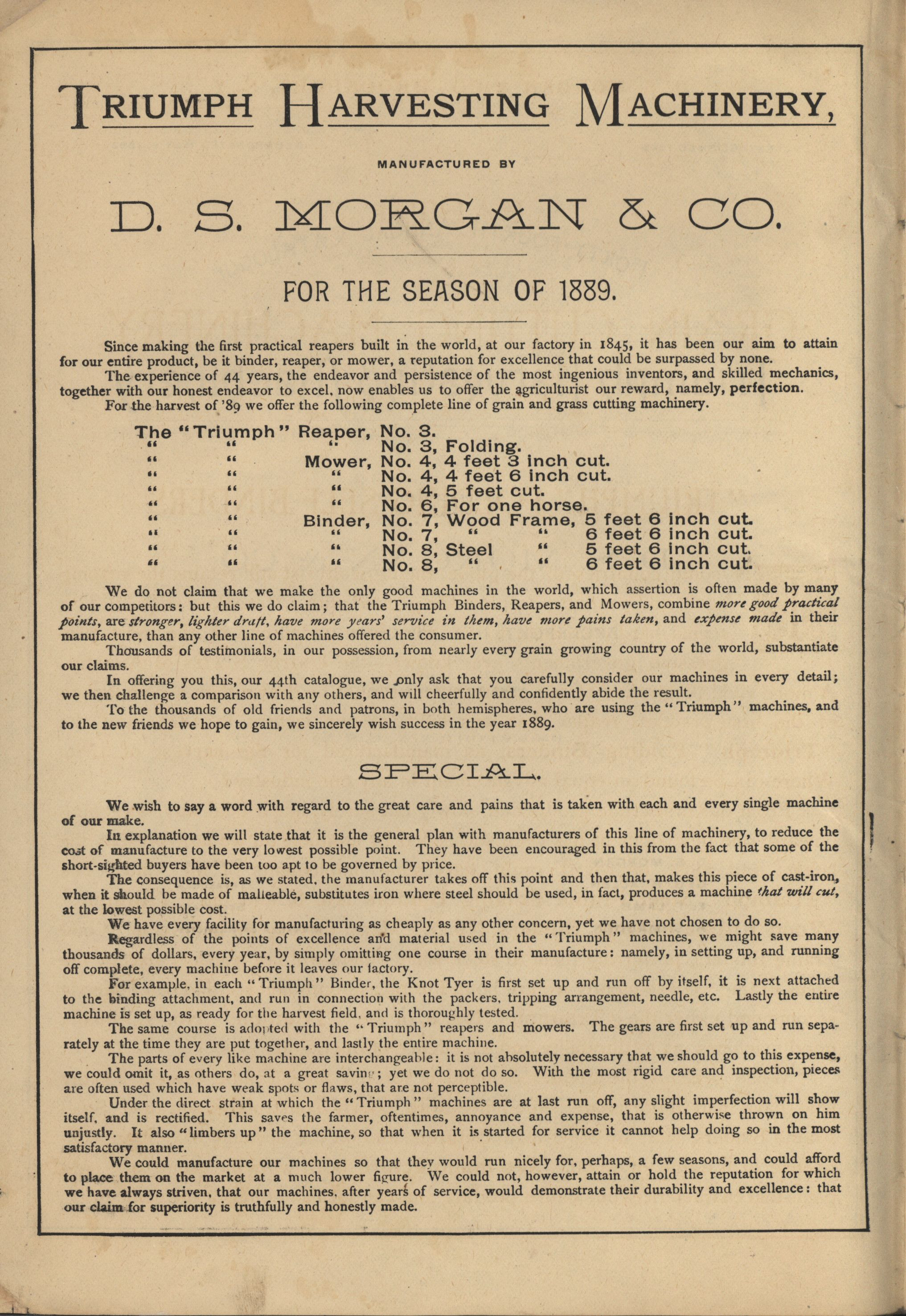 - Illustrated catalog describing the Triumph Harvesting Machinery product line offered by D. S. Morgan and Company in 1889.
