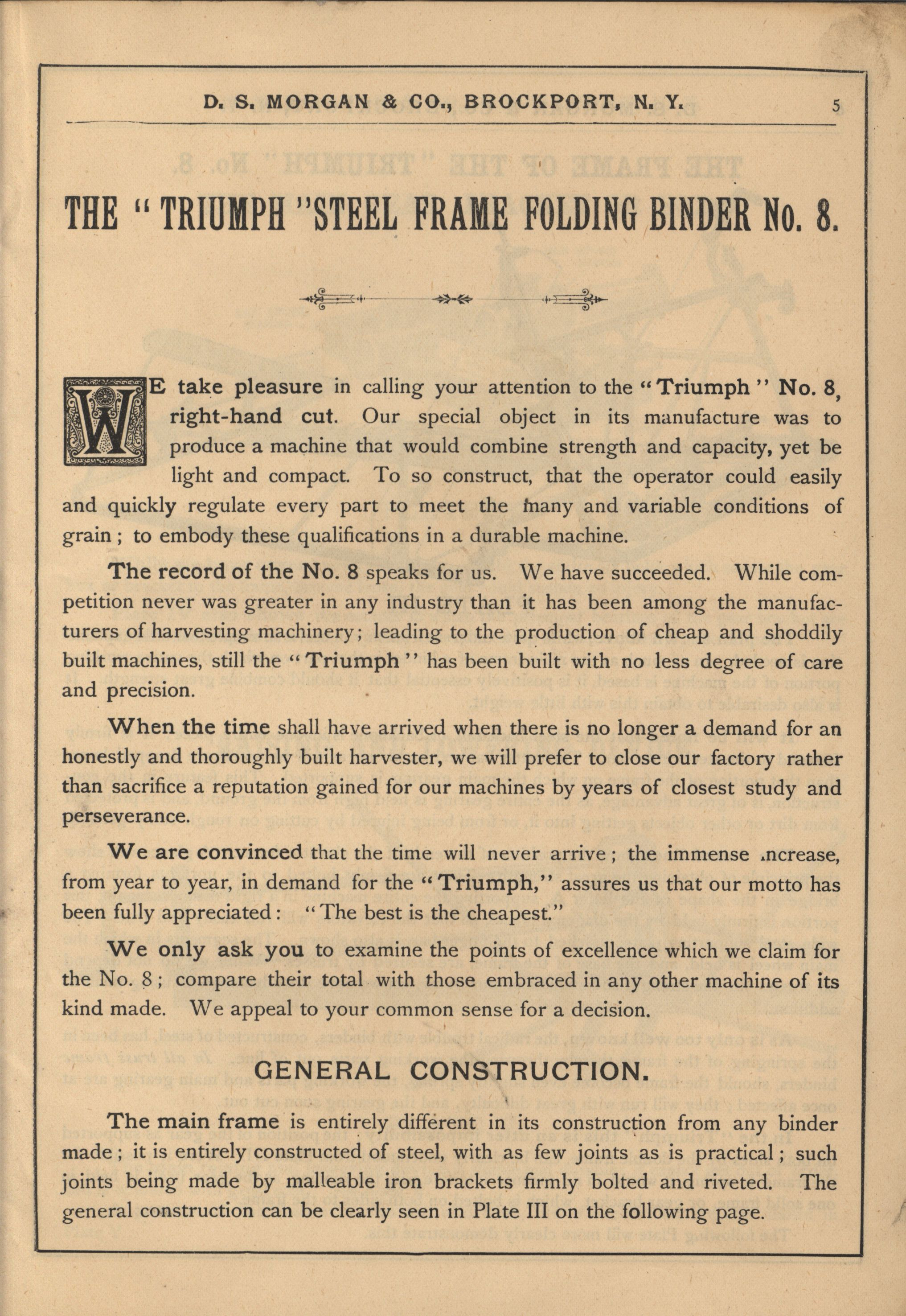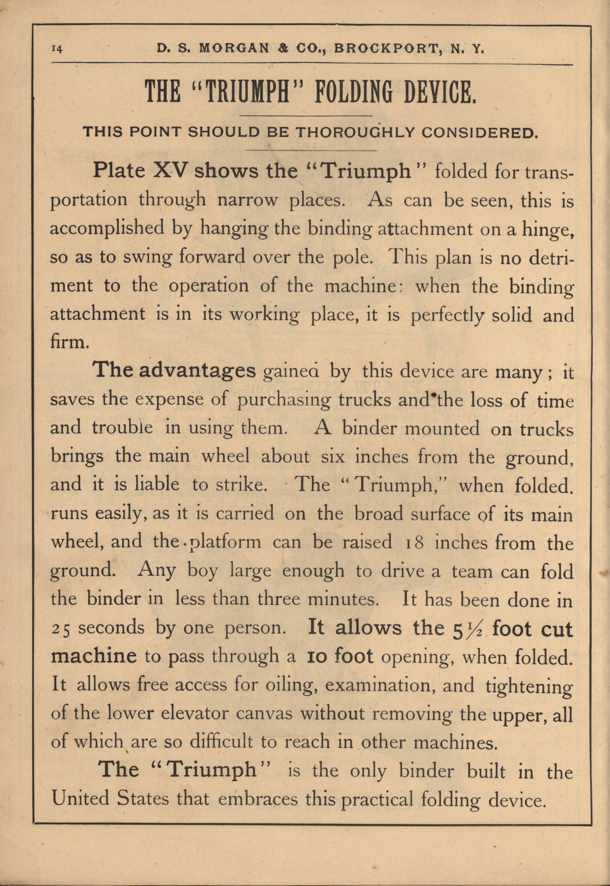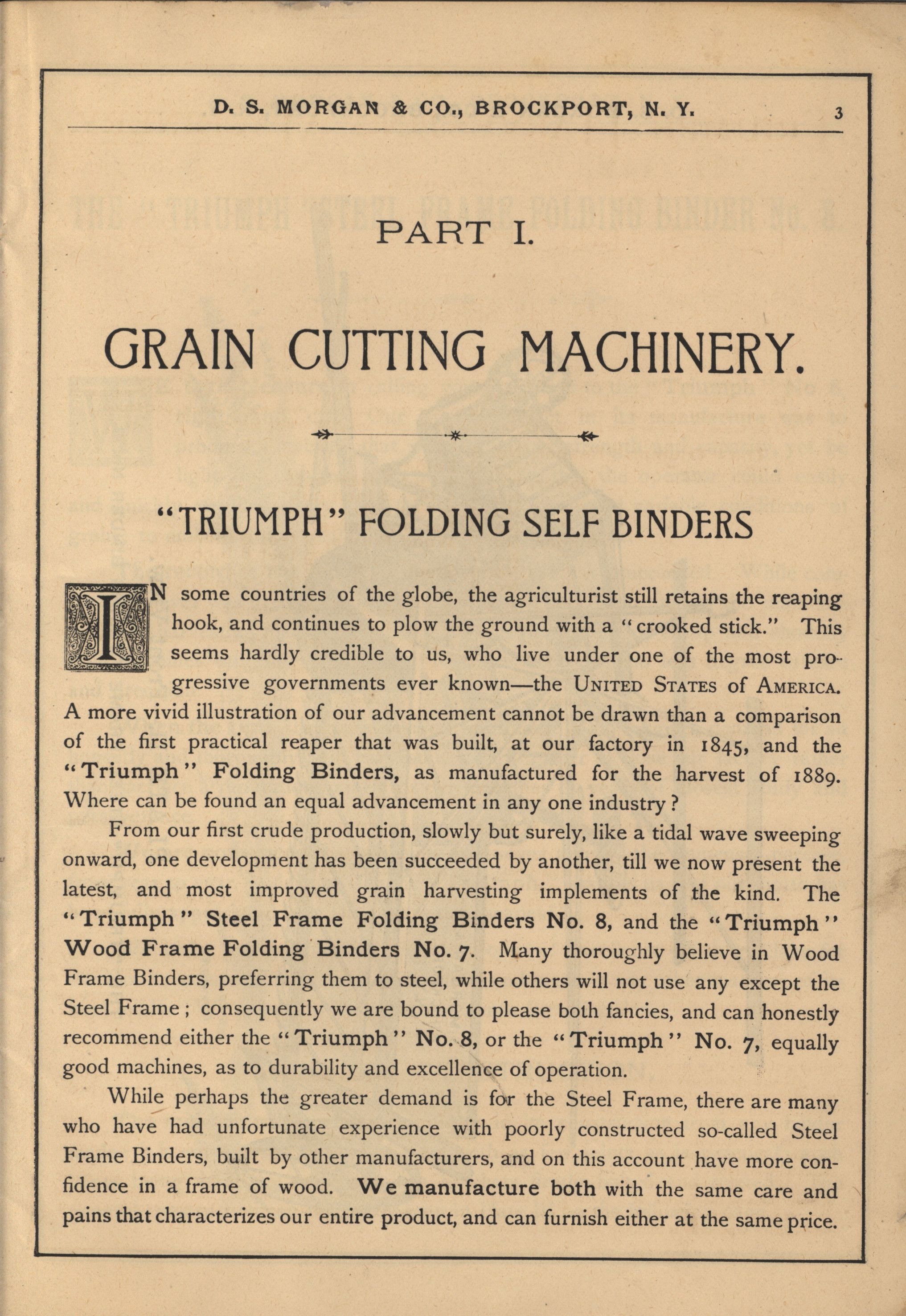 - Illustrated catalog describing the Triumph Harvesting Machinery product line offered by D. S. Morgan and Company in 1889.