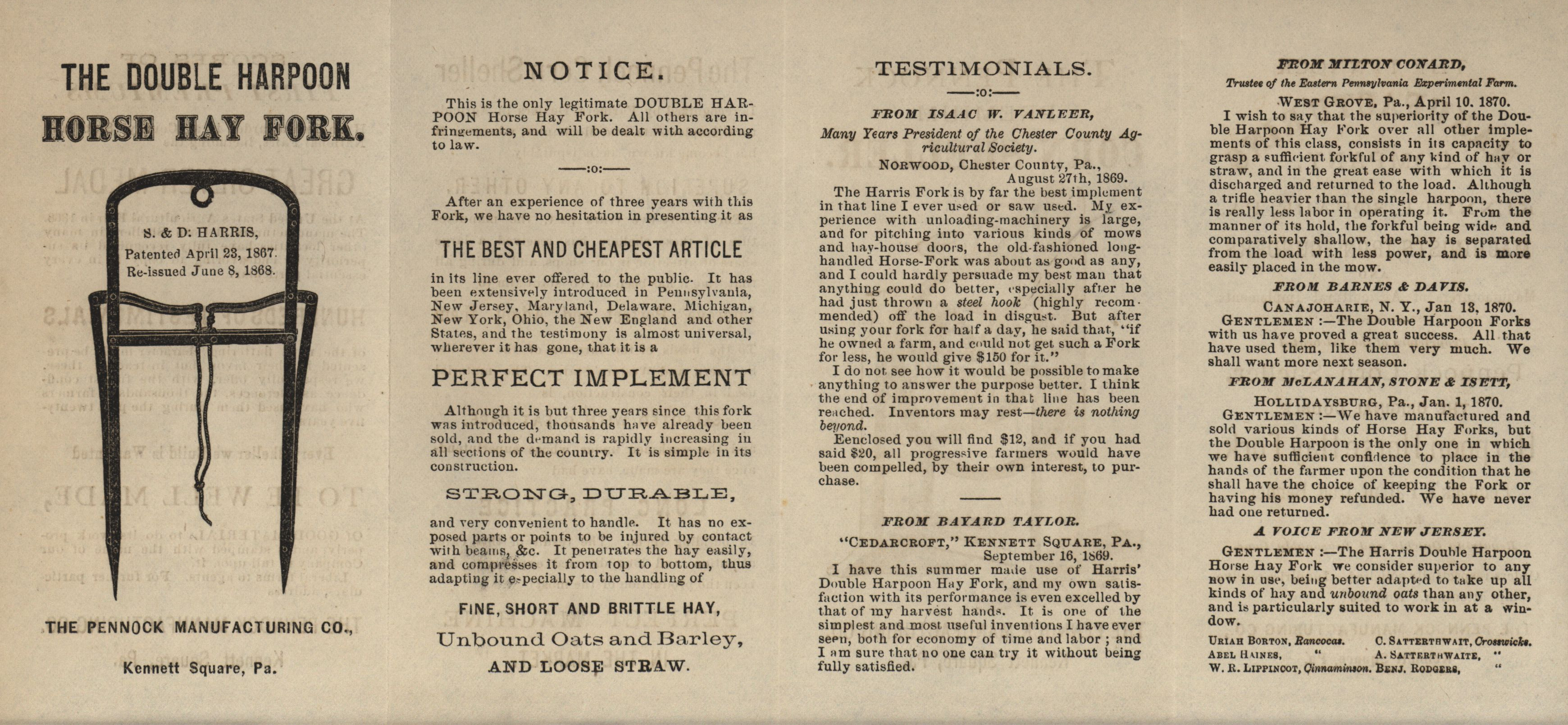 - Illustrated pamphlet advertising "The Double Harpoon Horse Hook" offered by the Pennock Manufacturing Company.