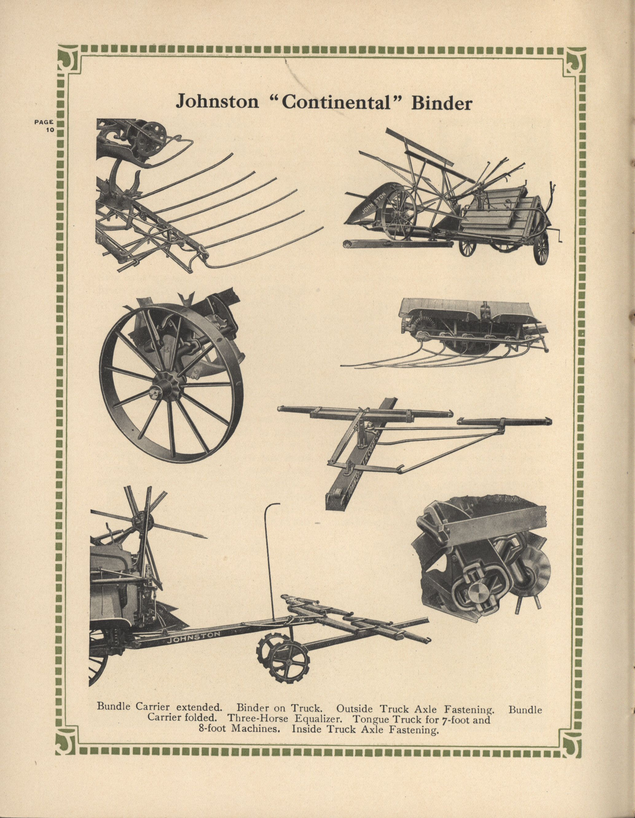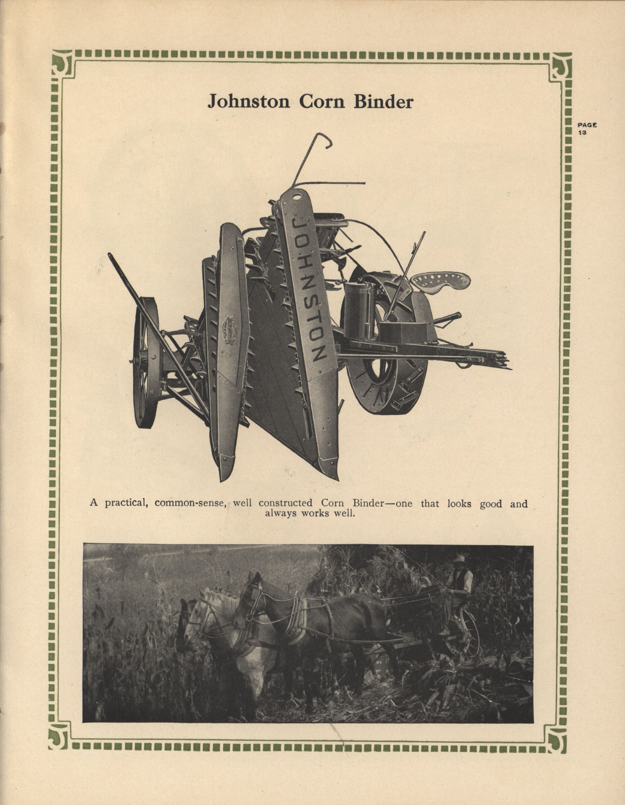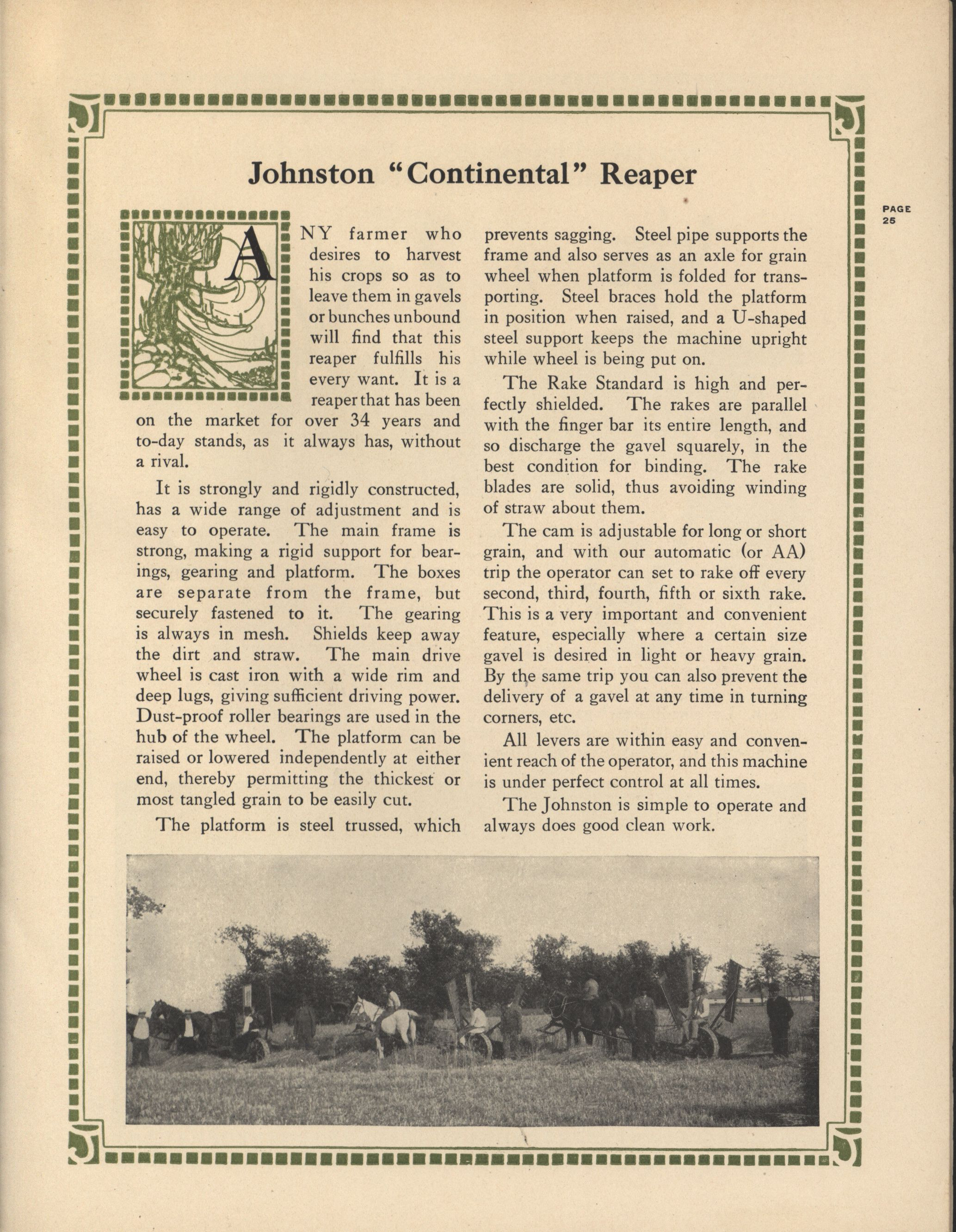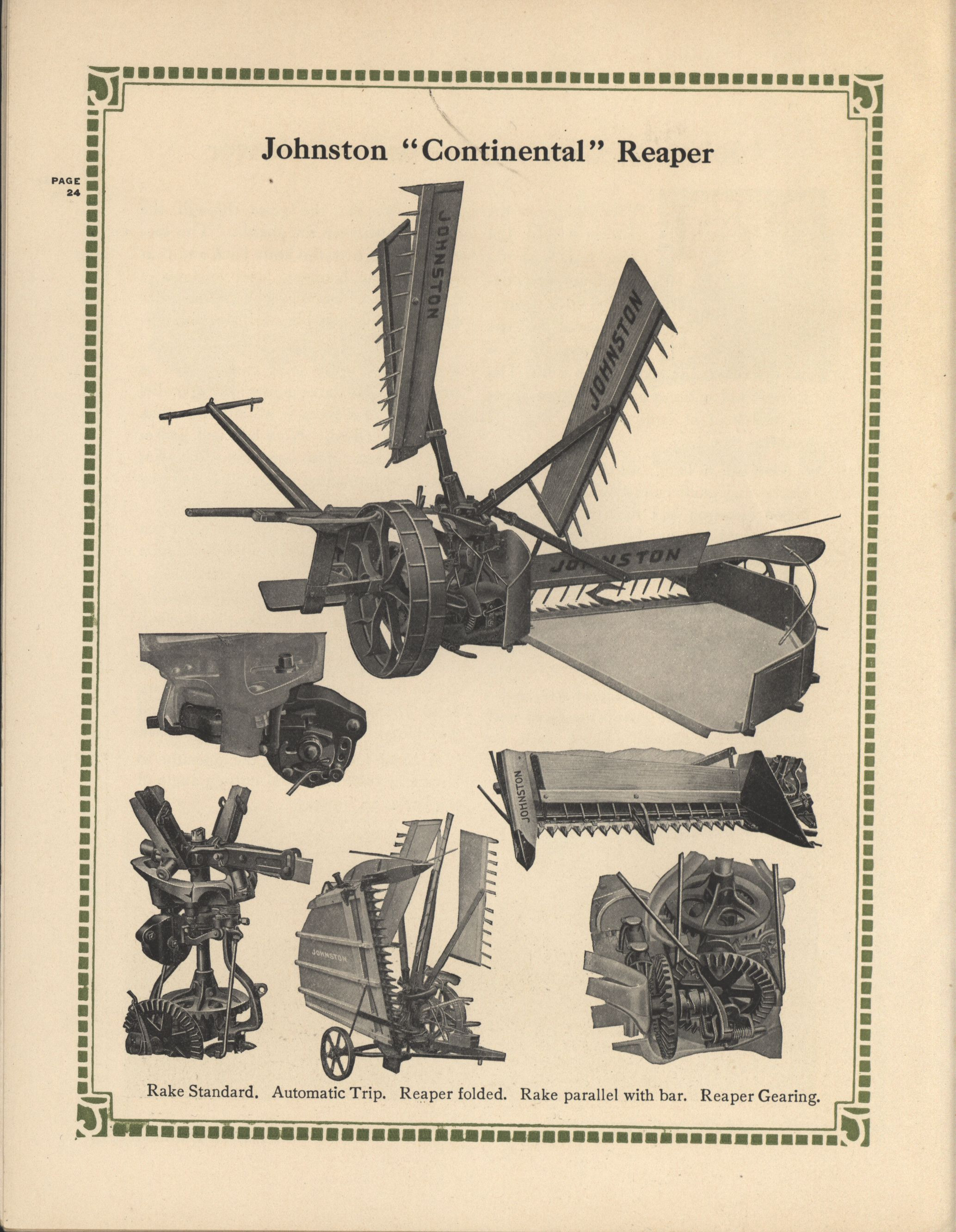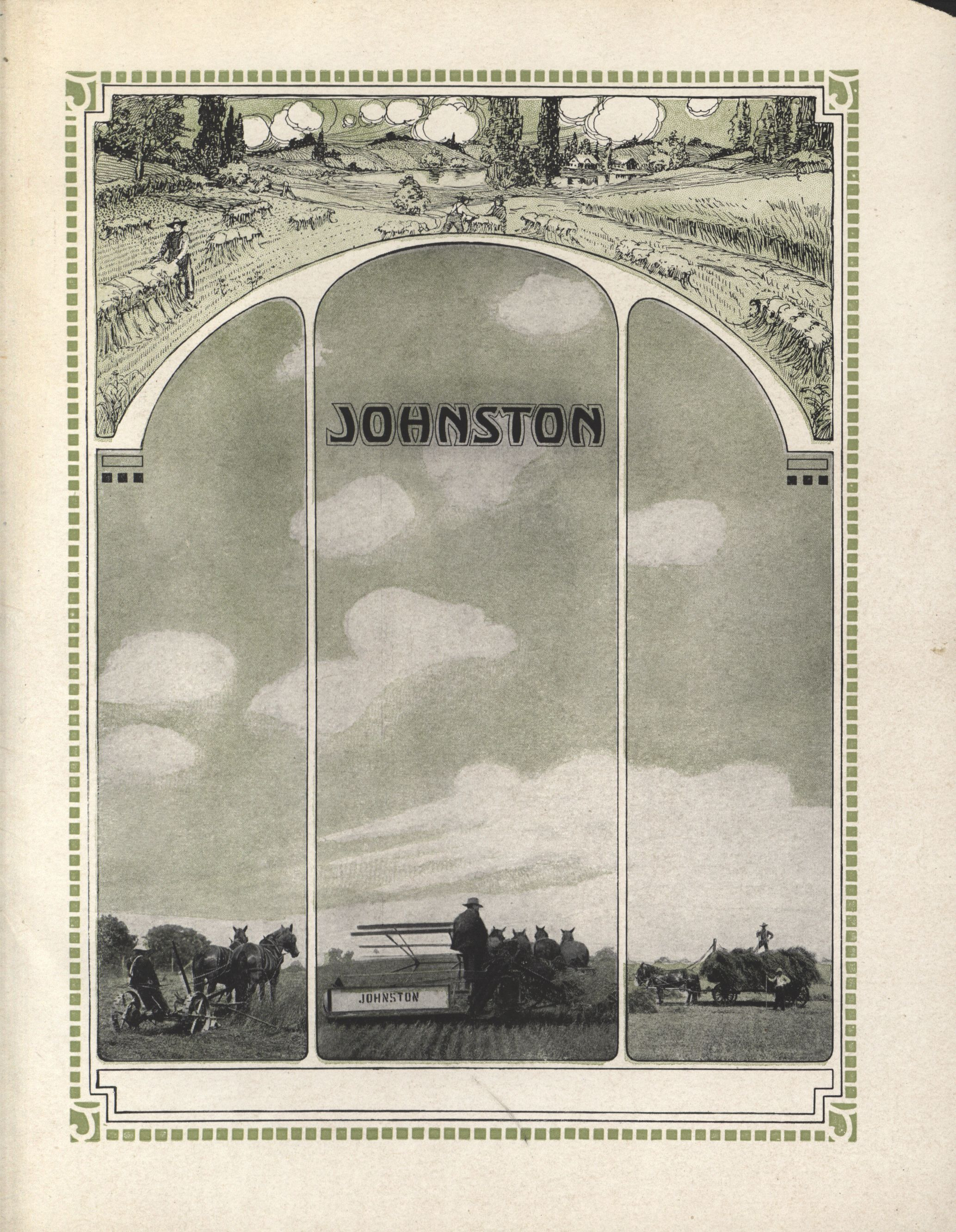 - Illustrated catalog describing the farm machinery offered by Johnston Harvester Company.