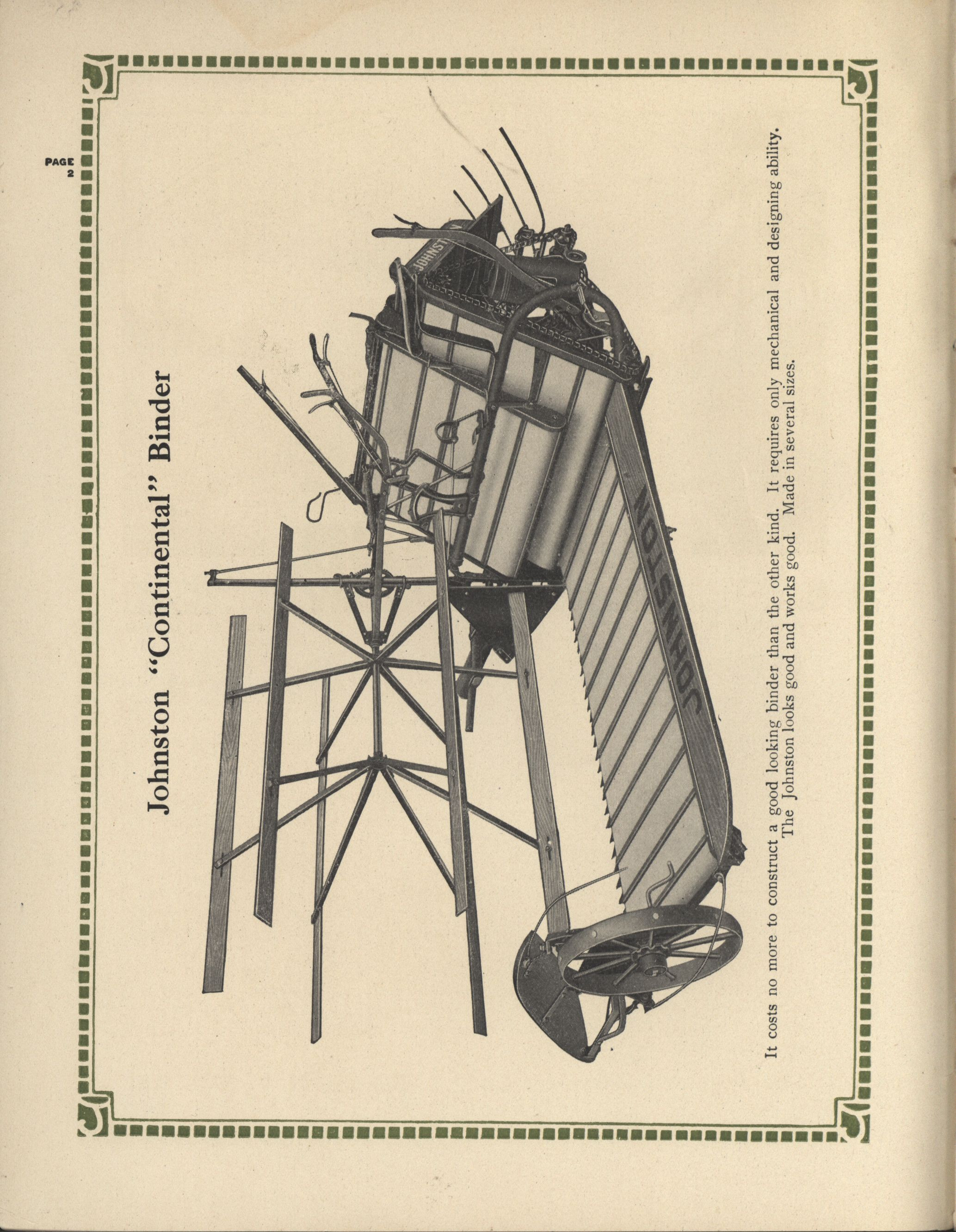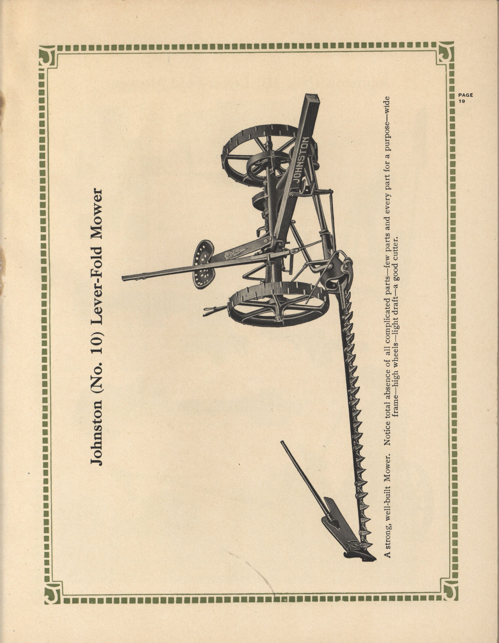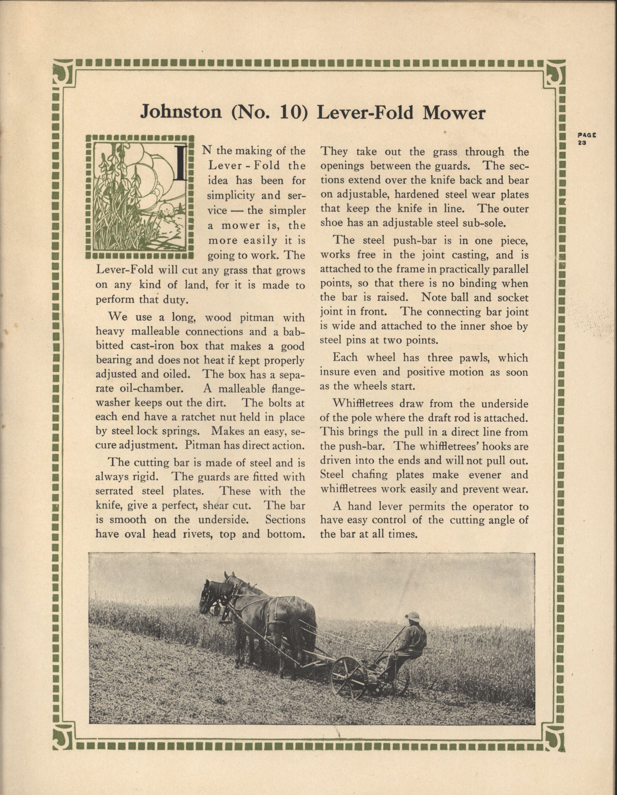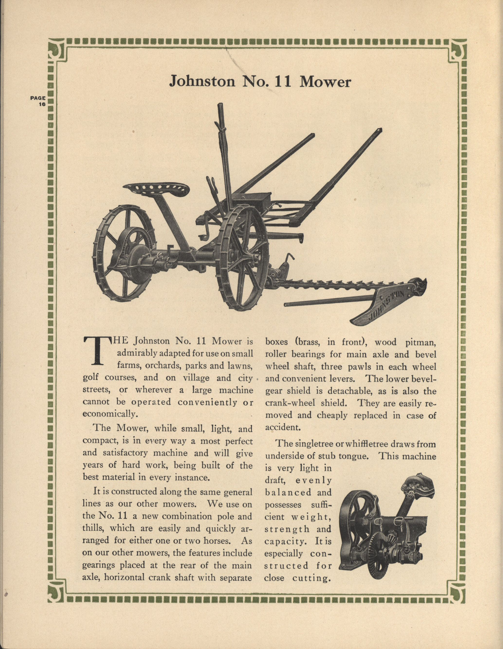 - Illustrated catalog describing the farm machinery offered by Johnston Harvester Company.