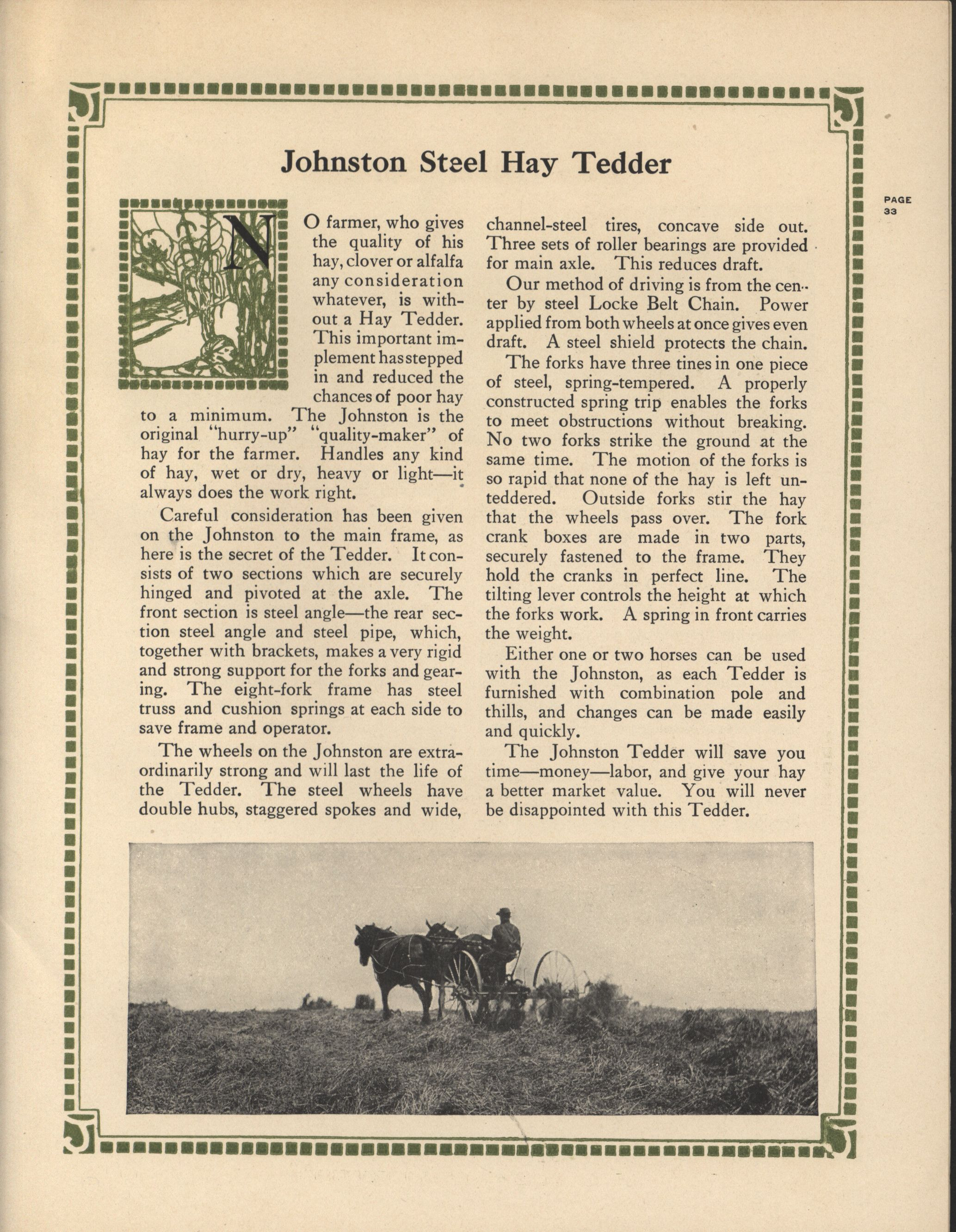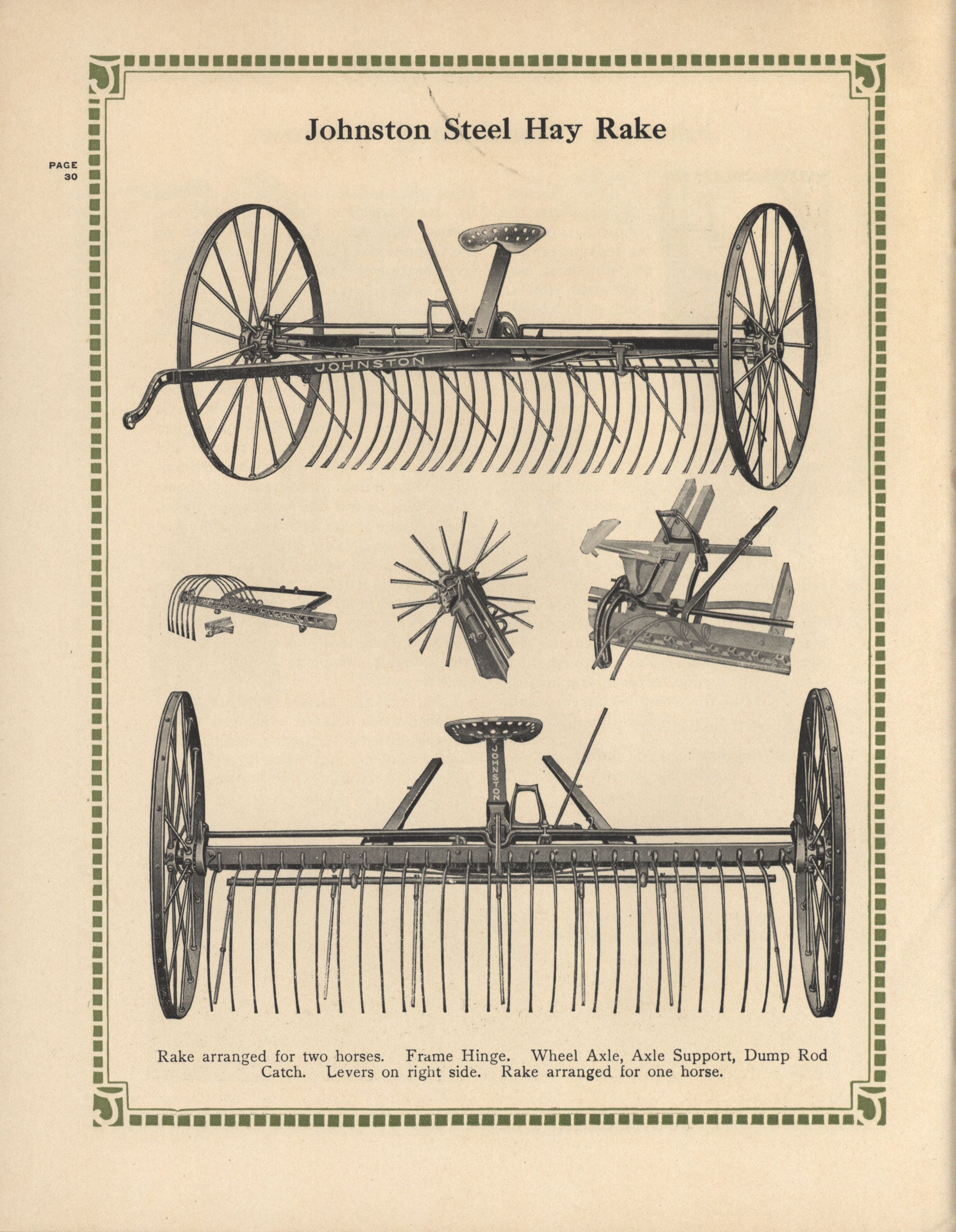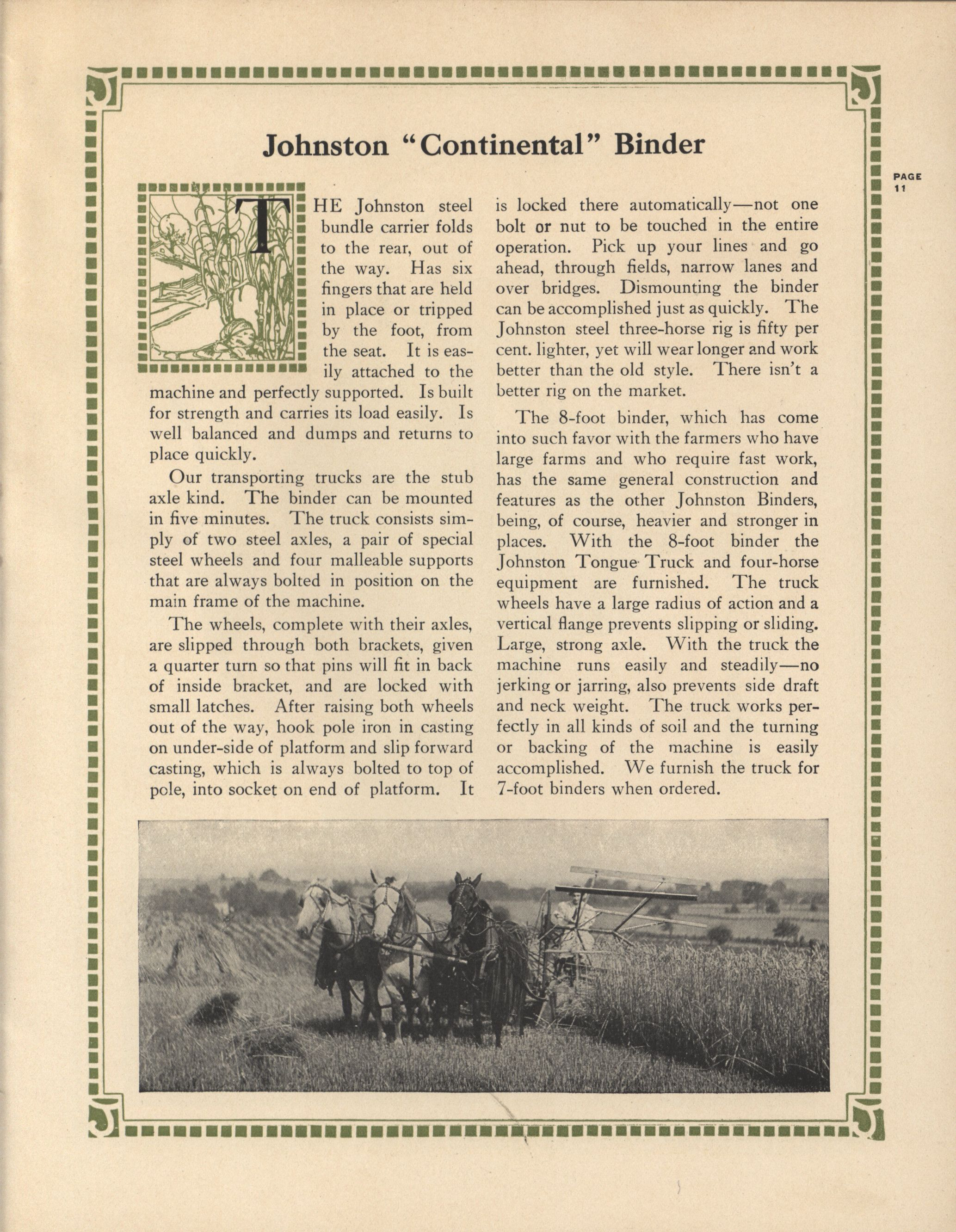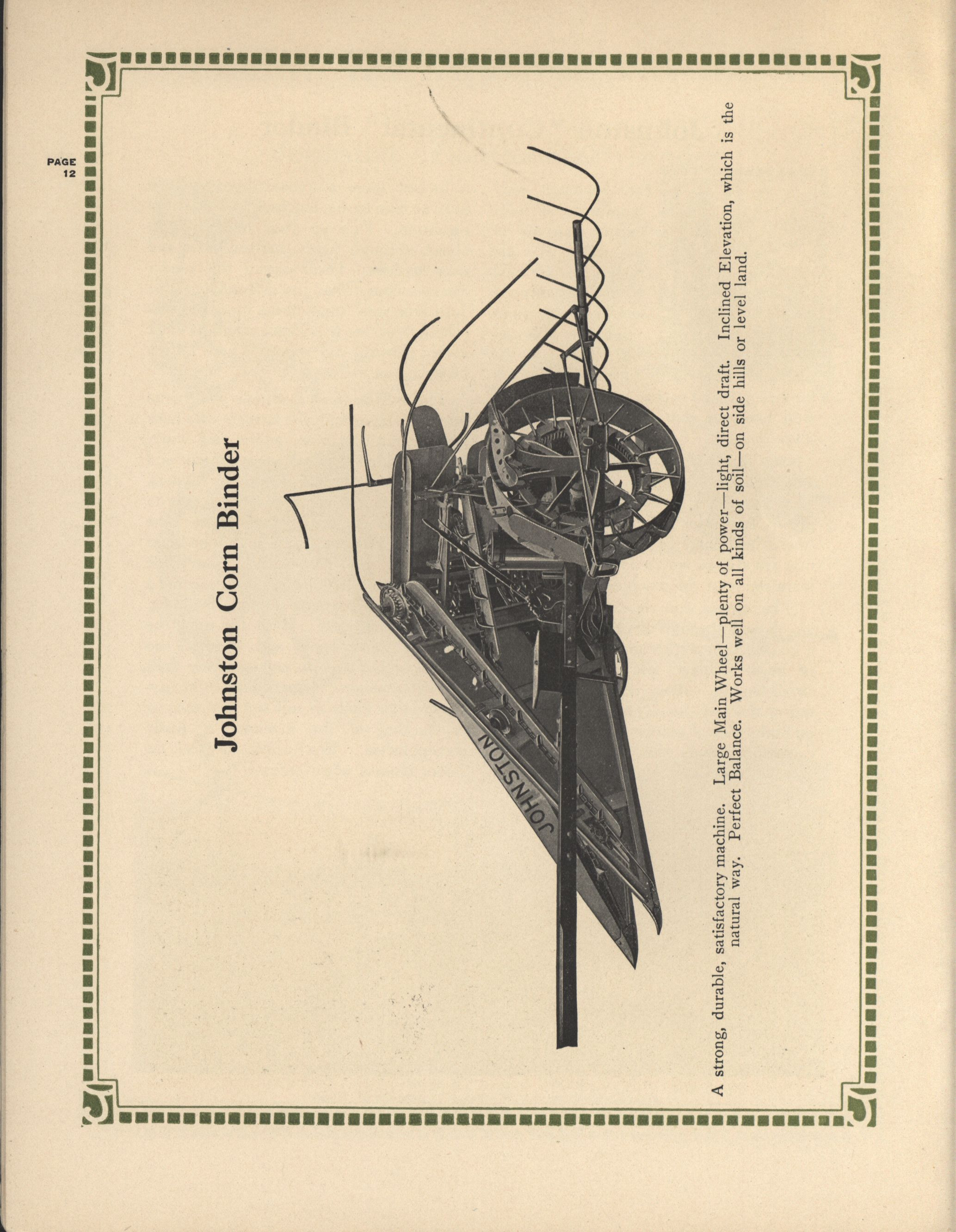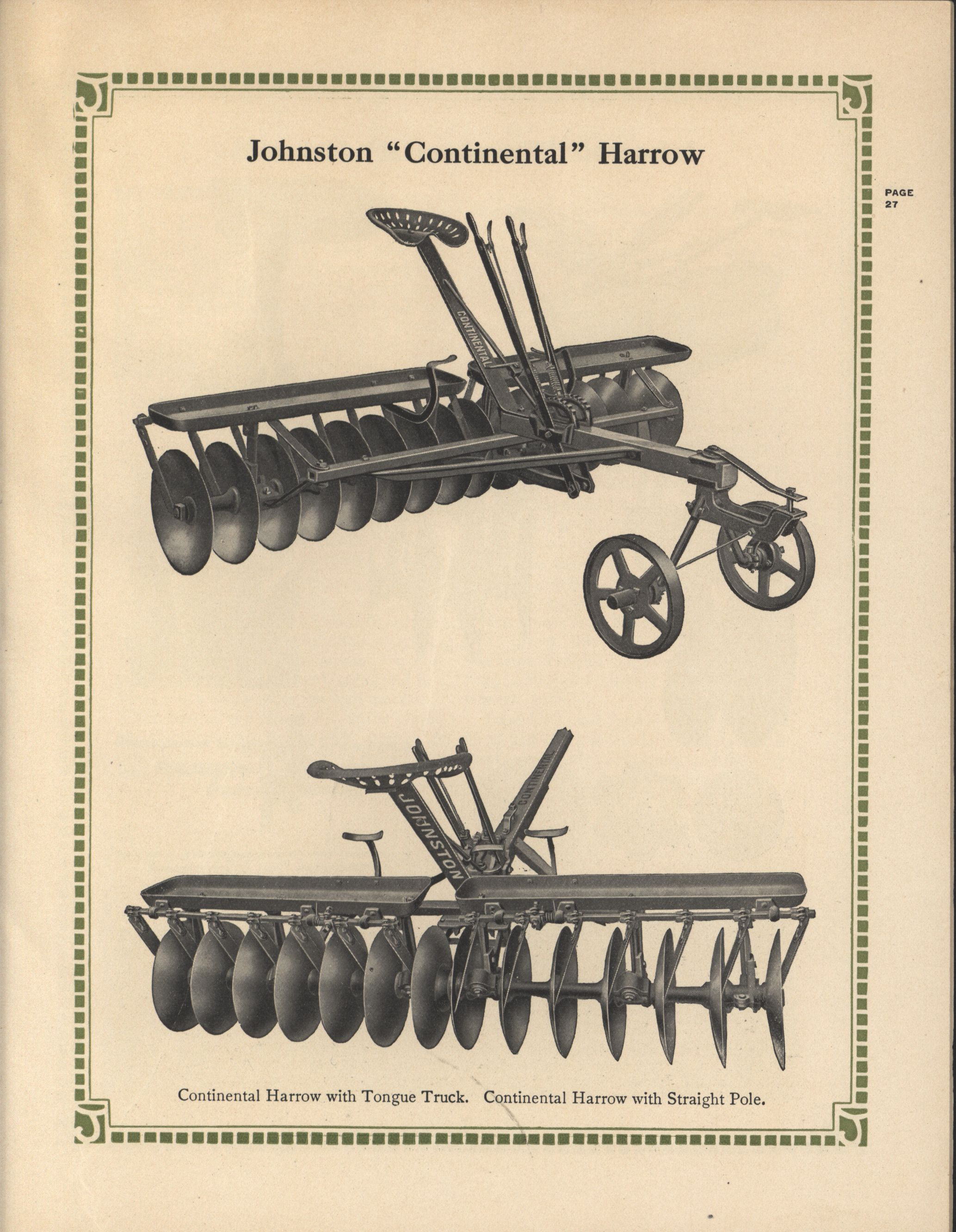 - Illustrated catalog describing the farm machinery offered by Johnston Harvester Company.