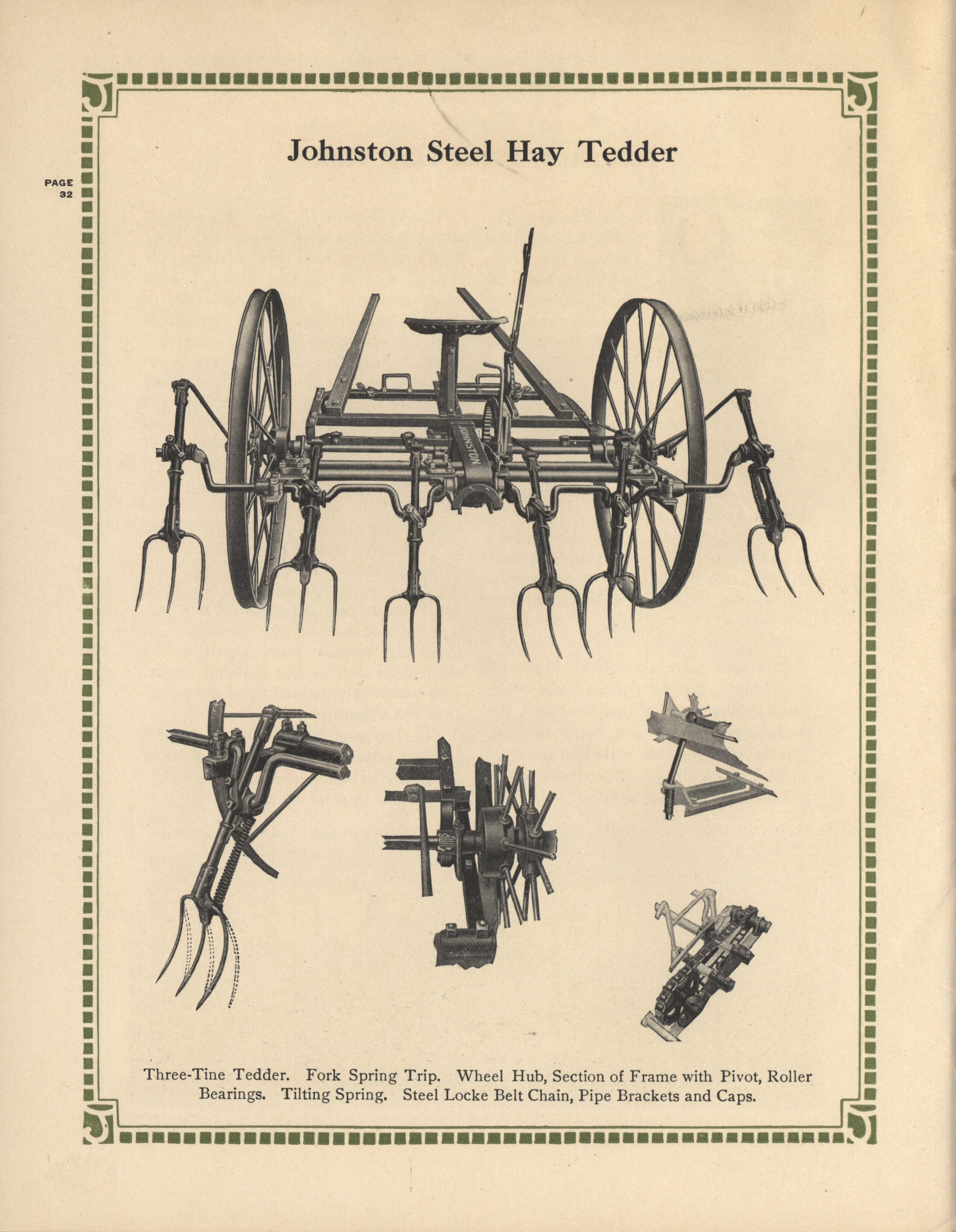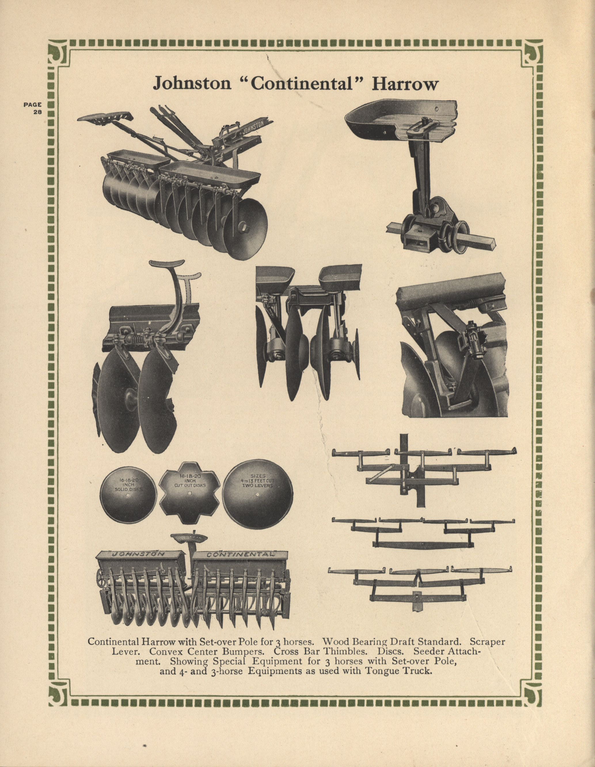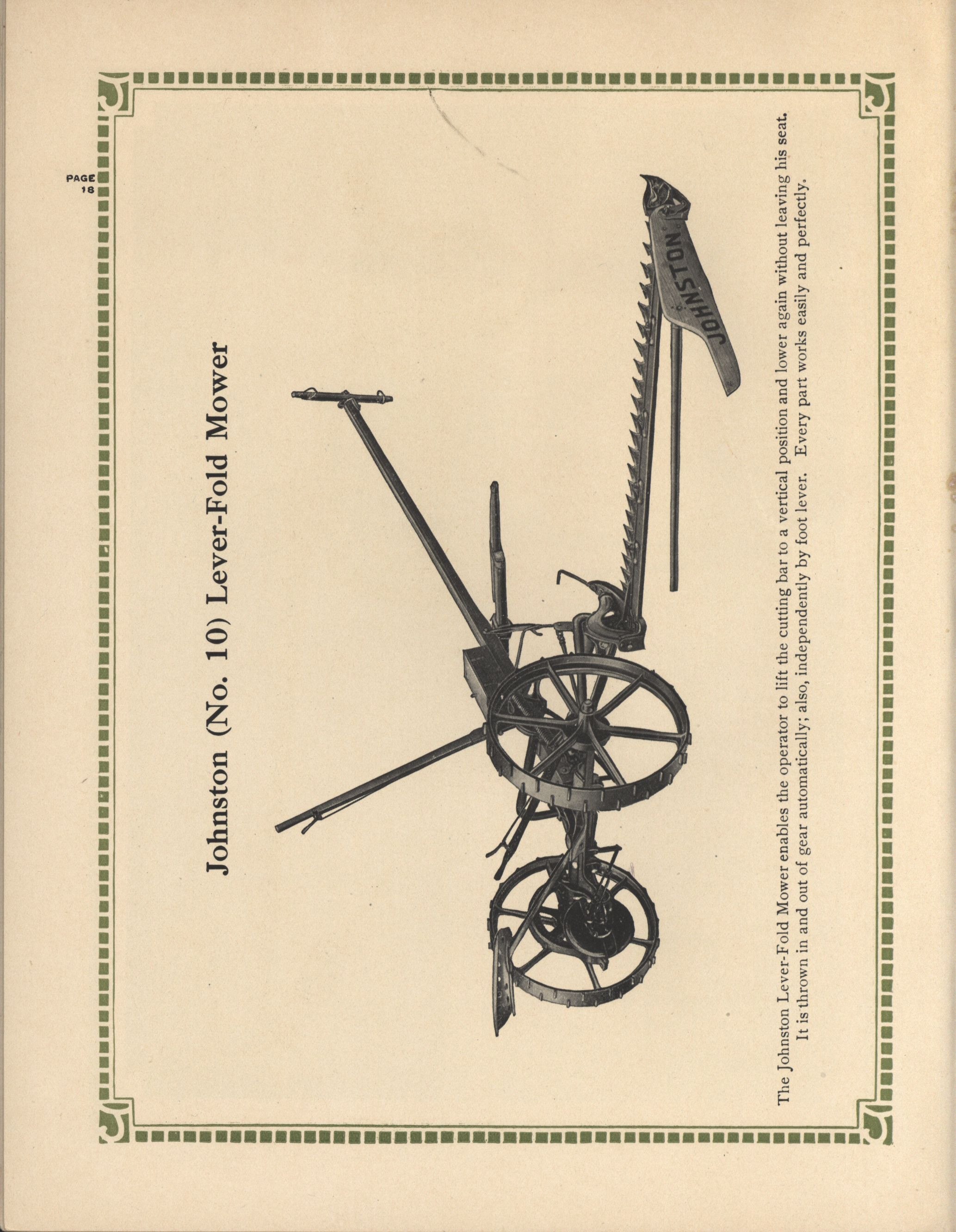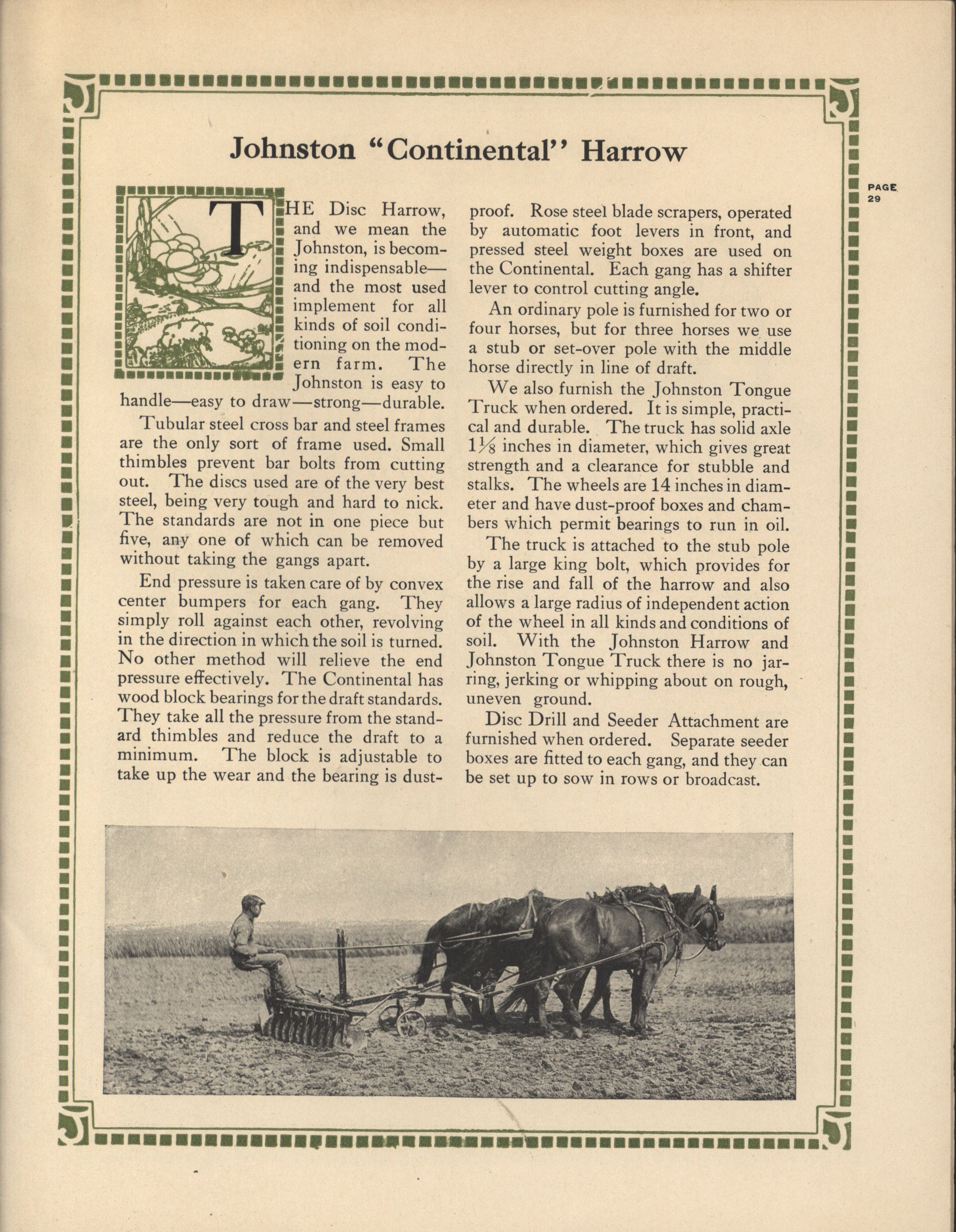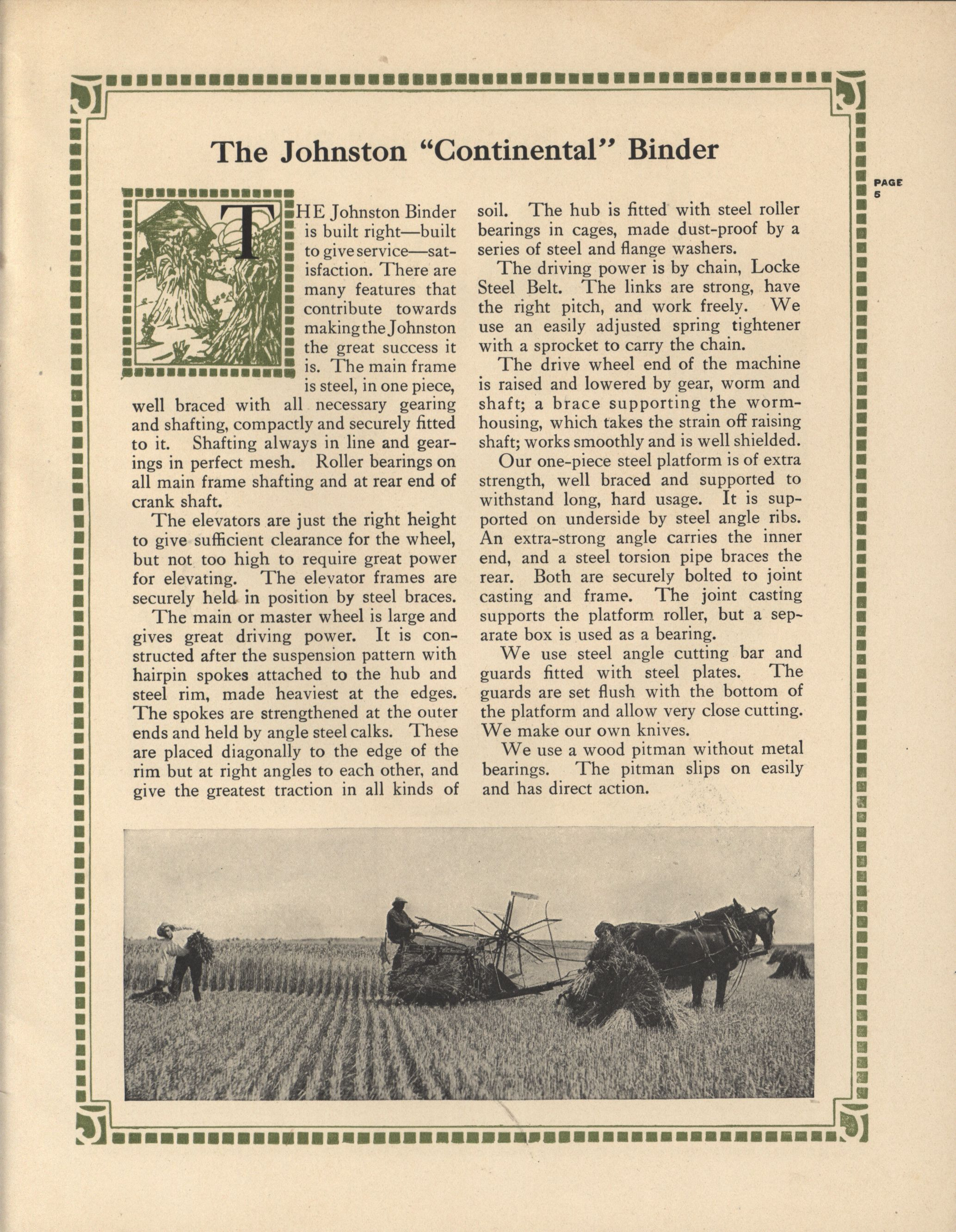 - Illustrated catalog describing the farm machinery offered by Johnston Harvester Company.