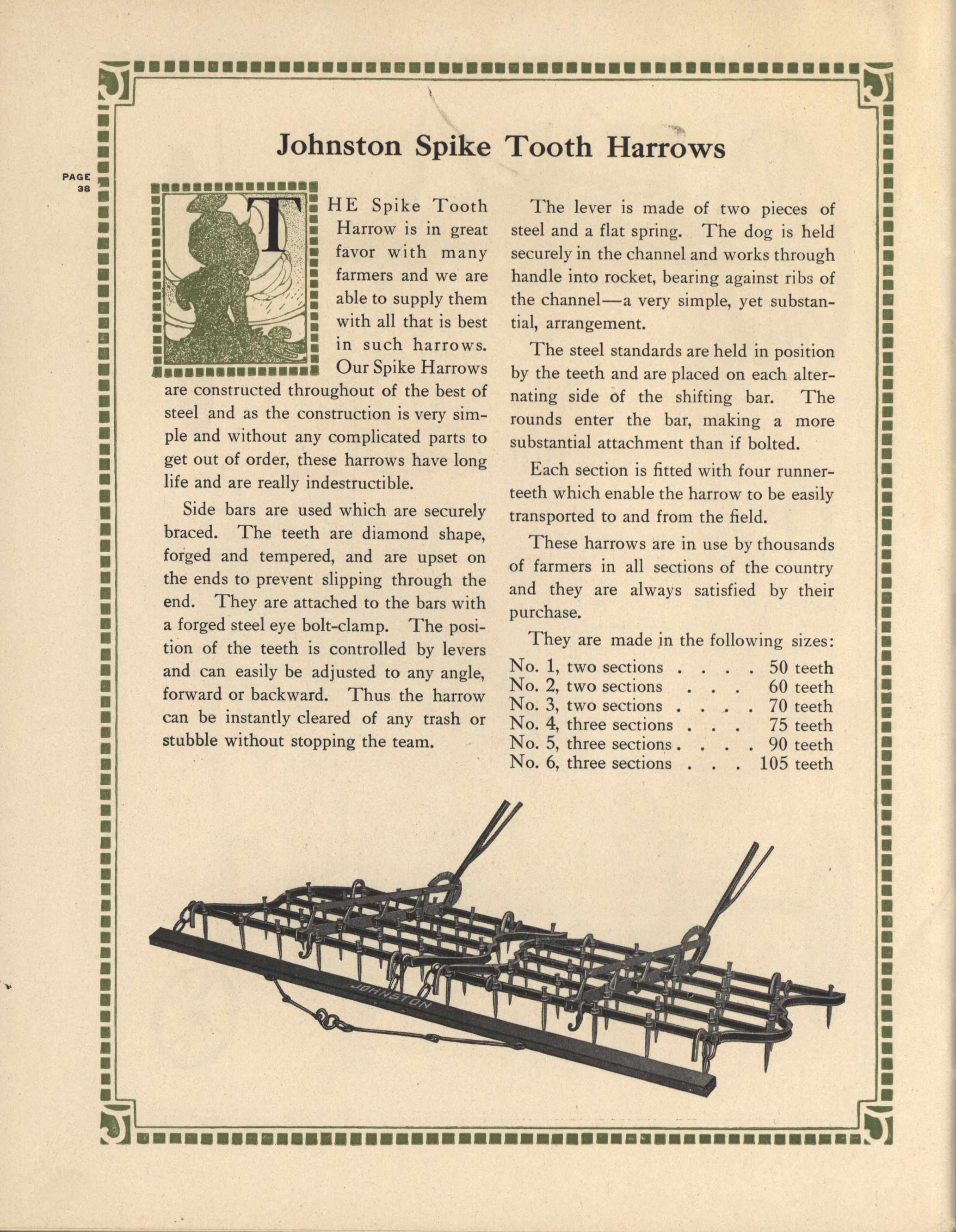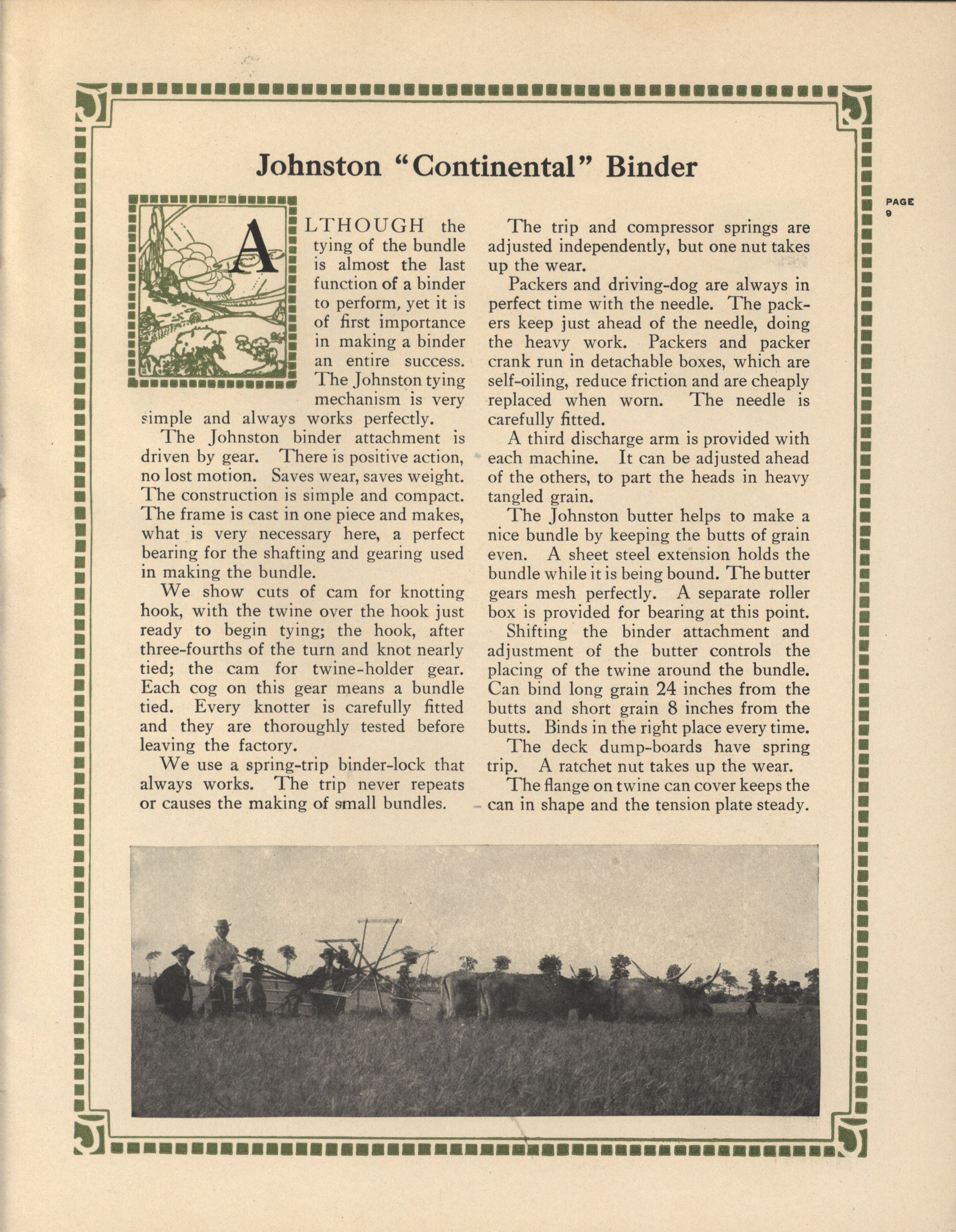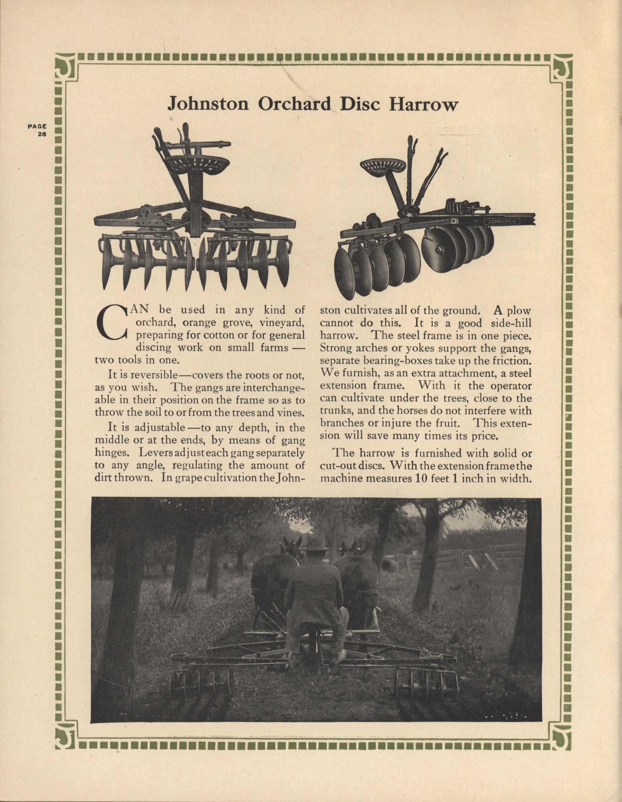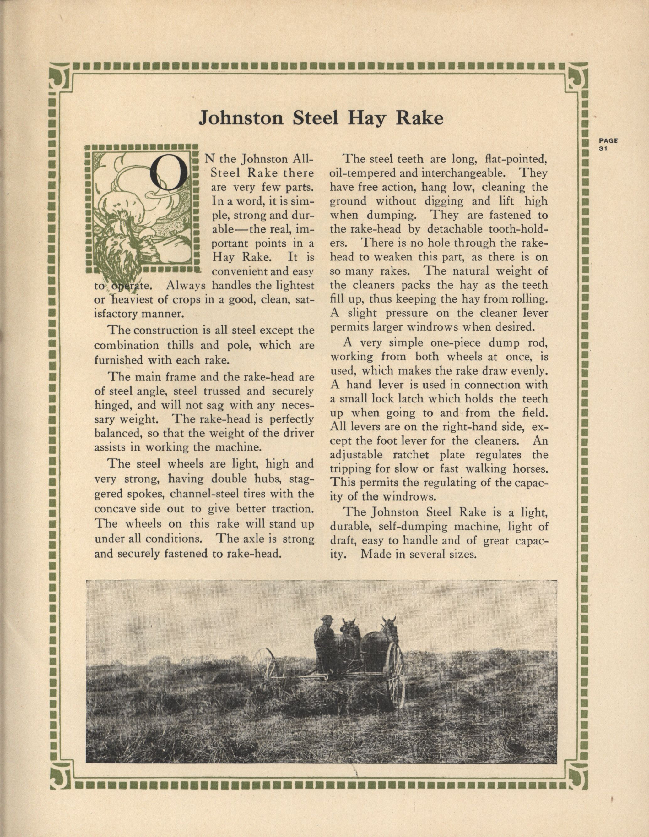 - Illustrated catalog describing the farm machinery offered by Johnston Harvester Company.