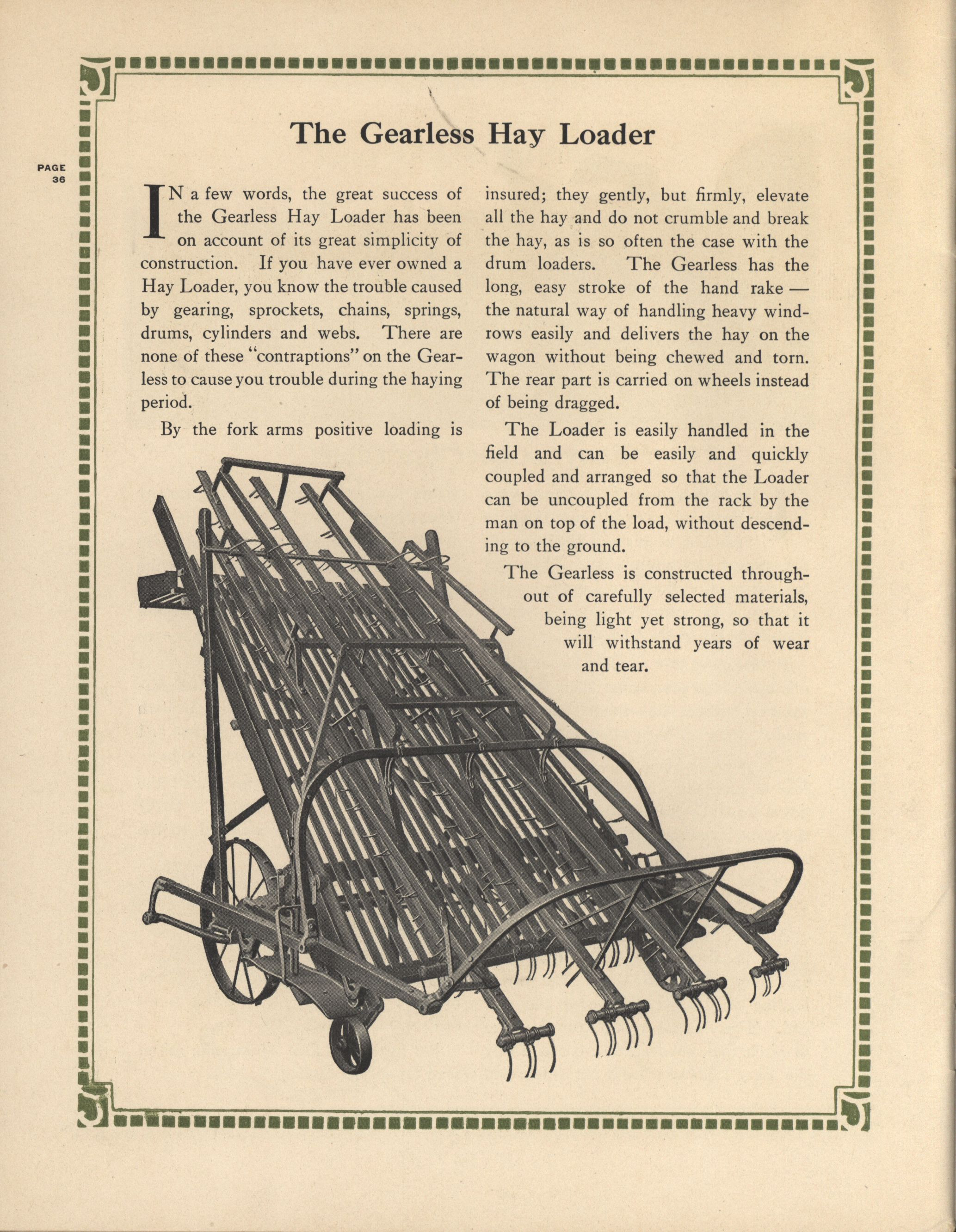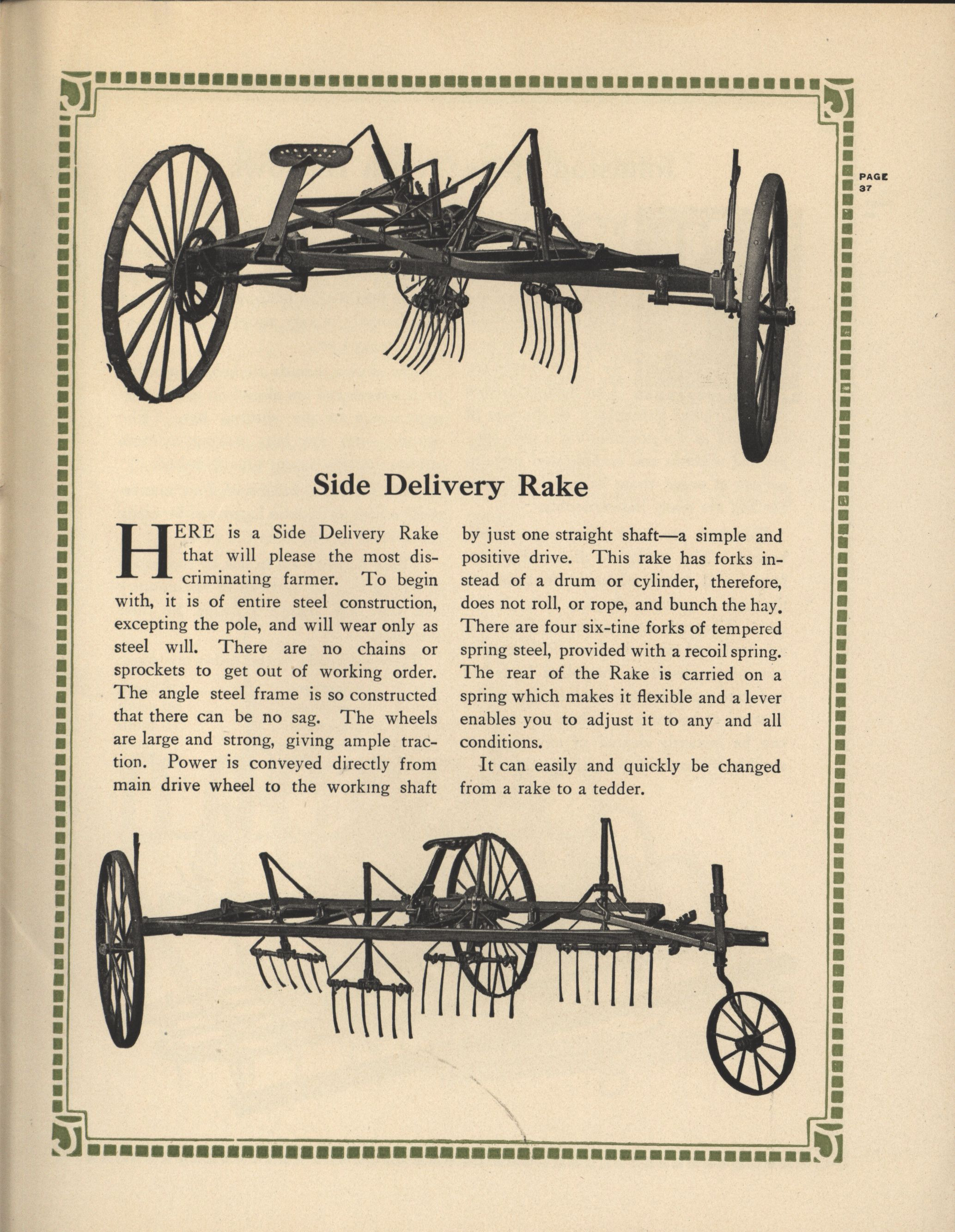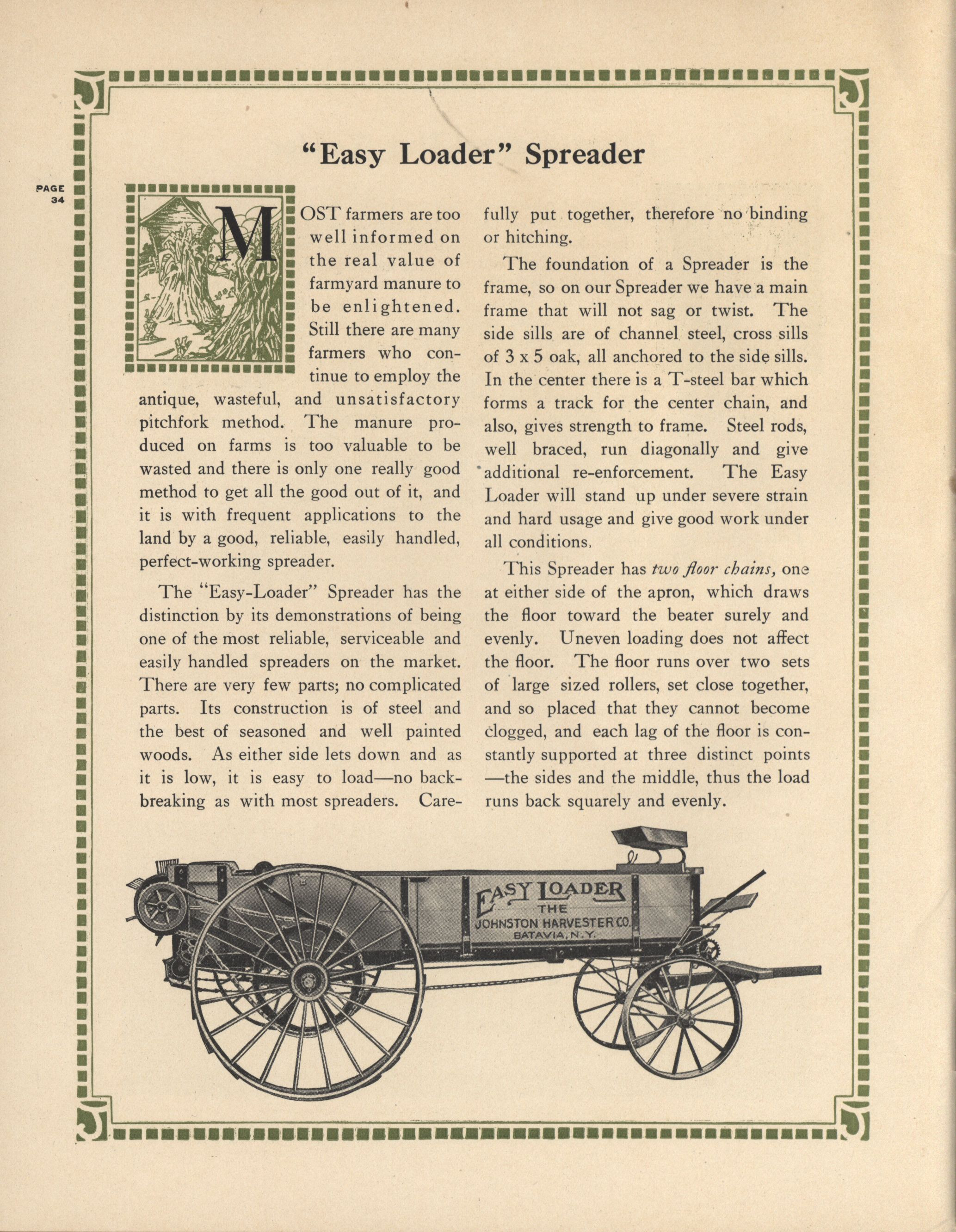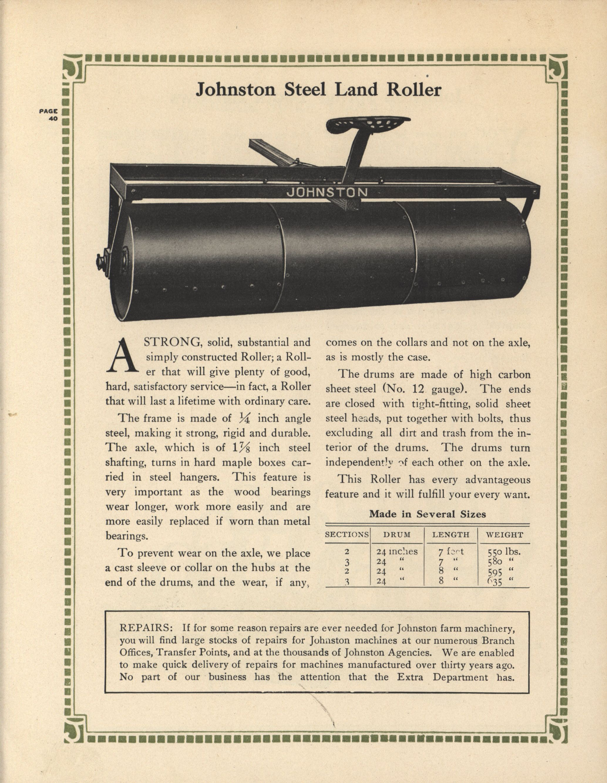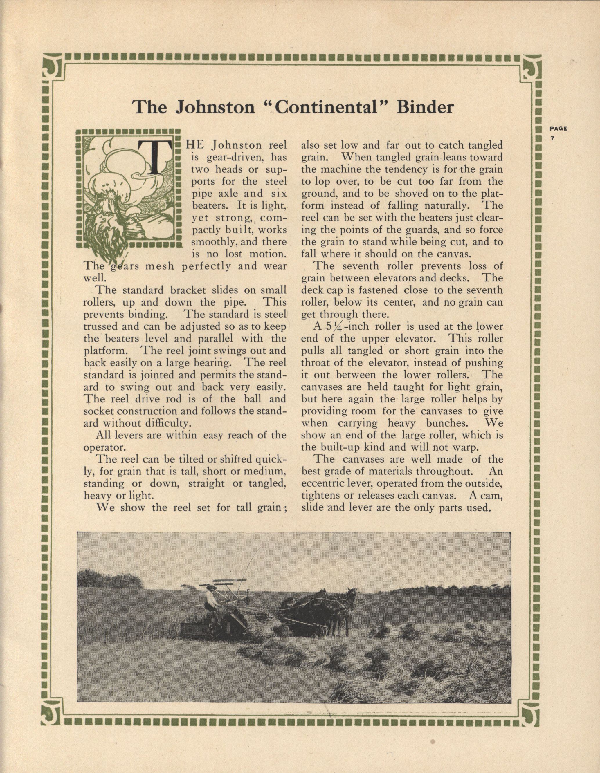 - Illustrated catalog describing the farm machinery offered by Johnston Harvester Company.