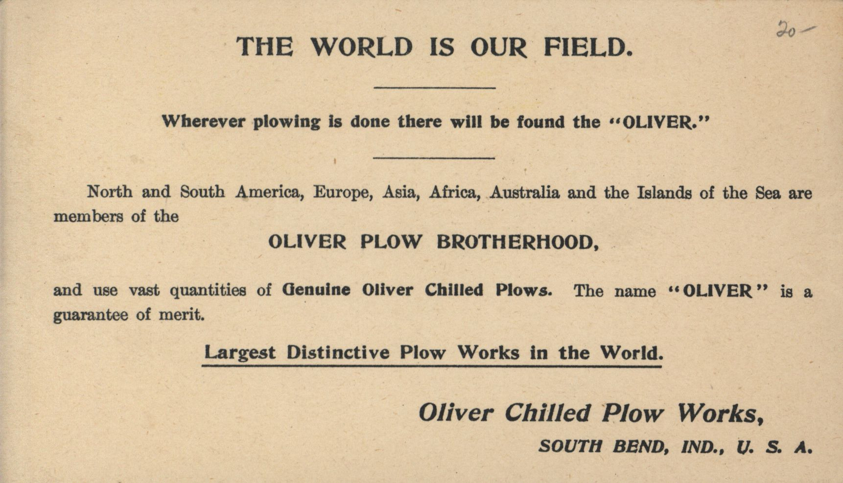 - "Oliver Chilled Plow Works advertisement card", Agricultural Machinery Literature Collection, Iowa State University Library Digital Collections