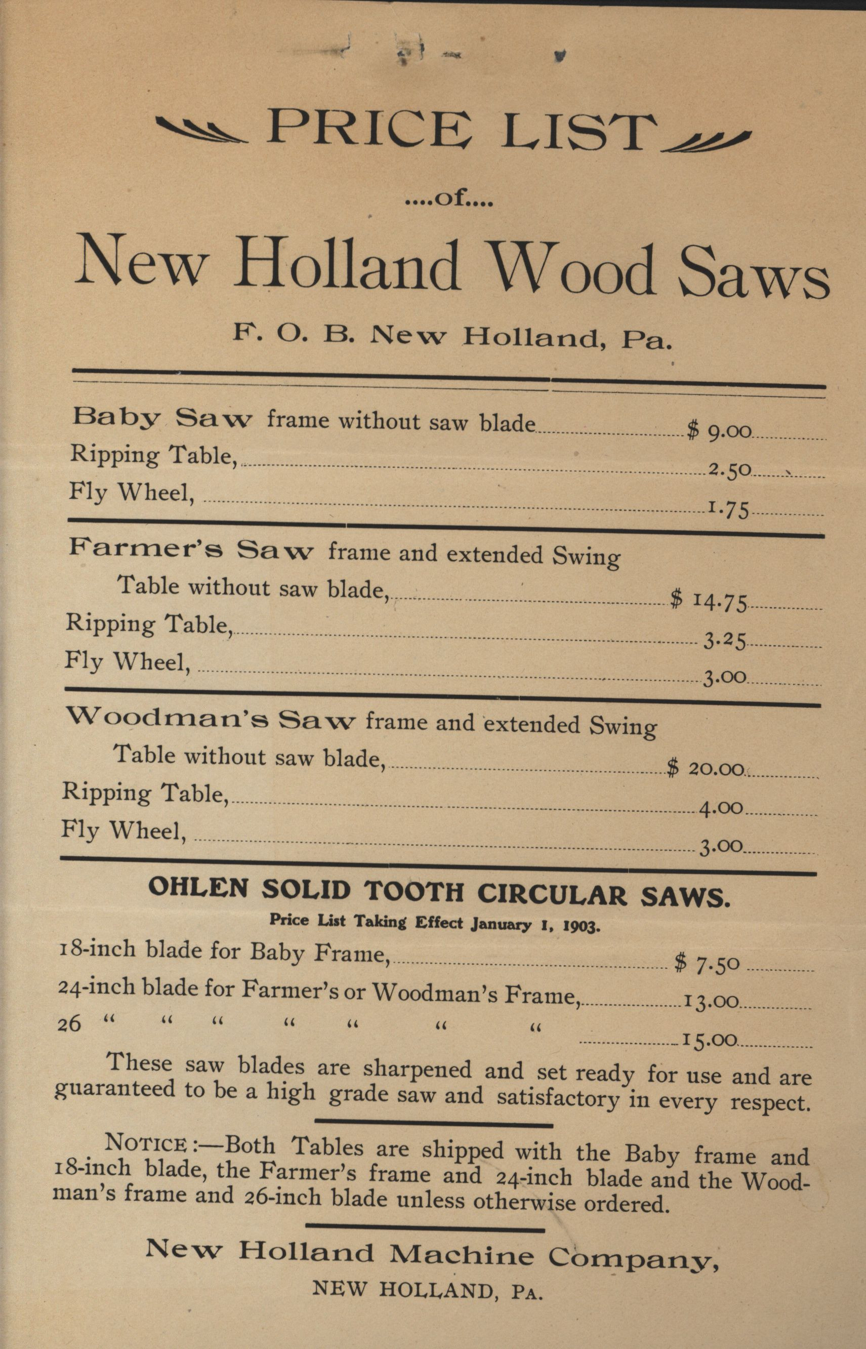 - Price list for the feed mills and parts offered by New Holland Manufacturing Company.