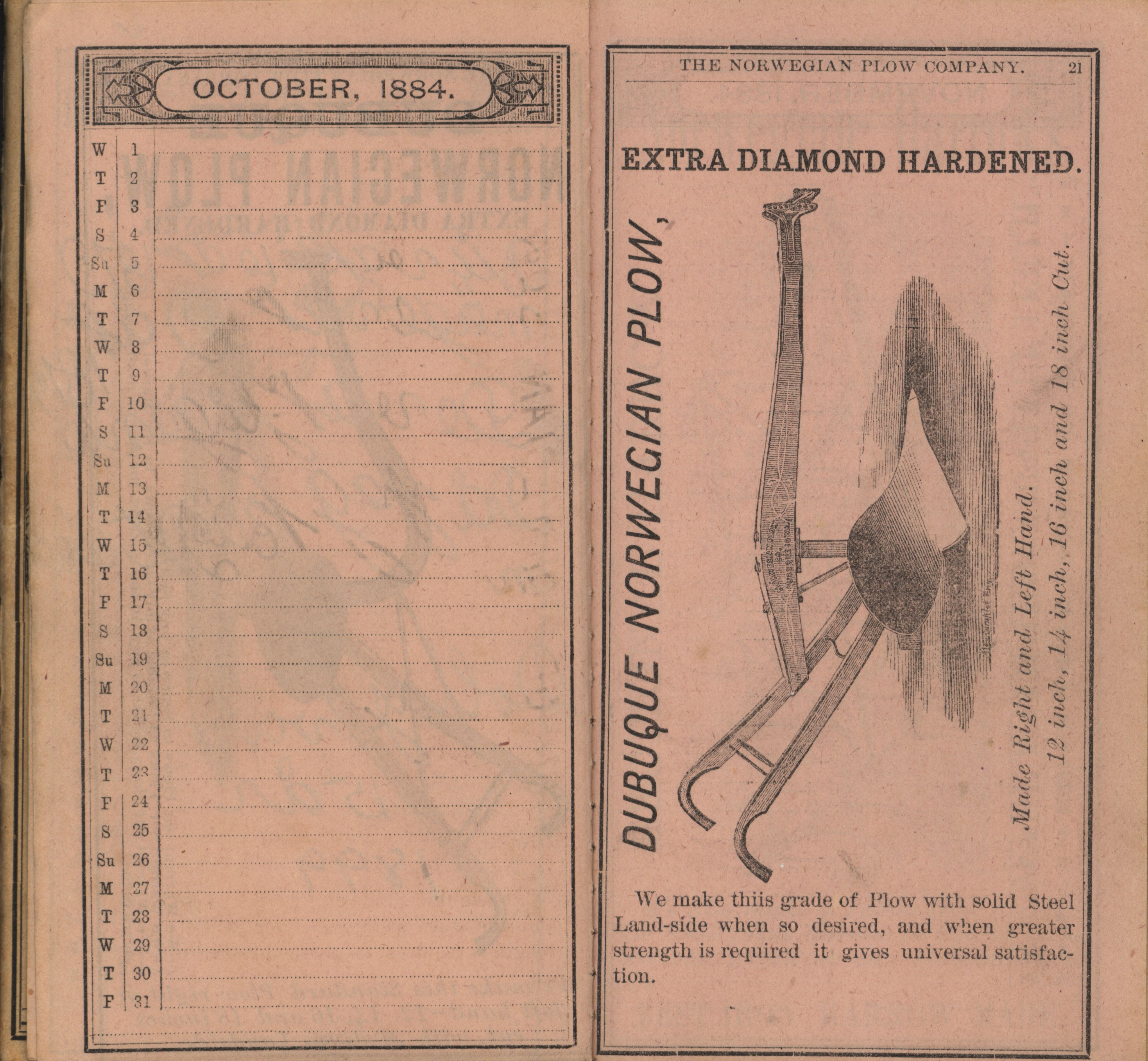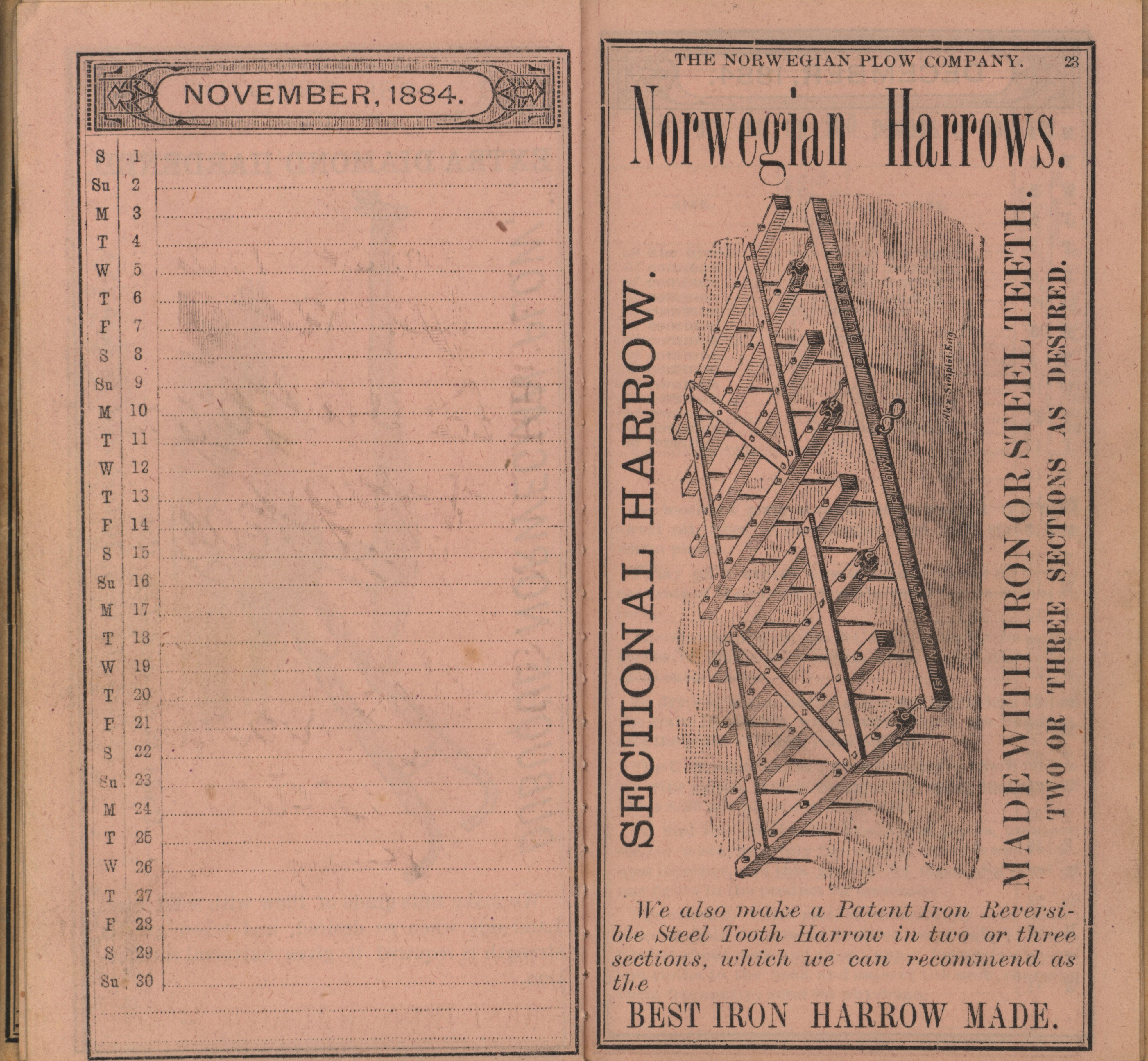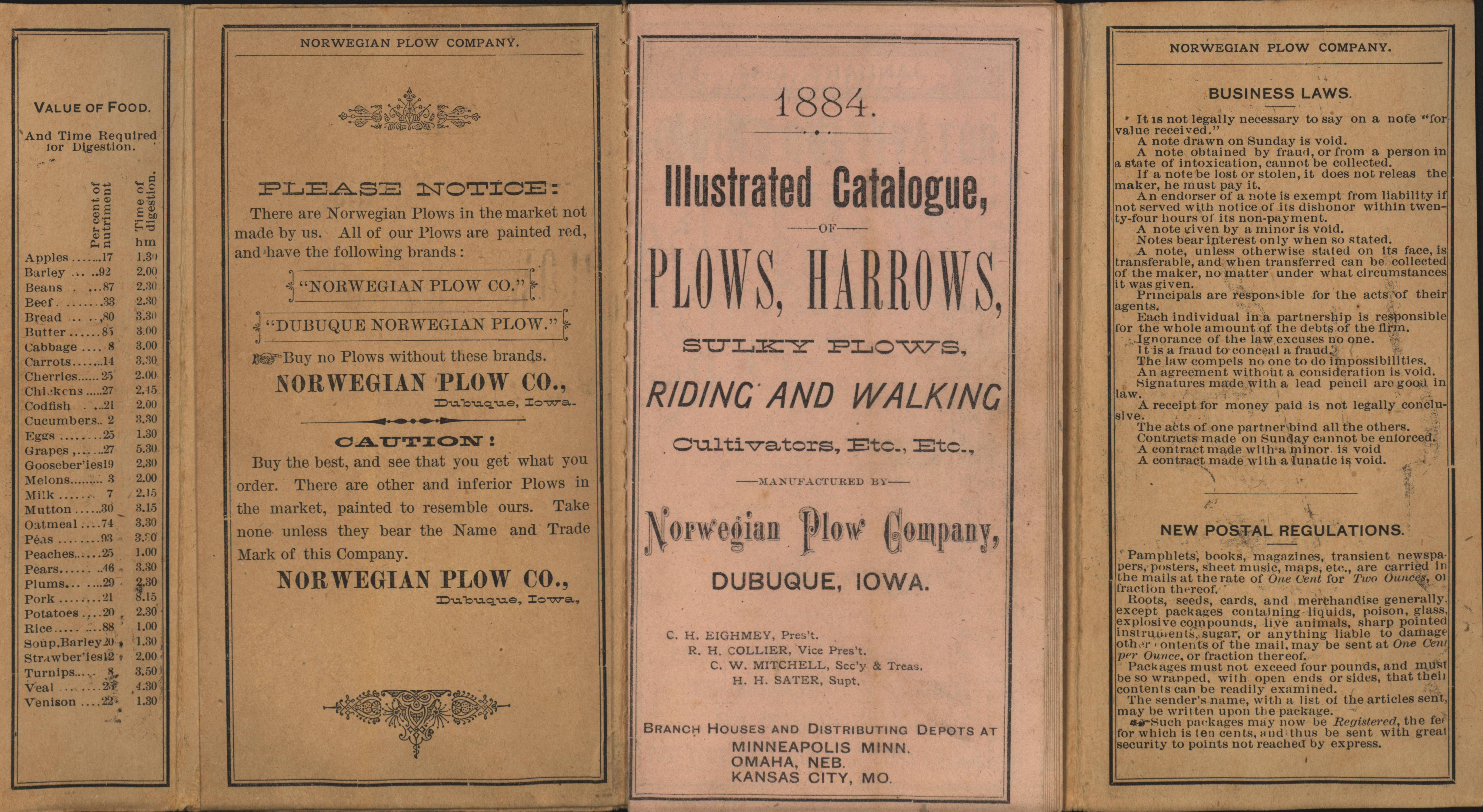 - Illustrated catalog describing the agricultural works offered by Norwegian Plow Company in 1884.