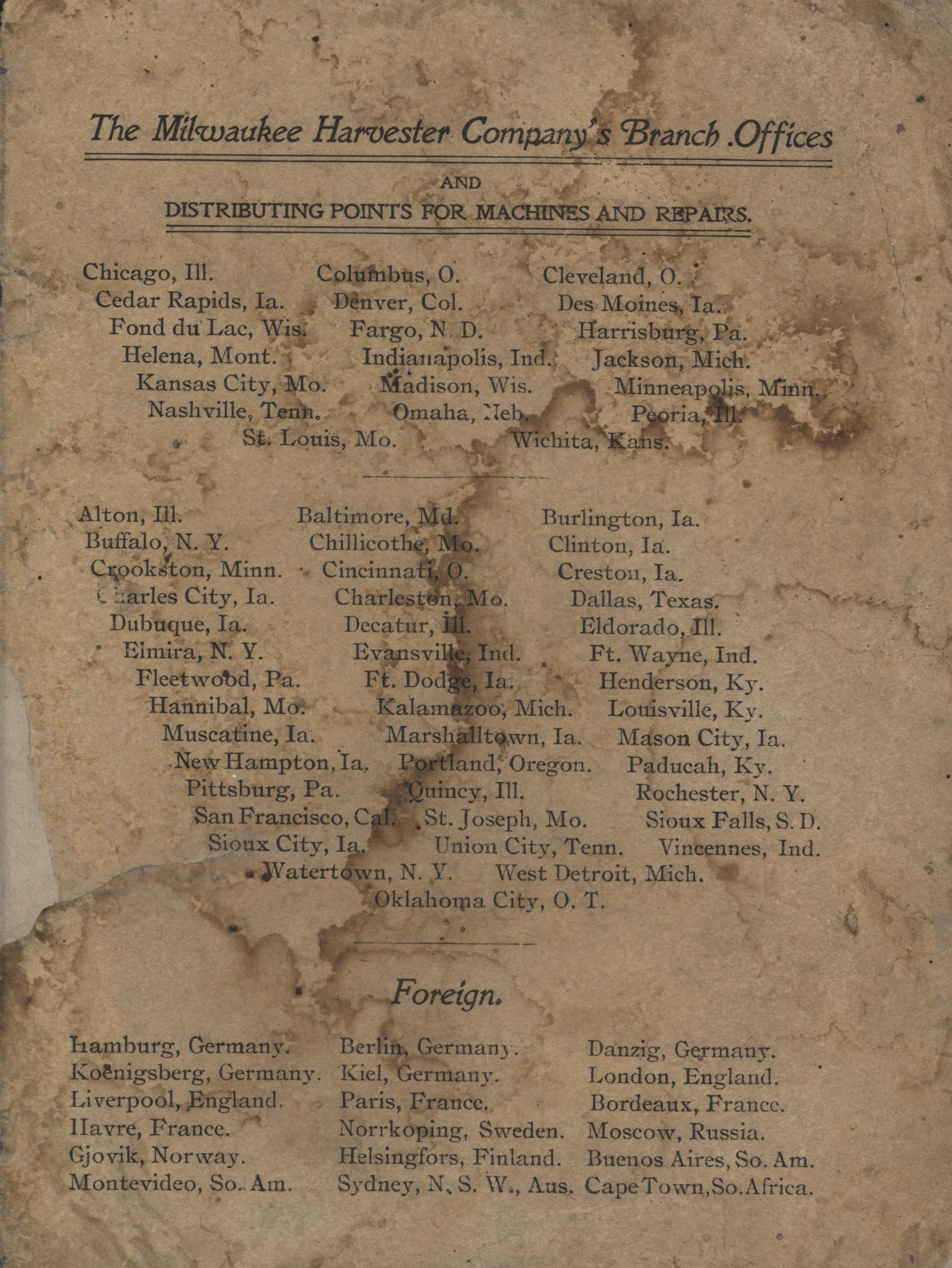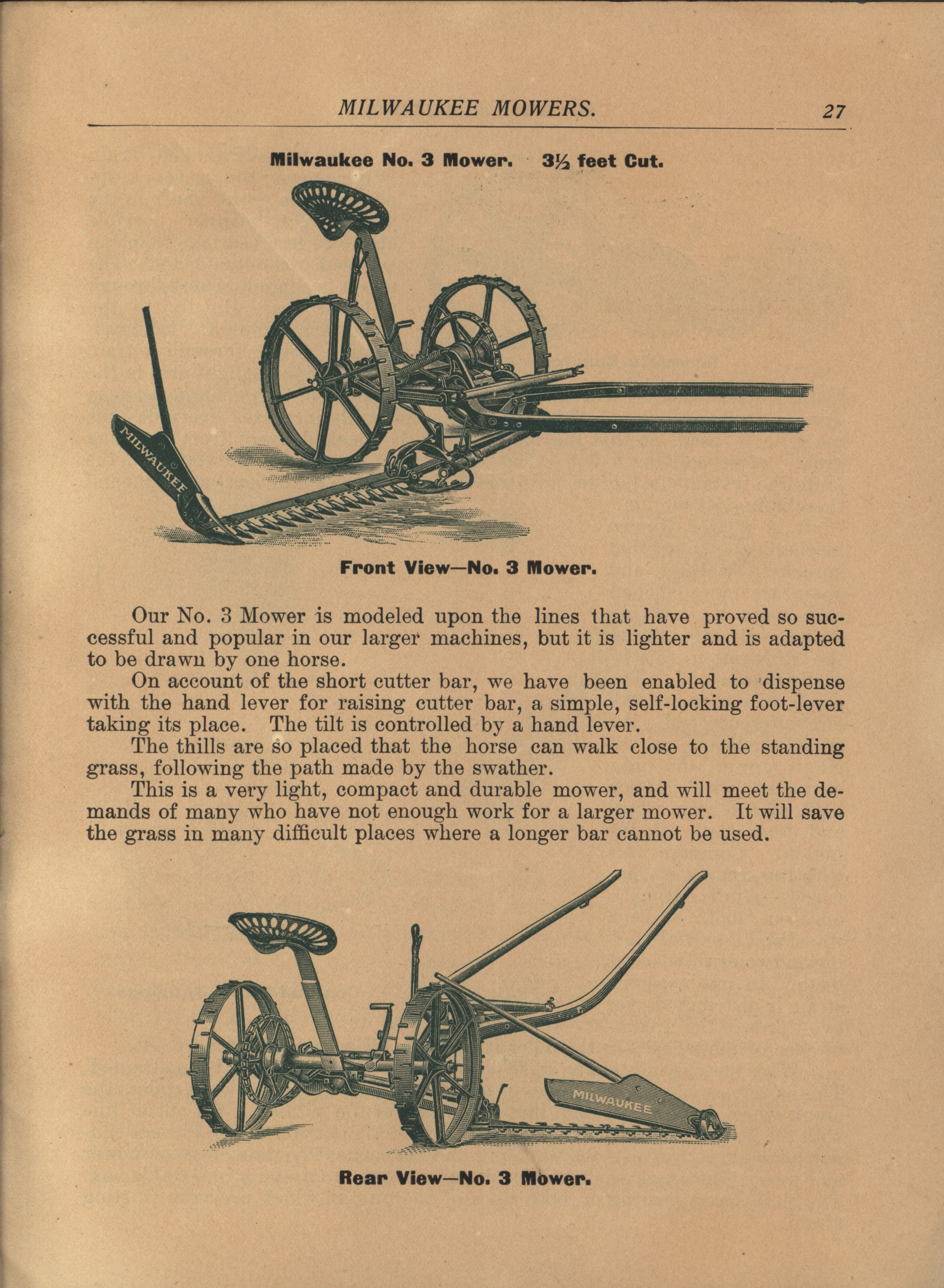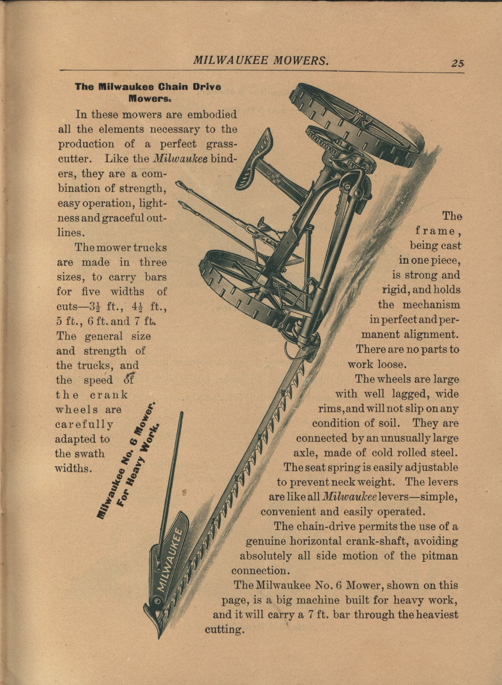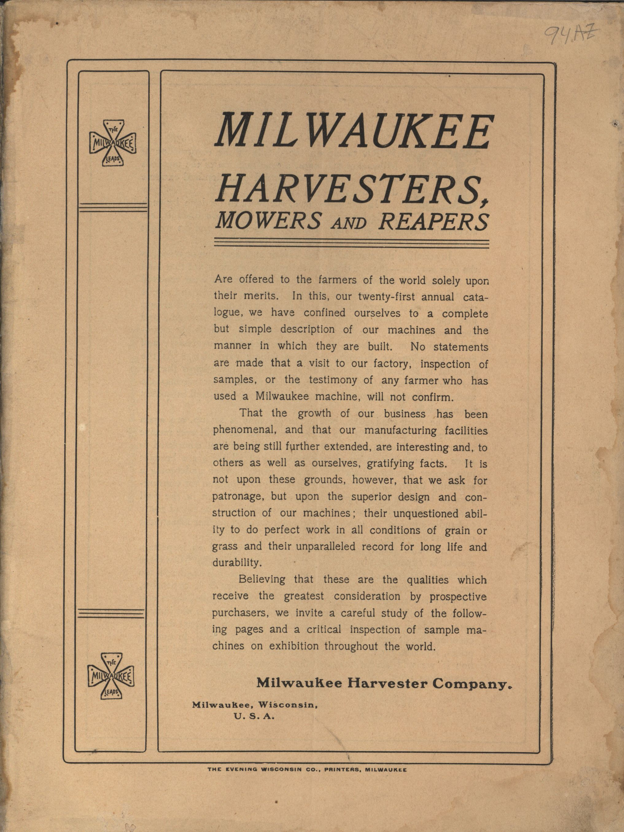 - Illustrated catalog describing the harvesters, mowers and reapers offered by Milwaukee Harvester Company.