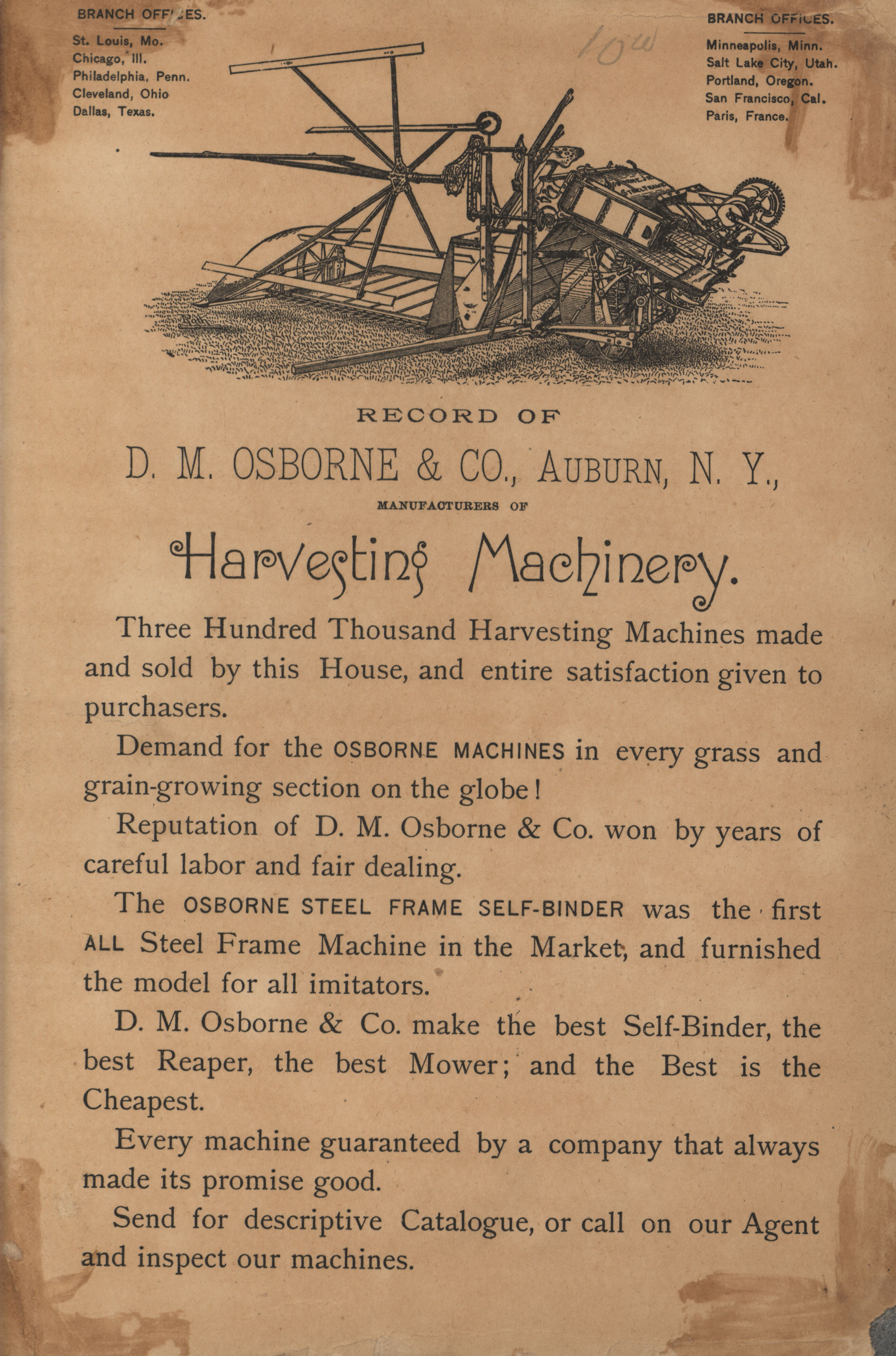 - "Illustrated advertisement card for D.M. Osborne and Co.", Agricultural Machinery Literature Collection, Iowa State University Library Digital Collections