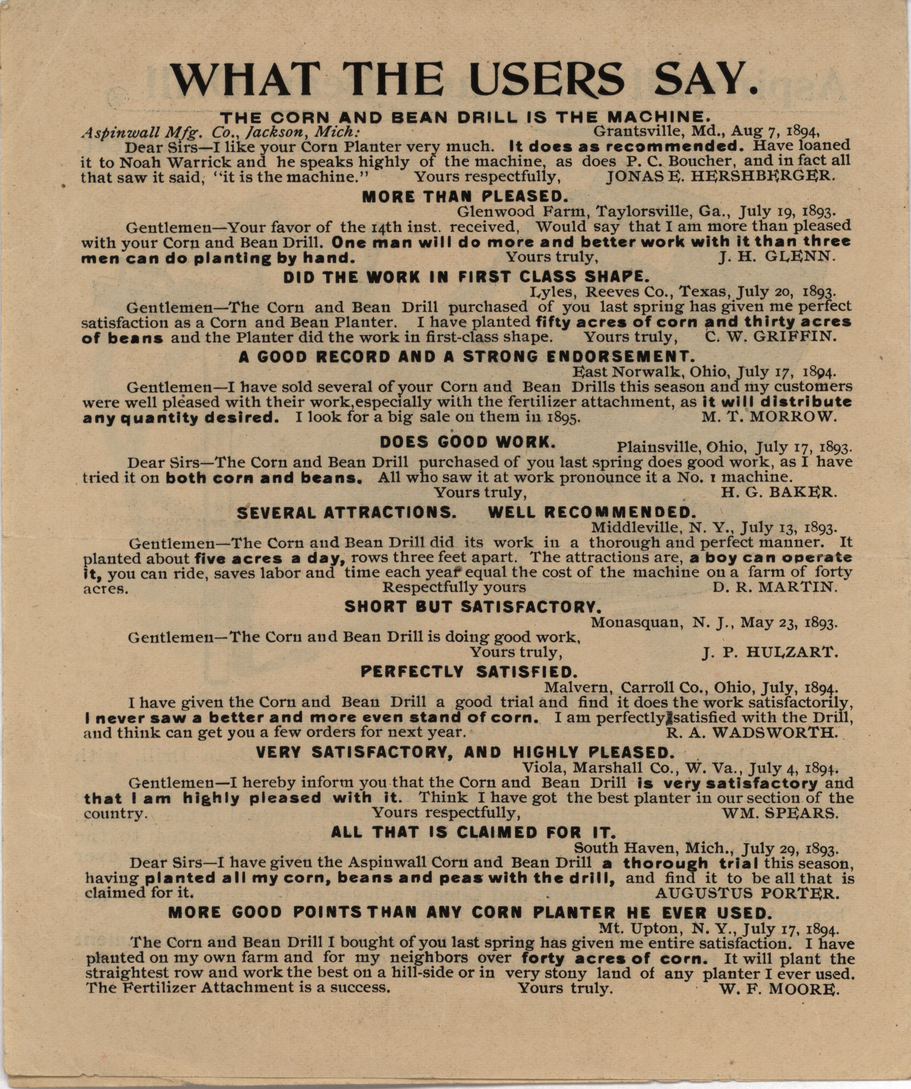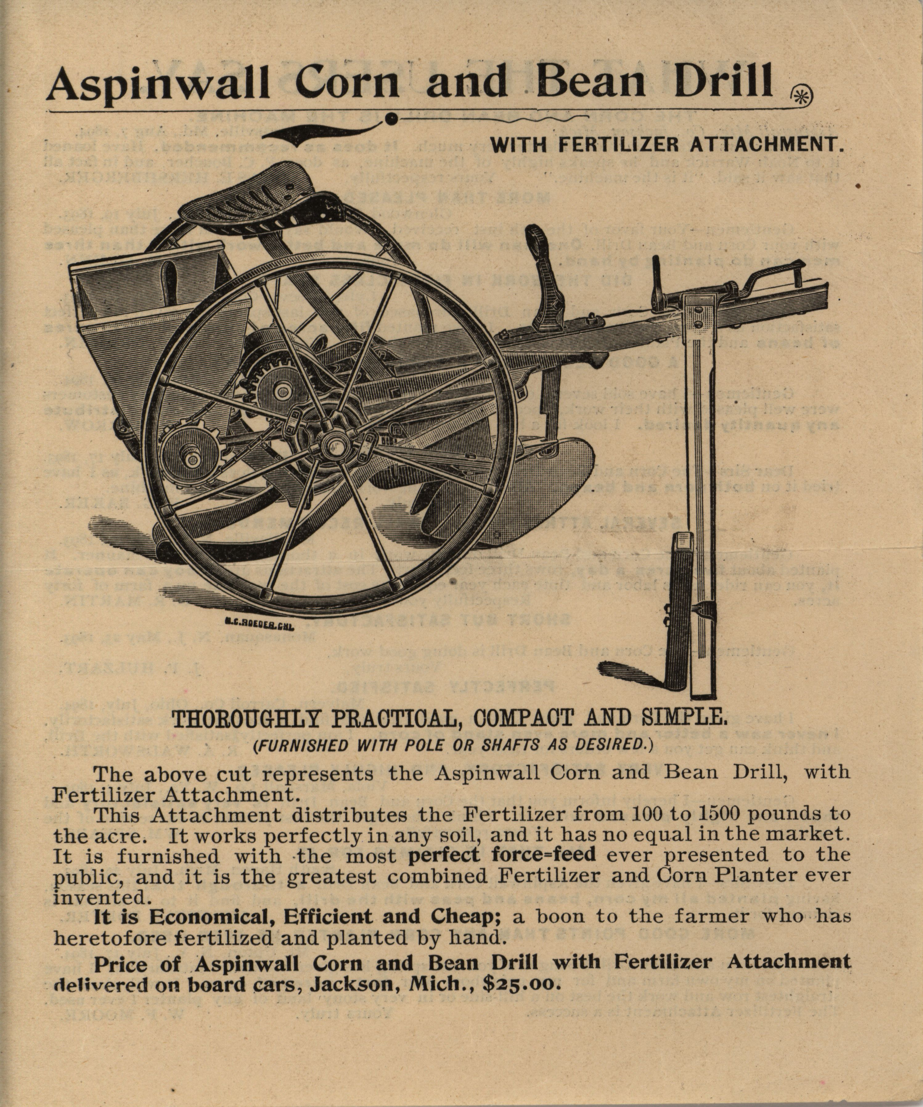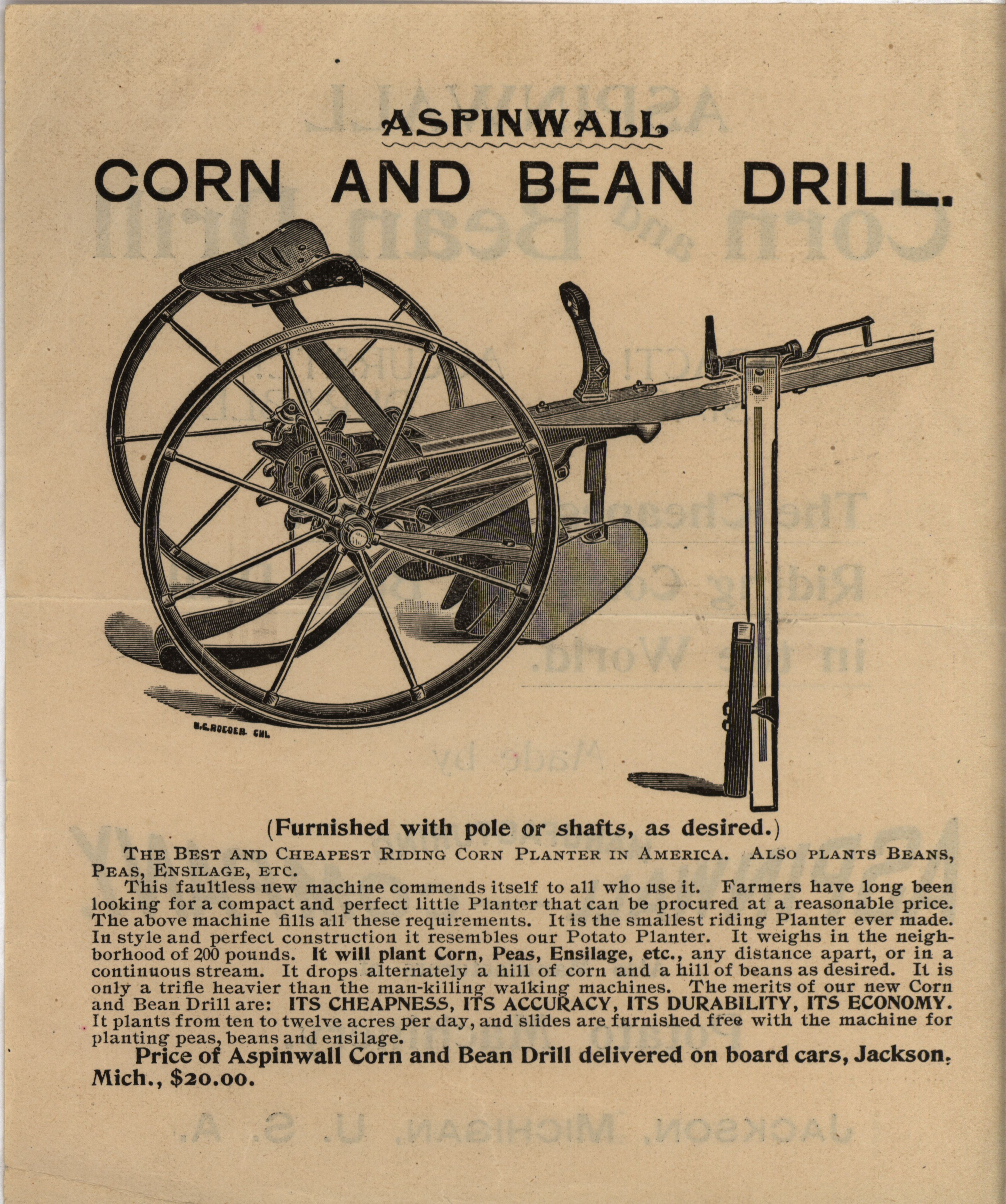 - "Aspinwall Corn and Bean Drill catalog", Agricultural Machinery Literature Collection, Iowa State University Library Digital Collections