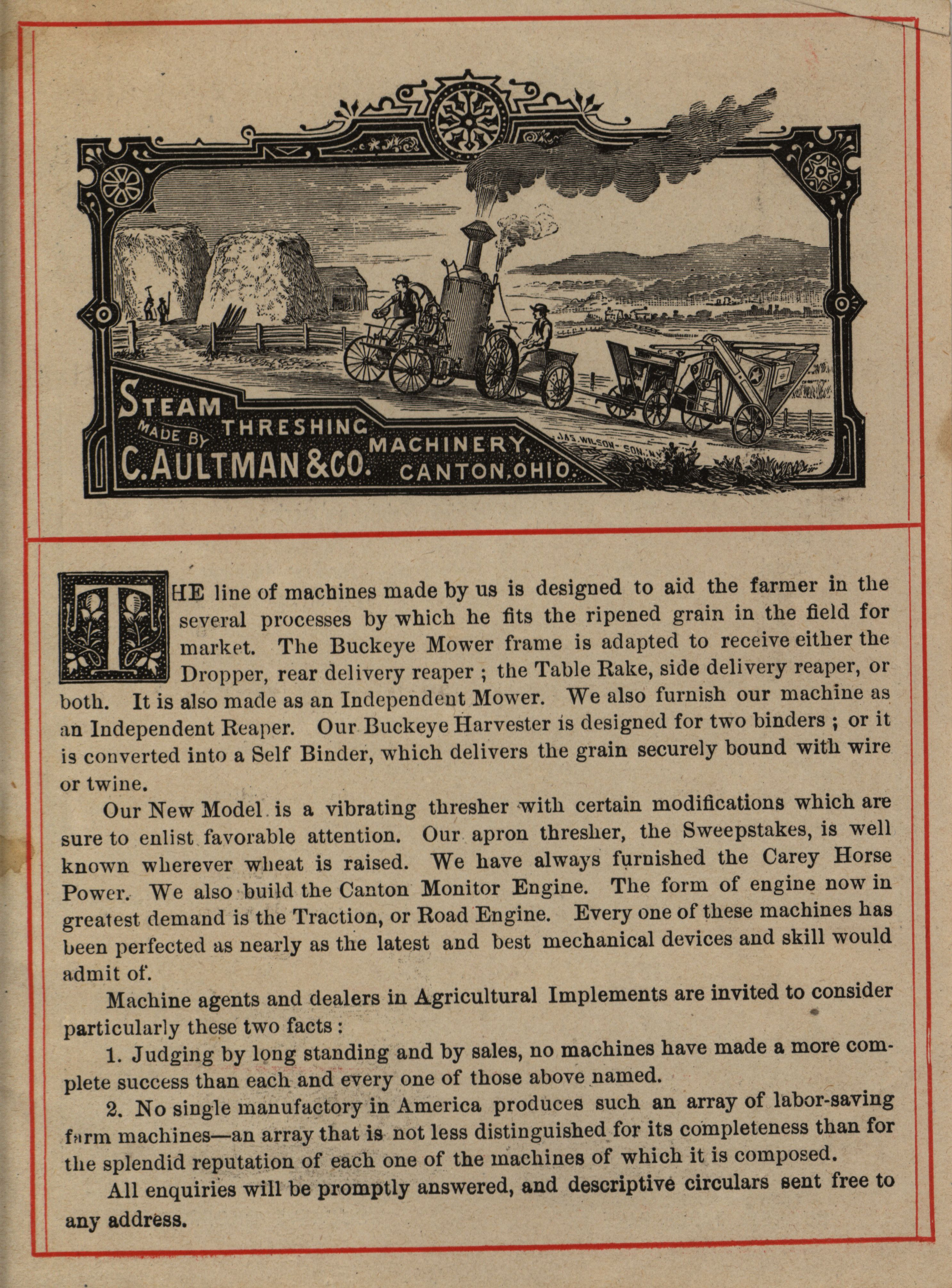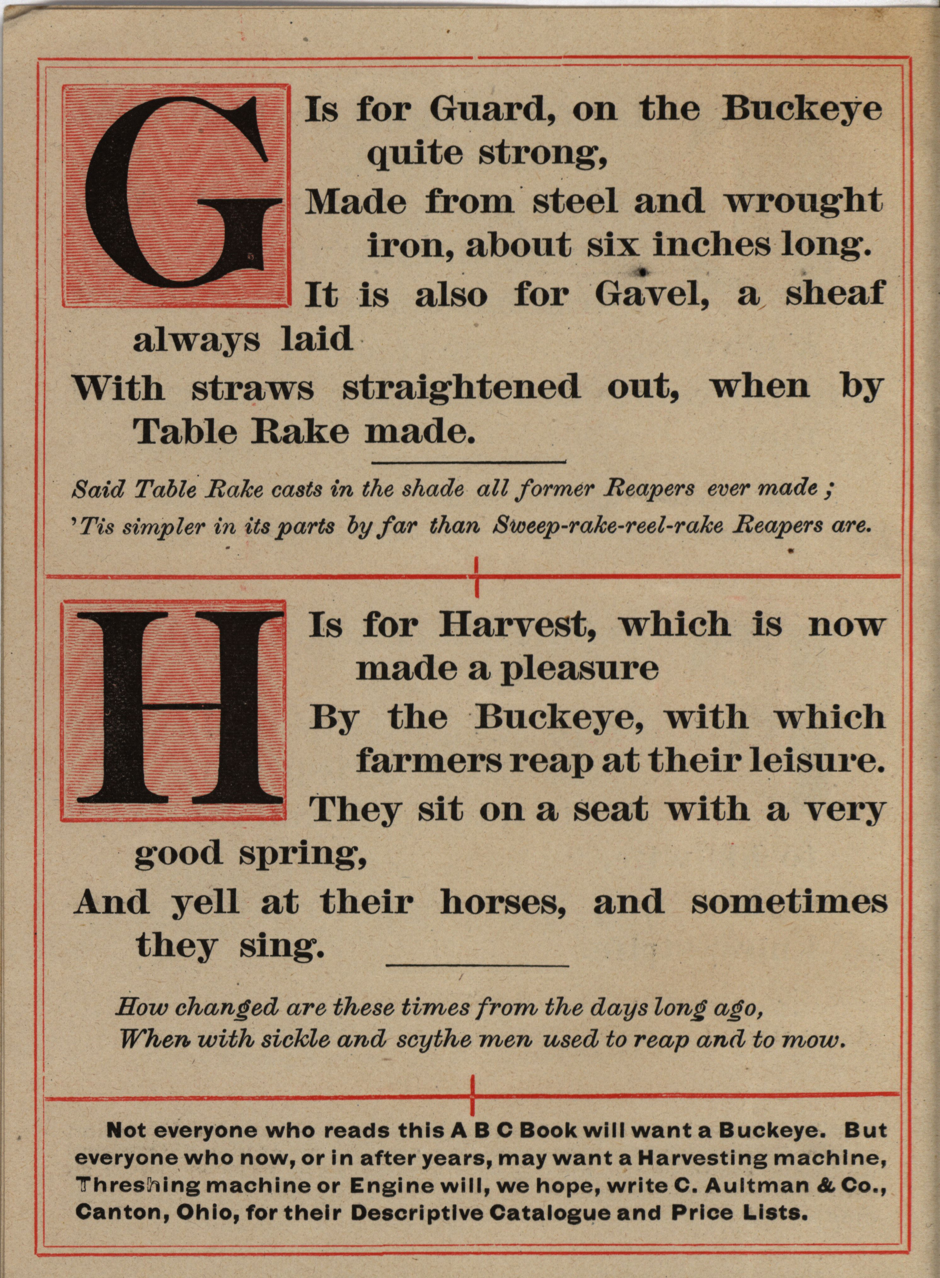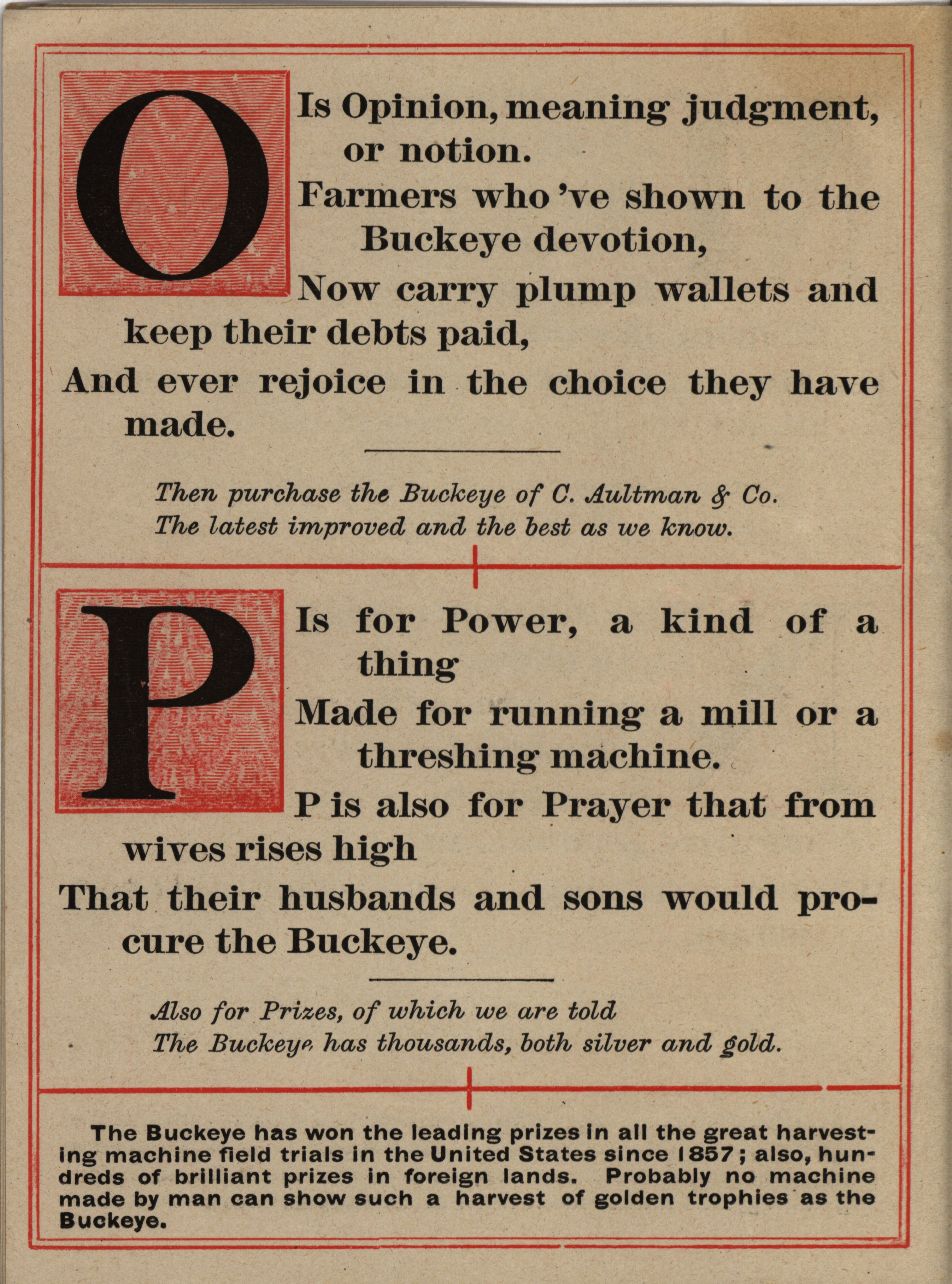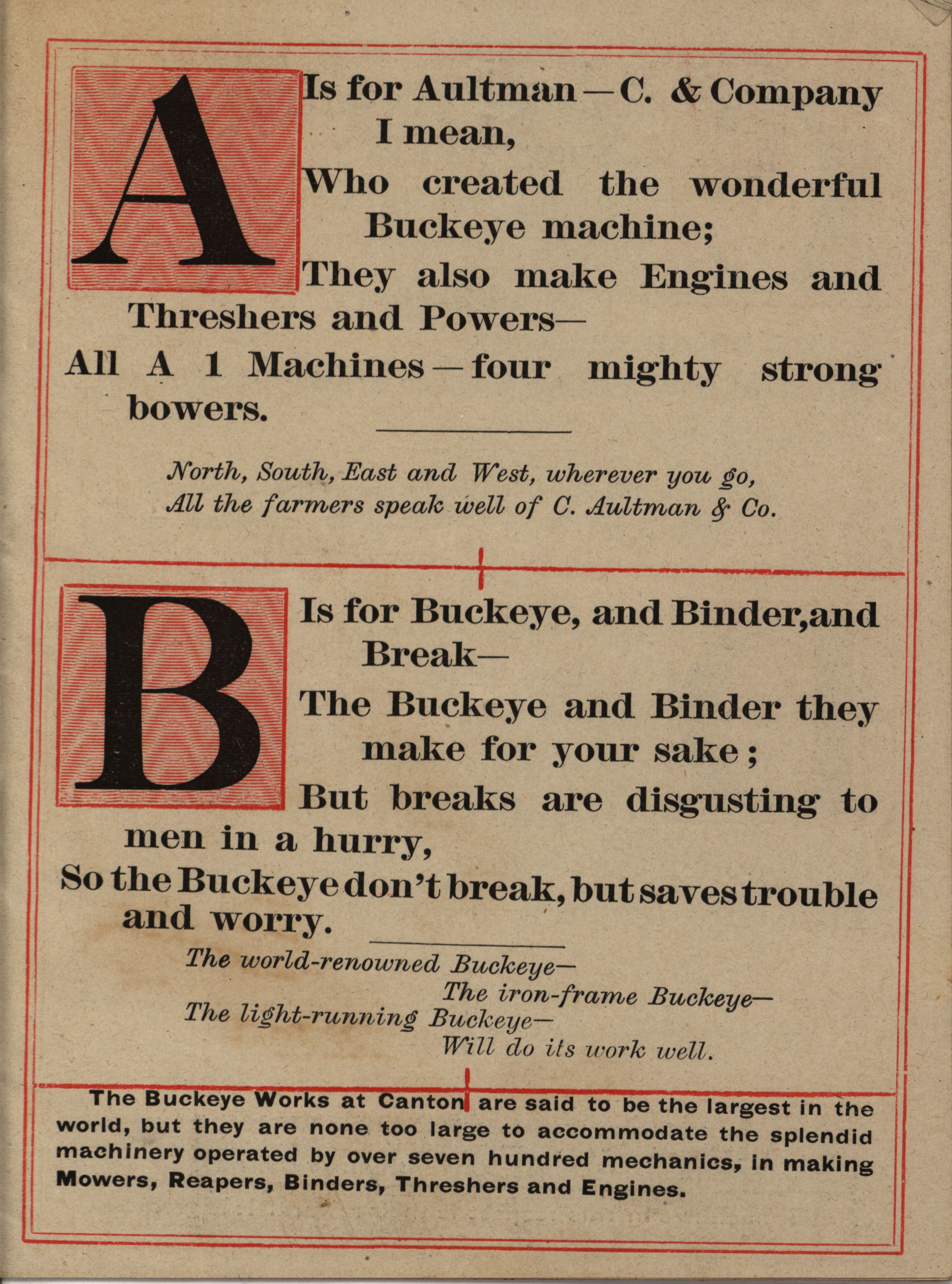 - "The A.B.C Buckeye Primer: Presented by C. Aultman & Co., catalog", Agricultural Machinery Literature Collection, Iowa State University Library Digital Collections