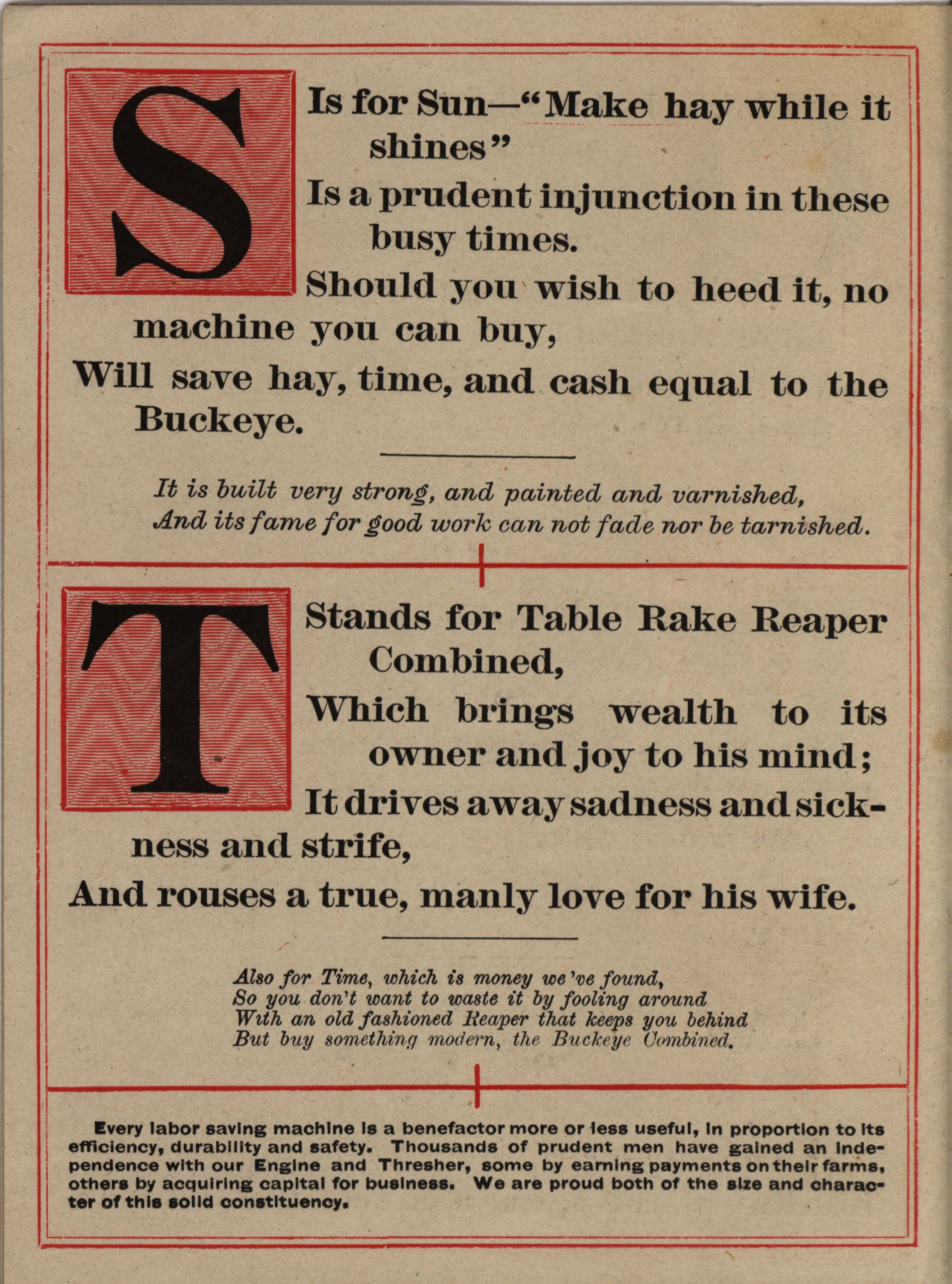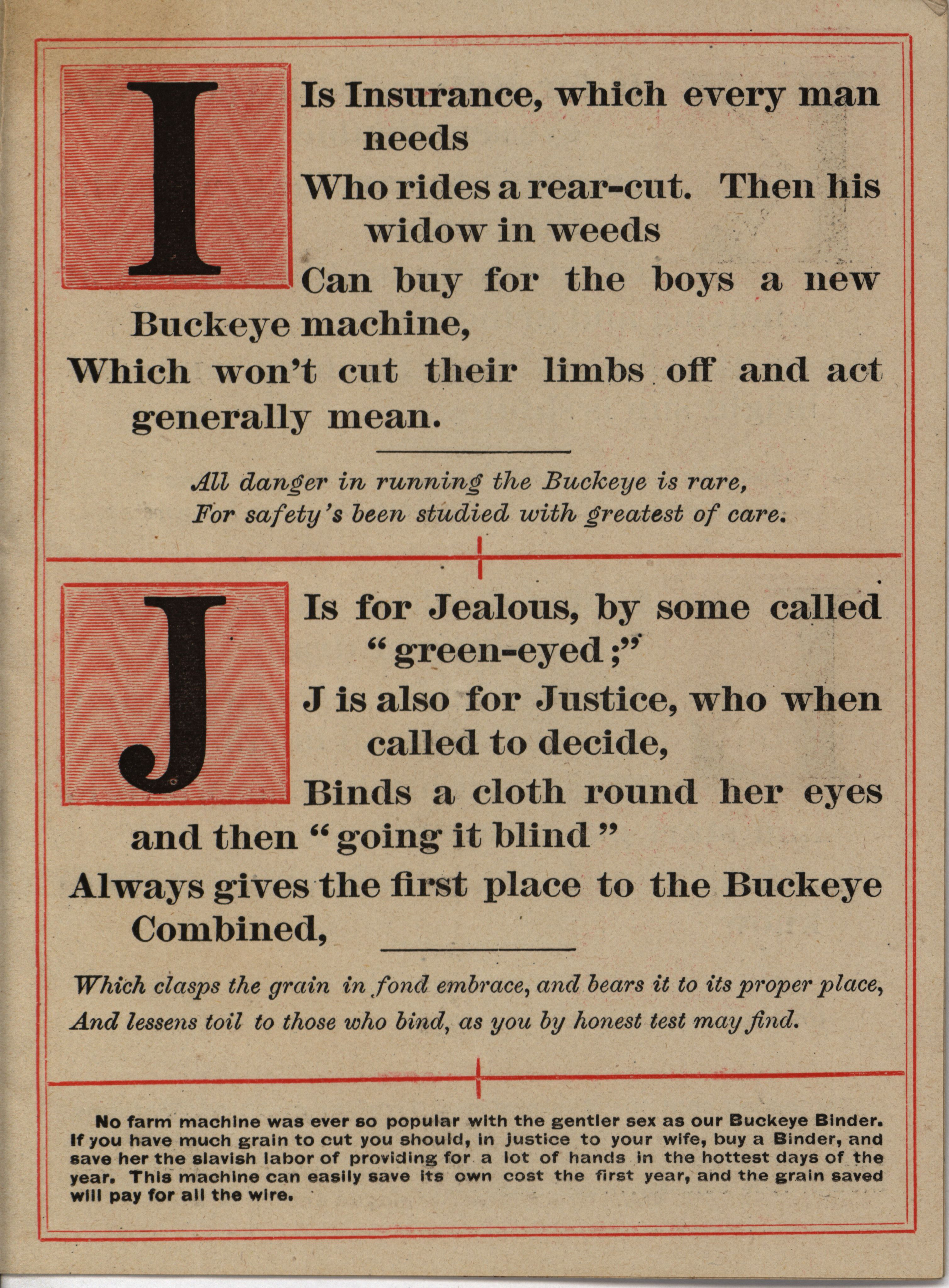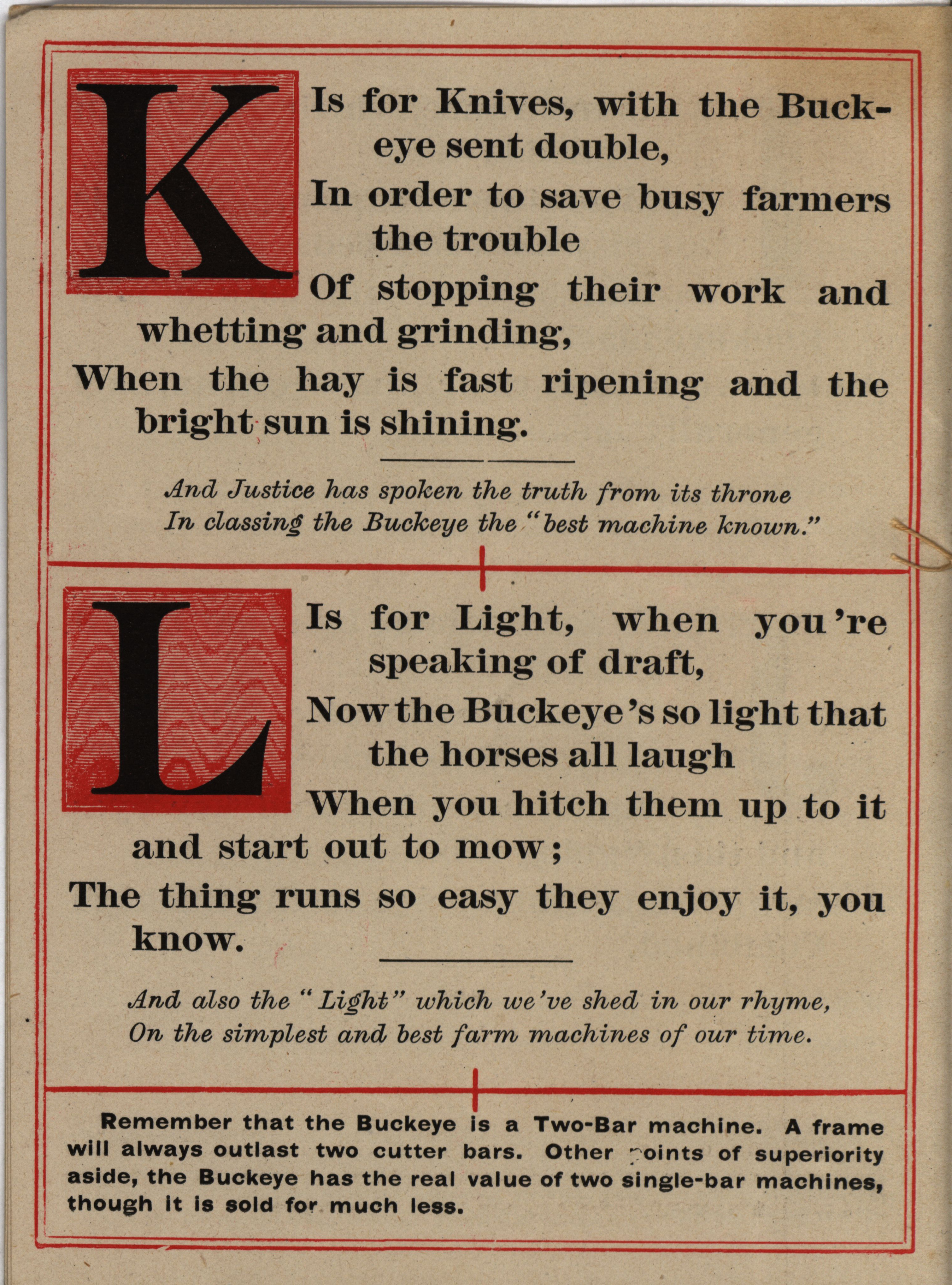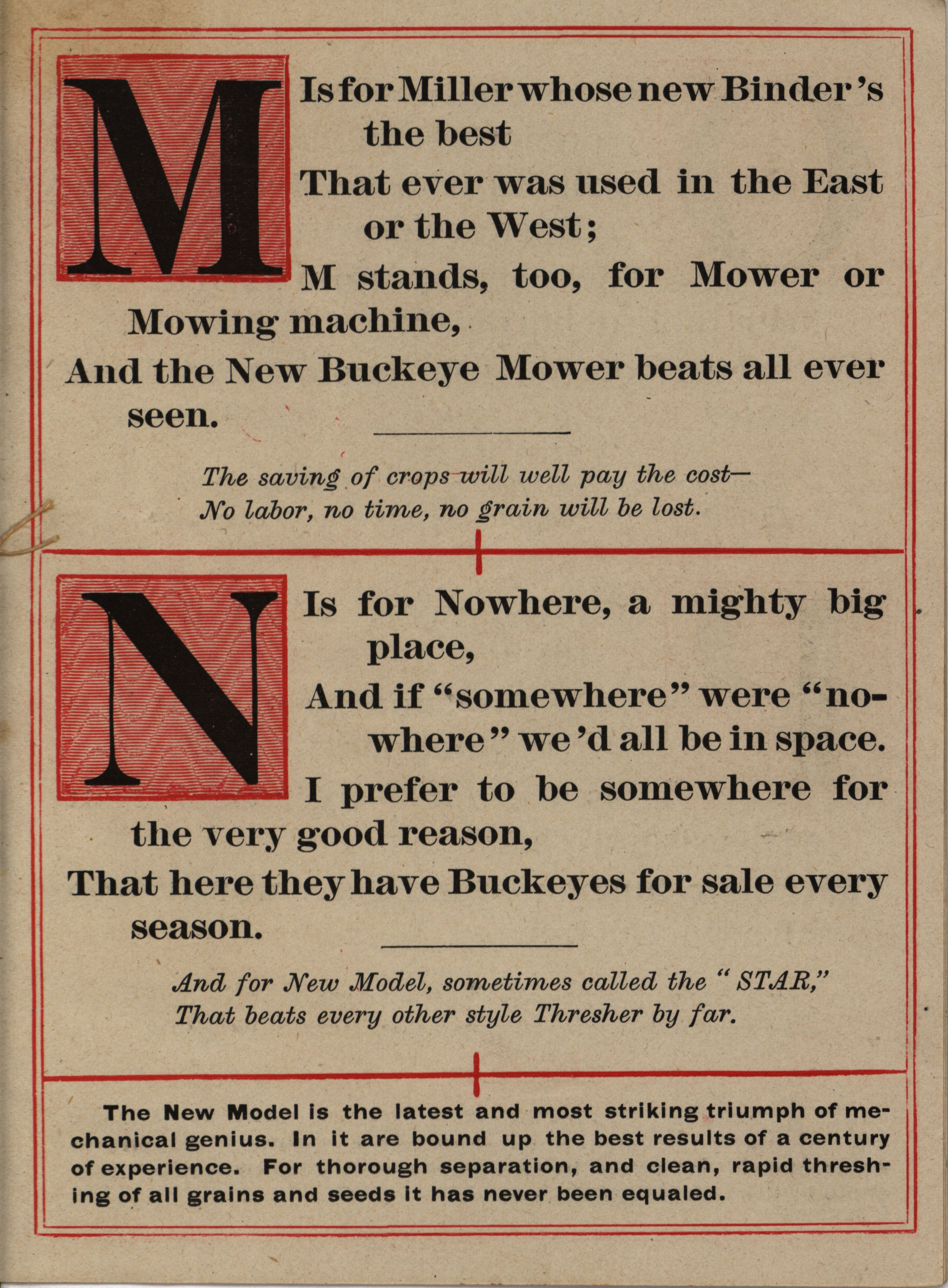 - "The A.B.C Buckeye Primer: Presented by C. Aultman & Co., catalog", Agricultural Machinery Literature Collection, Iowa State University Library Digital Collections