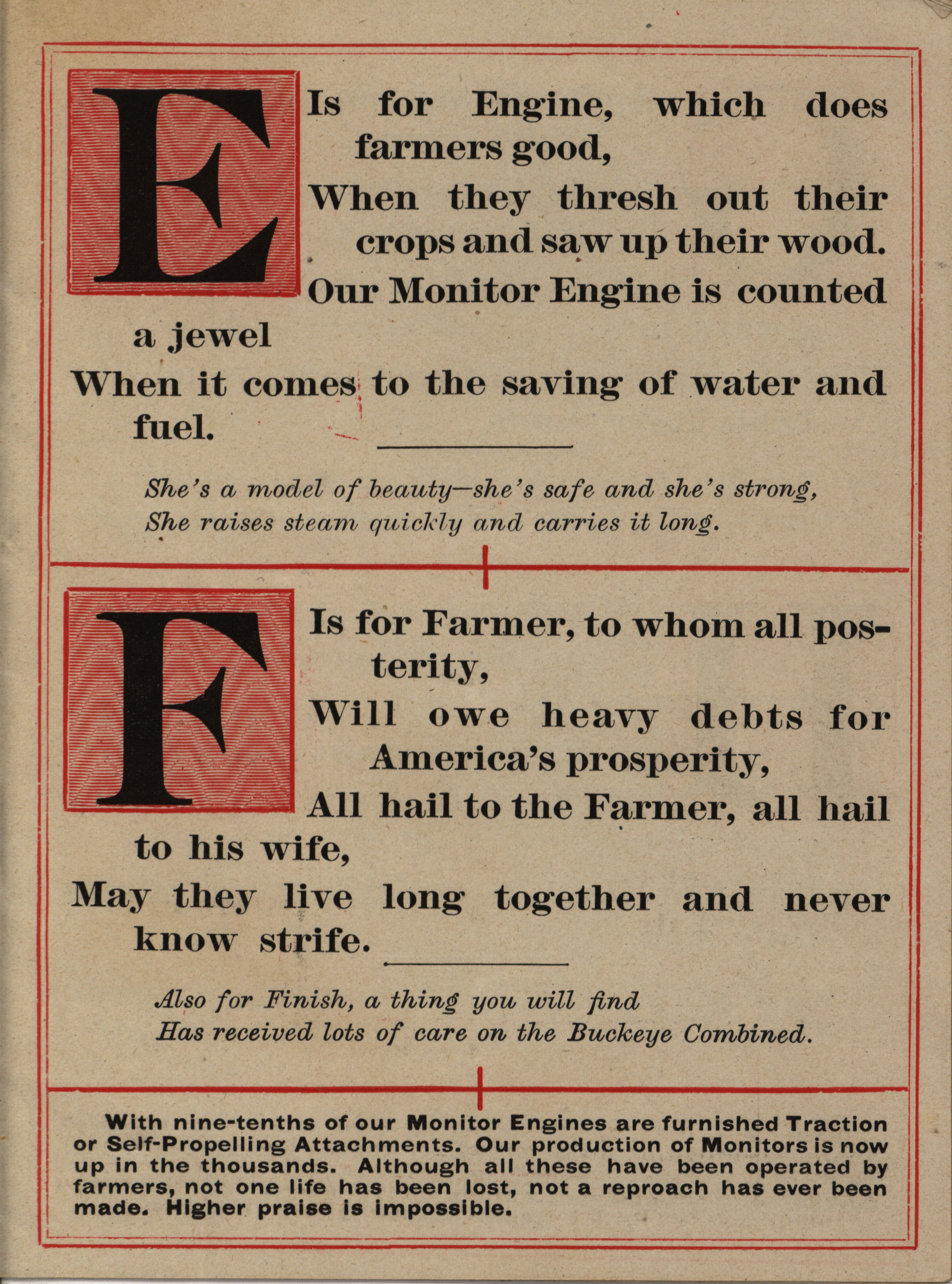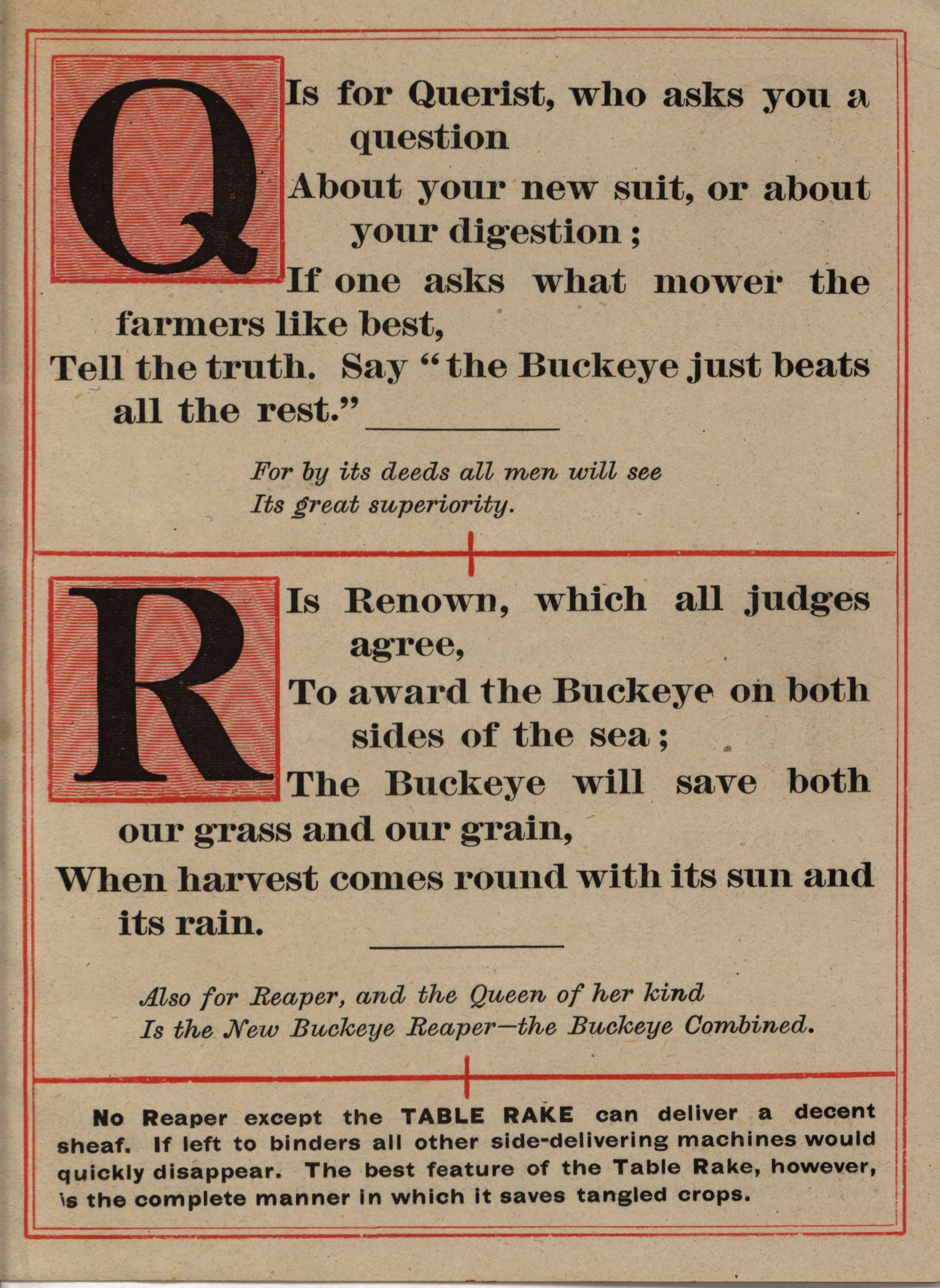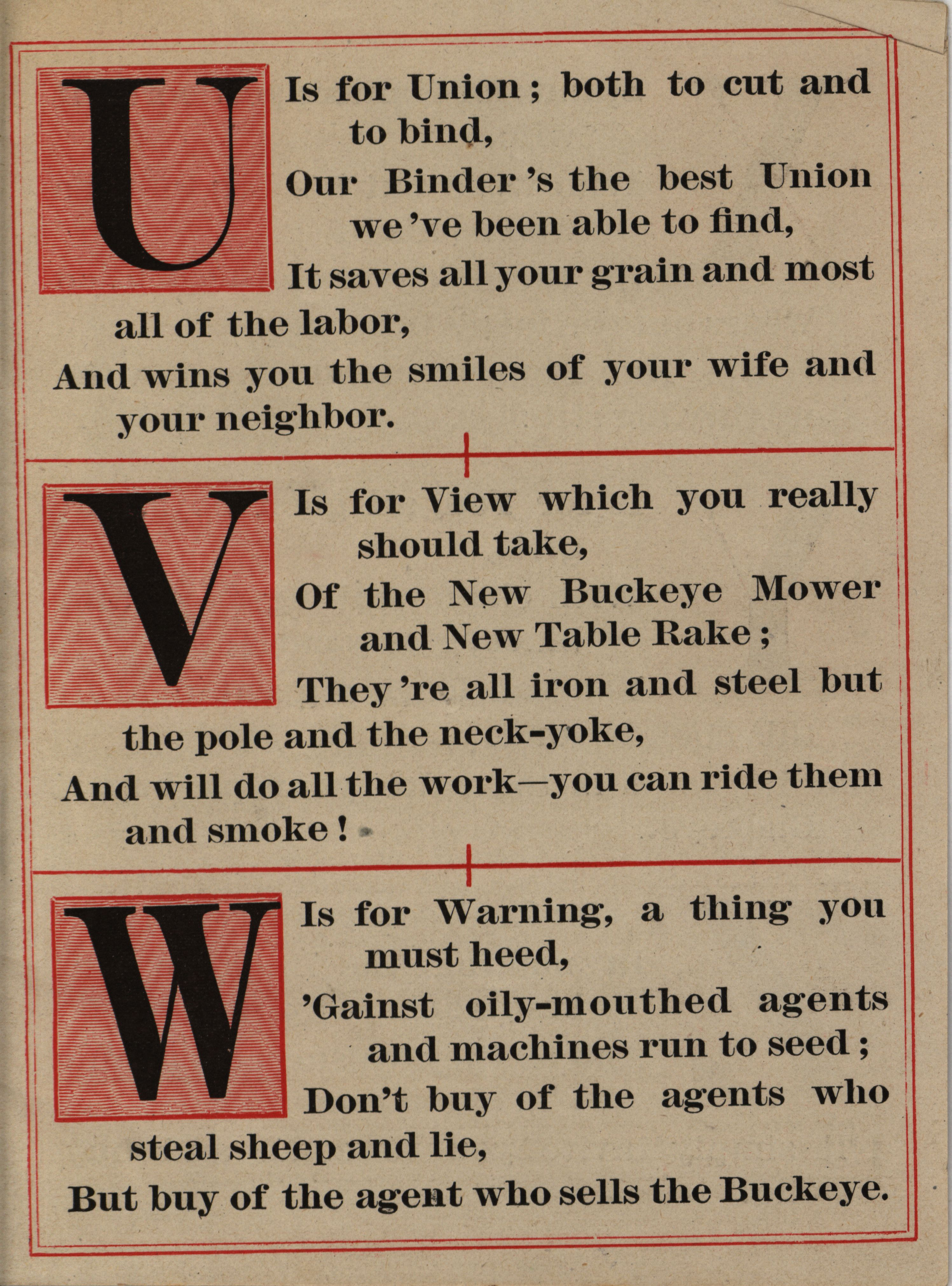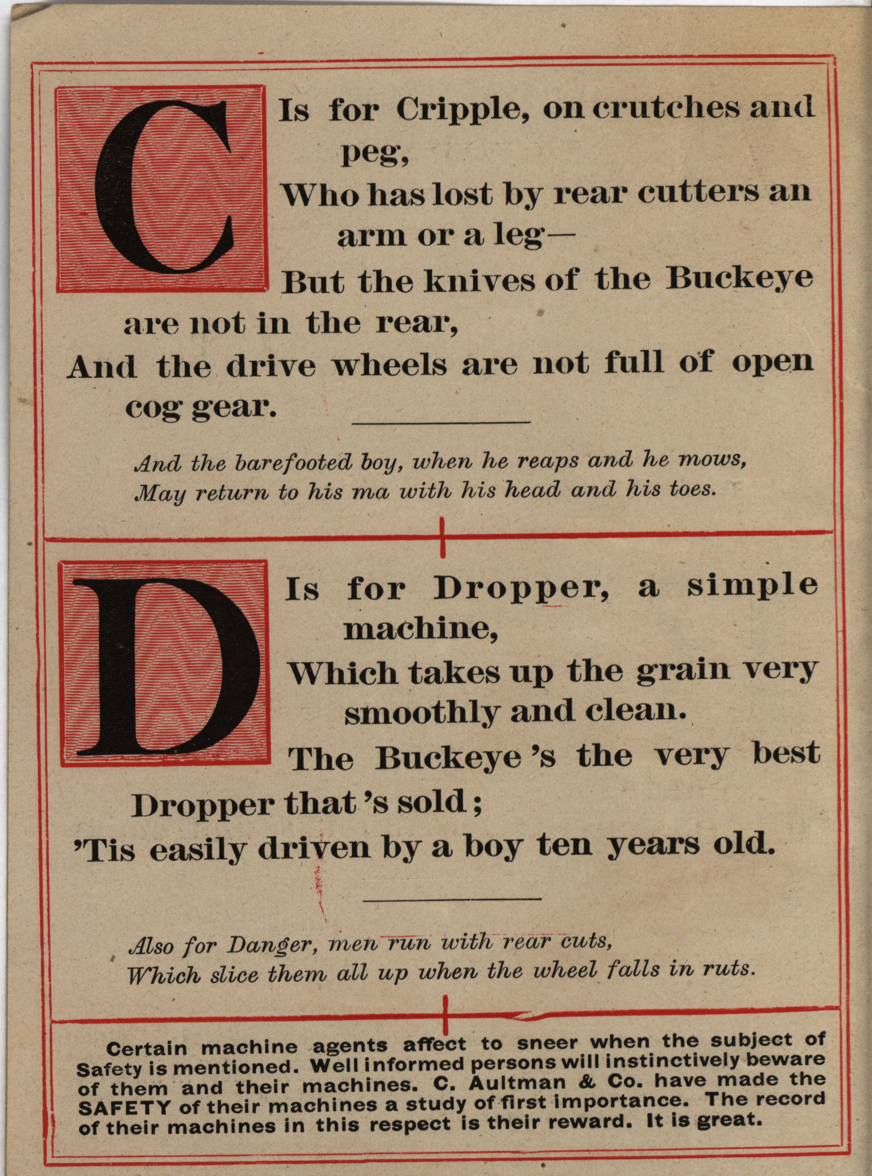 - "The A.B.C Buckeye Primer: Presented by C. Aultman & Co., catalog", Agricultural Machinery Literature Collection, Iowa State University Library Digital Collections