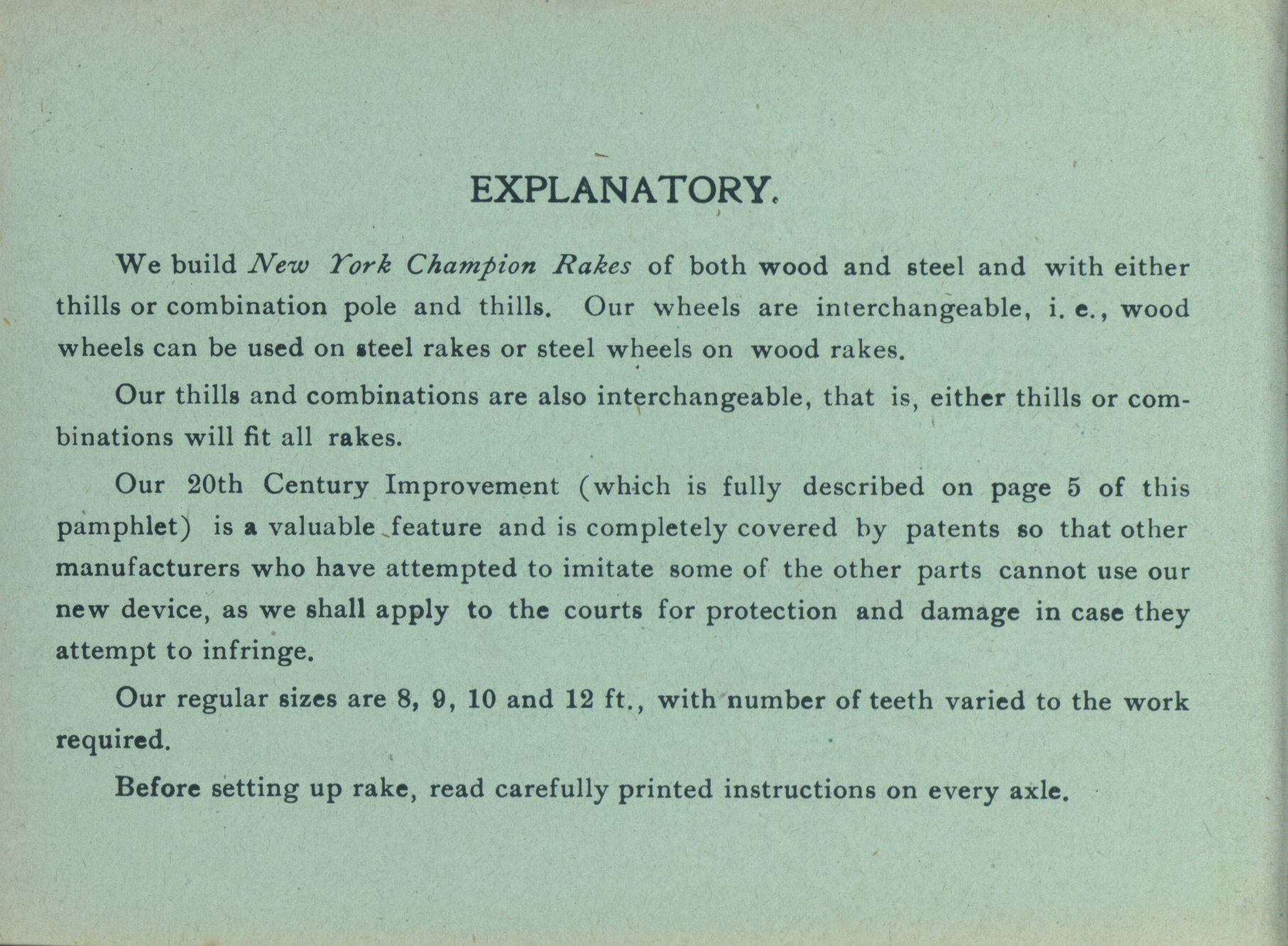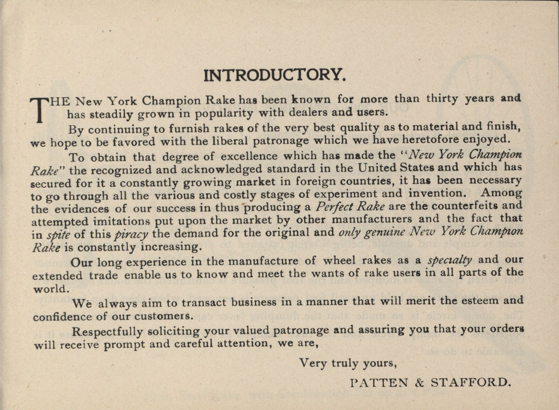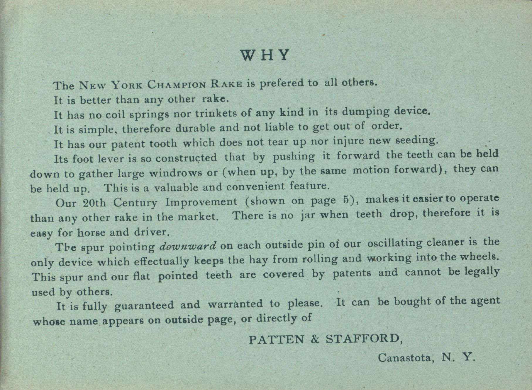 - "Patten and Stafford New York Champion Rakes catalog", Agricultural Machinery Literature Collection, Iowa State University Library Digital Collections