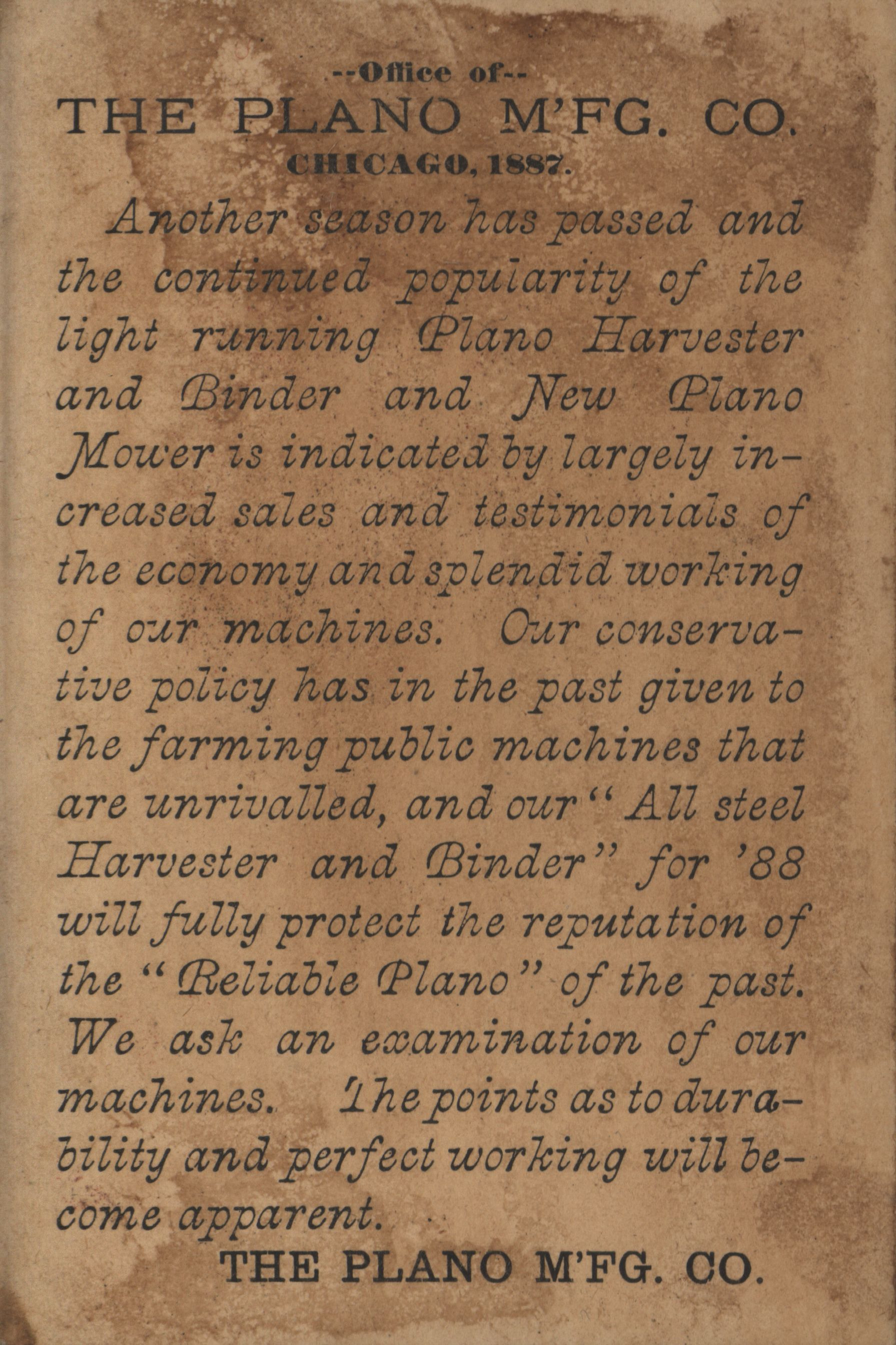 - "The Plano Manufacturing Company 1887 advertisement", Agricultural Machinery Literature Collection, Iowa State University Library Digital Collections