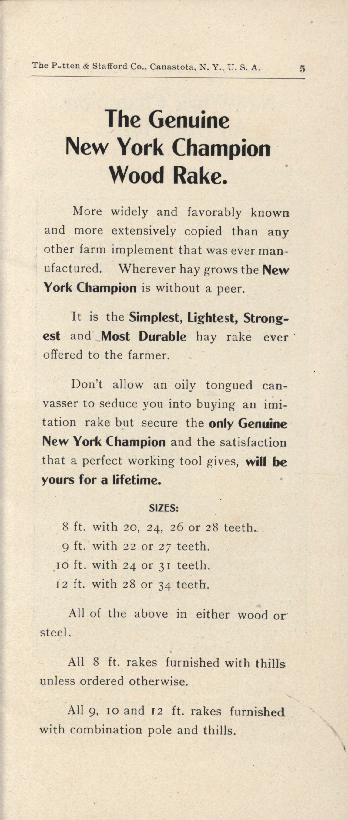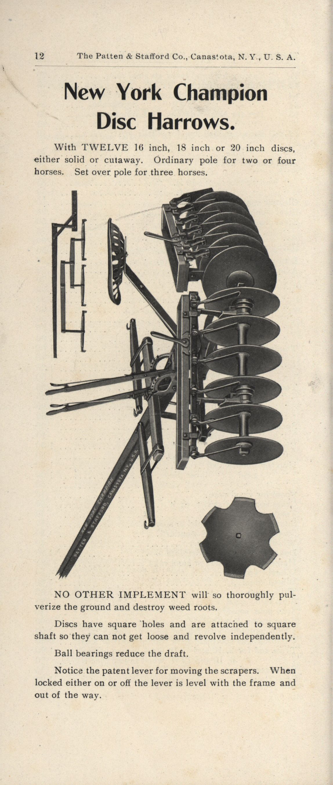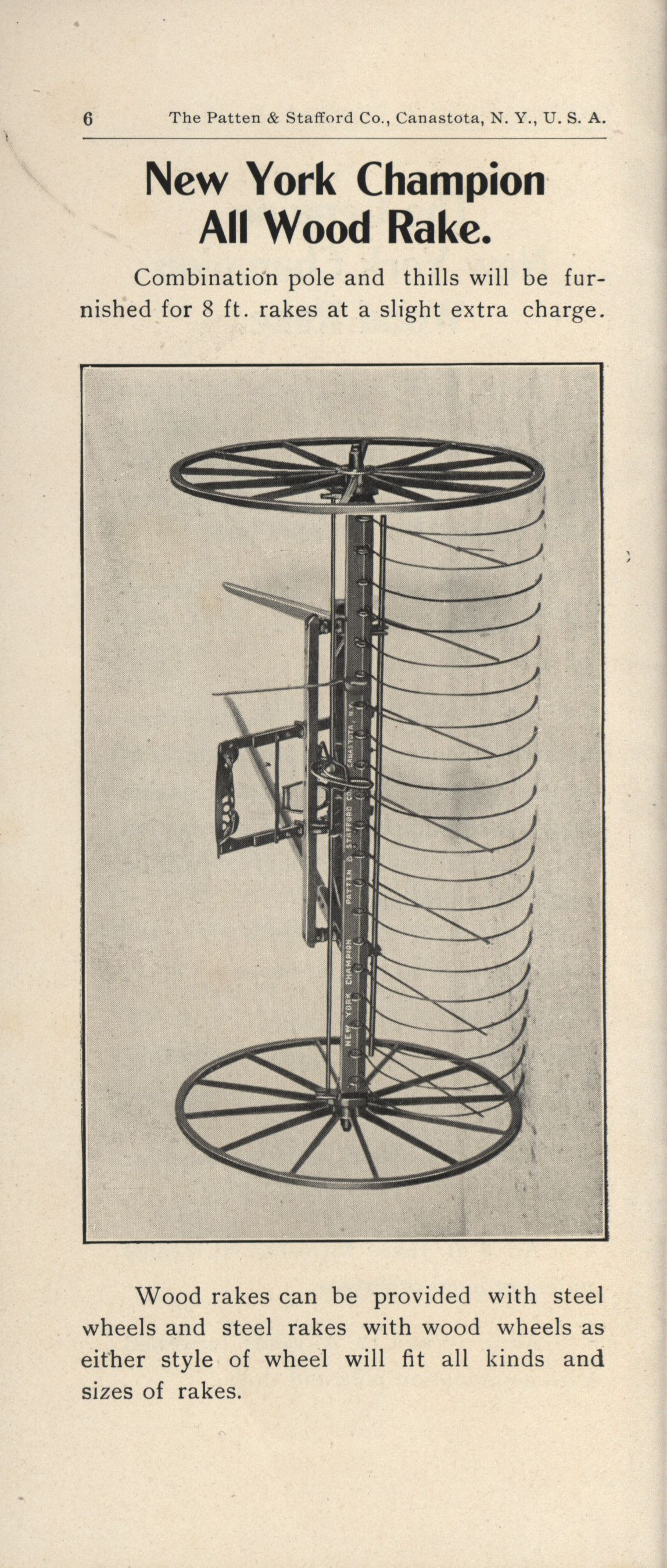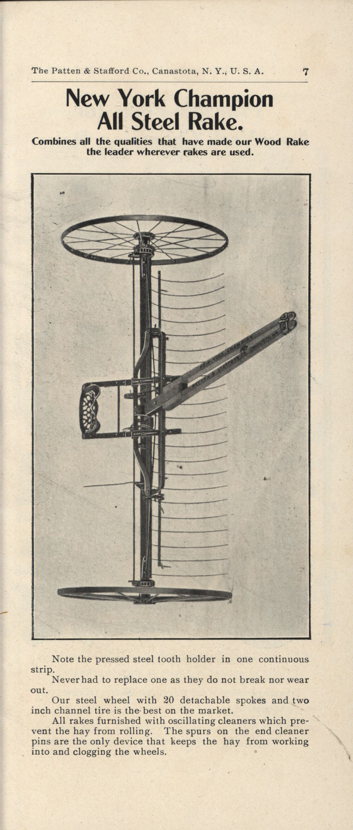 - Illustrated catalog describing the New York Champion Rakes and Spring Tooth Lever Harrows offered by Patten and Stafford Company.